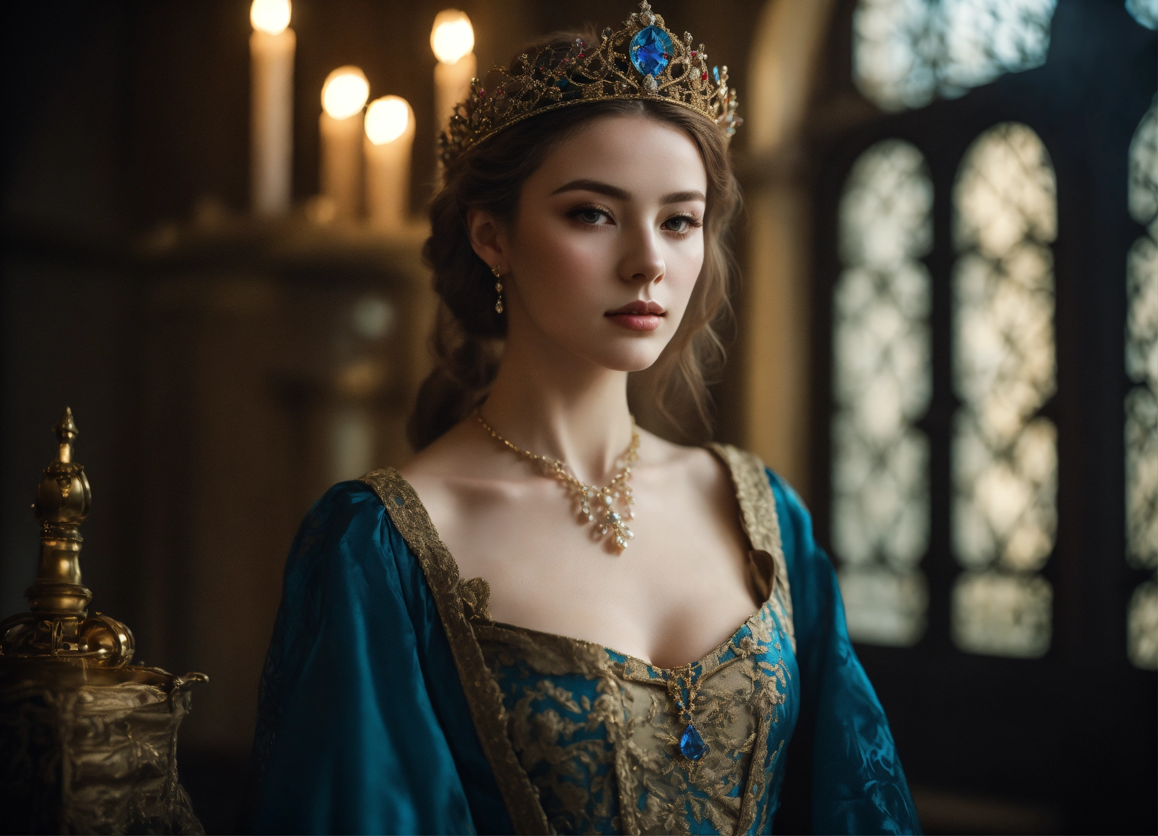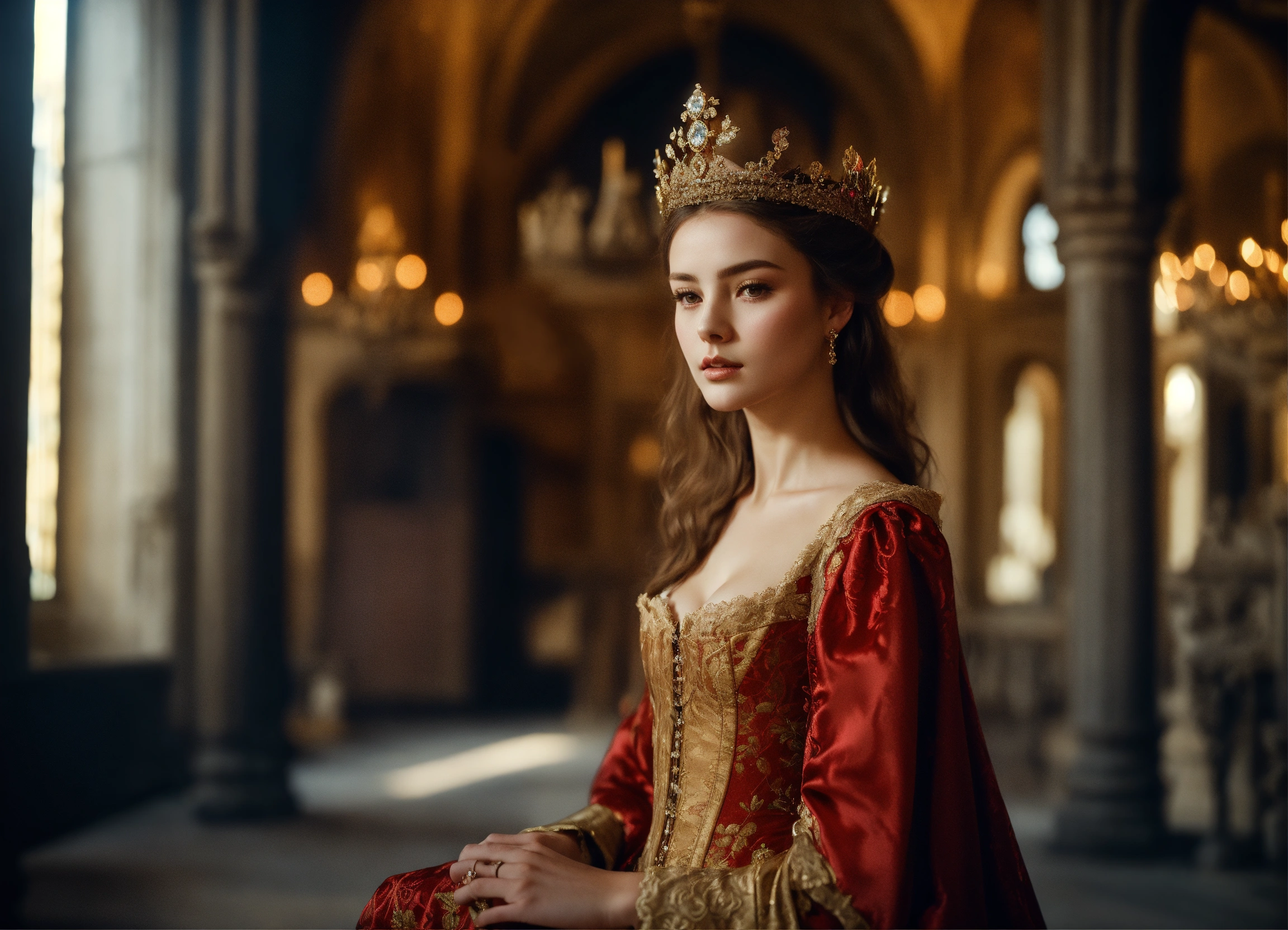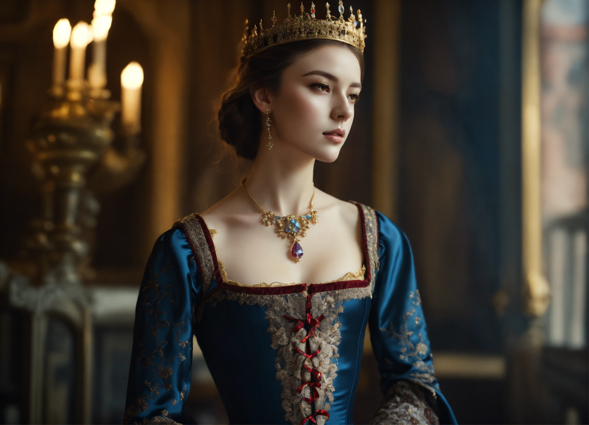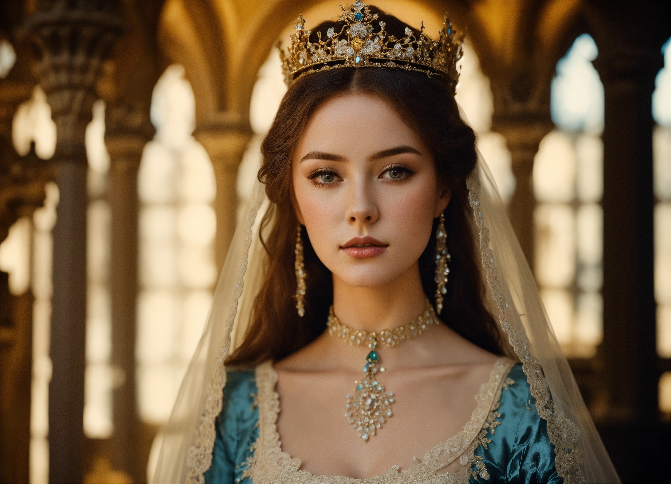 Kodak portra 400, 8k, soft light, volumetric lighting, highly detailed, fine art portrait photography, medieval setting, full body, very slim juvenile noble baroness, very young apperearence, beautiful face, very childish appearance, stunningly beautiful, beauty in perfection, lordly, darkblond hair, narrow cheeks, ultra slim, ultra fragile build, ultra slim body, very flat bust, emaciated and thin, she seems ultra fragile, flawless skin, charmful, very narrow face, very pale, bright eyes, noble and elegant narrow medieval lace silk dress with very low-cut decollete and trumpet sleeves, underneath a tight corset, ultra expansive and deep neckline, magnificent finely chased baroness crown richly set with gemstones and a veil, choker, brocade coat, body portrait, intimate, she stands in a noble pose in a castle setting, complex 3d render, 150 mm lens, octane render, ornamental, 8k, soft light, volumetric lighting, refined, soft lighting colors scheme, photo realistic