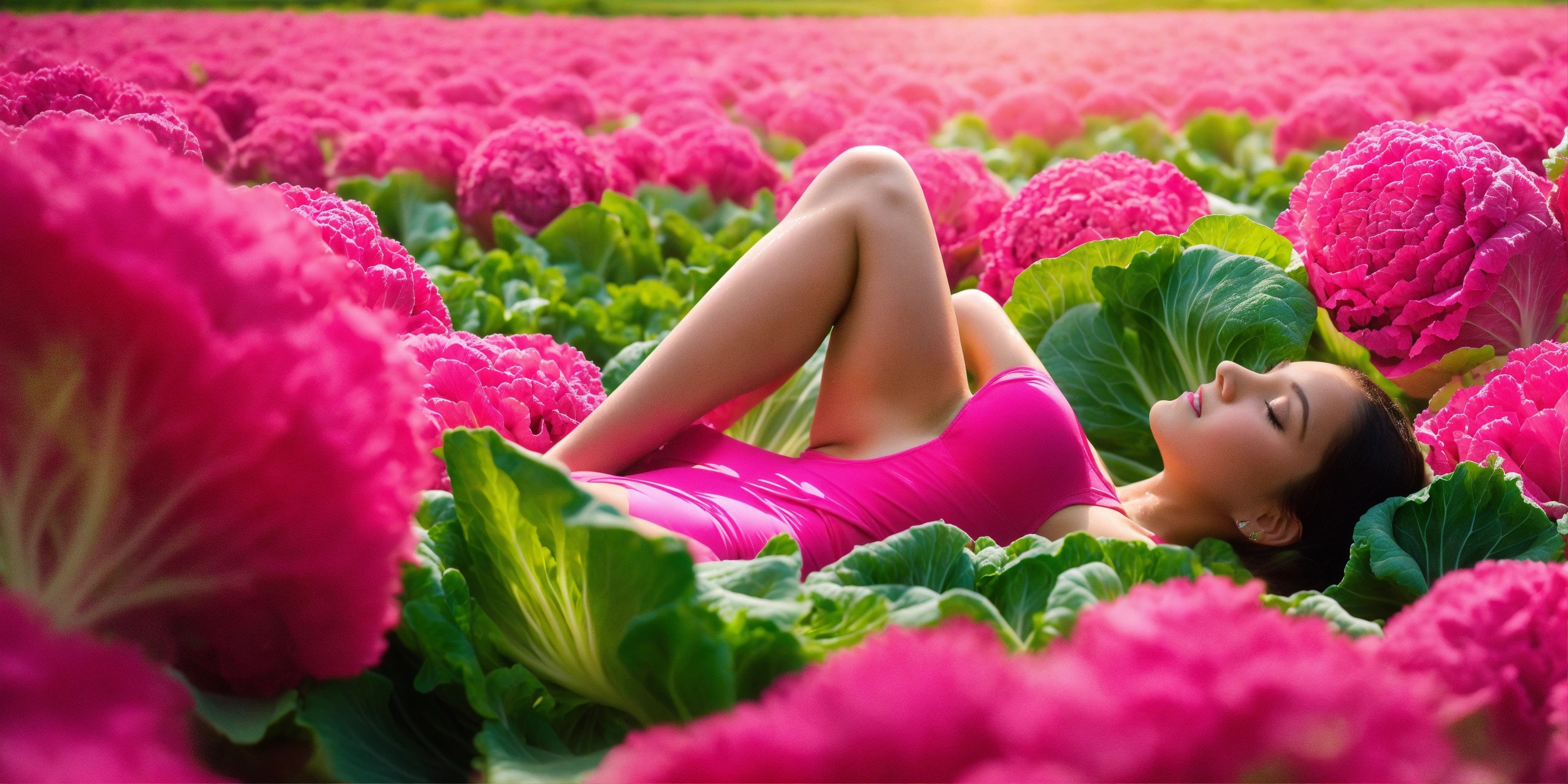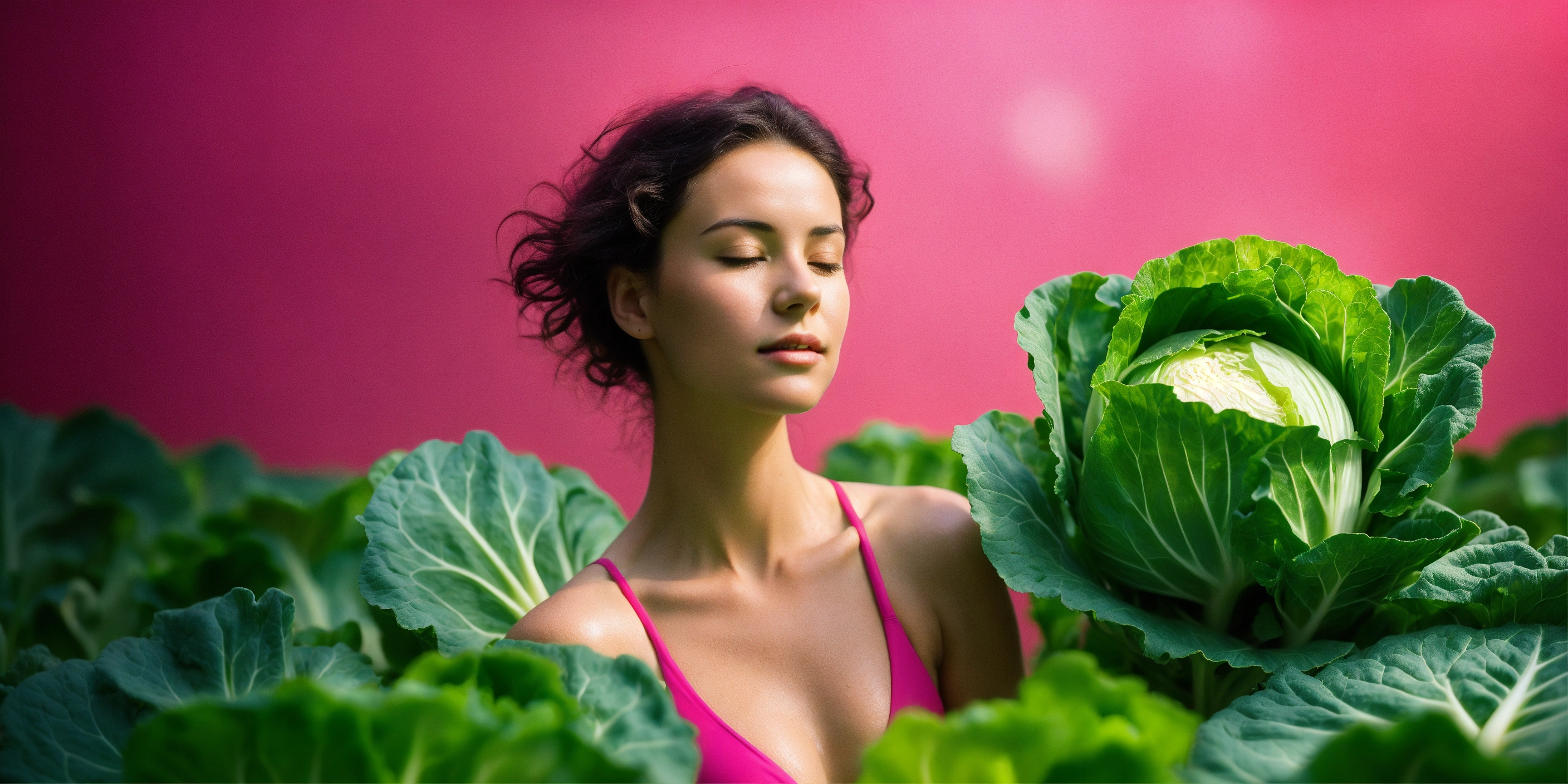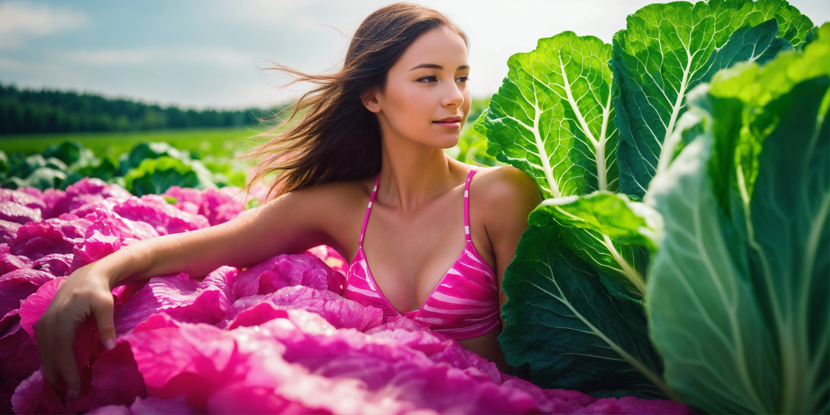 A radiant young woman in a vibrant pink swimming suit is illuminated against a soft, white background. the scene shifts subtly as she now cradles a beautifully dense green cabbage. the layers of its leaves hold tales of the soil it sprang from. her fingers delicately caress its surface, expressing admiration for nature’s produce. all this happens in a field in ukraine.