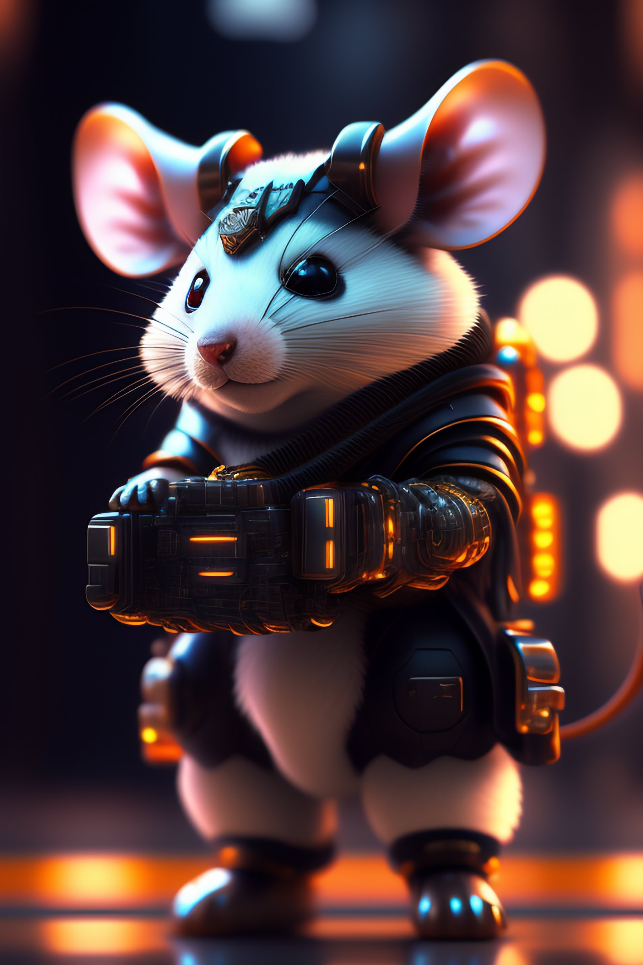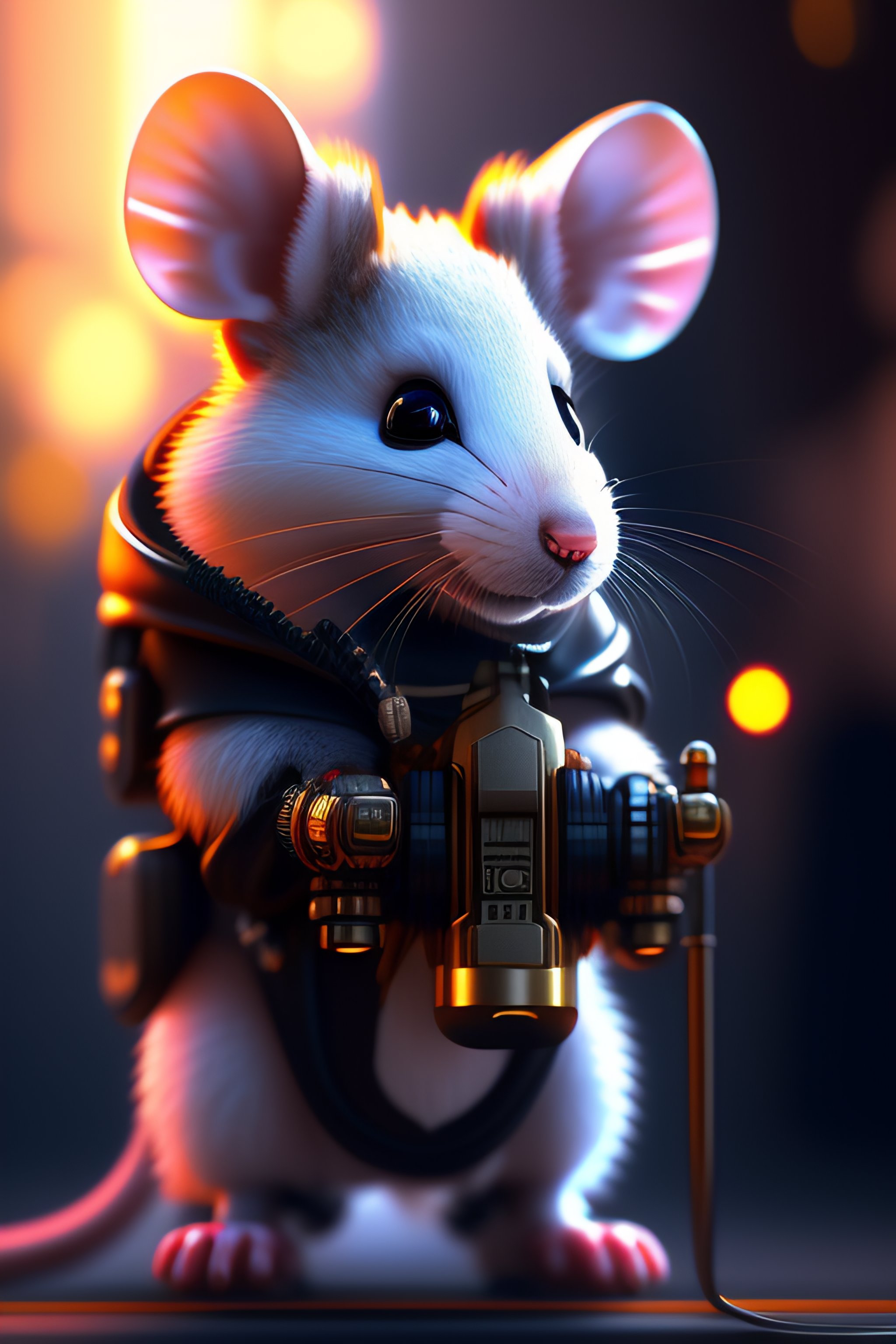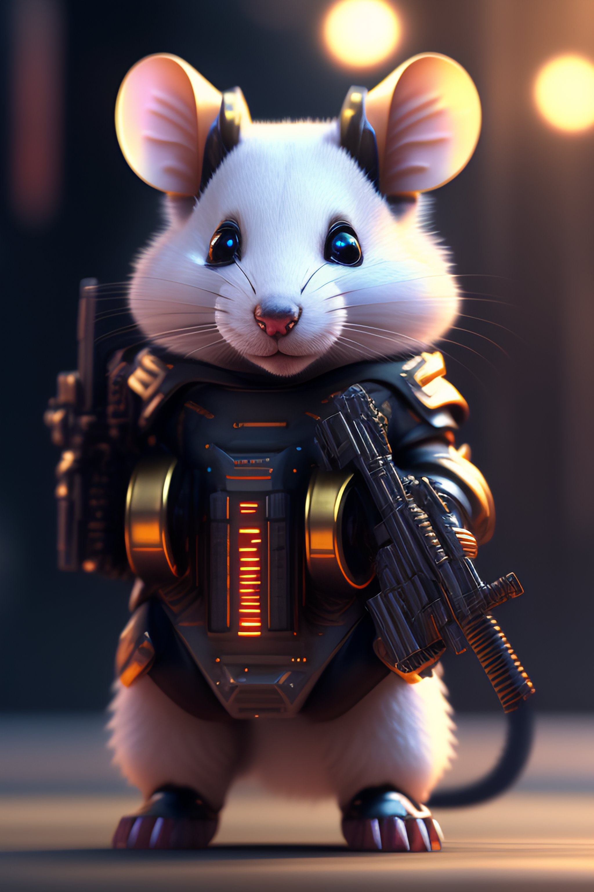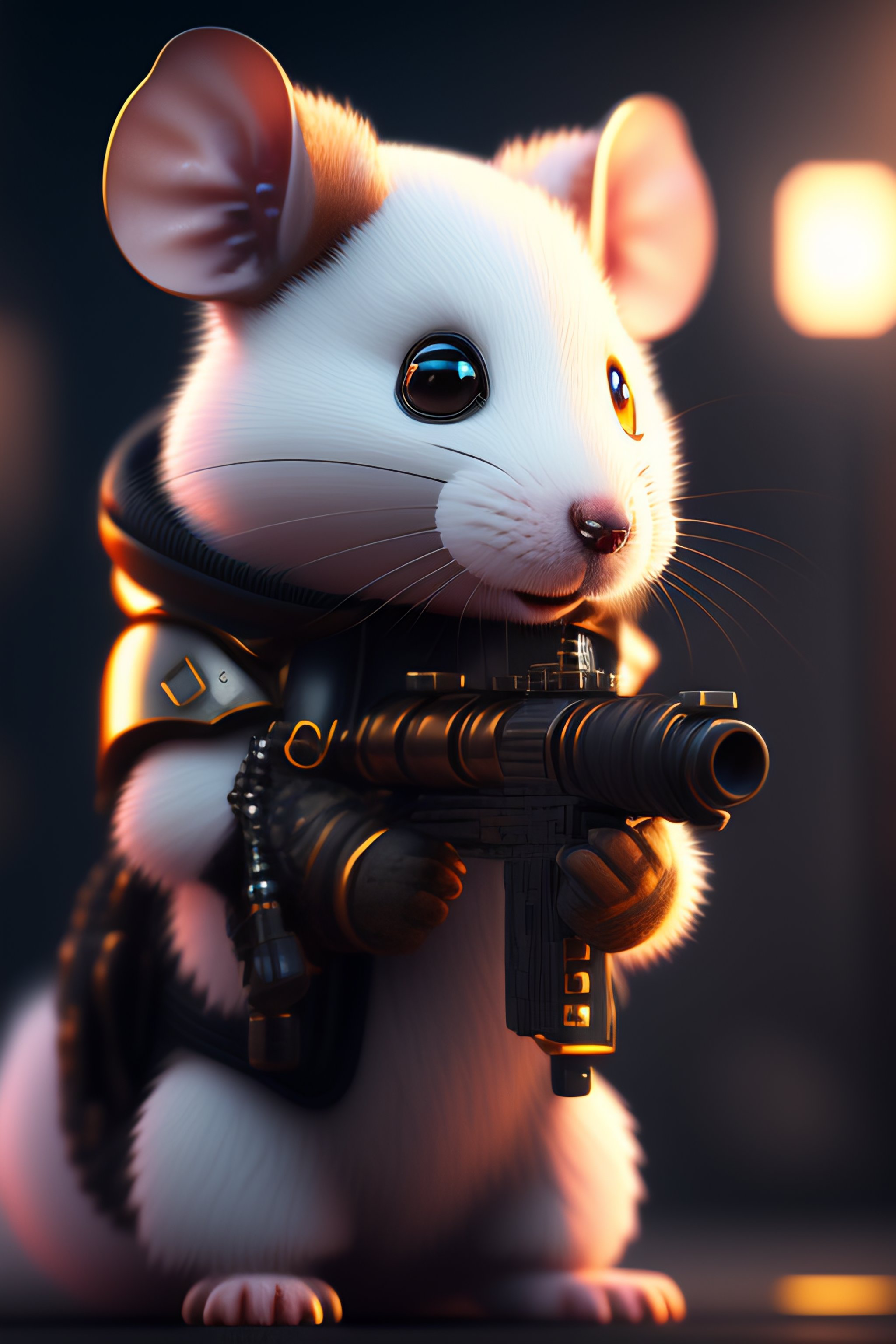 High quality 3 d render very cute fluffy cyborg!! rat with mashinegun, cyberpunk highly detailed, unreal engine cinematic smooth, in the style of blade and terminator, half robot half rat, moody light, dangerouse, uhd 8 k, sharp focus