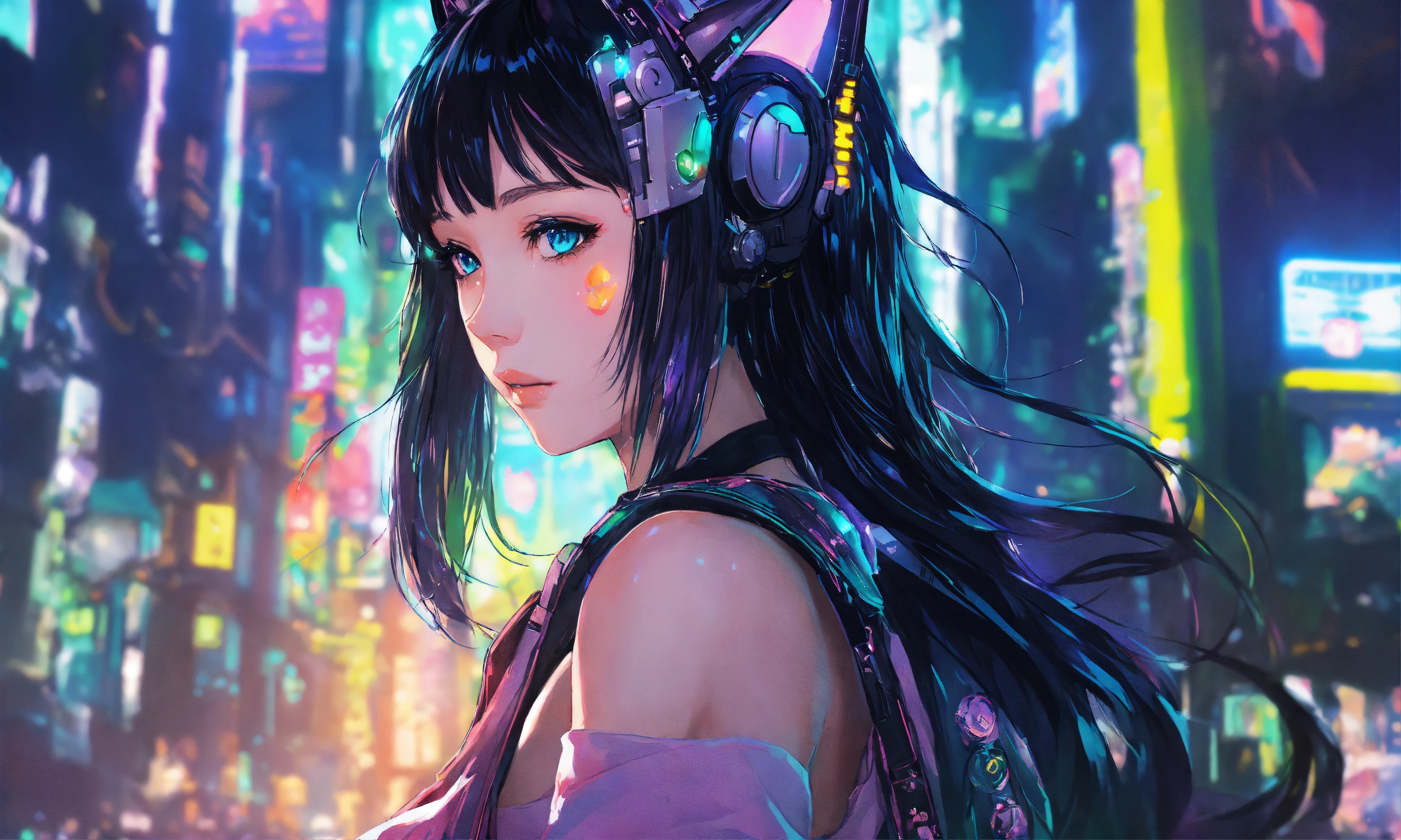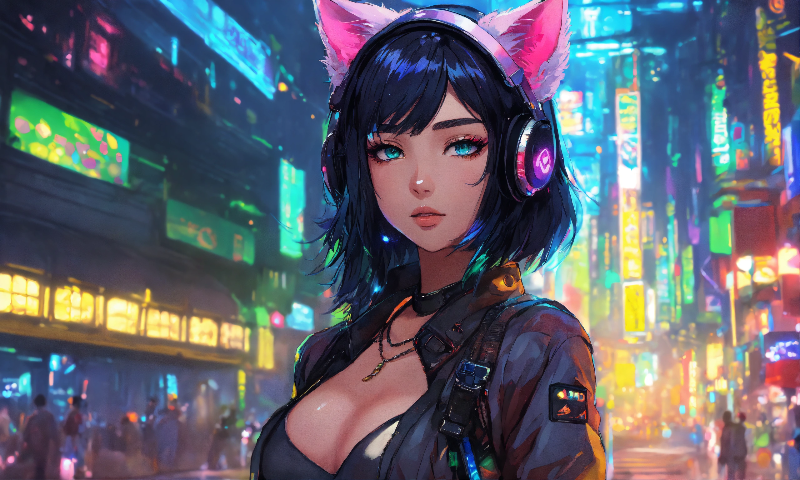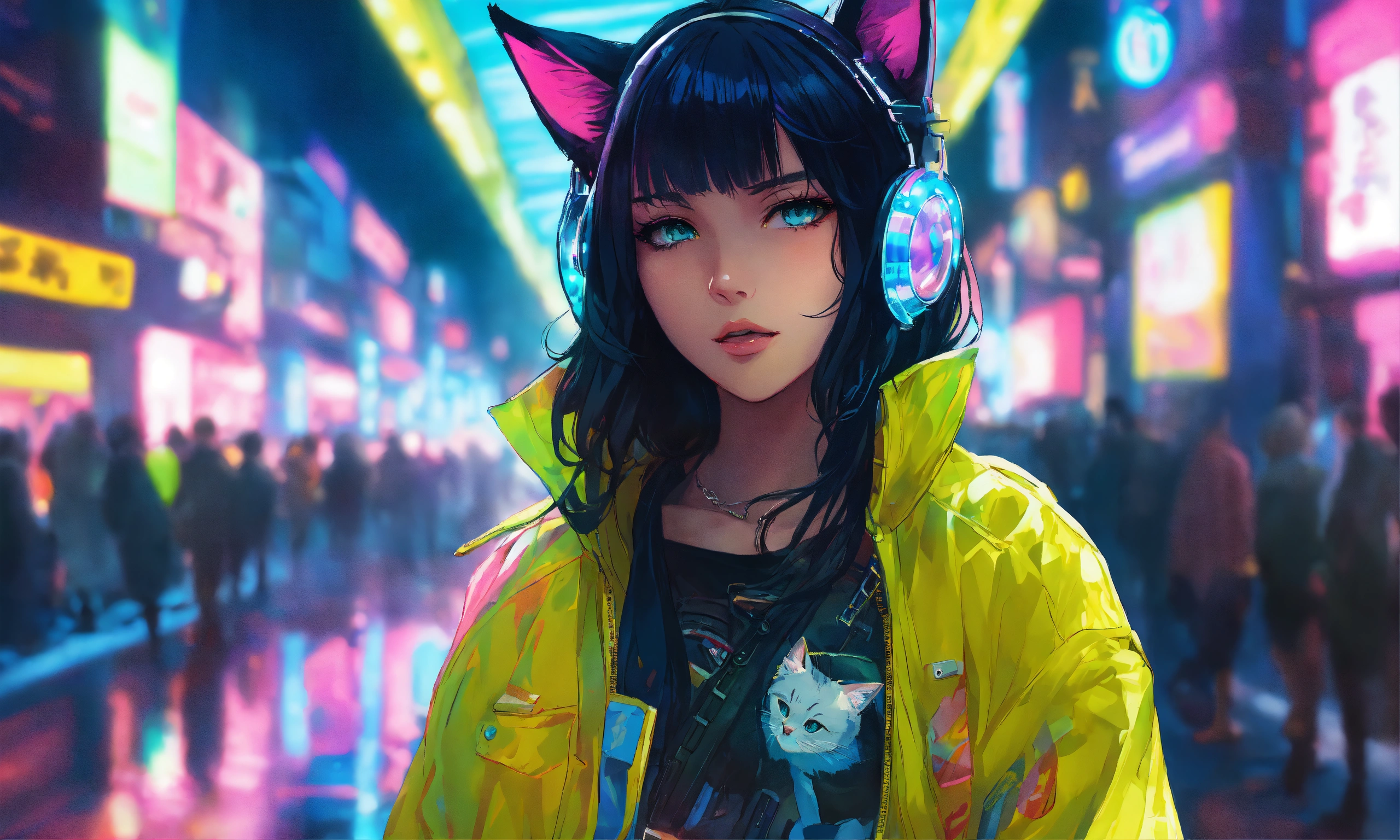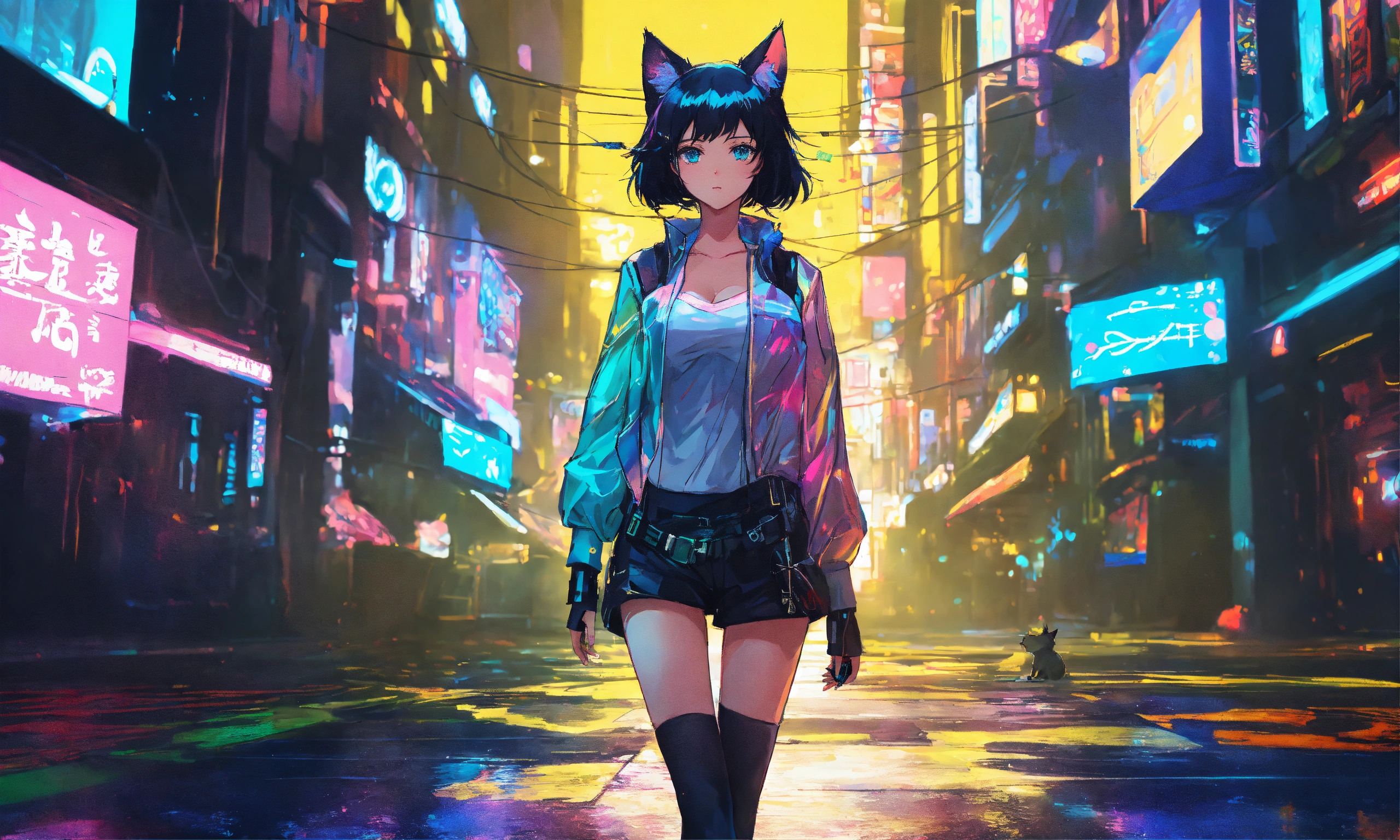 In a detailed anime style with beautiful, exquisite artwork, illuminate a scene featuring a cat-eared girl with black hair and blue eyes. use dazzling shadows, bold colors, and candy cotton pastel tones. the background should encompass a cyberpunk theme, lit with yellow and green lights.