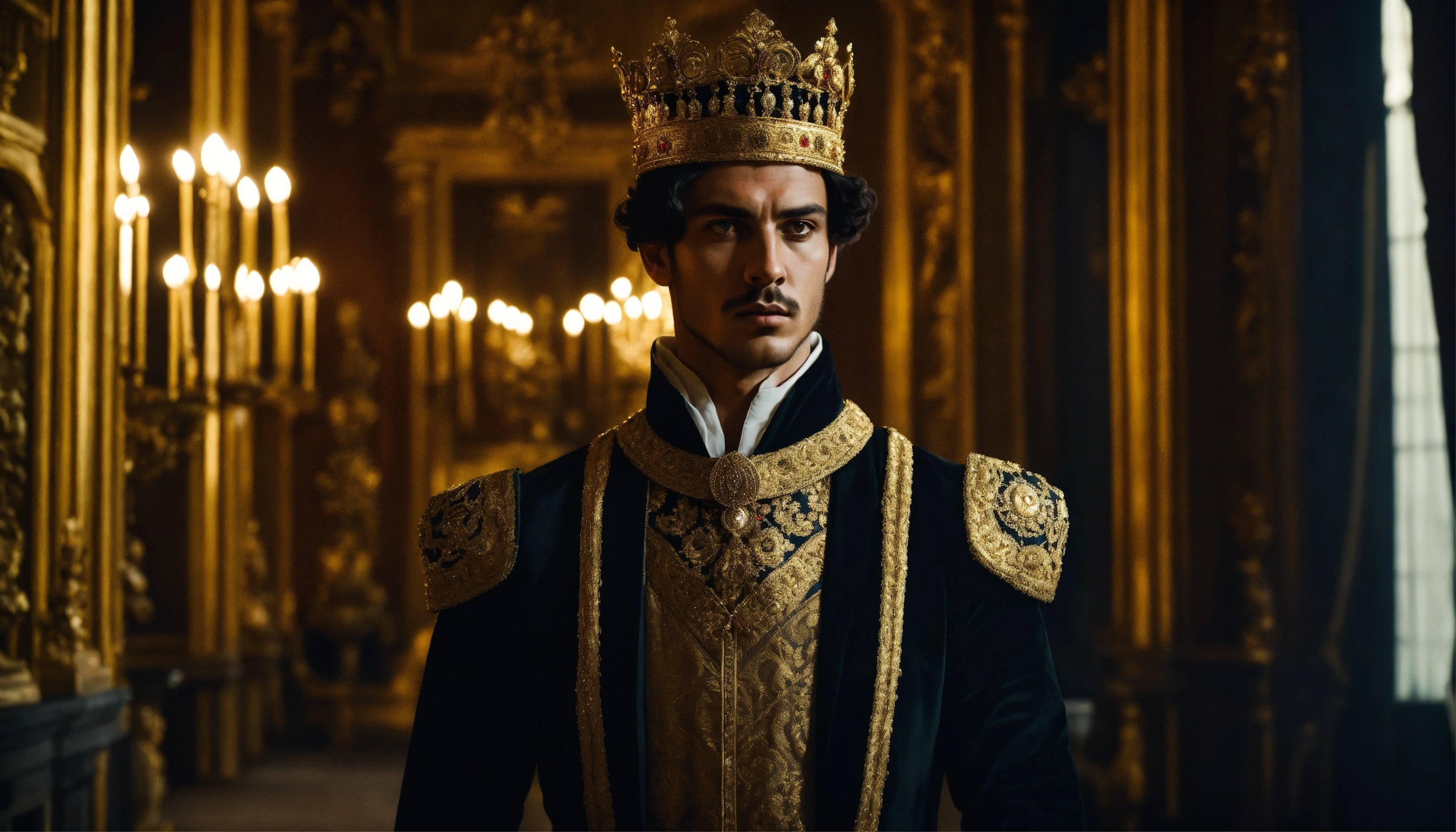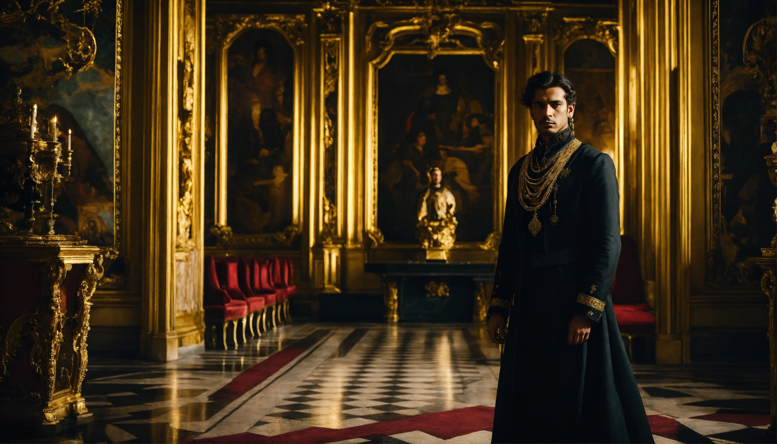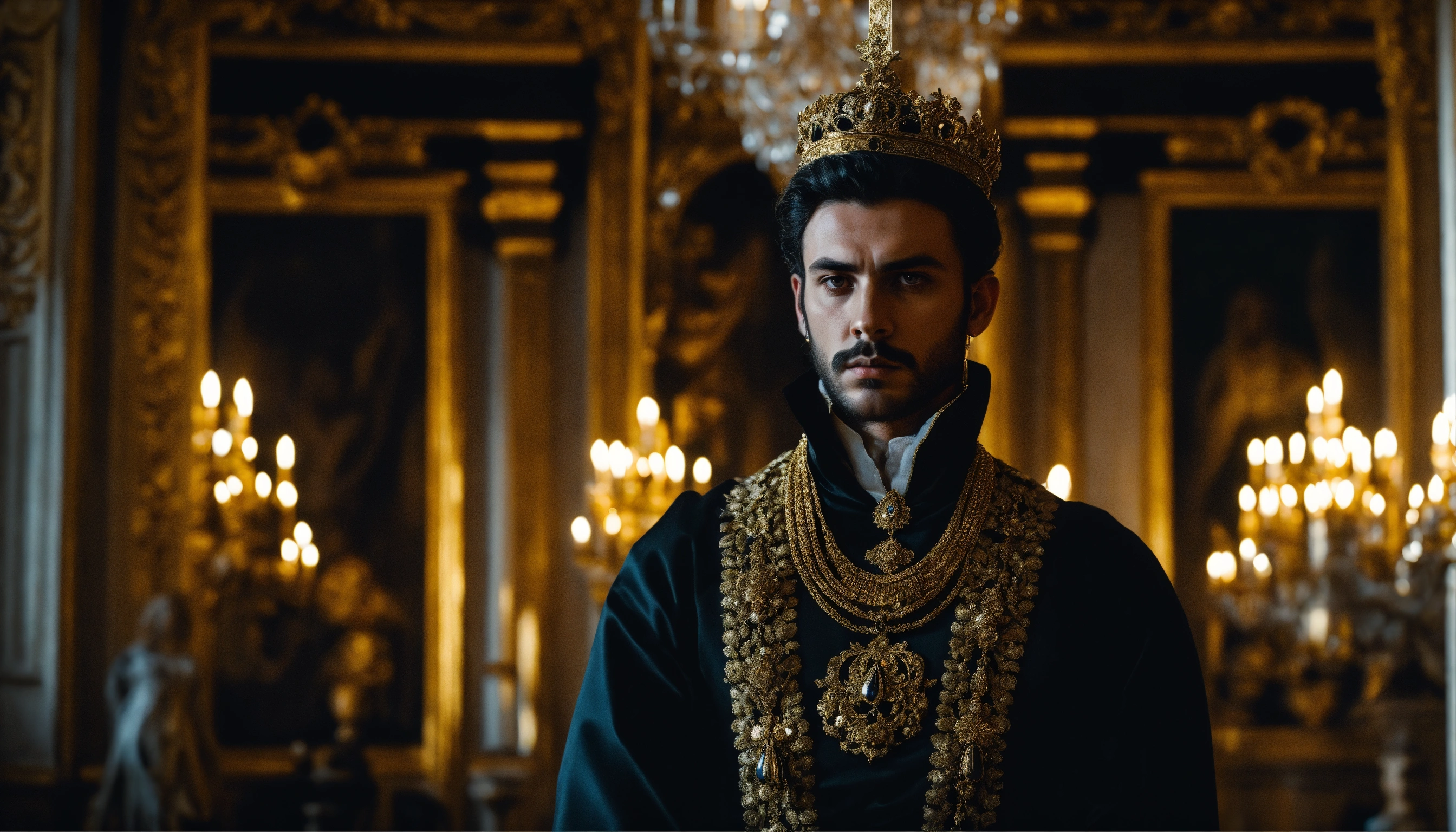 Dark, mysterious and dramatic portrait of a young handsome ancient french tyrannical king with a sinister stare wearing black, elaborate clothes and ornate gold jewellery in a richly decorated palace hall in the evening