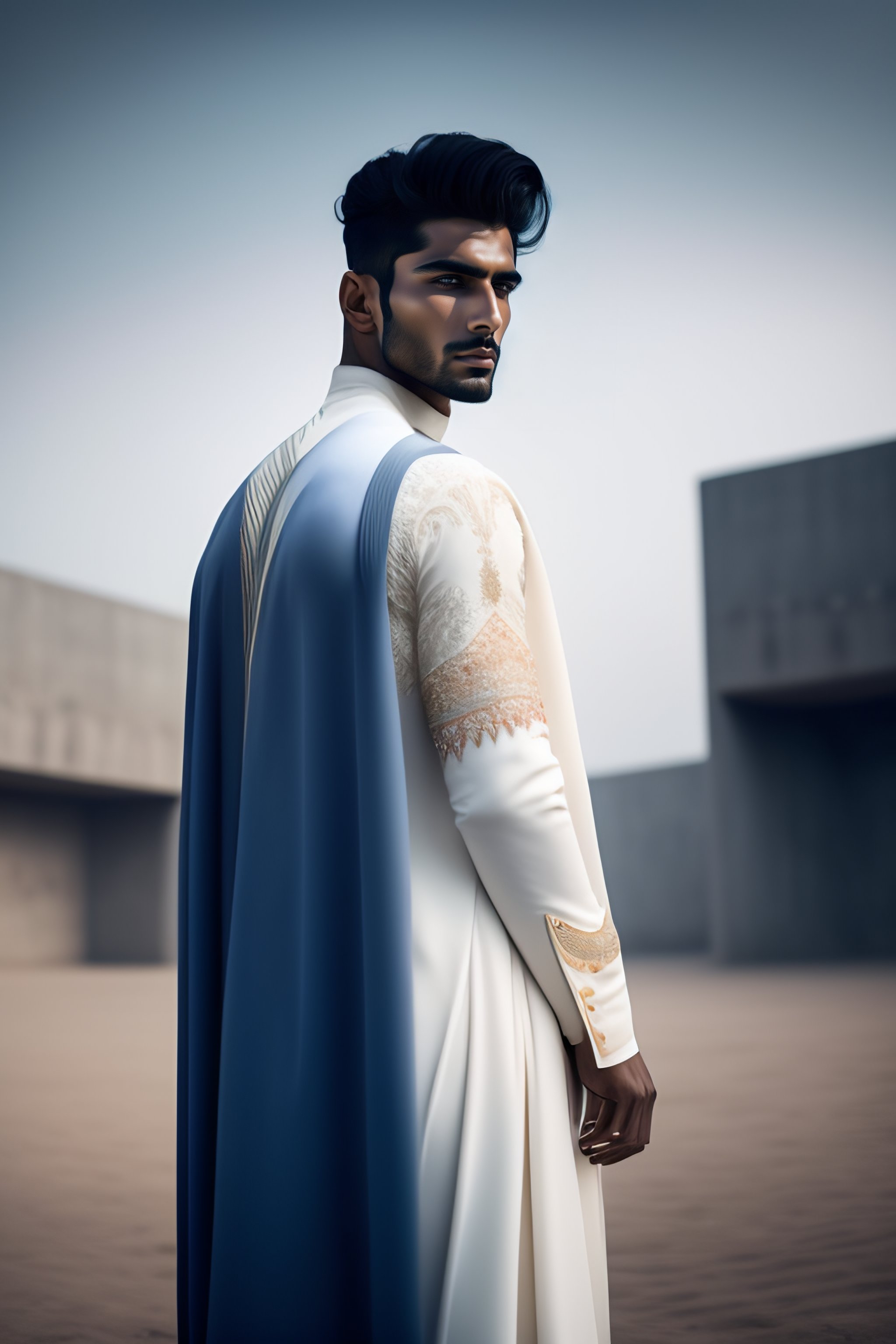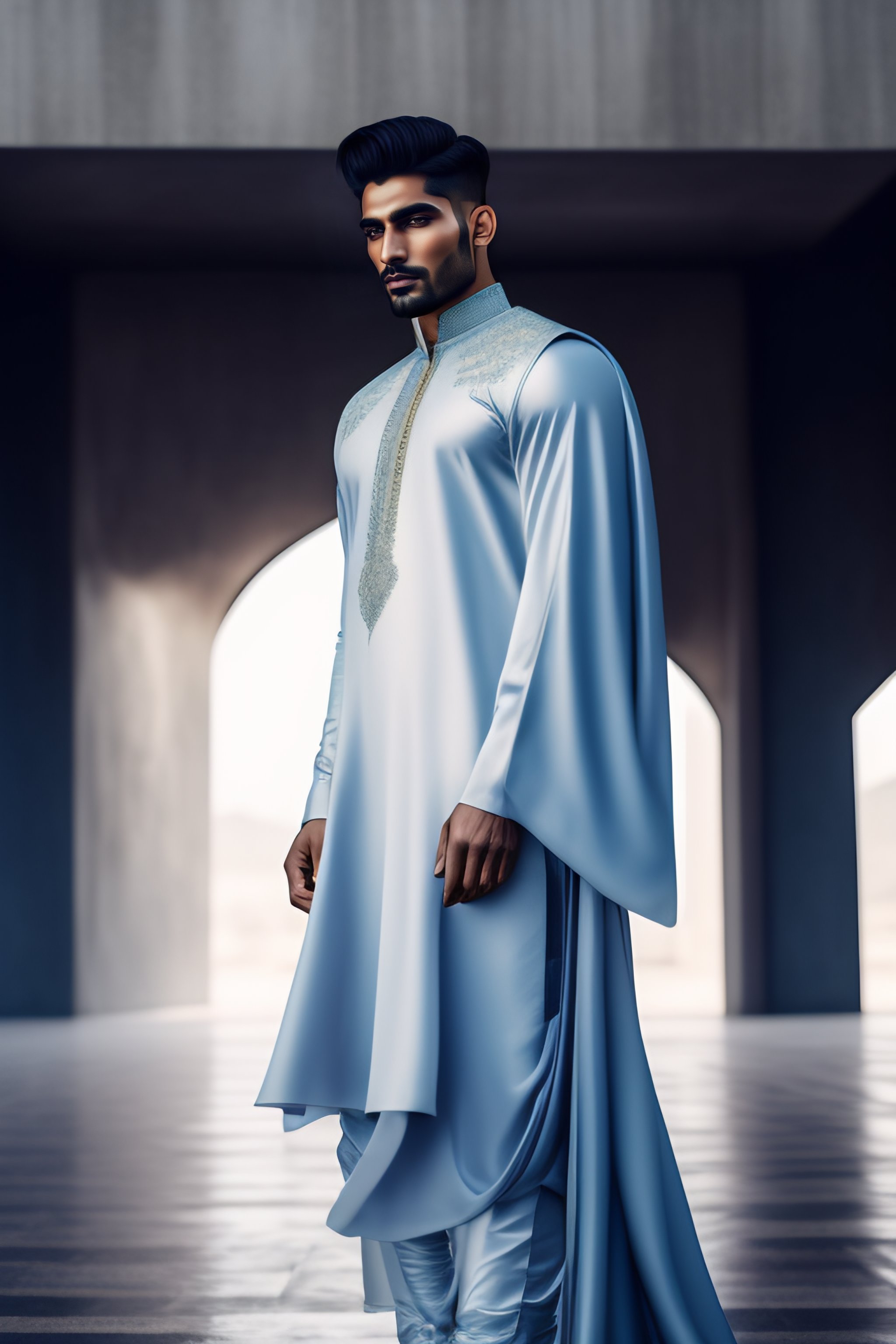 Portrait of haute couture beautiful pakistani male fashion model, ethereal dreamy foggy, photoshoot by alessio albi, editorial fashion magazine photoshoot, fashion poses, in front of brutalist building architecture. kinfolk magazine. black, ultra detailed, 8k, clothing, blue, full body visible from head to toe, front view pose, shalwar kameez