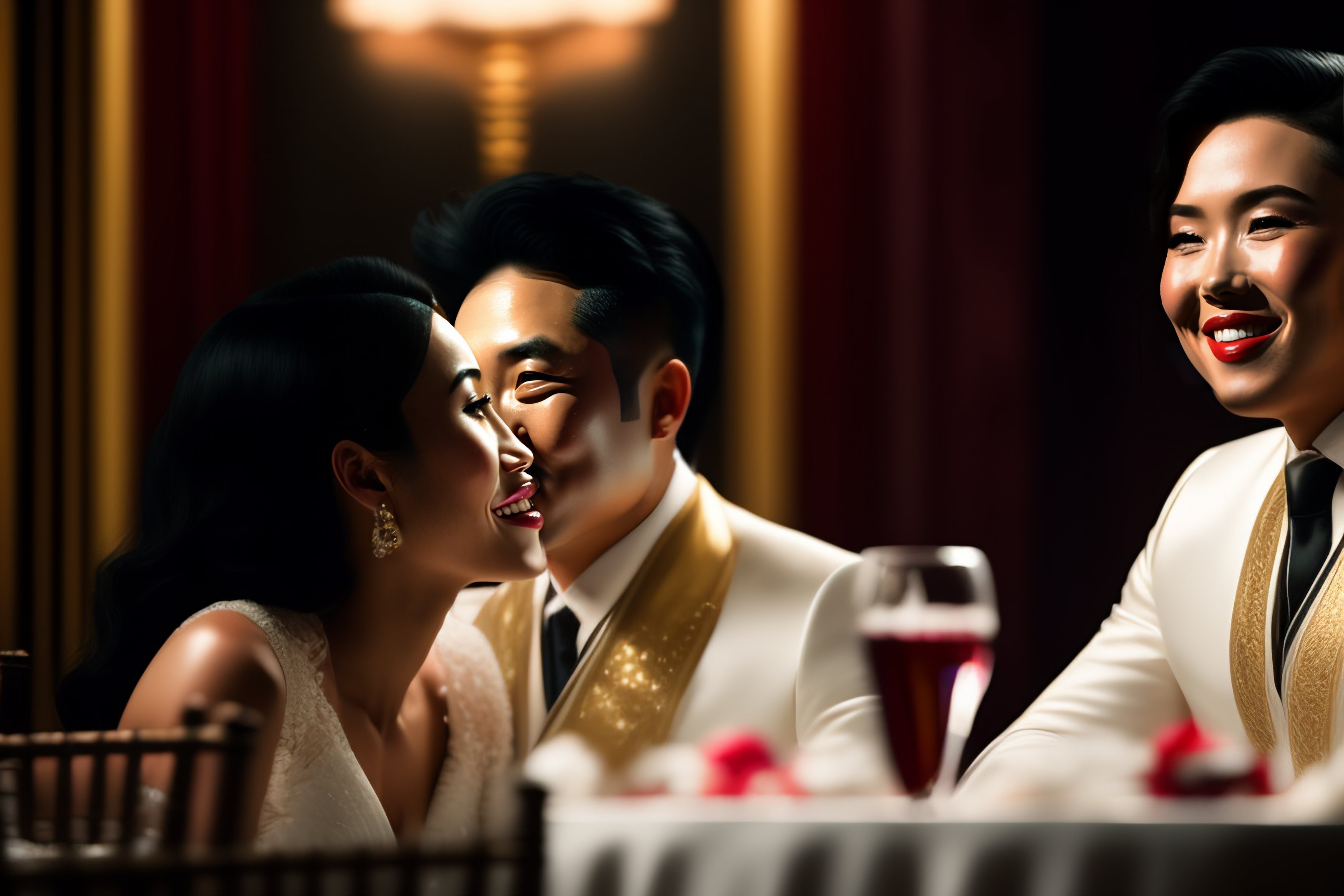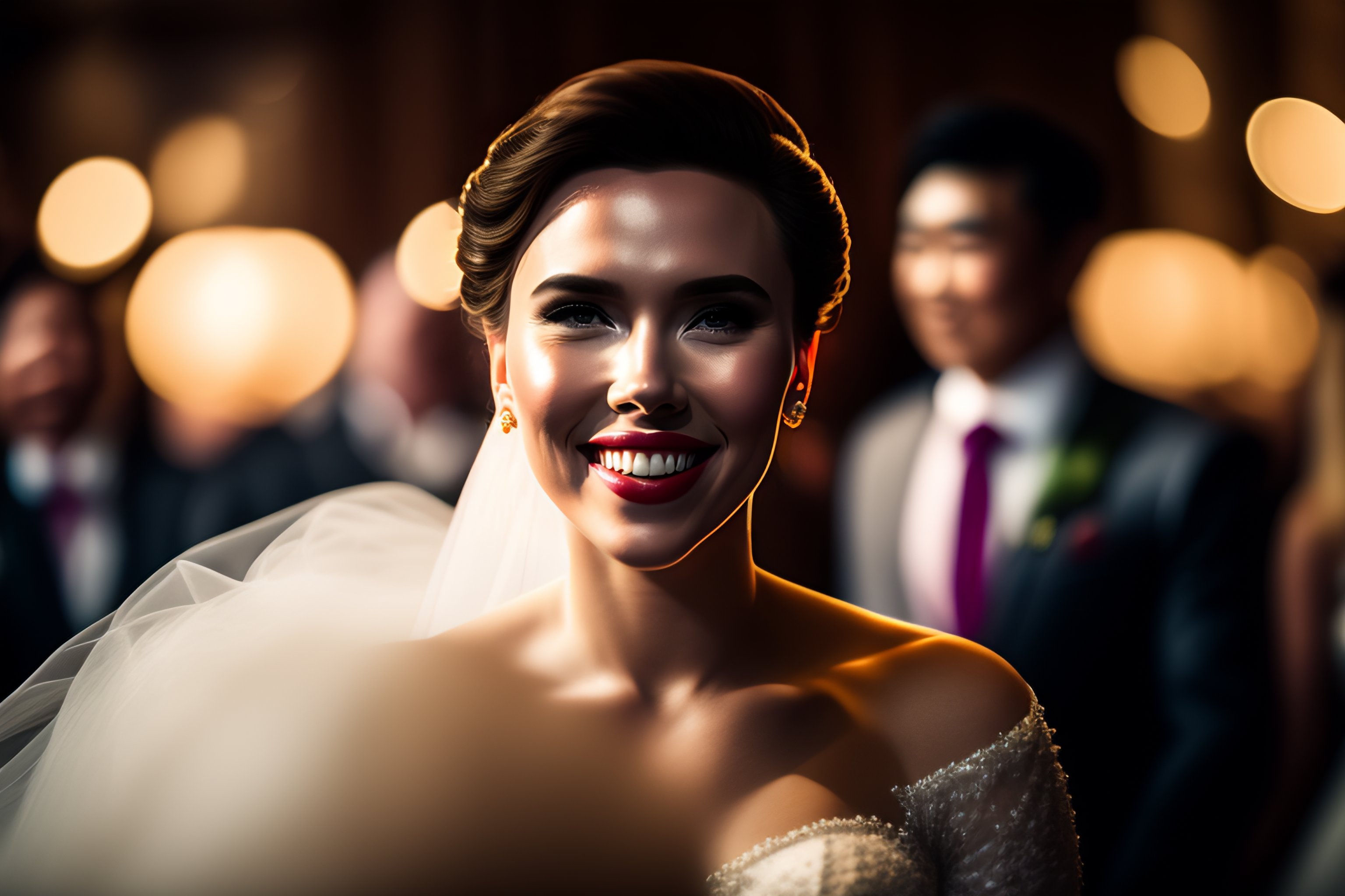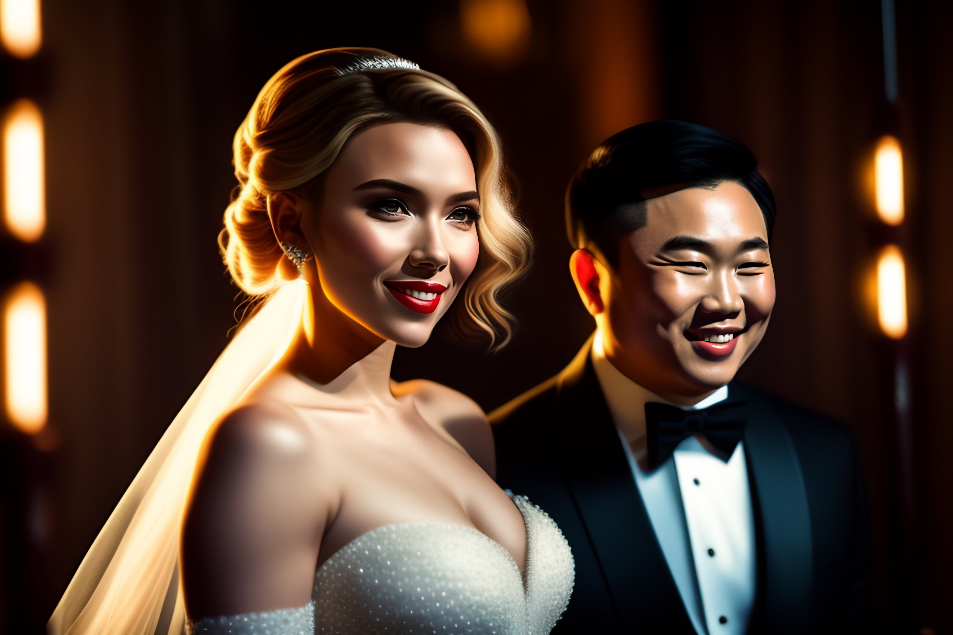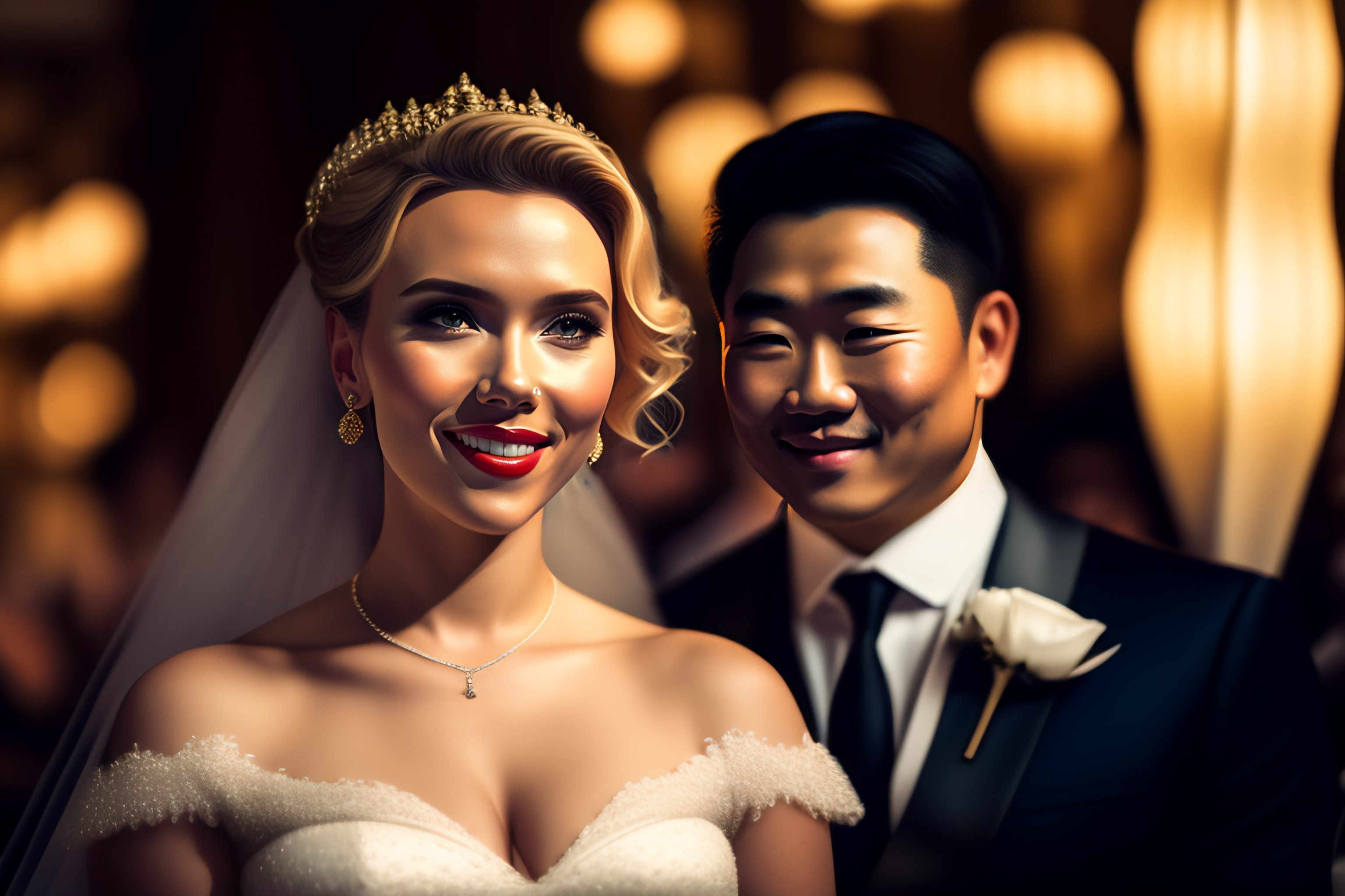Scarlett johansson in a wedding dress with a money, and asian man smiles, cinematic, beautiful, warm lights, shadows, reflections, cinematic lighting, 8k, hyper realistic, post processing, full body, romantic