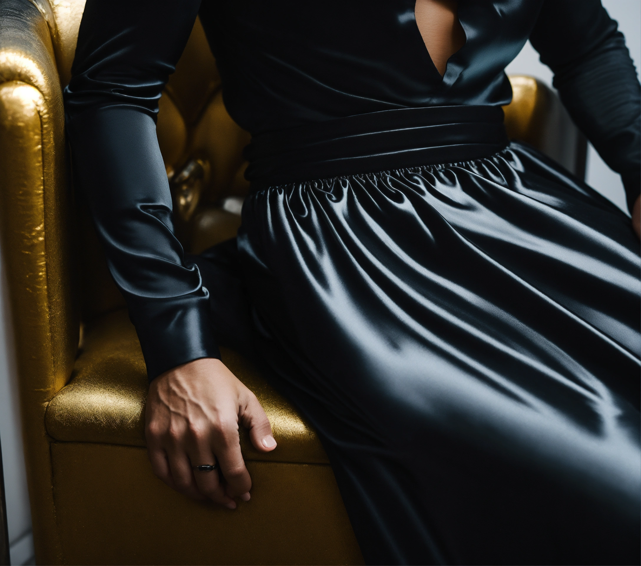 Man sat on throne, godlike body, tight black satin shiny figure-hugging clingy pencil maxi skirt, pulled tight. close up.