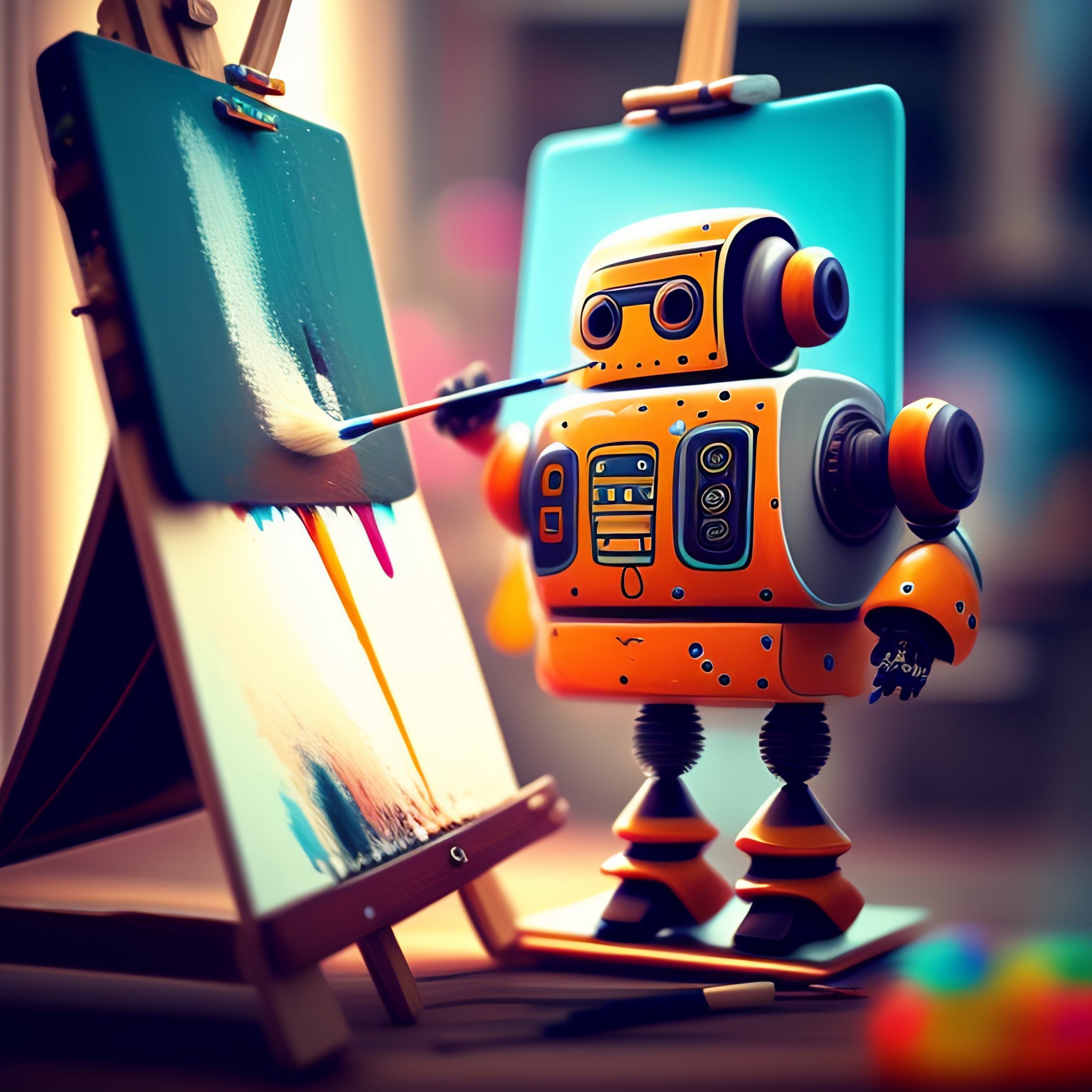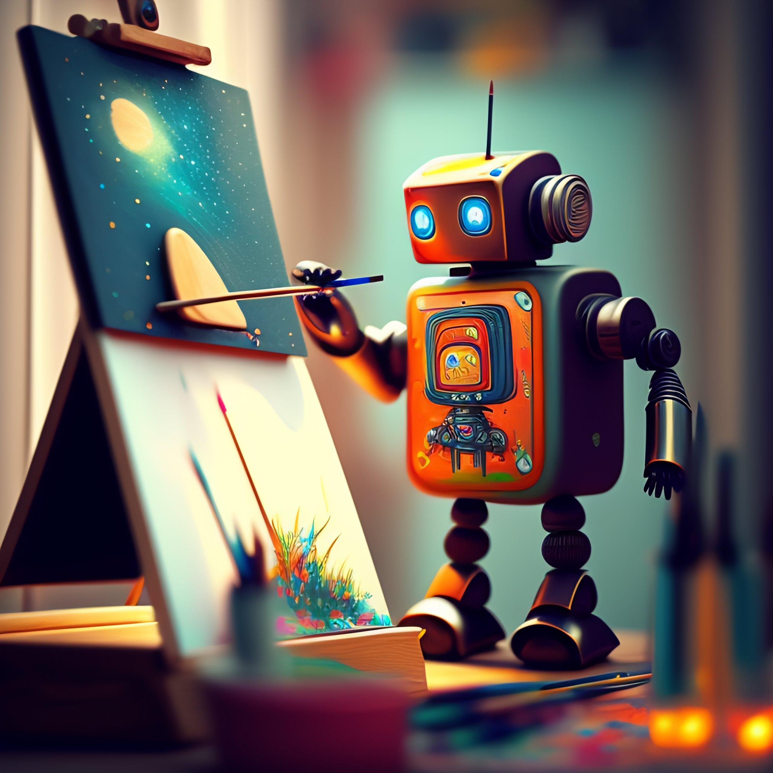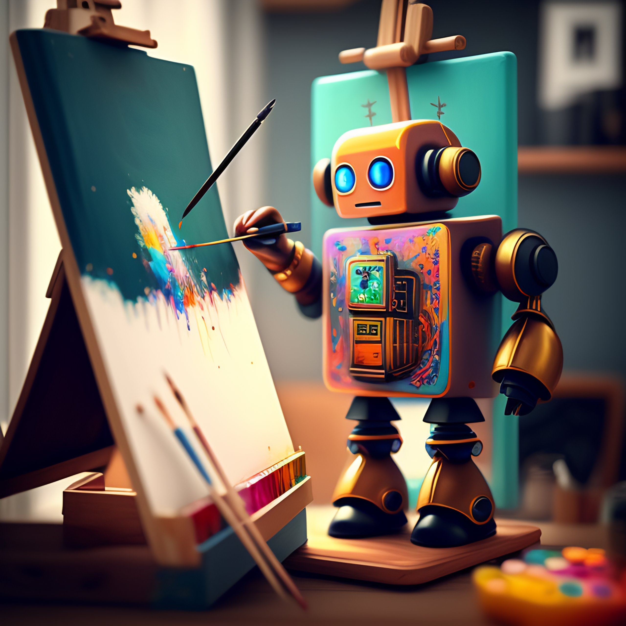 A cute robot artist painting on an easel