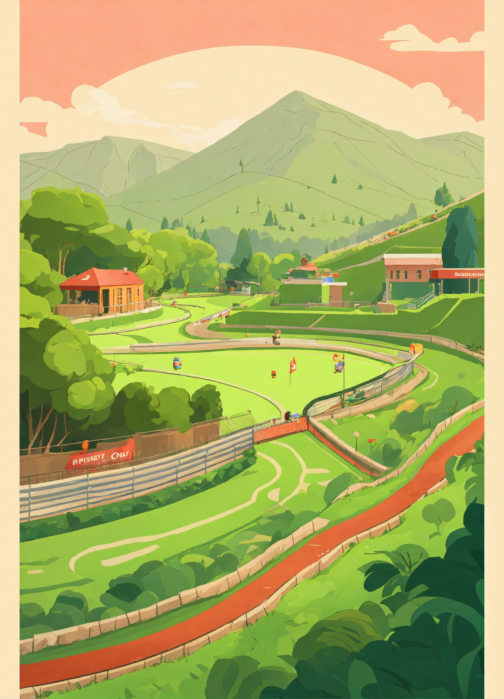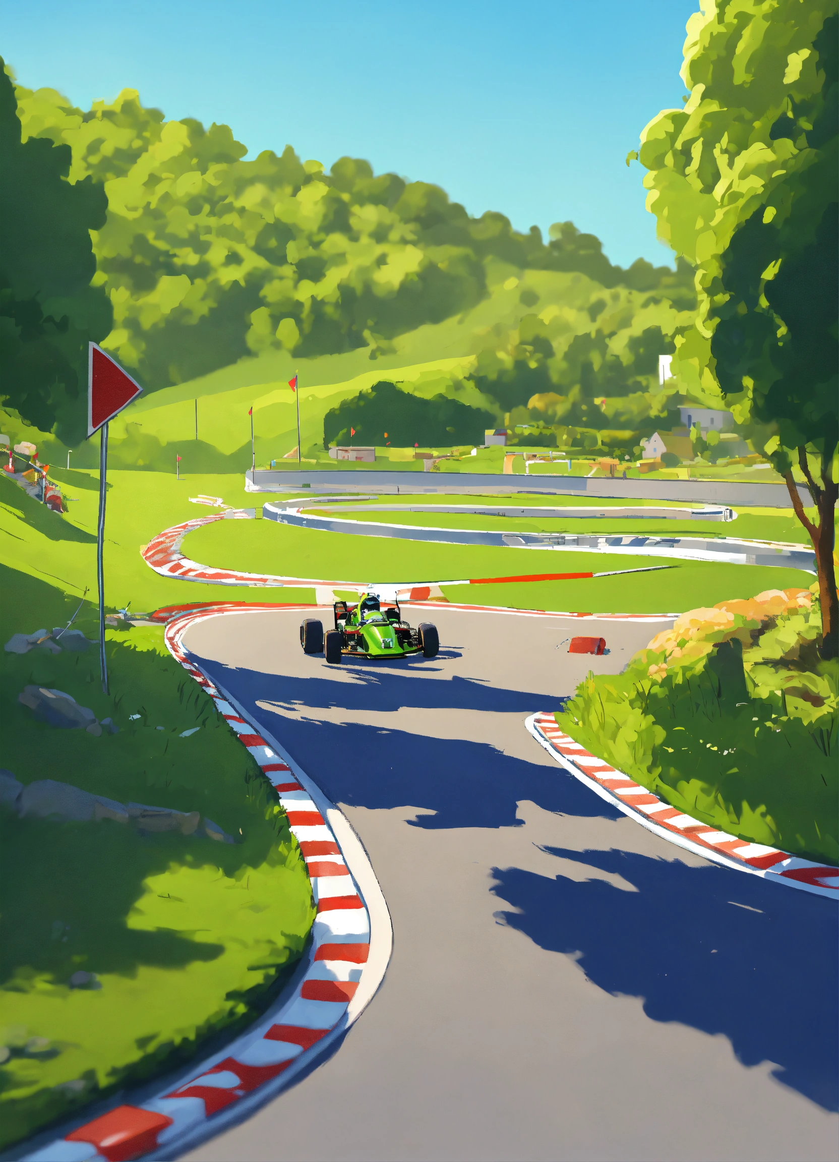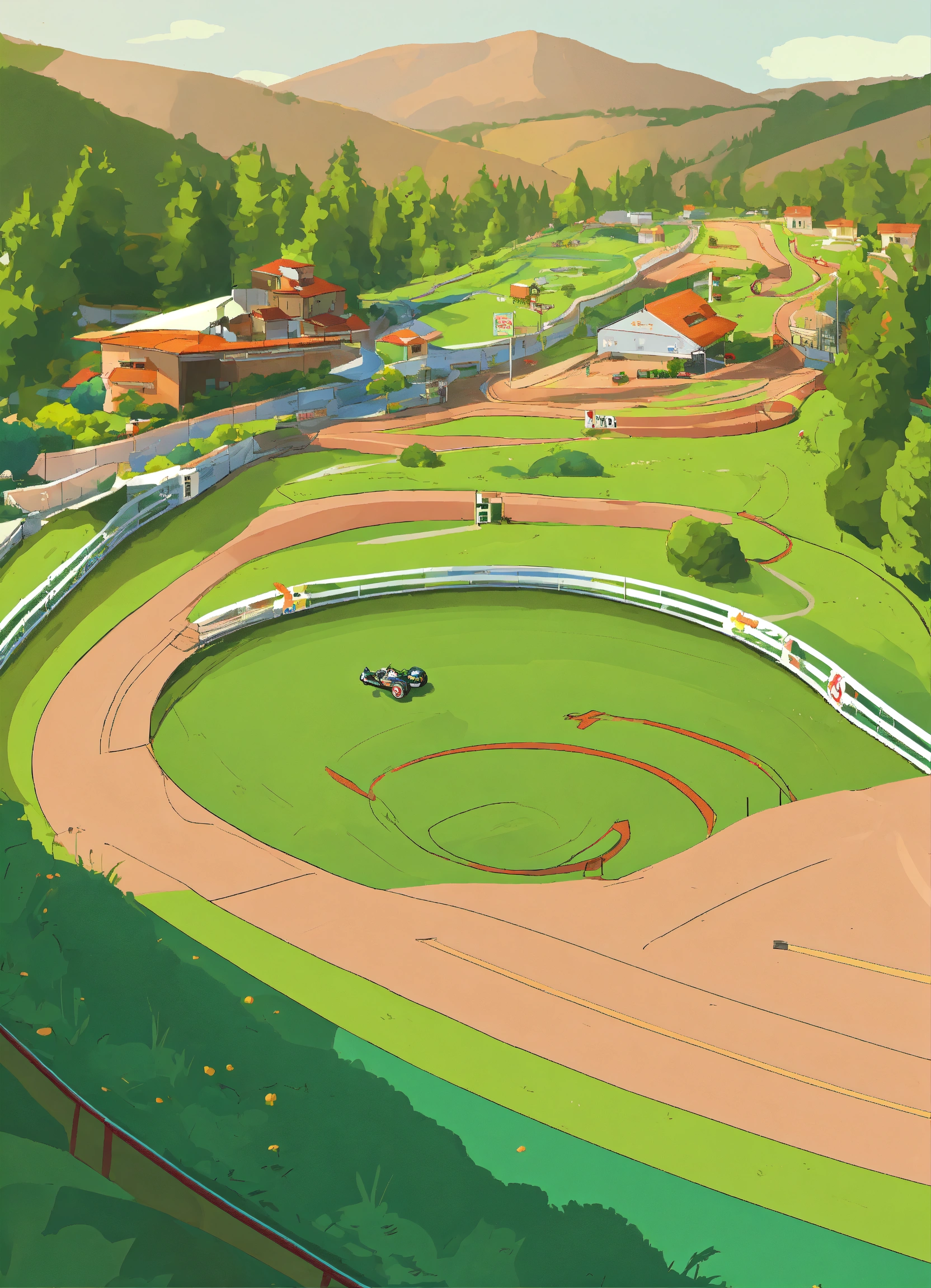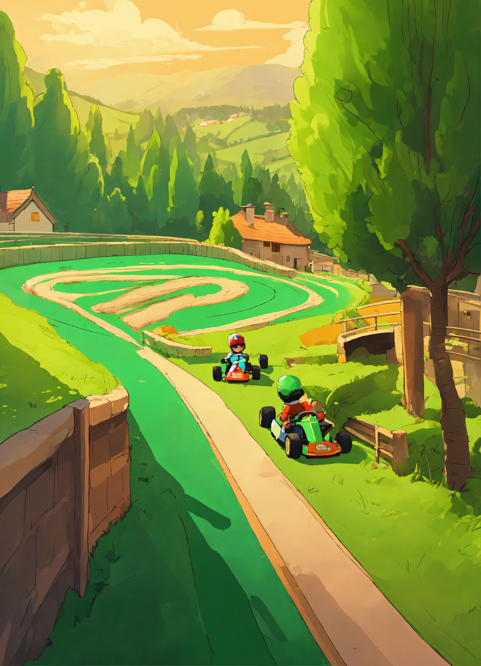 A picture of green kart track inside saint chely d'apcher in a cartoon way