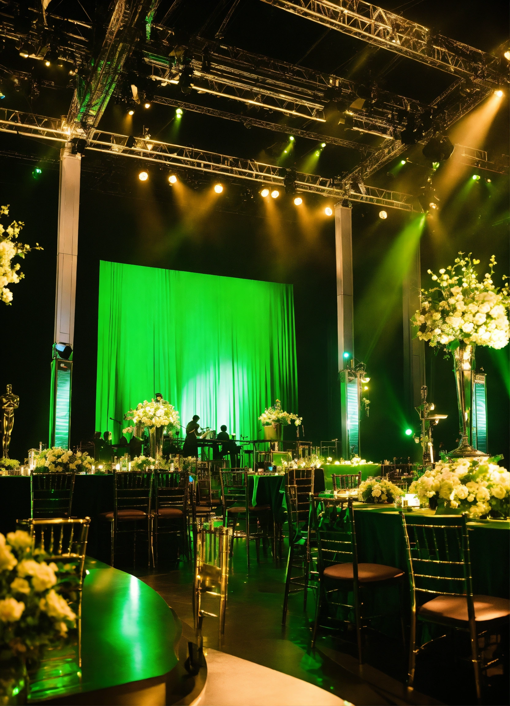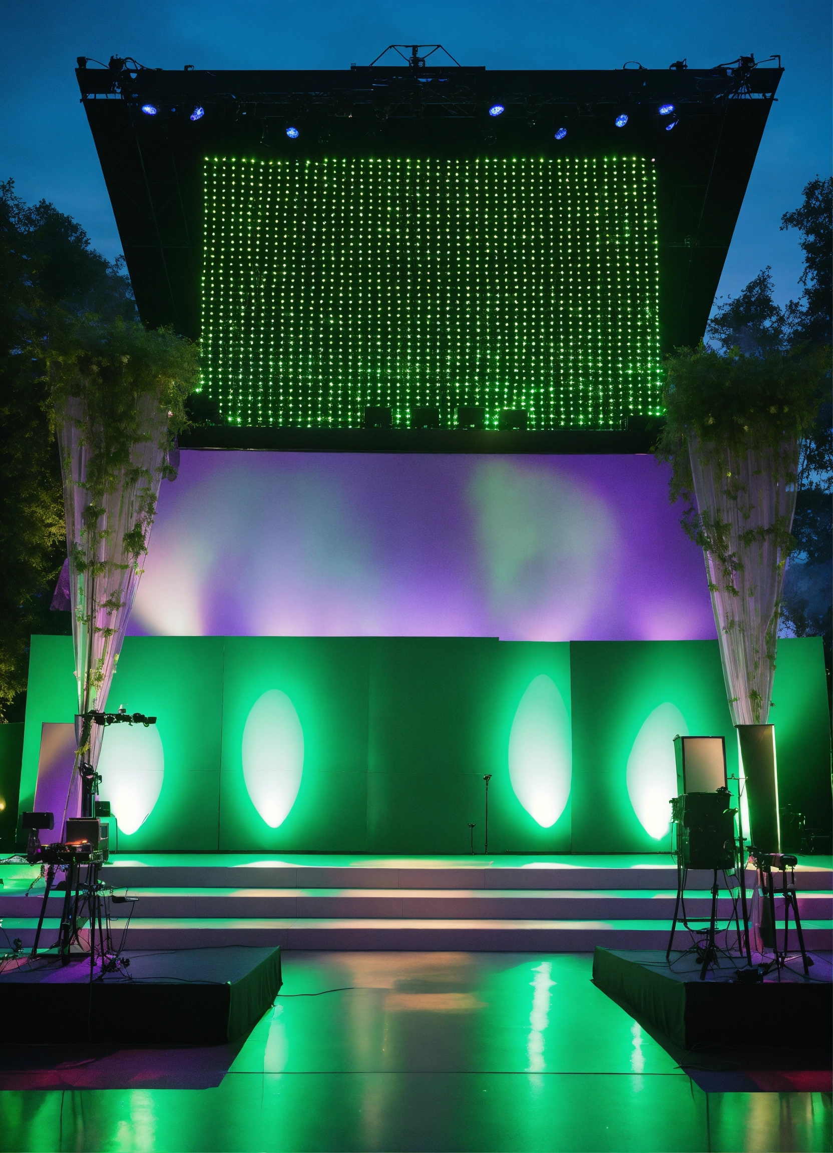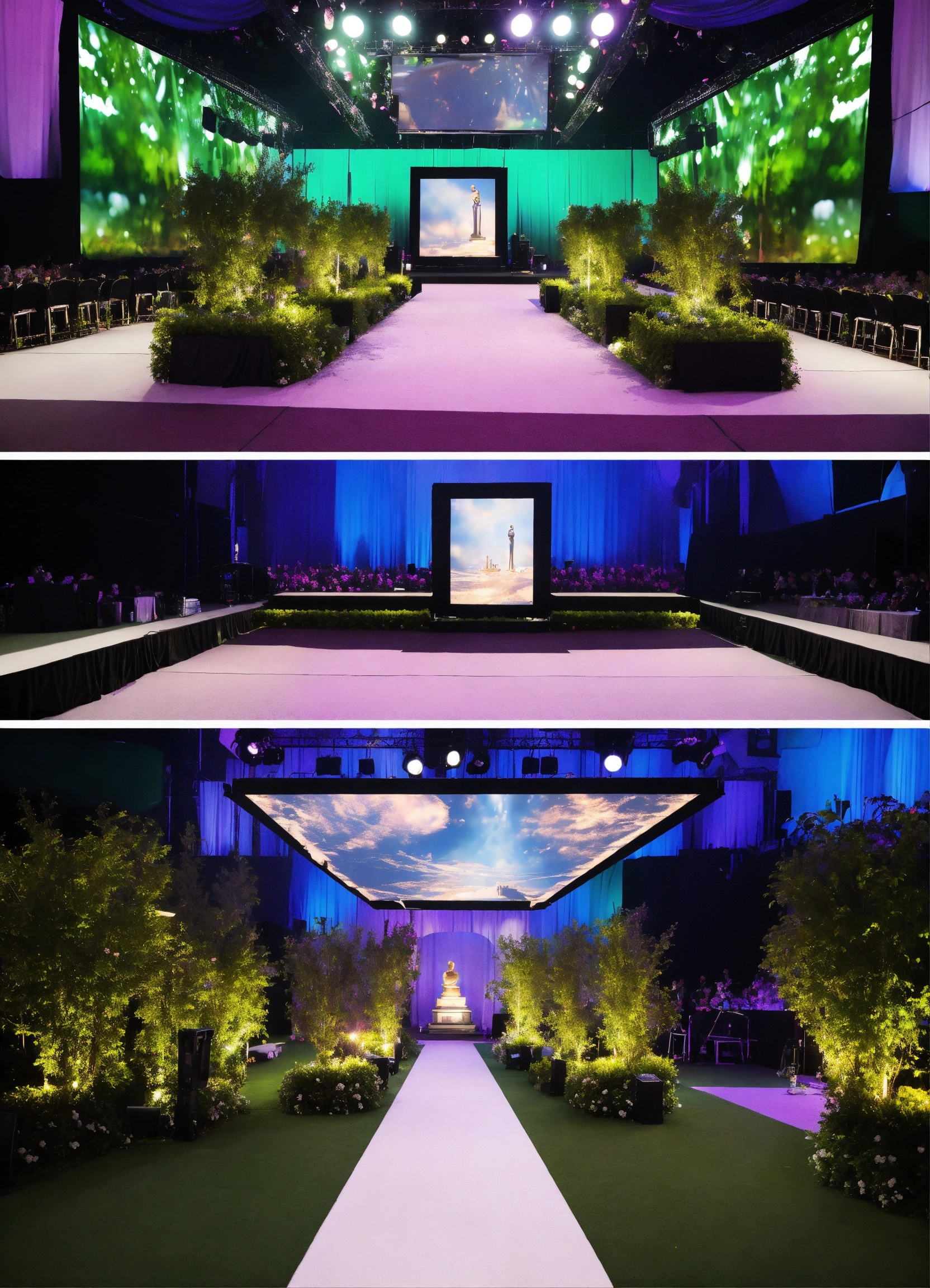 Design a medium size garden prestigious stage for an awards ceremony similar to oscars with led screen main screen with 4 side vertical led screens separated from each other for display, add truss system with lighting towards the stage, add nice glamorous steps to the stage with lights including a premium skirting on the side as a decor, incorporate the theme to be about raising the bar concept, use blue white and green colors