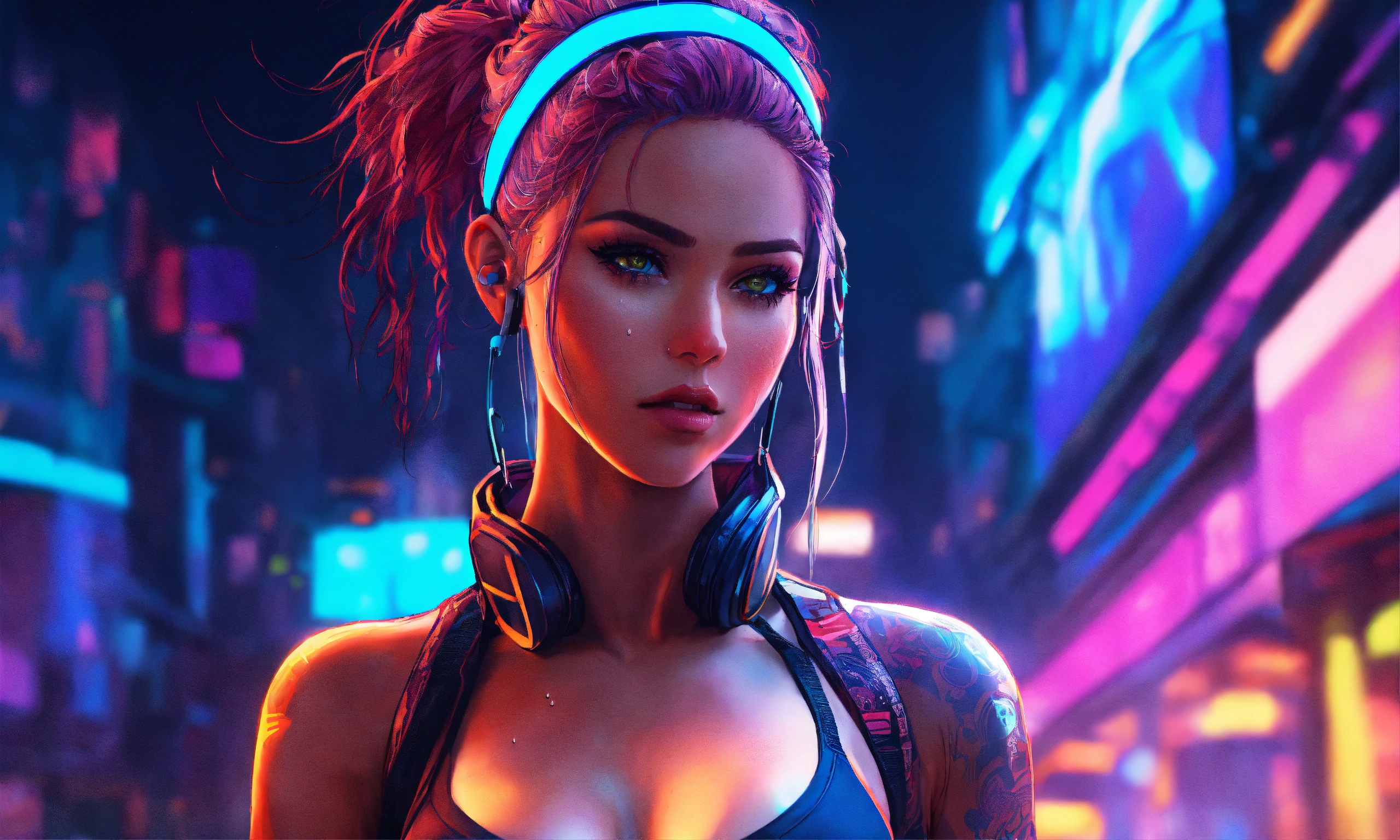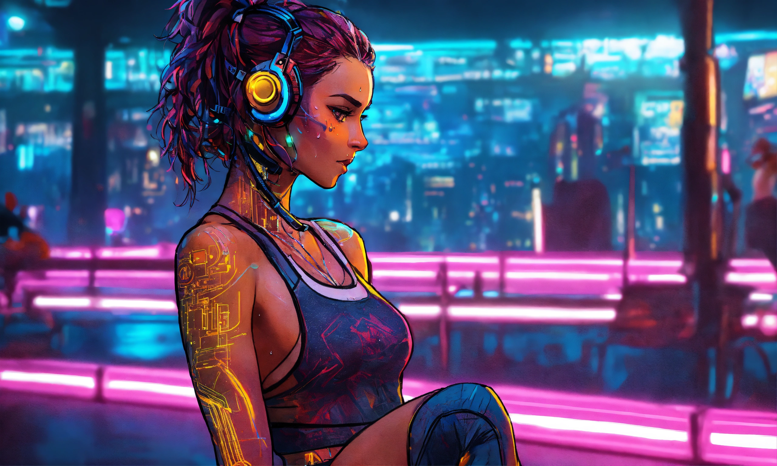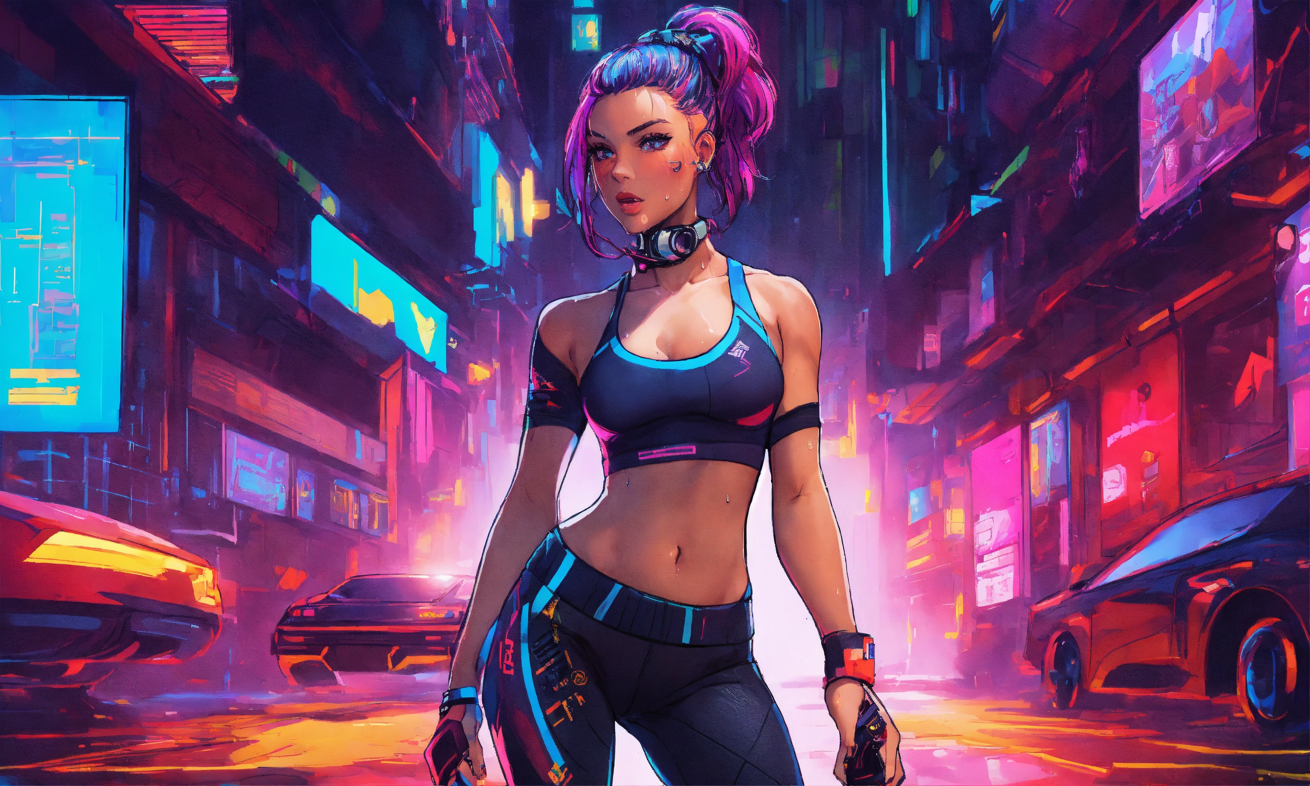 Cartoon, sporty, girl in fitness, fit, stacked, sweaty skin cyberpunk style, very intricate details, elegant, neon lights, highly saturated
