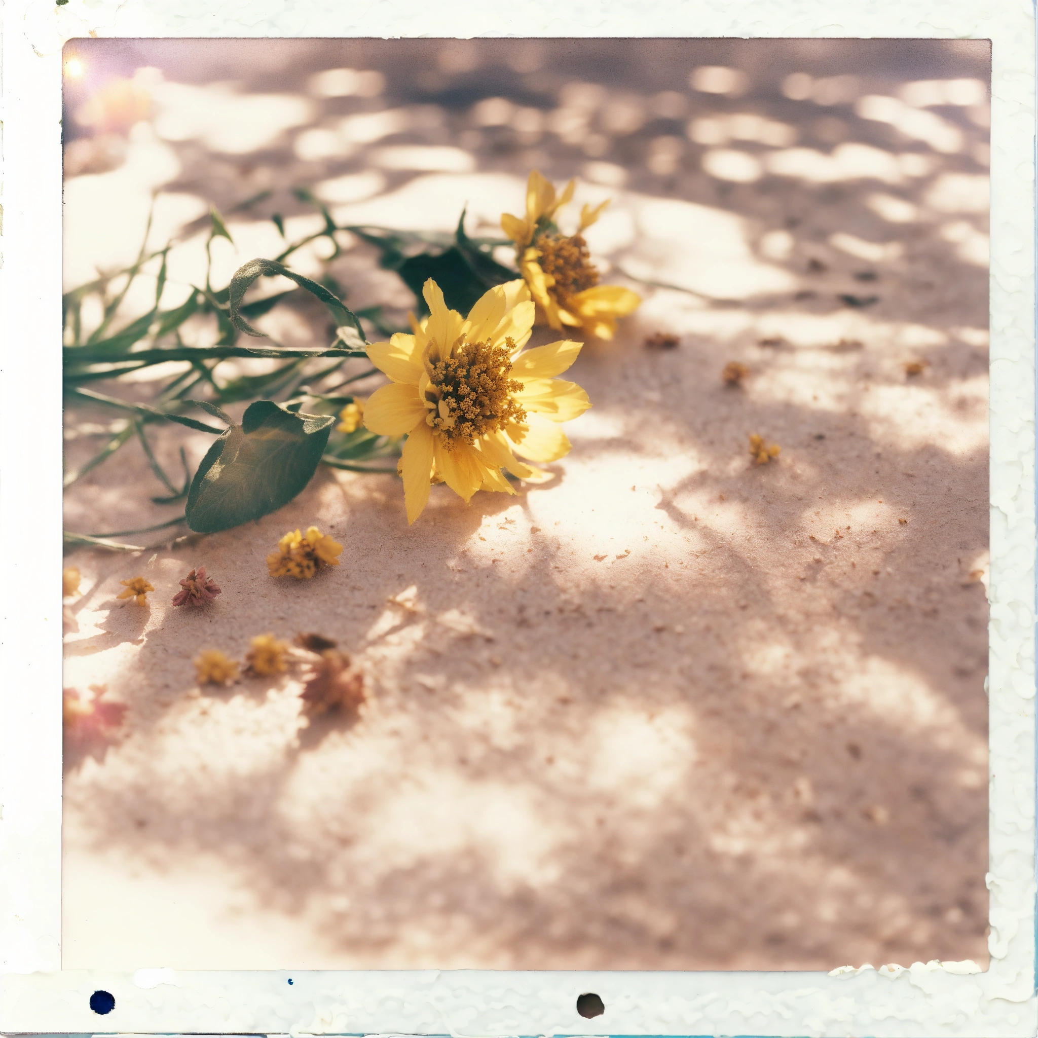 Memories, polaroid, small dried flowers, realistic photo, polaroid, shadows, light flare, upper left corner, space