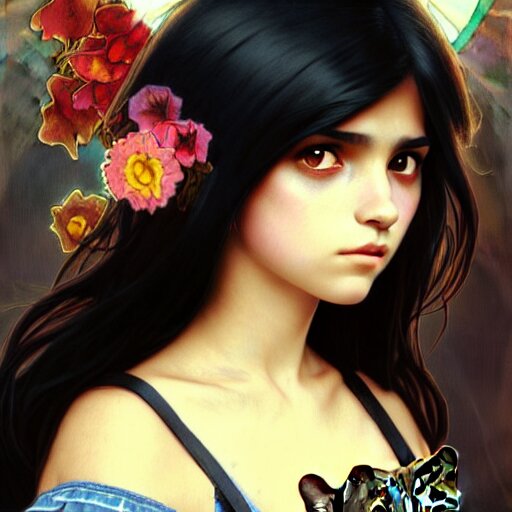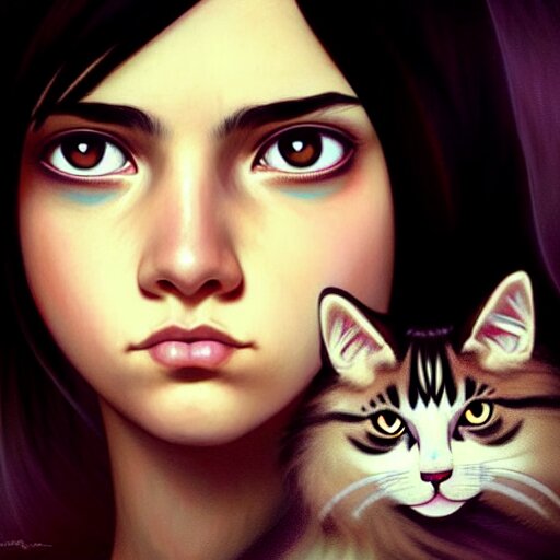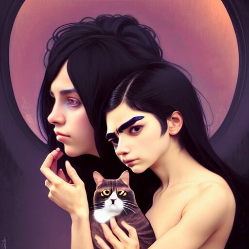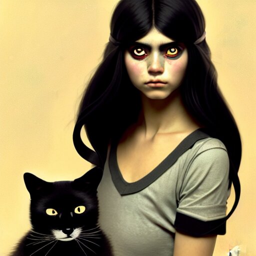 Emo mexican girl and her cat, with long dark hair, thick eyebrows!!! deep dark big shiny eyes and dark circles!, wide nose!, oval face shape, by juan villafuerte, greg rutkowski and alphonse mucha, pexels contest winner, high quality photo, rtx, hd