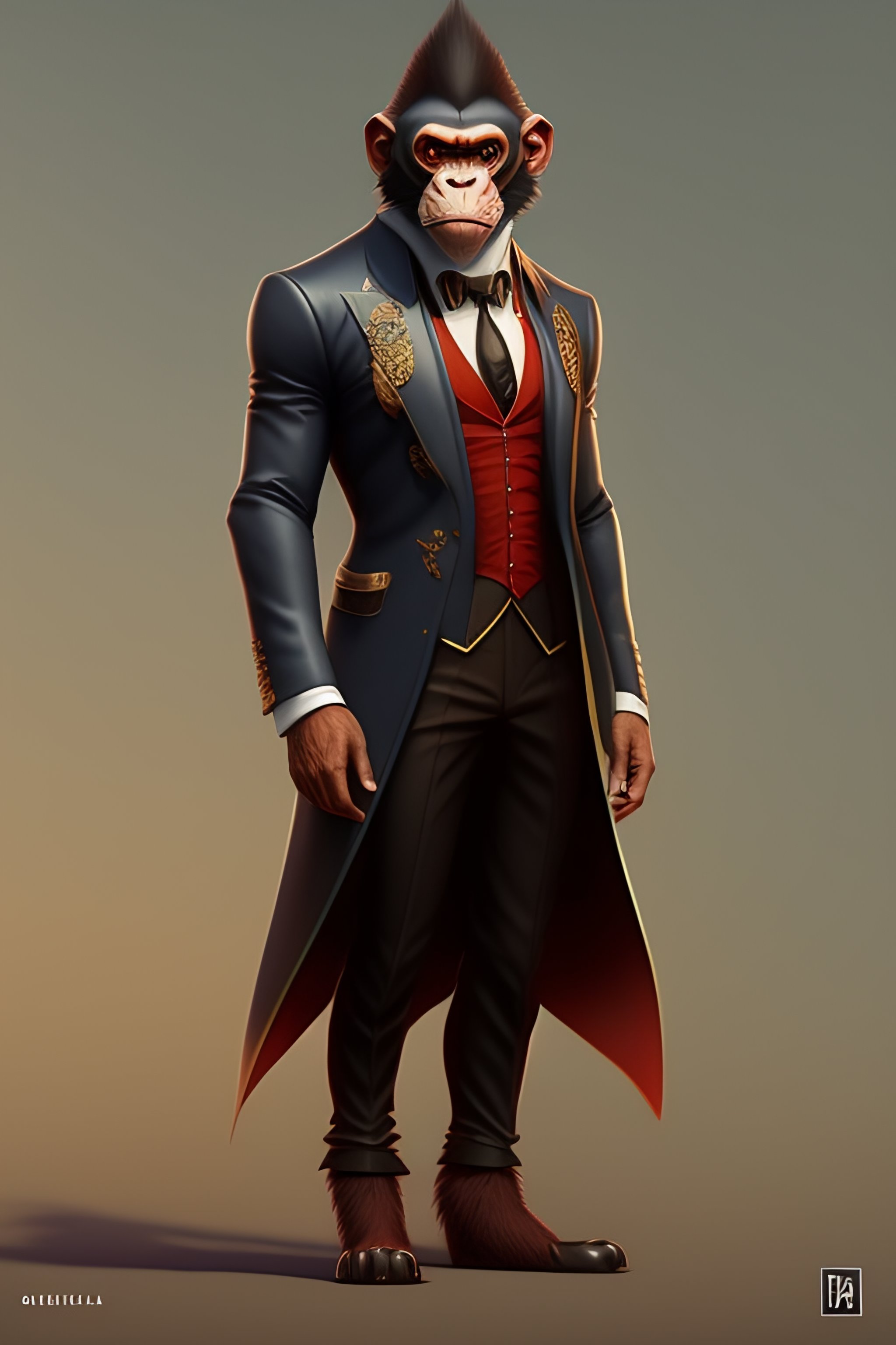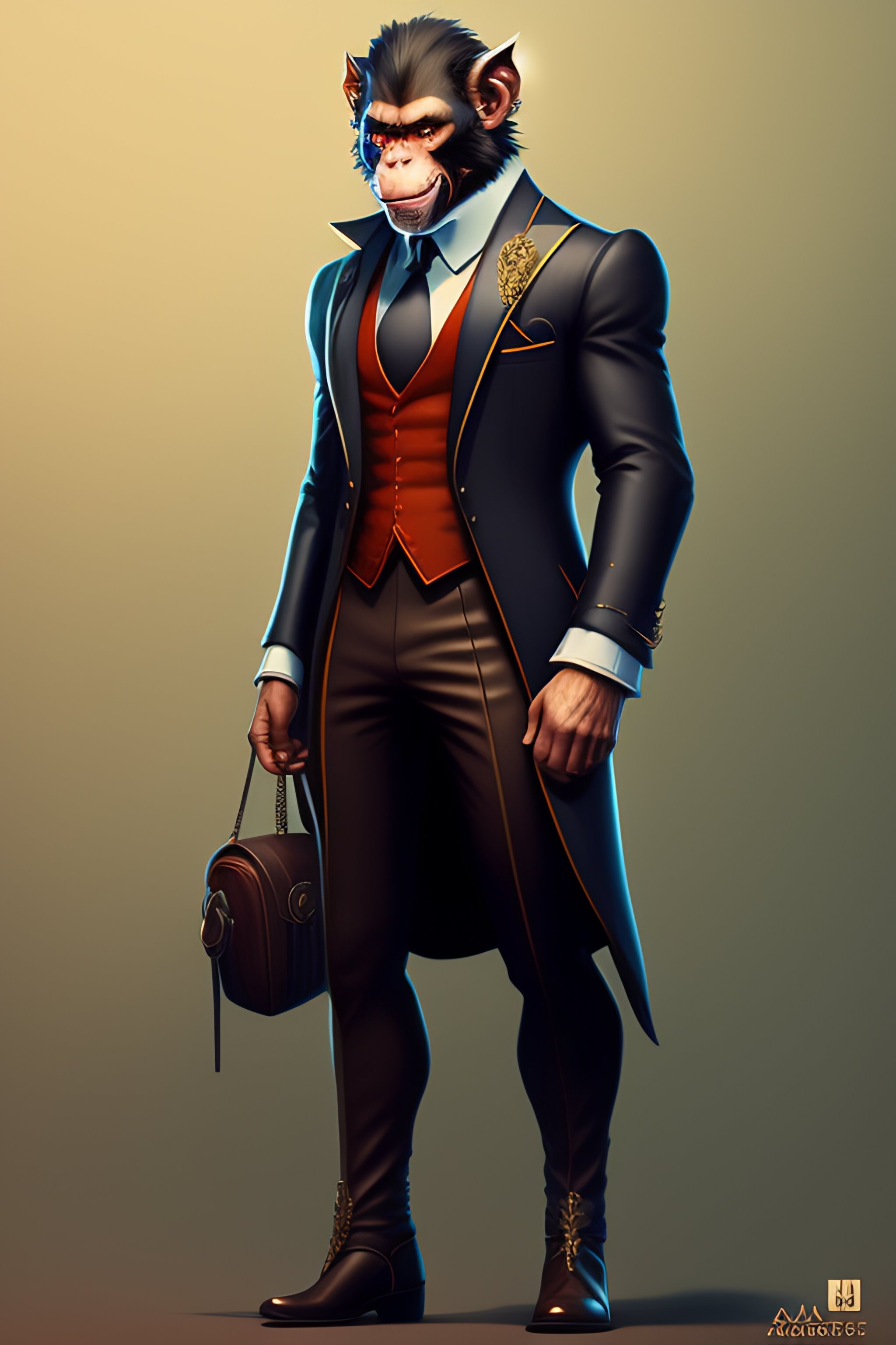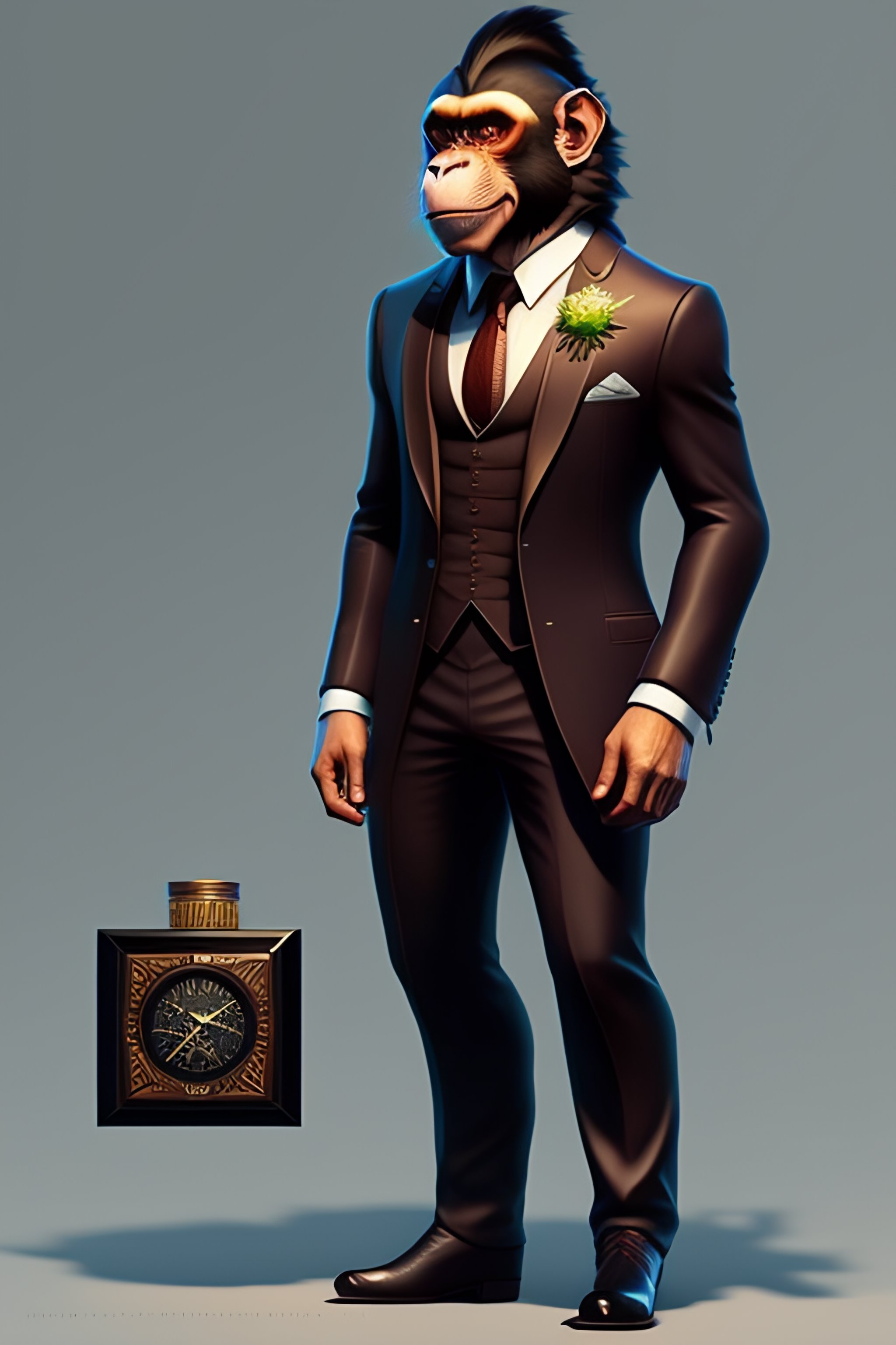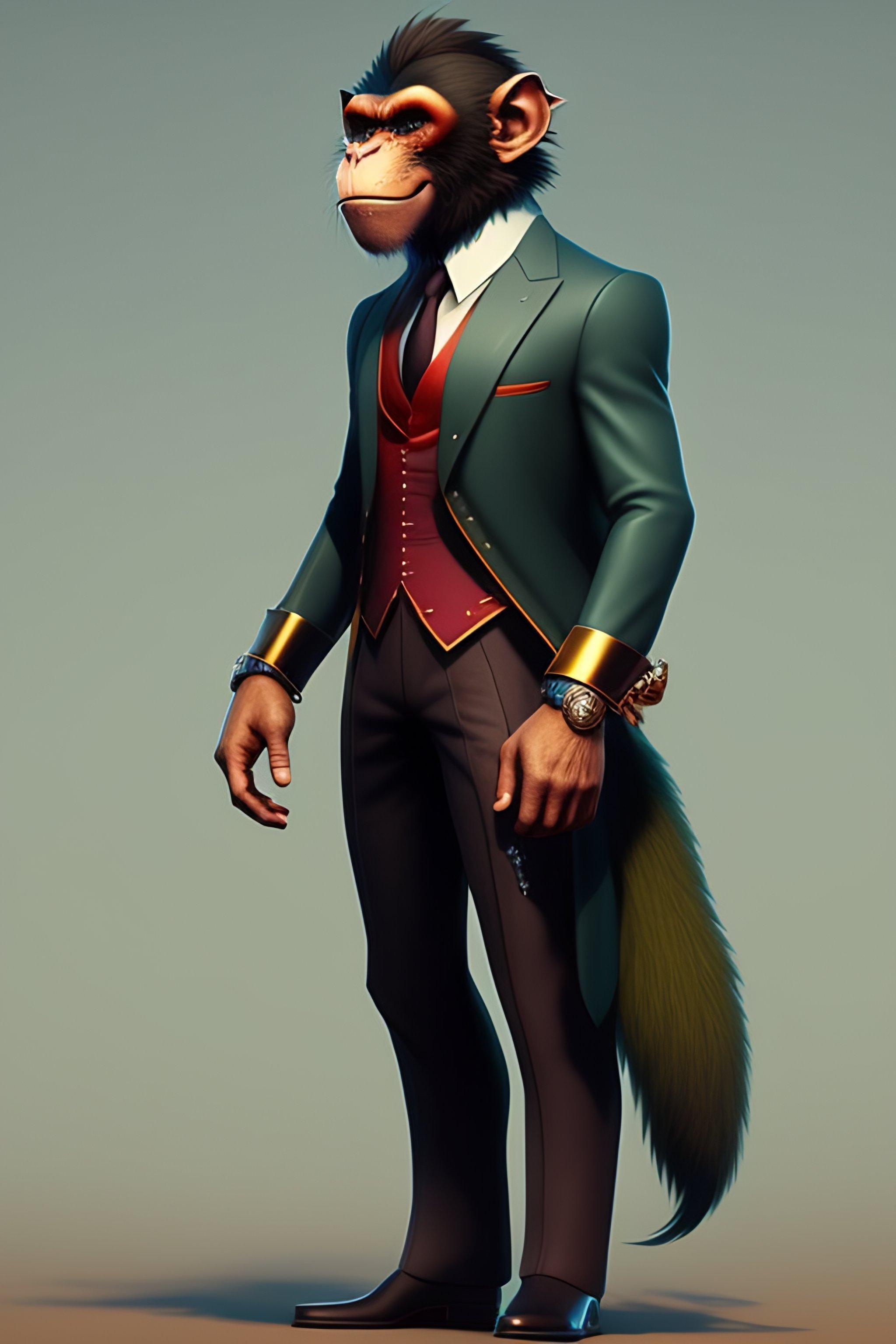 Anthro wicked humanoid monkey, three piece suit, checking watch, character concept design, puzzle, detailed, vivid, trending on artstation