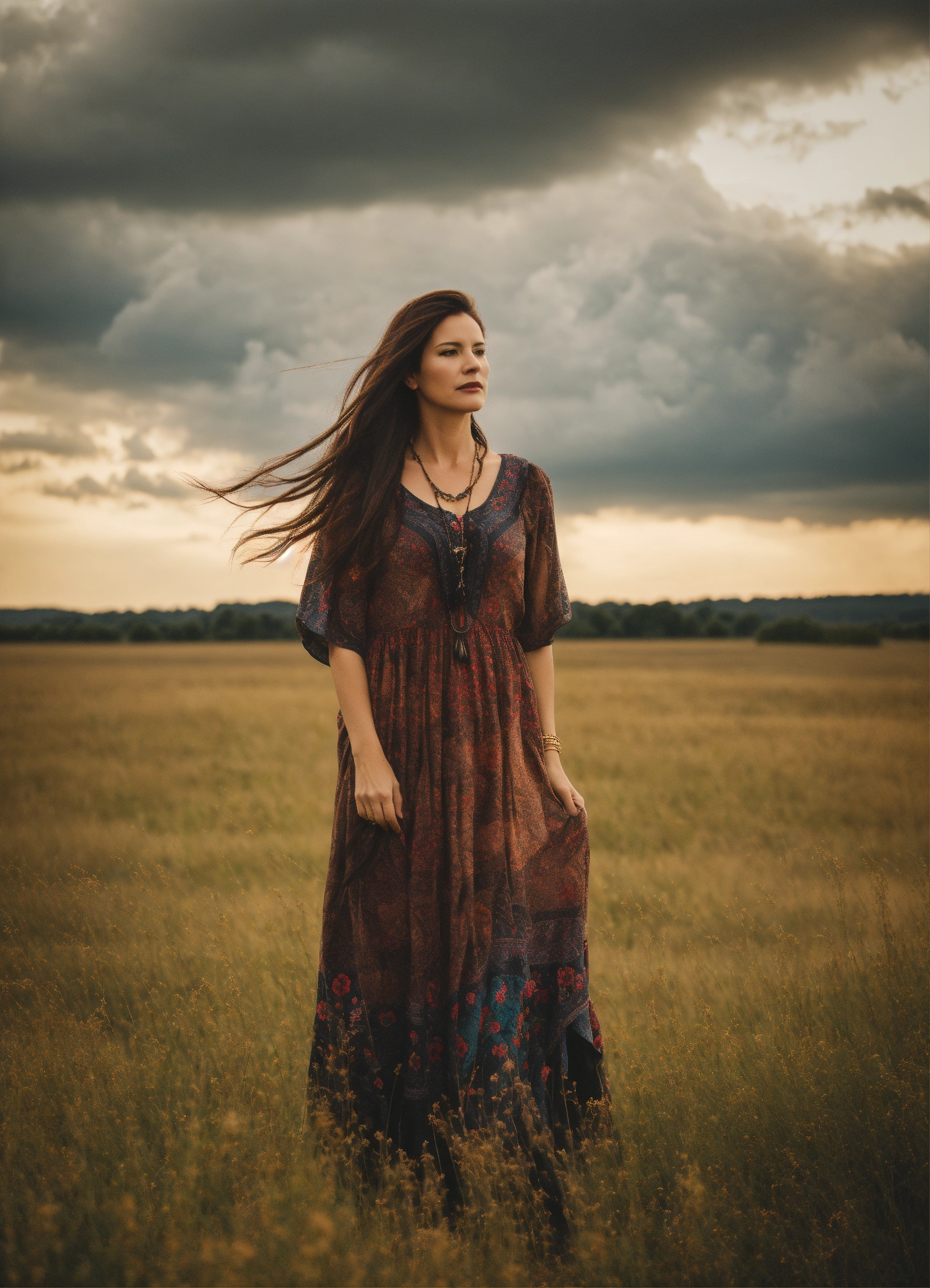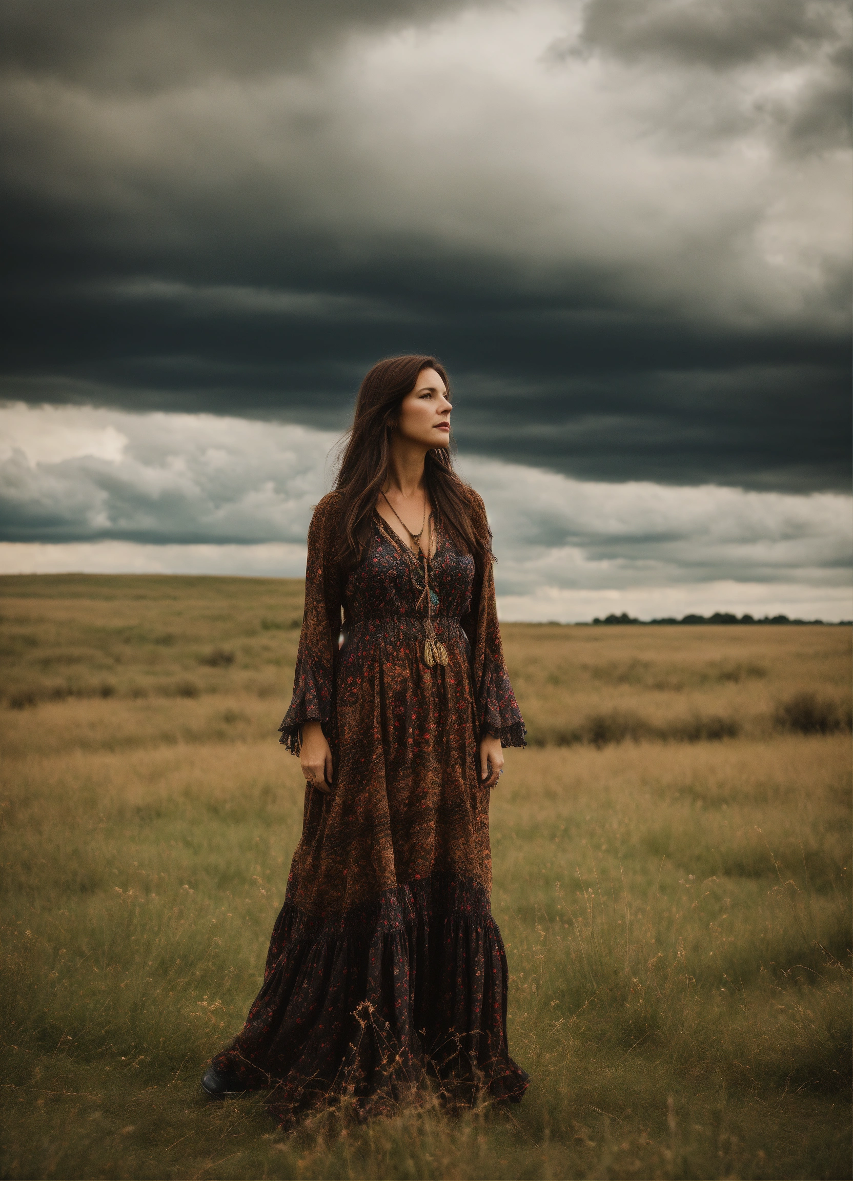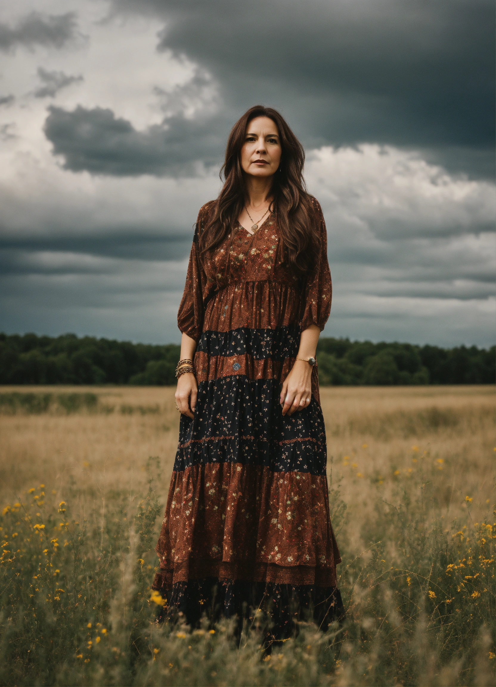 A middle aged woman with long brown hair standing in an open field wearing a bohemian dress and pointy black shoes, cloudy sky, wide view