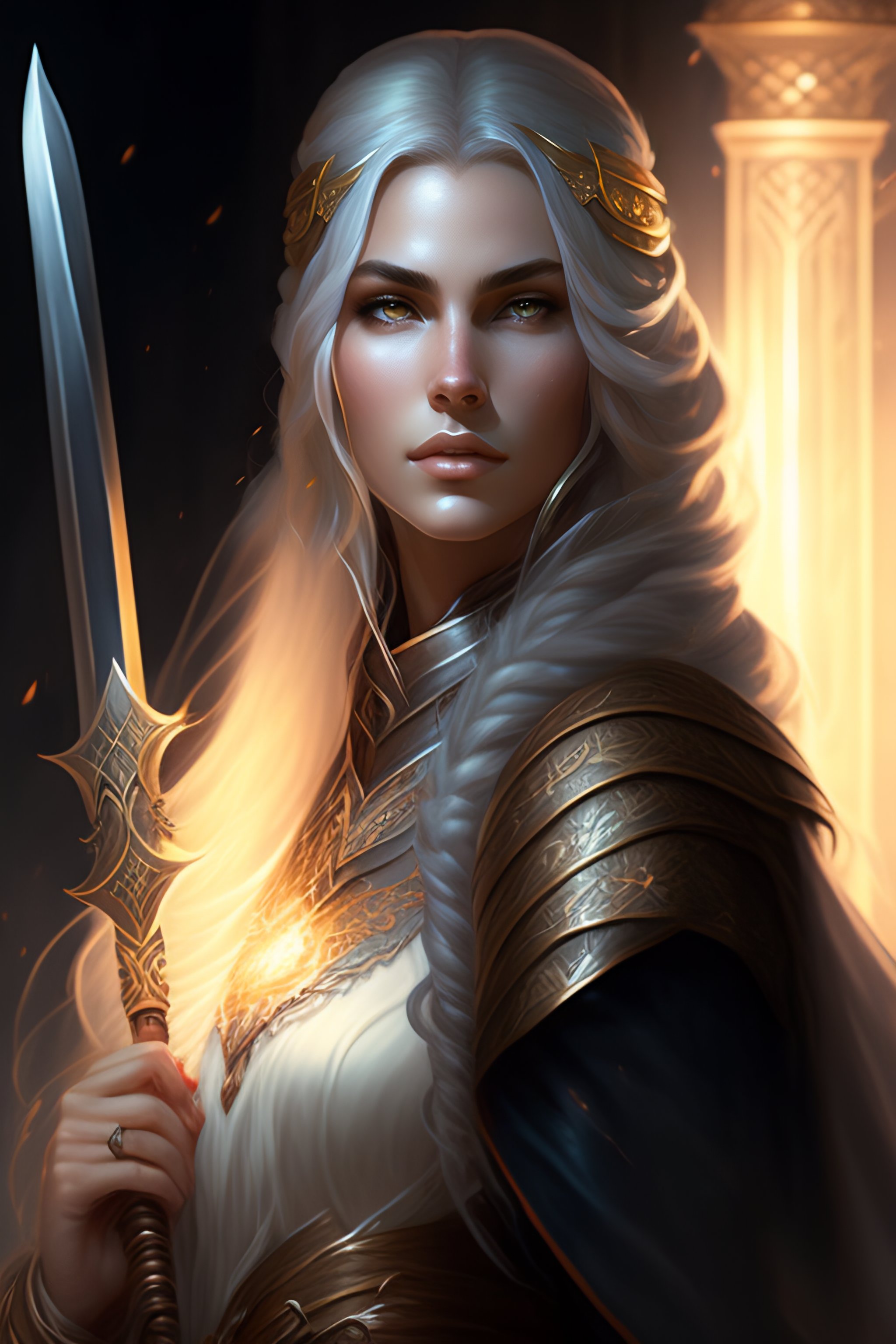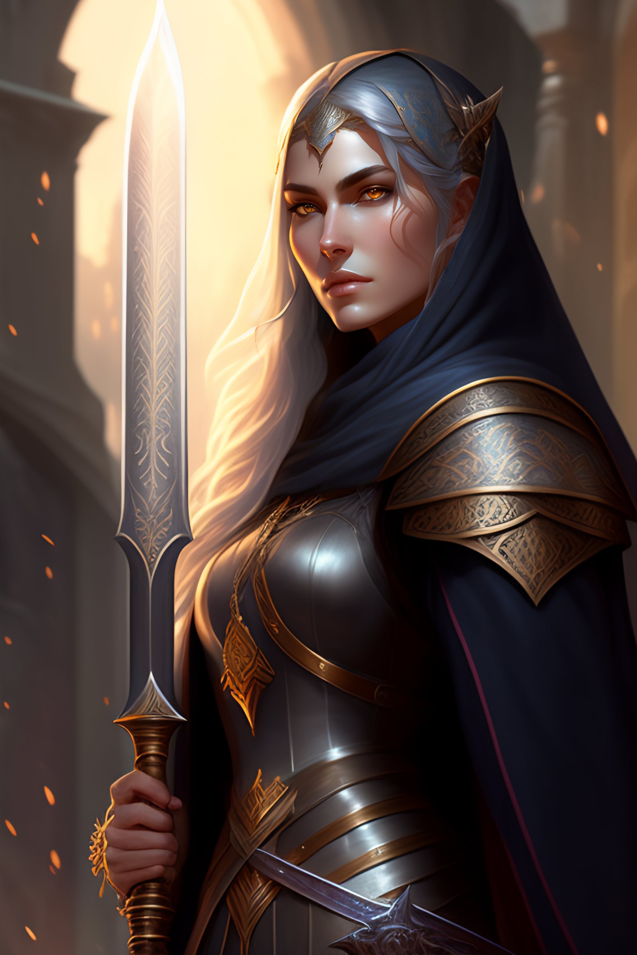 Female cleric in center, dnd, fantasy, gray hair, holding sword, dark light night, intricate, elegant, sharp focus, illustration, highly detailed, dark lighting, full body, digital painting, concept art, matte, art by wlop and artgerm and greg rutkowski and alphonse mucha, masterpiece