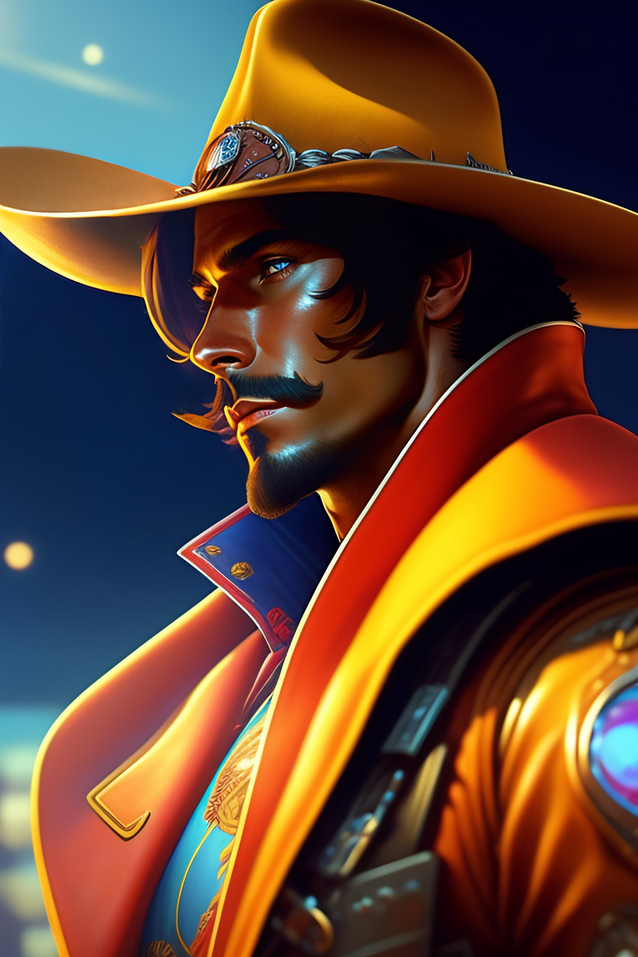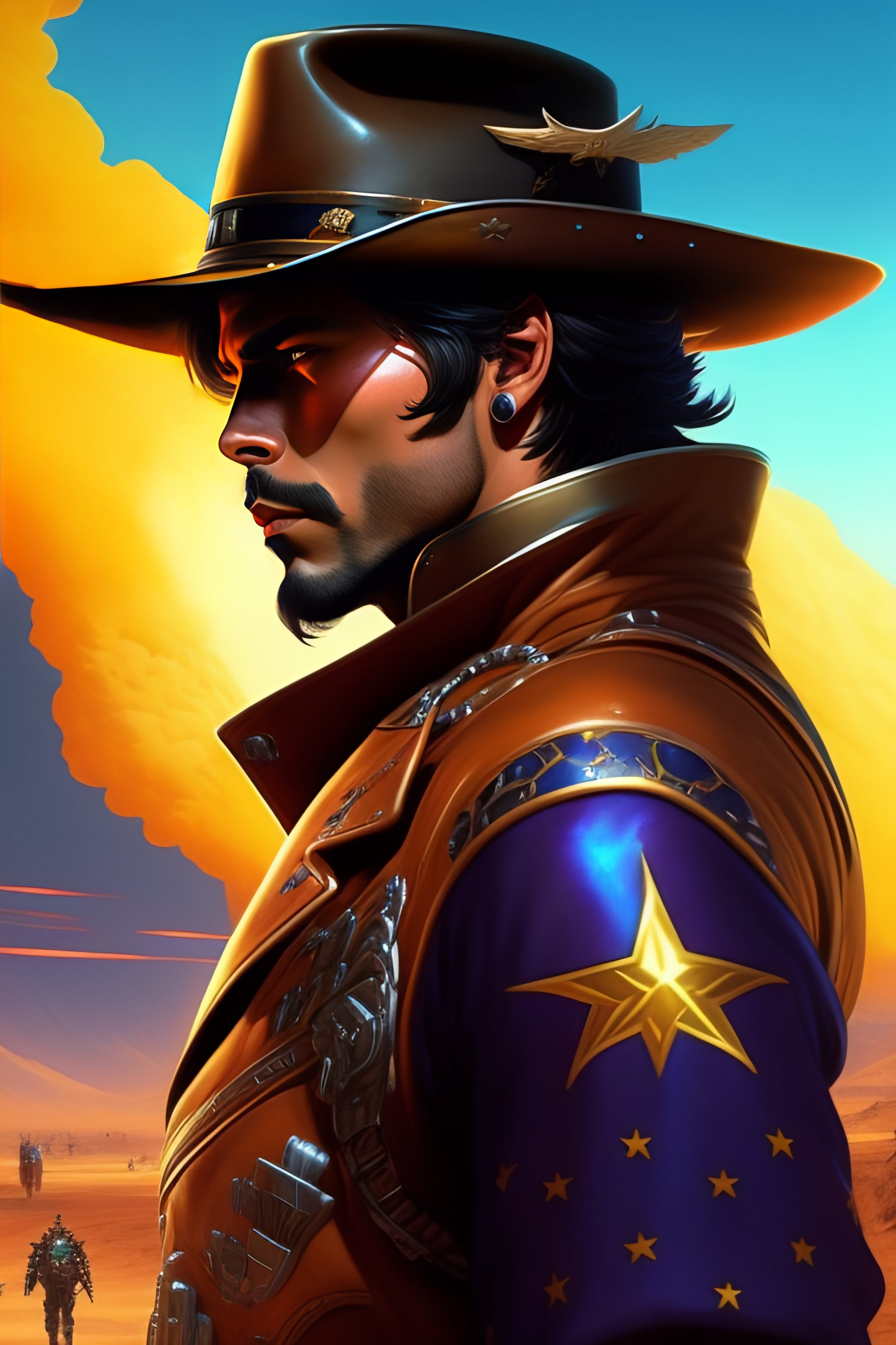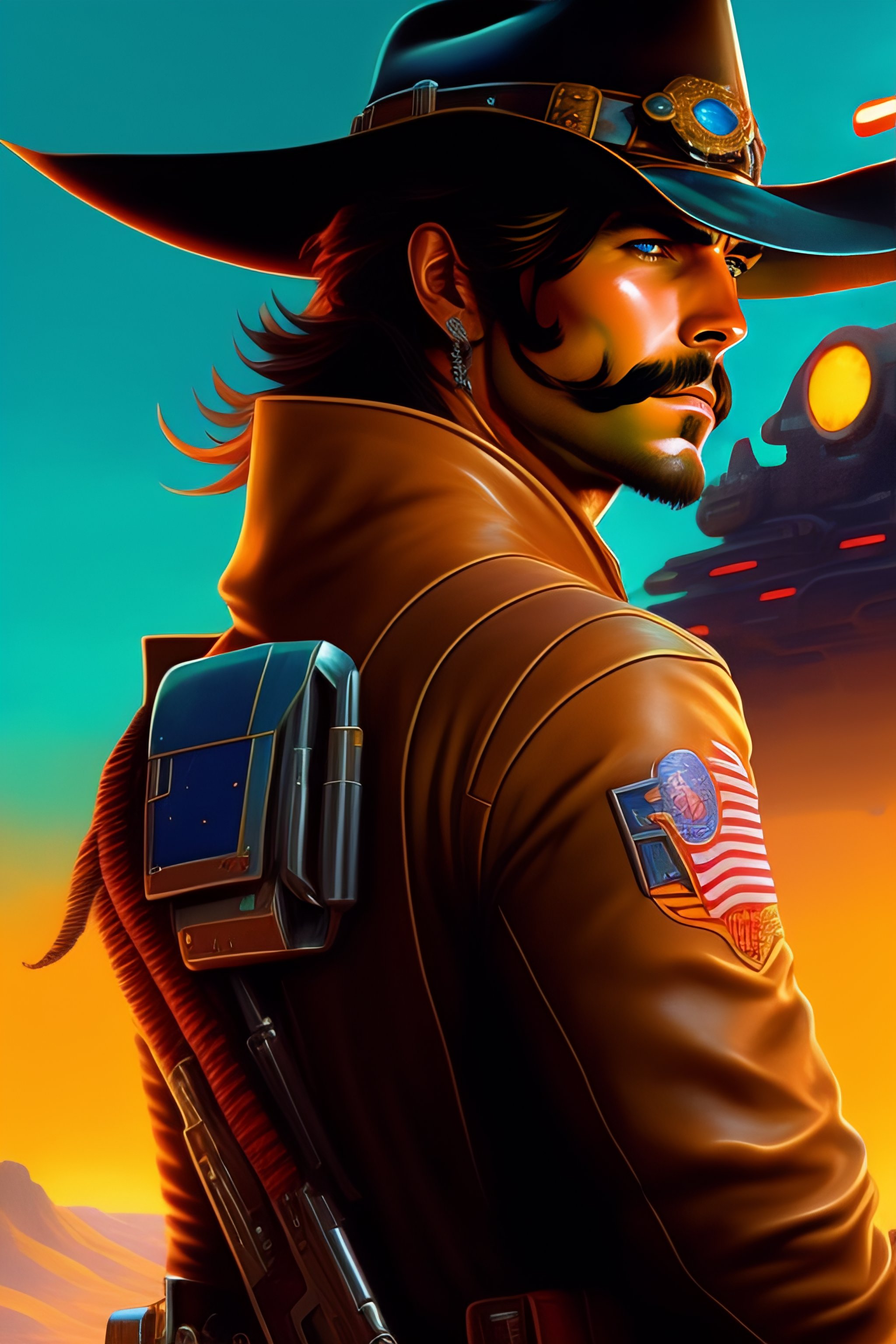 Mccree from overwatch, cyber cowboy, close up, concept art, intricate details, highly detailed, vintage sci - fi poster, in the style of chris foss