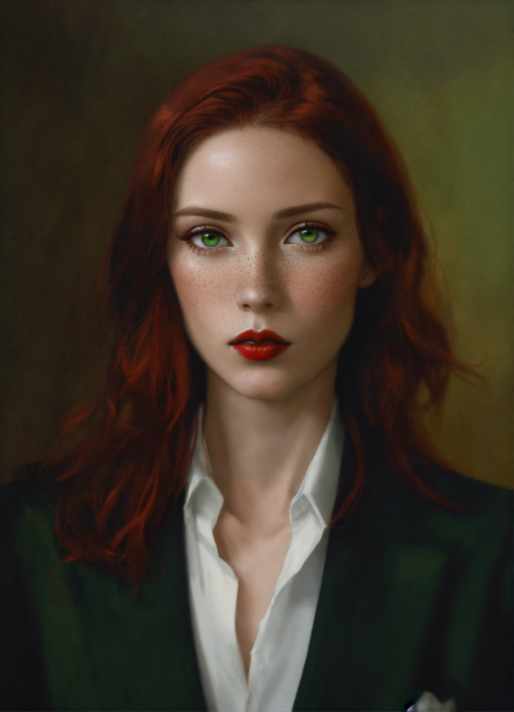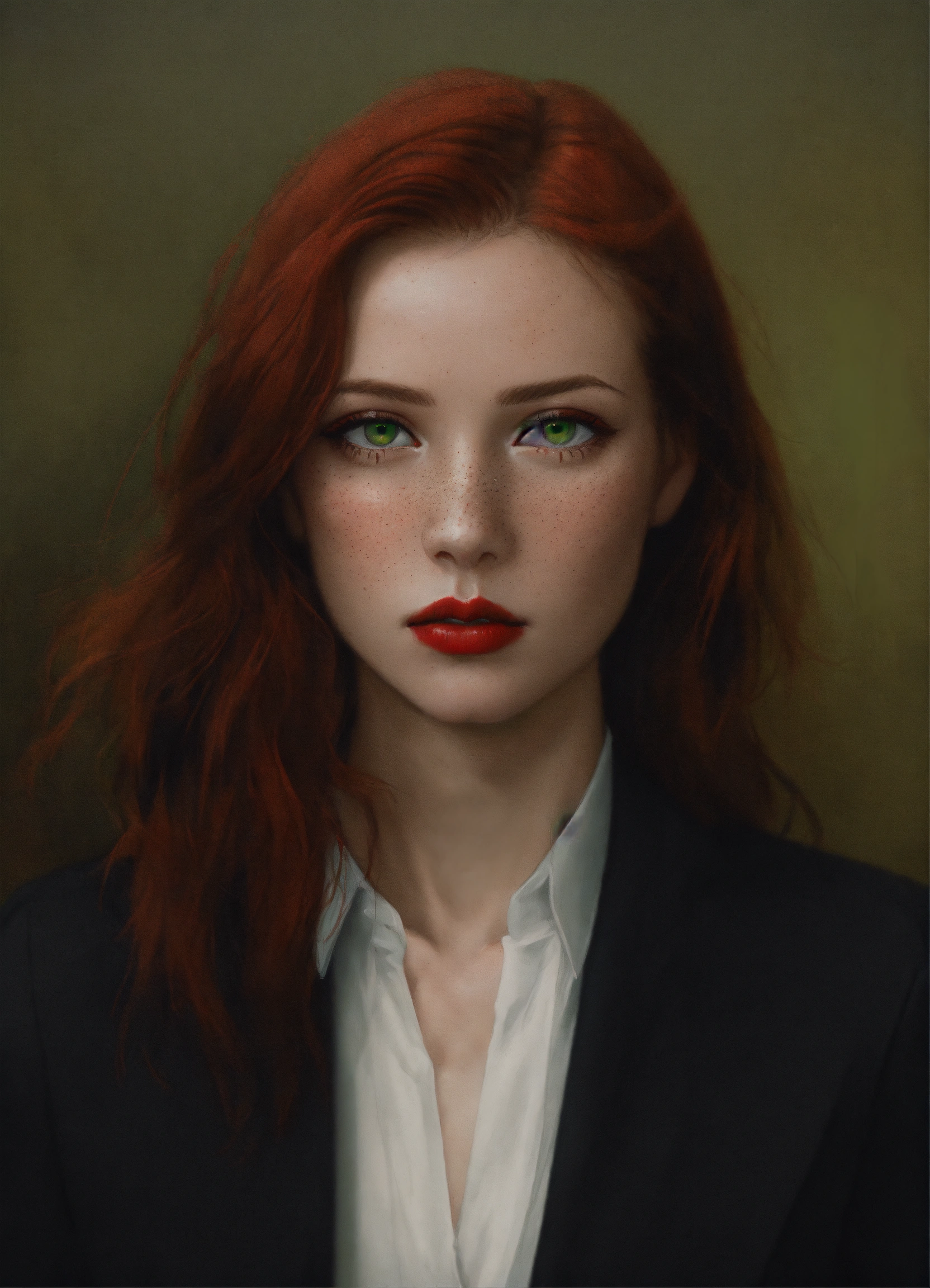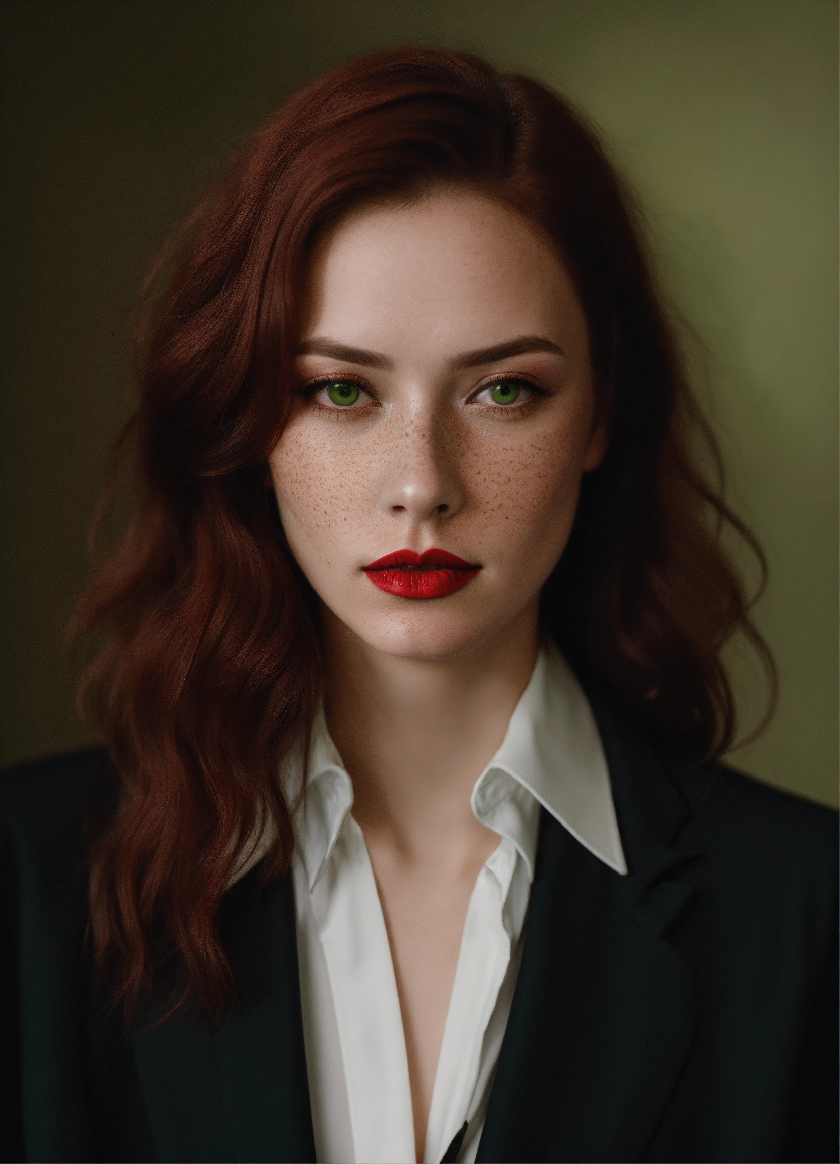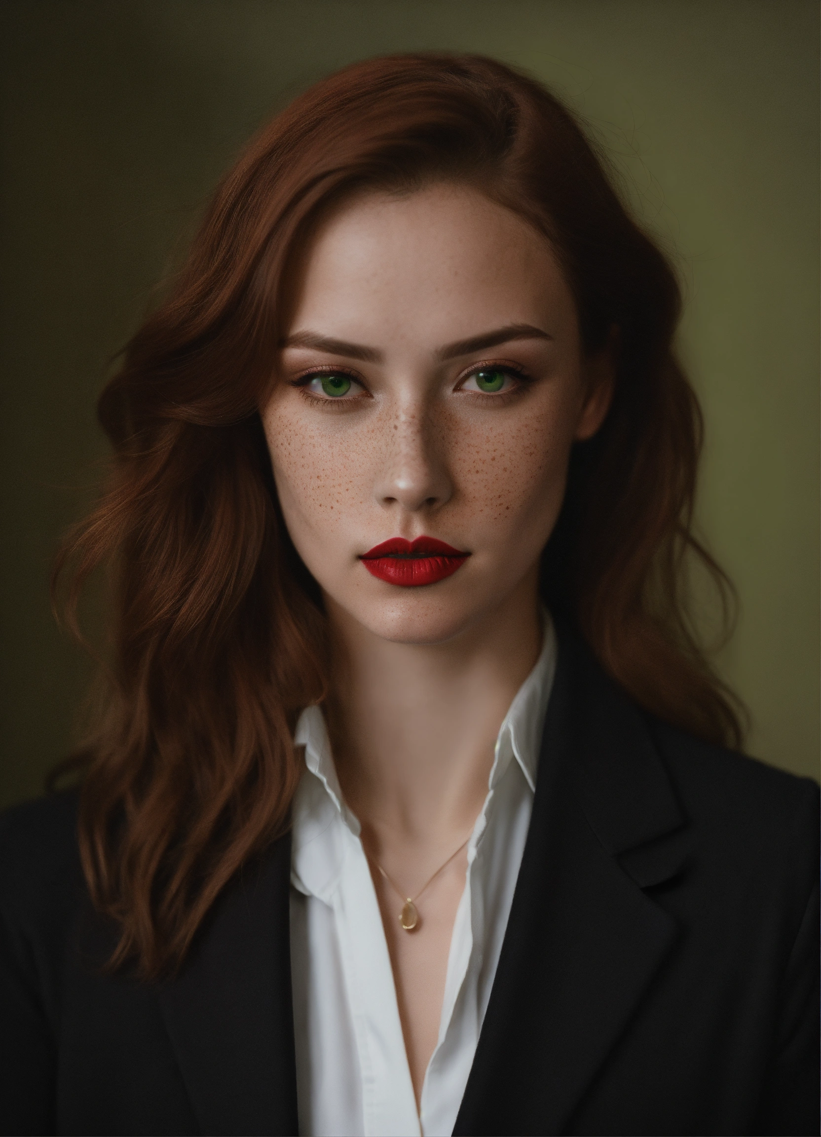 A nick alm photographic portrait of a 25 year old beautiful woman with neck lengthened, untied dark red hair. she has green eyes, freckles on her face and red lipstick. she wears a black suit jacket with a white shirt and black tie. her head is triangle shaped.