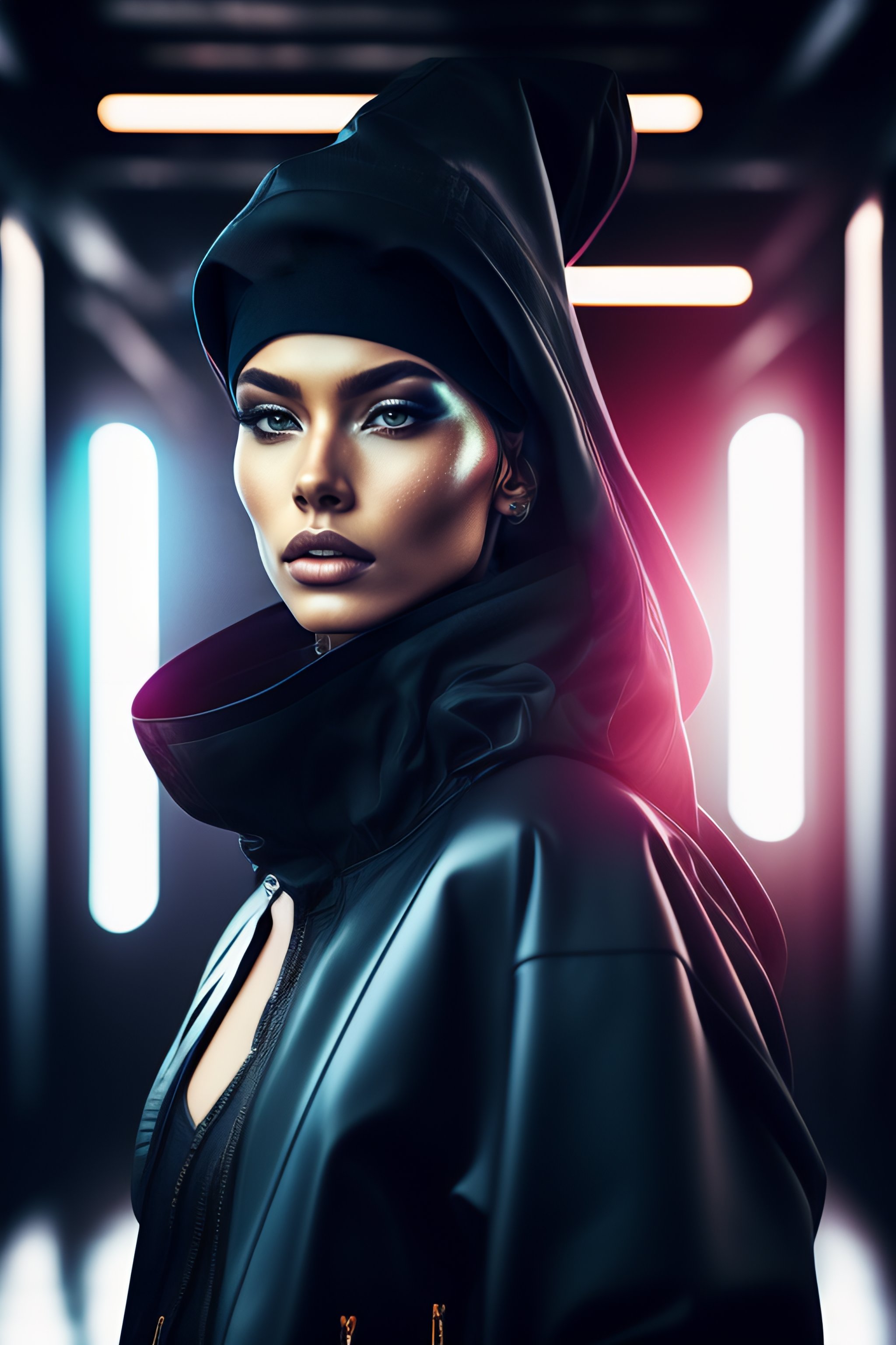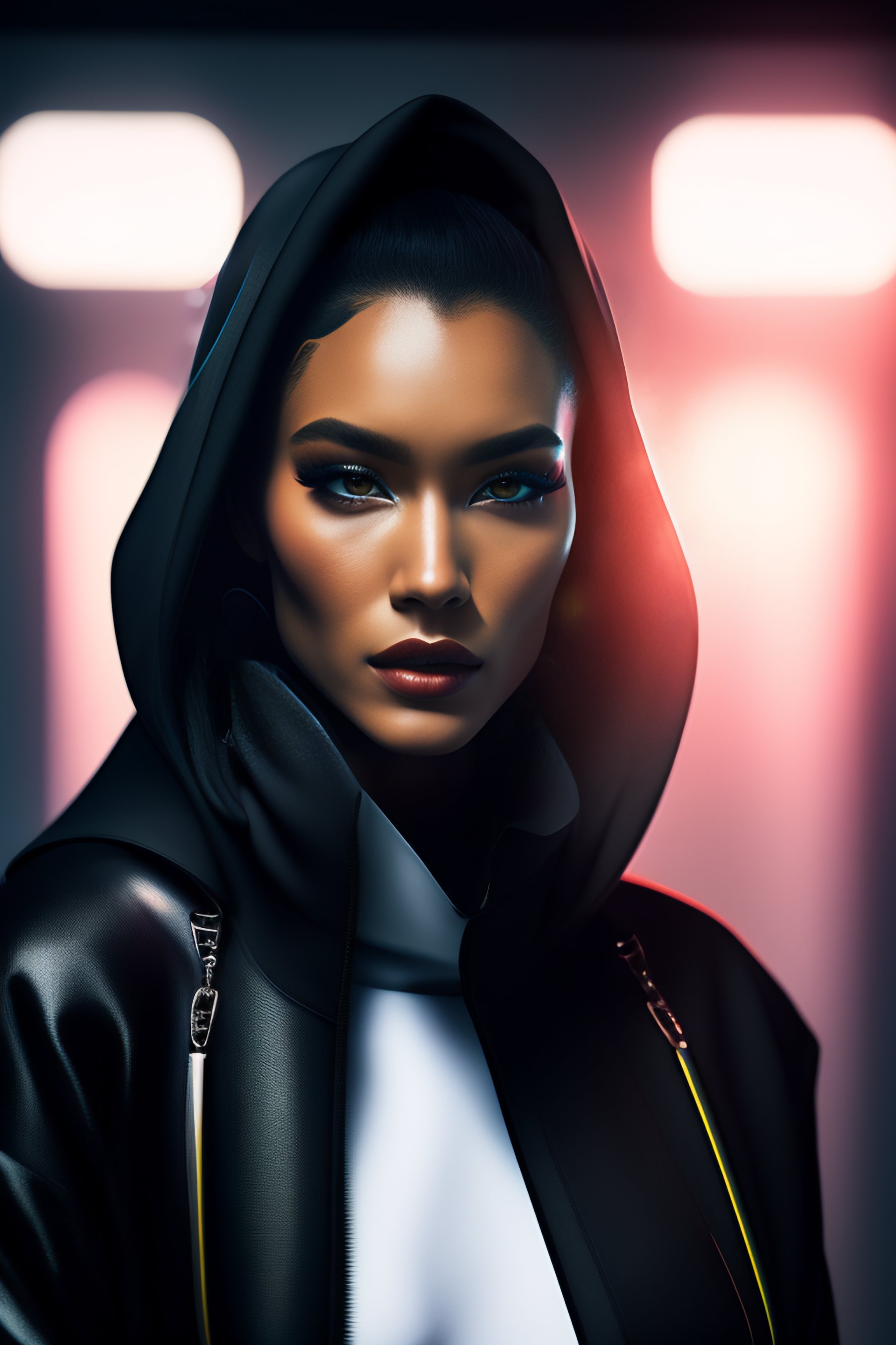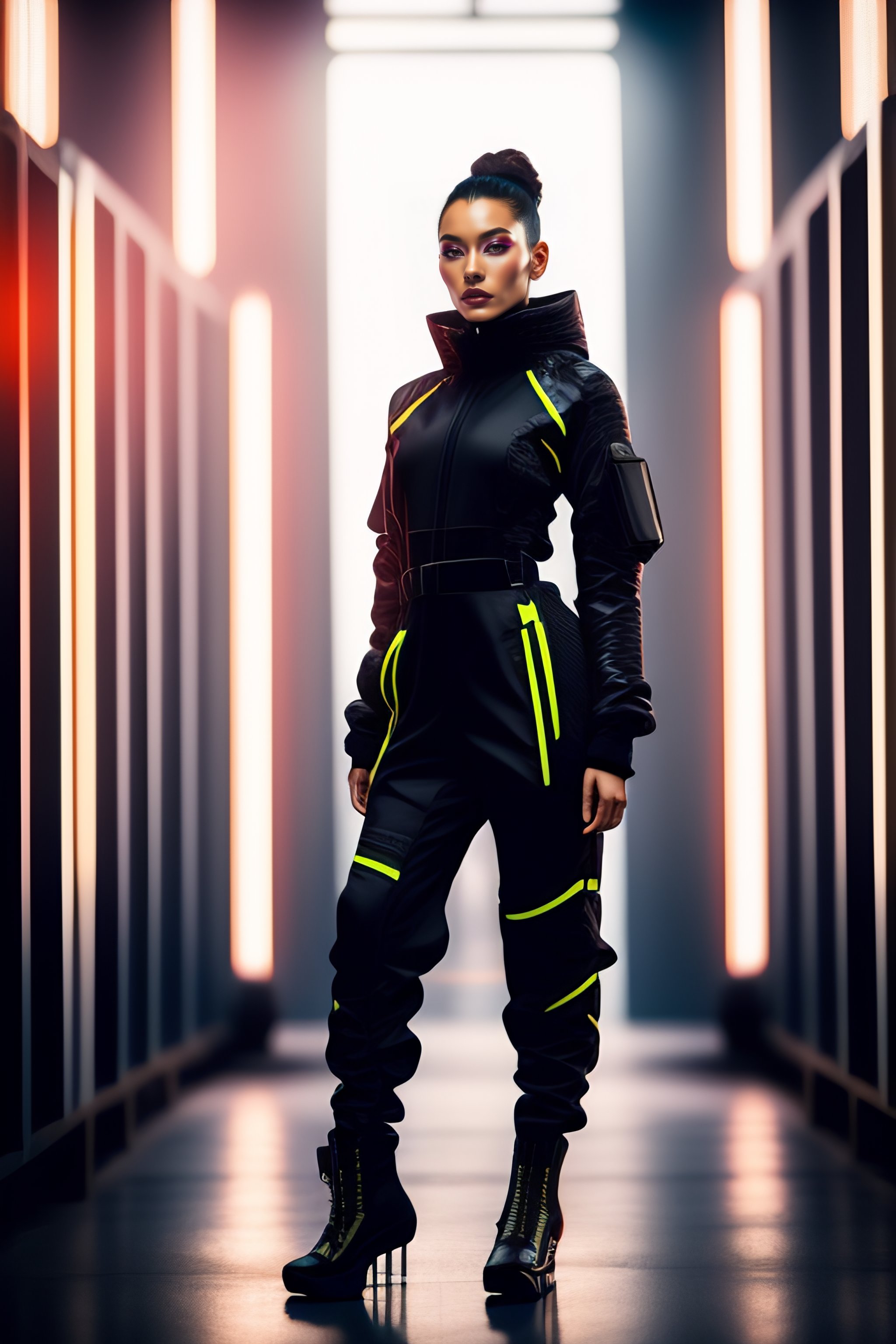A full height photo of a beautiful futuristic techwear thief girl, fashion editorial, studio photography, magazine photography, blurry background, scifi, futuristic, cozy interior lighting