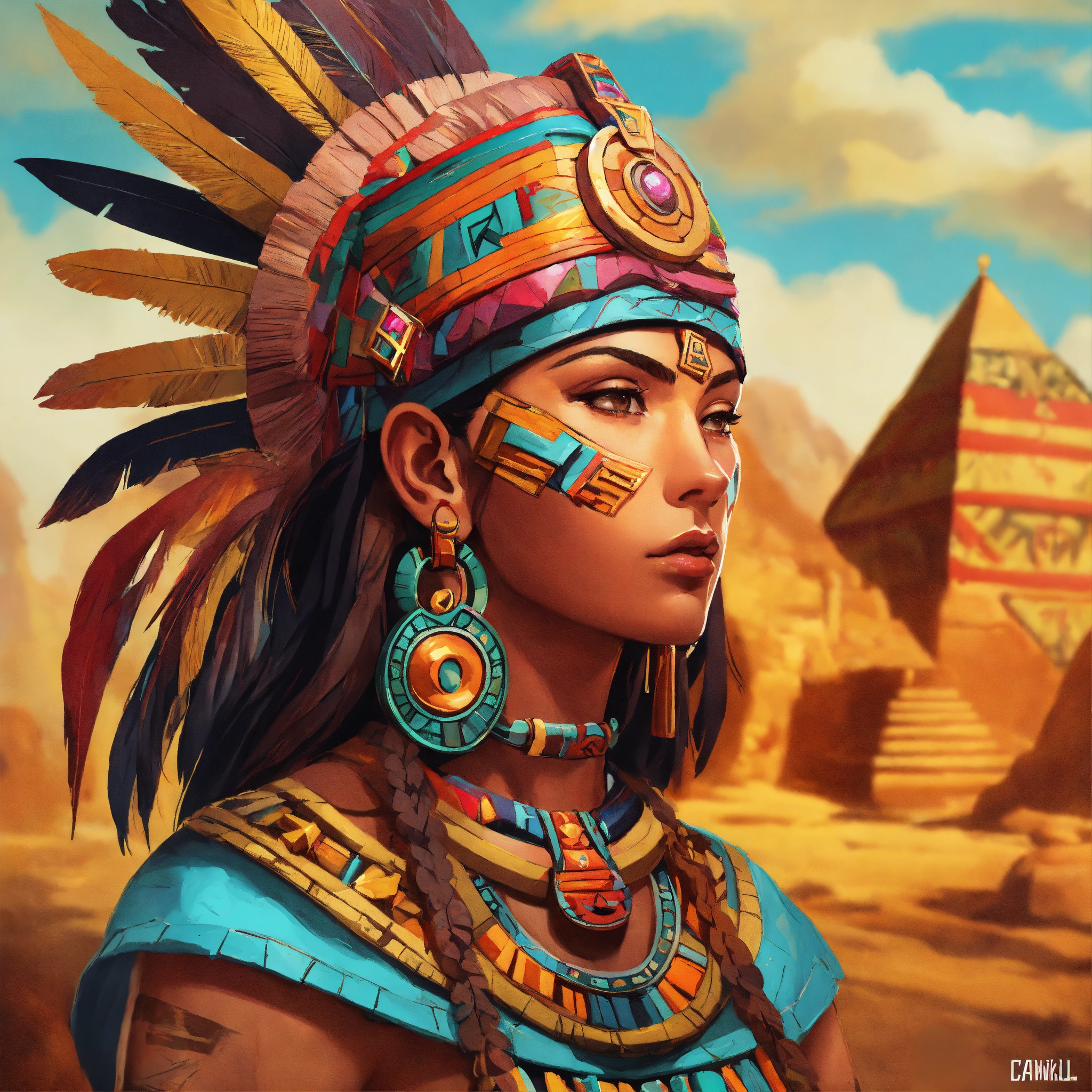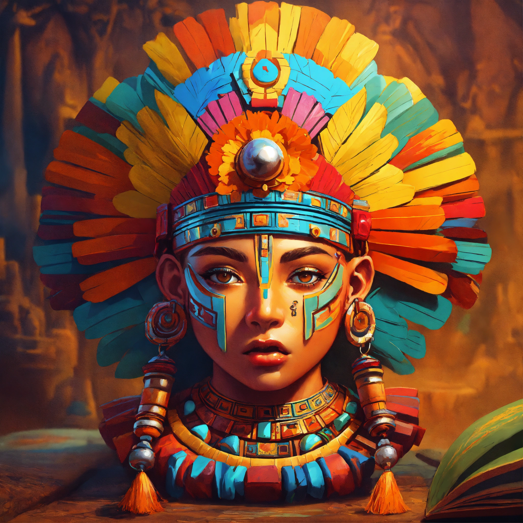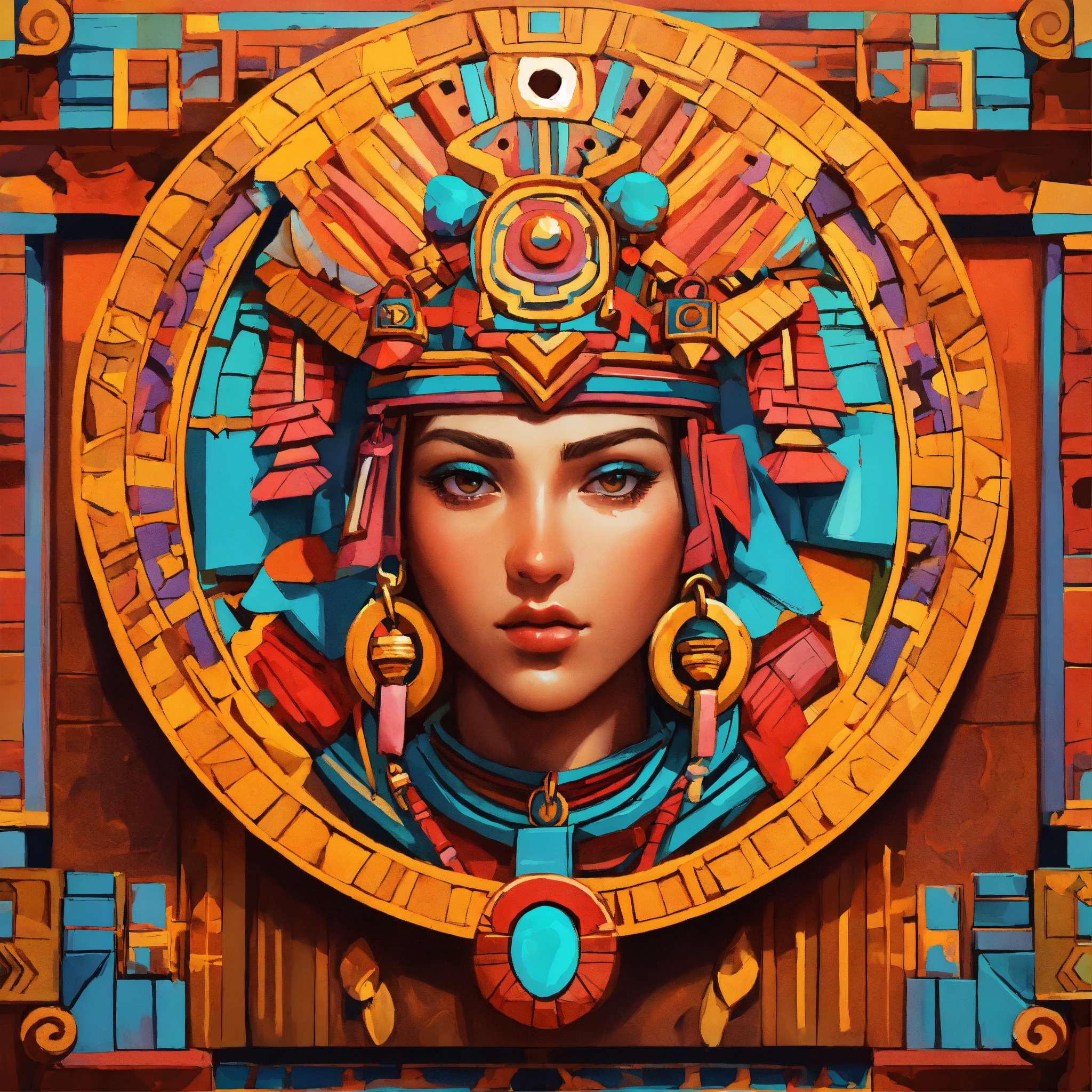 Aztec amulet, volumetric cartoon oil paint, 2d book illustration style, sharp focus, bright color, digital paint character design, trending on artstation, high details, simple lines, retro, art by viktoria gavrilenko, josé luis ágreda and camilla d'errico
