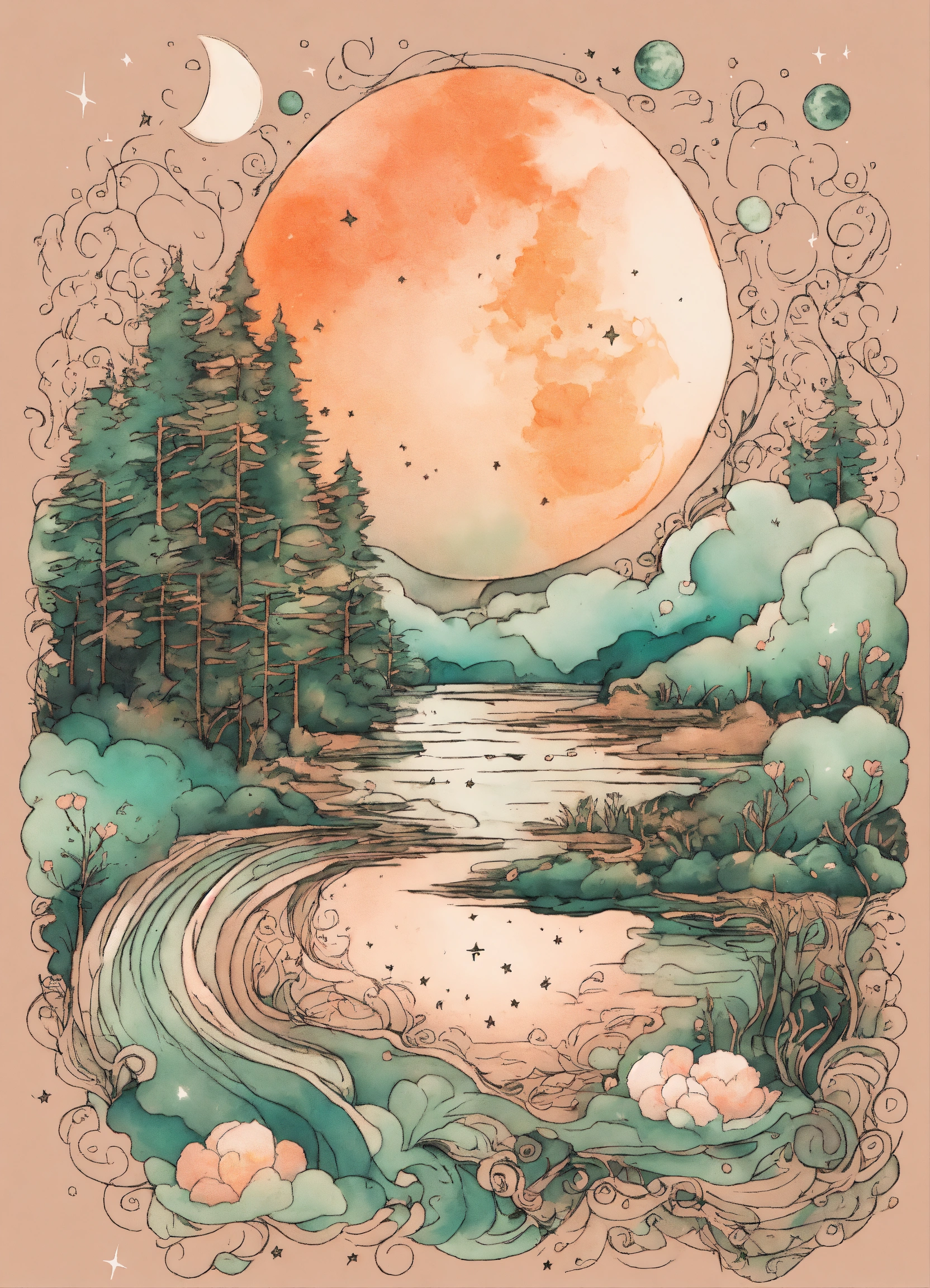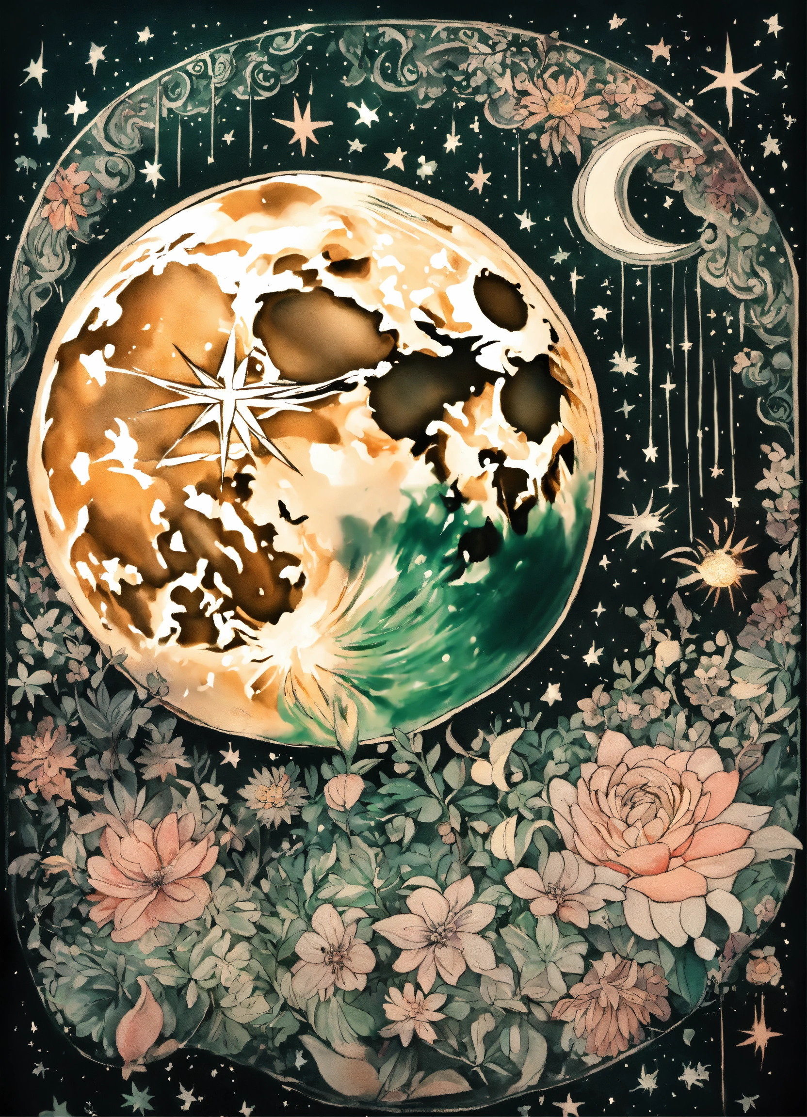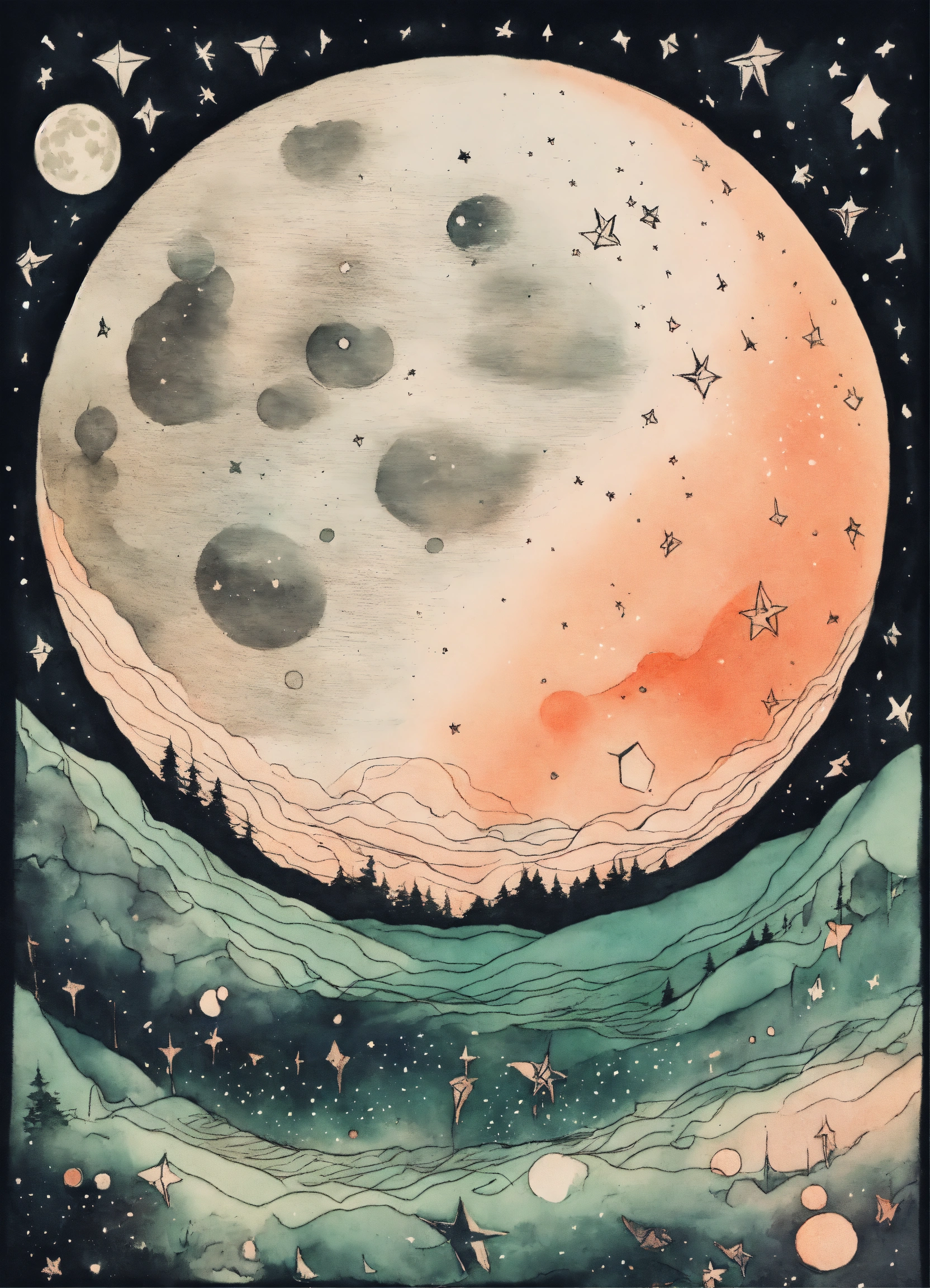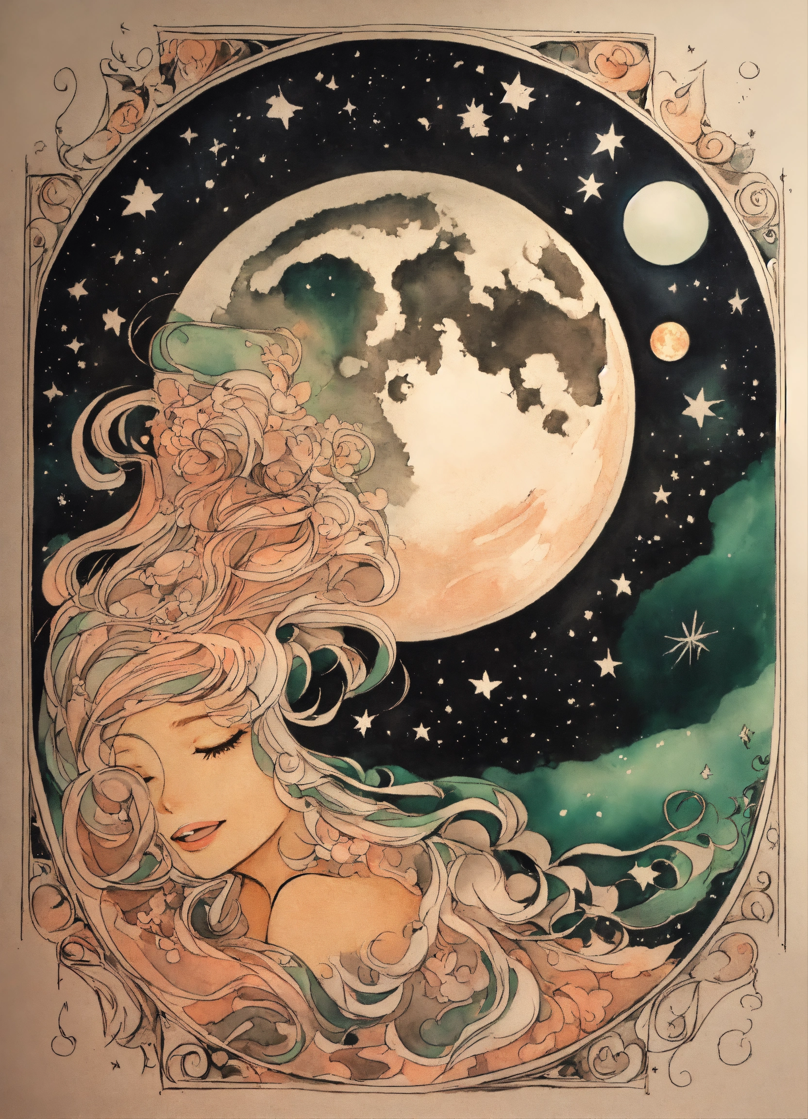 Ink drawing tattoo style image of the moon smiling with stars reflections all around like mirrors in the cosmos and the mystical, magical, feelings of deep love, spirit and soul, hues of white, pale green and peach