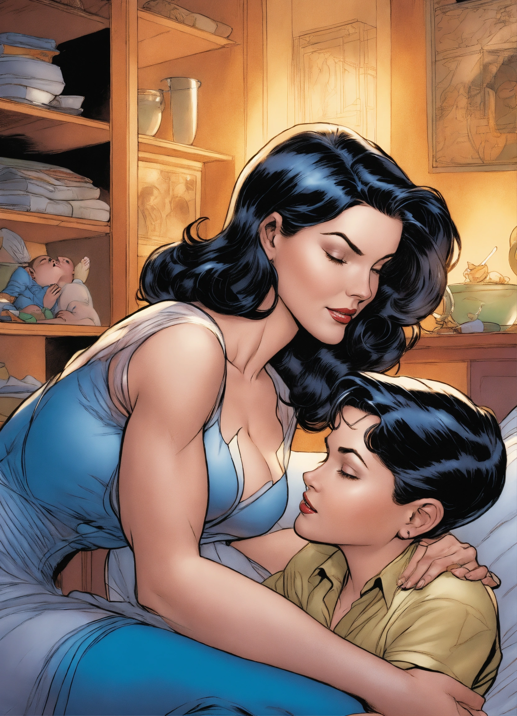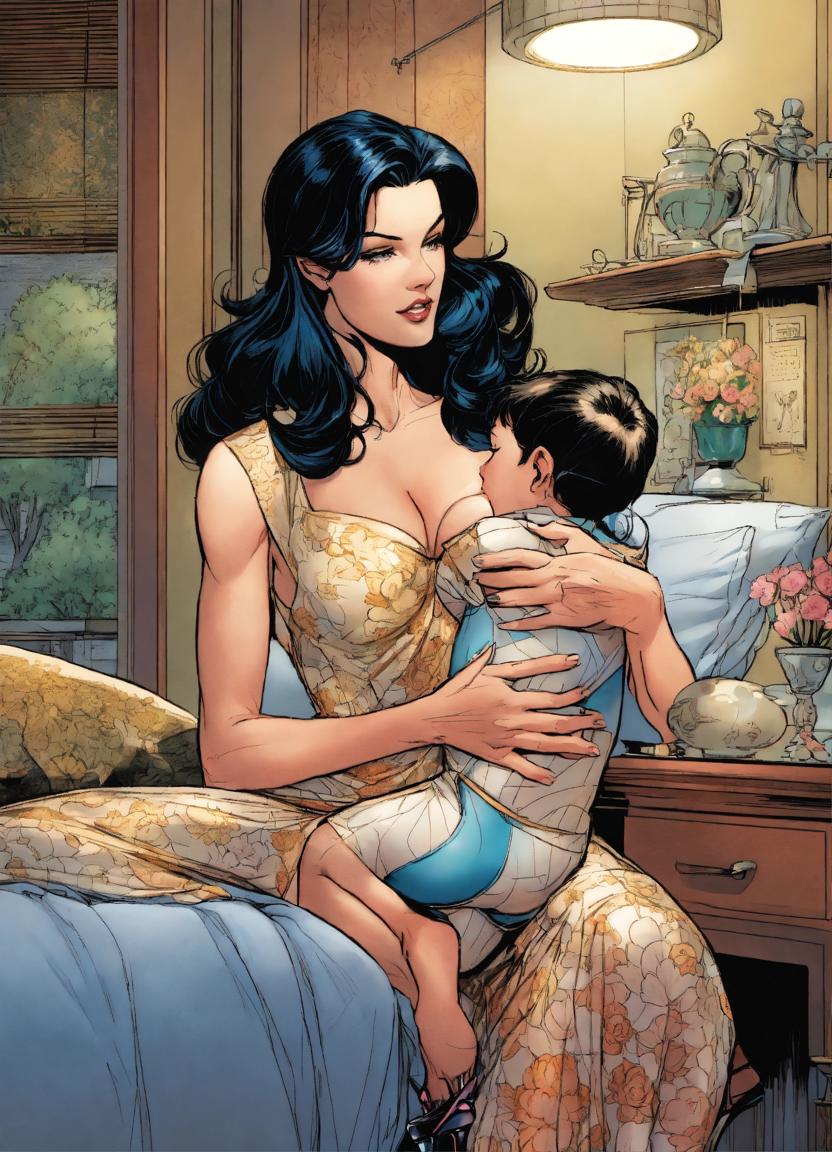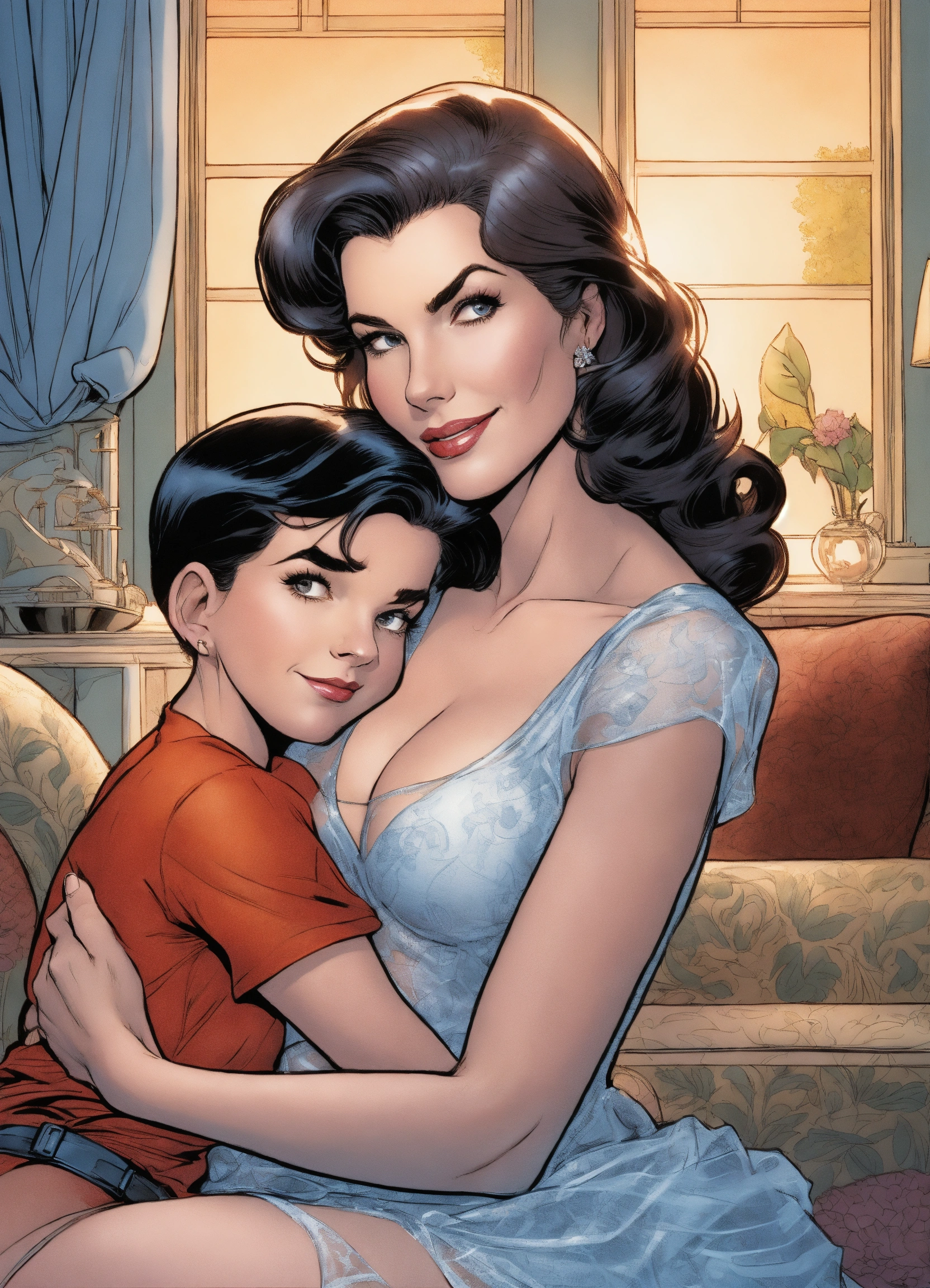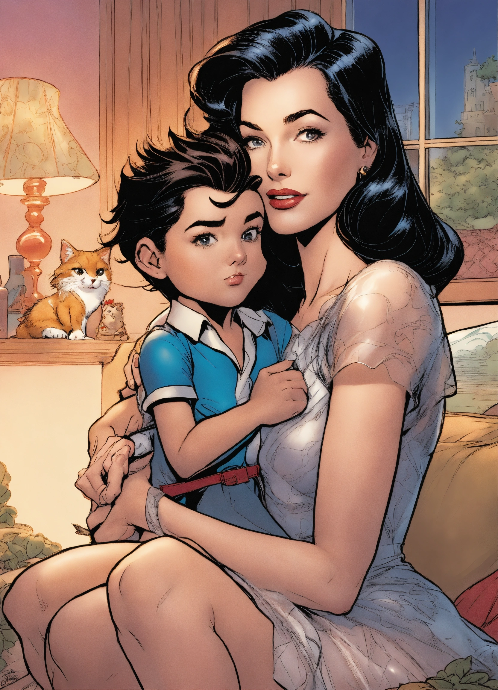 Older lois lane as a housewife, wearing a sheer dress and stiletto high heels, cuddling with a young boy, art by j. scott campbell, art by jim lee, dark hair