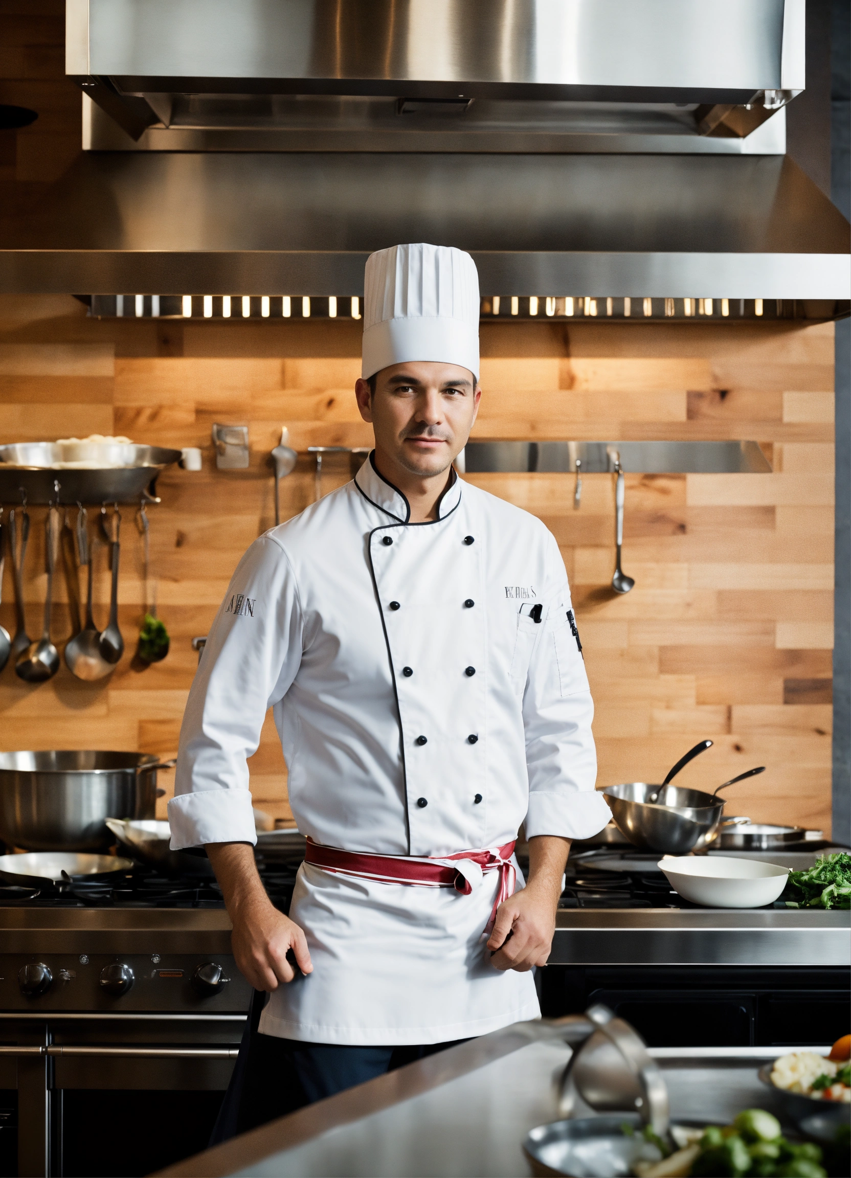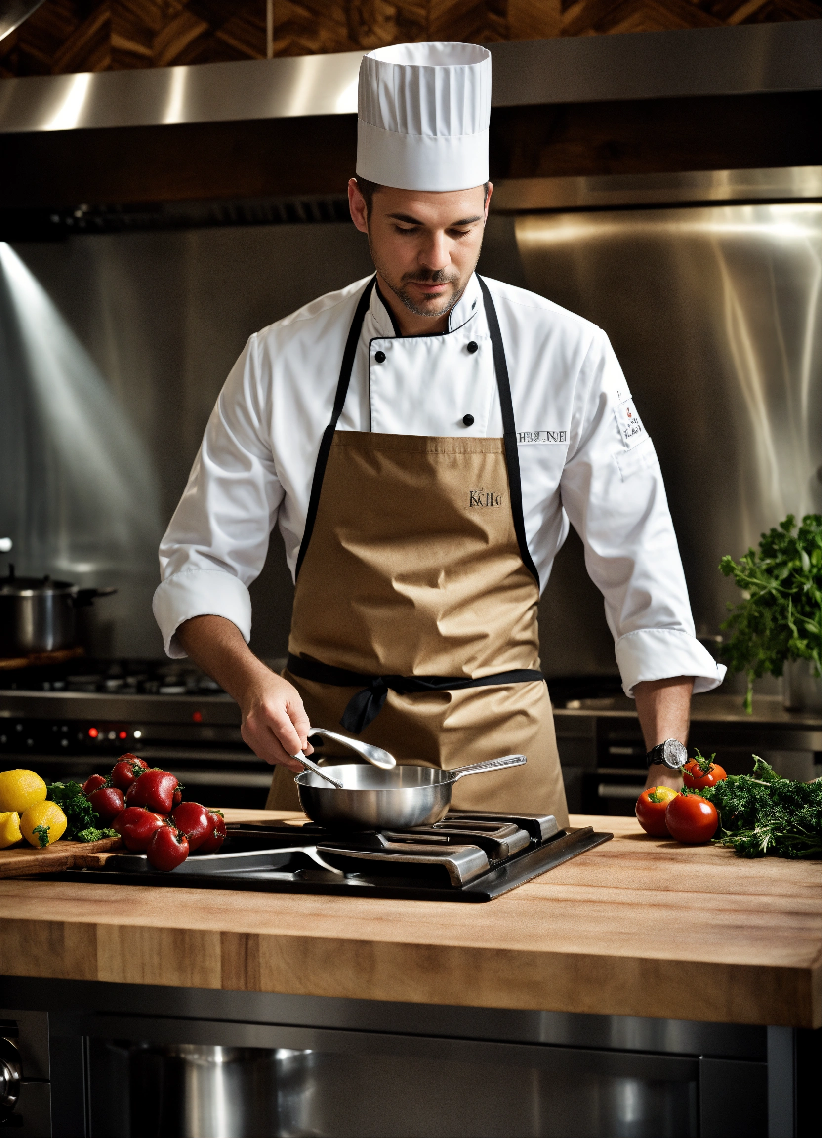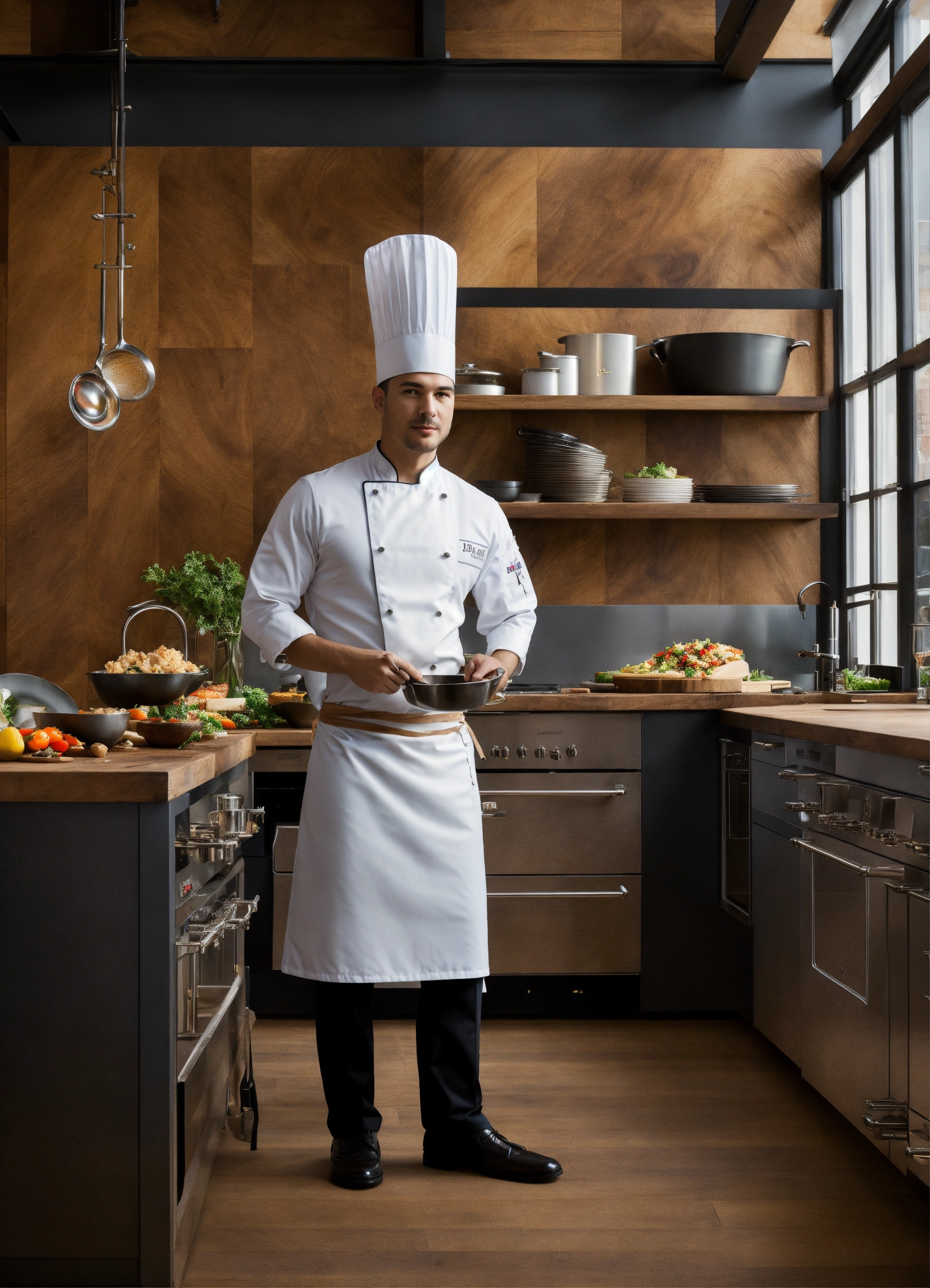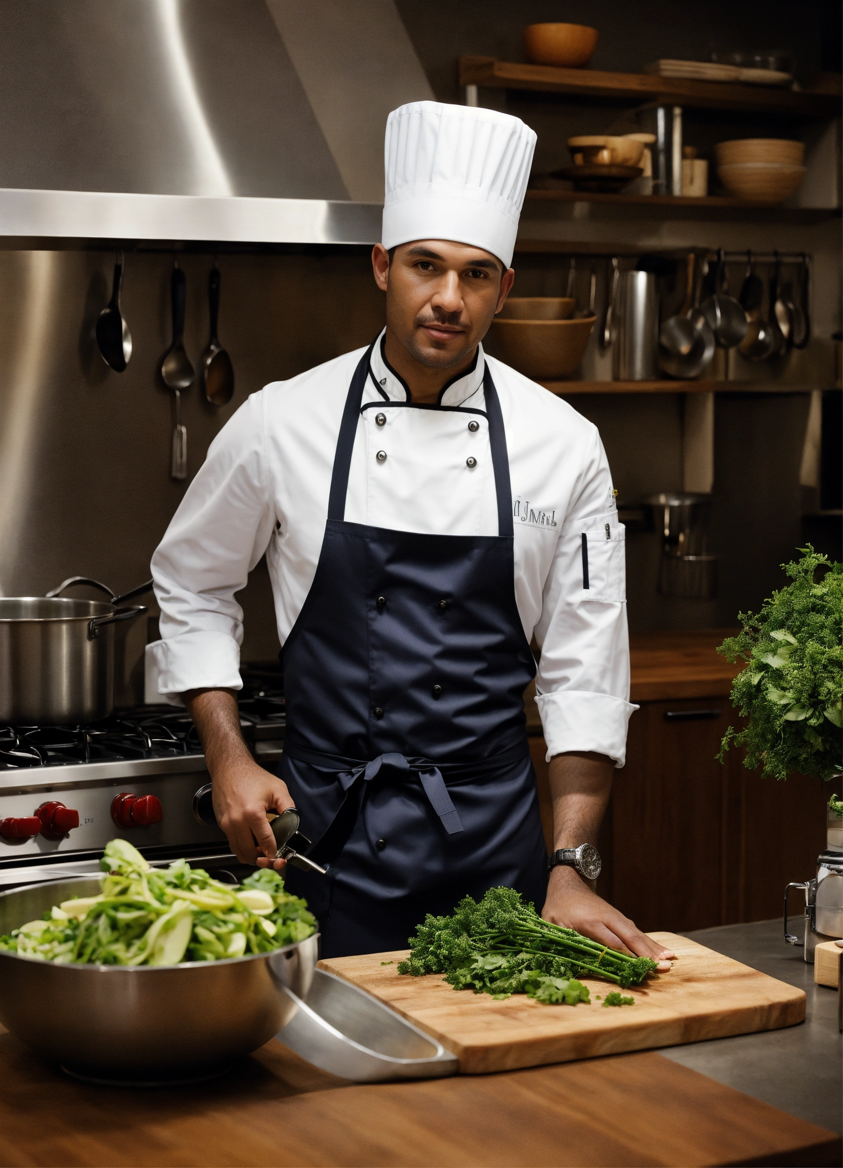 Imagine a modern-day setting, a sleek, high-tech kitchen studio filled with the latest cooking equipment, gadgets, and cameras. the backdrop is adorned with a mix of steel and warm wood, exuding both sophistication and comfort. a man steps into the frame. he is dressed in a perfectly tailored chef's uniform, complete with a monogrammed apron and a traditional chef's hat.