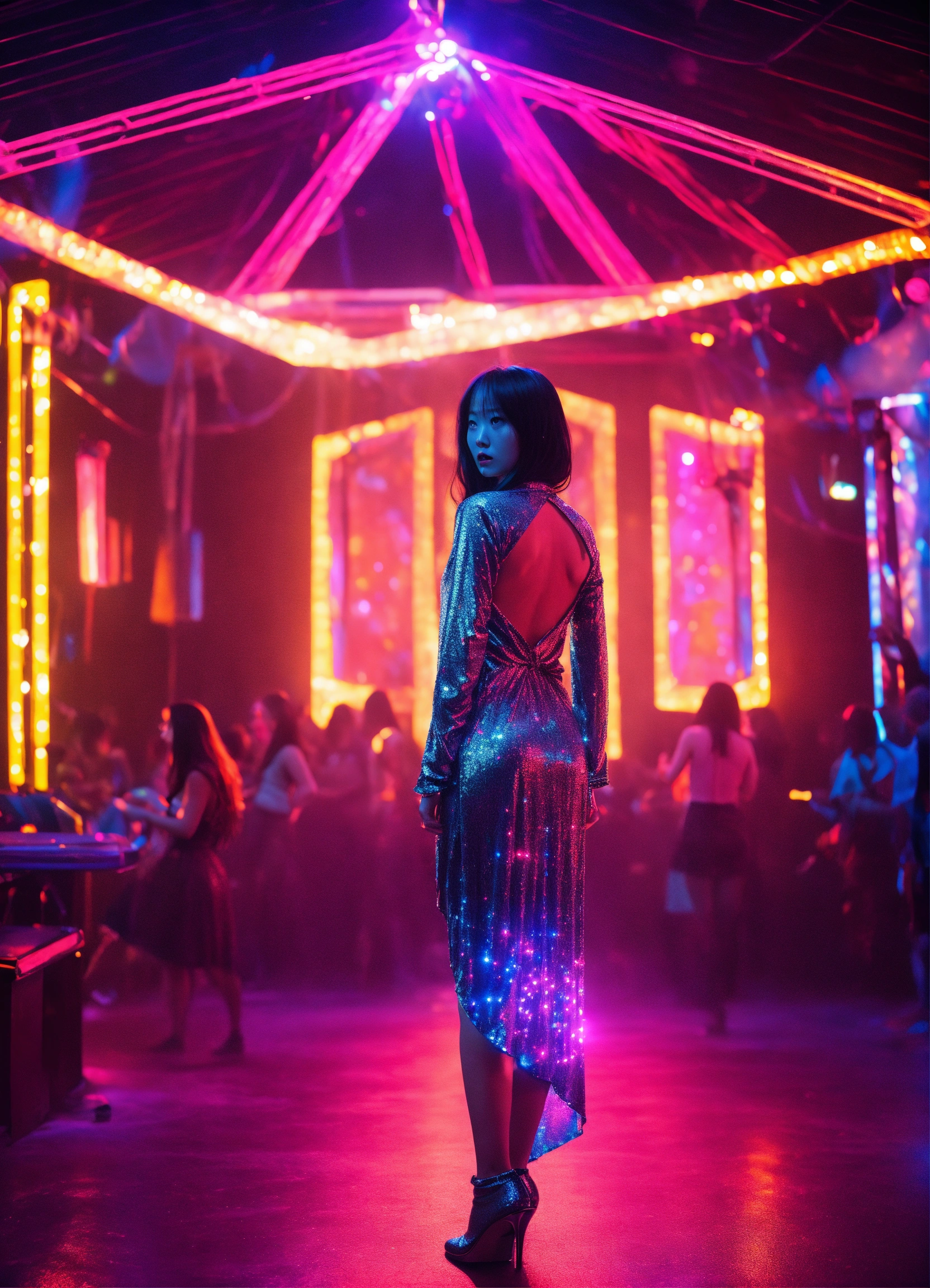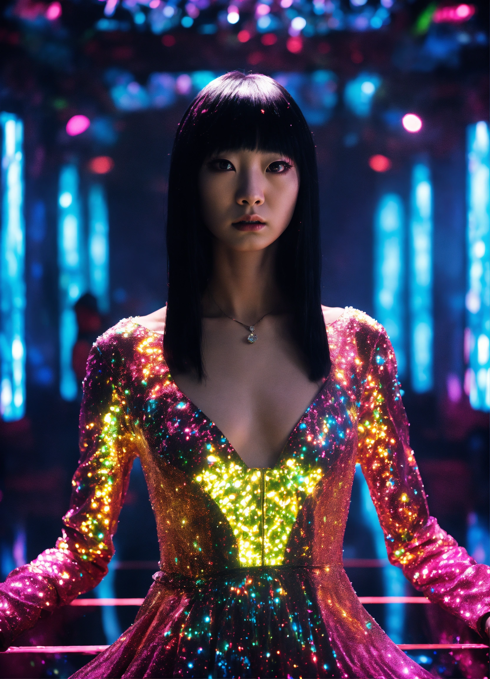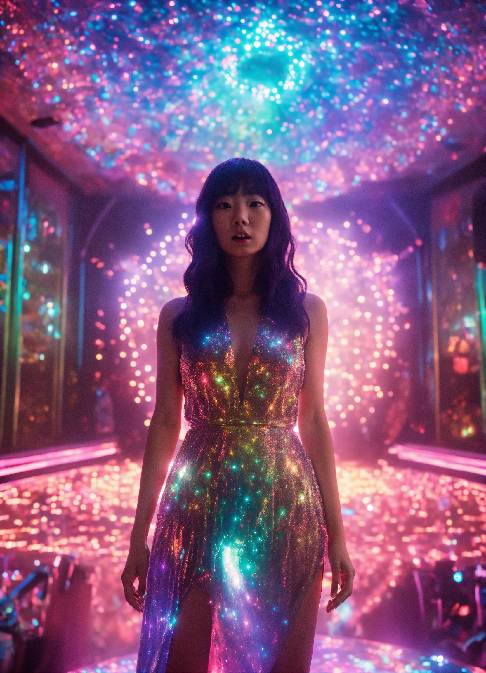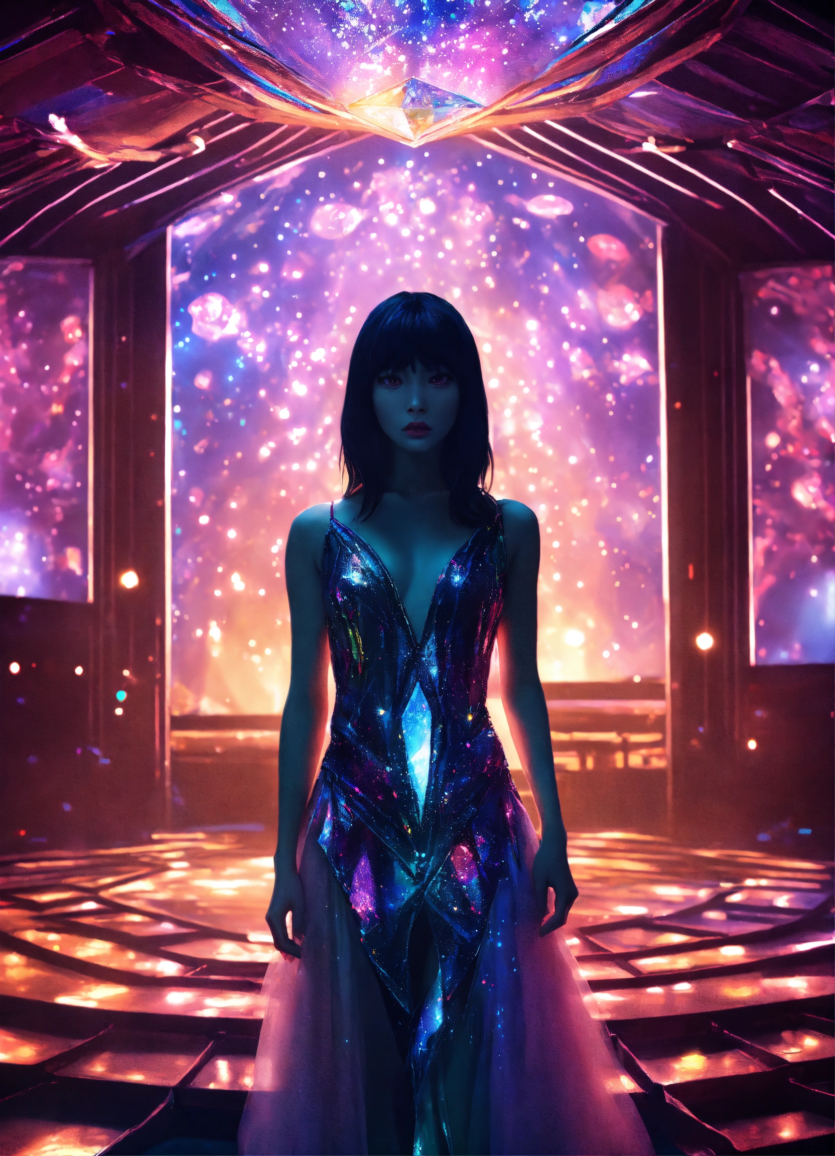 Photorealistic the grudge in a diamond dress in a glowing cosmic rave venue