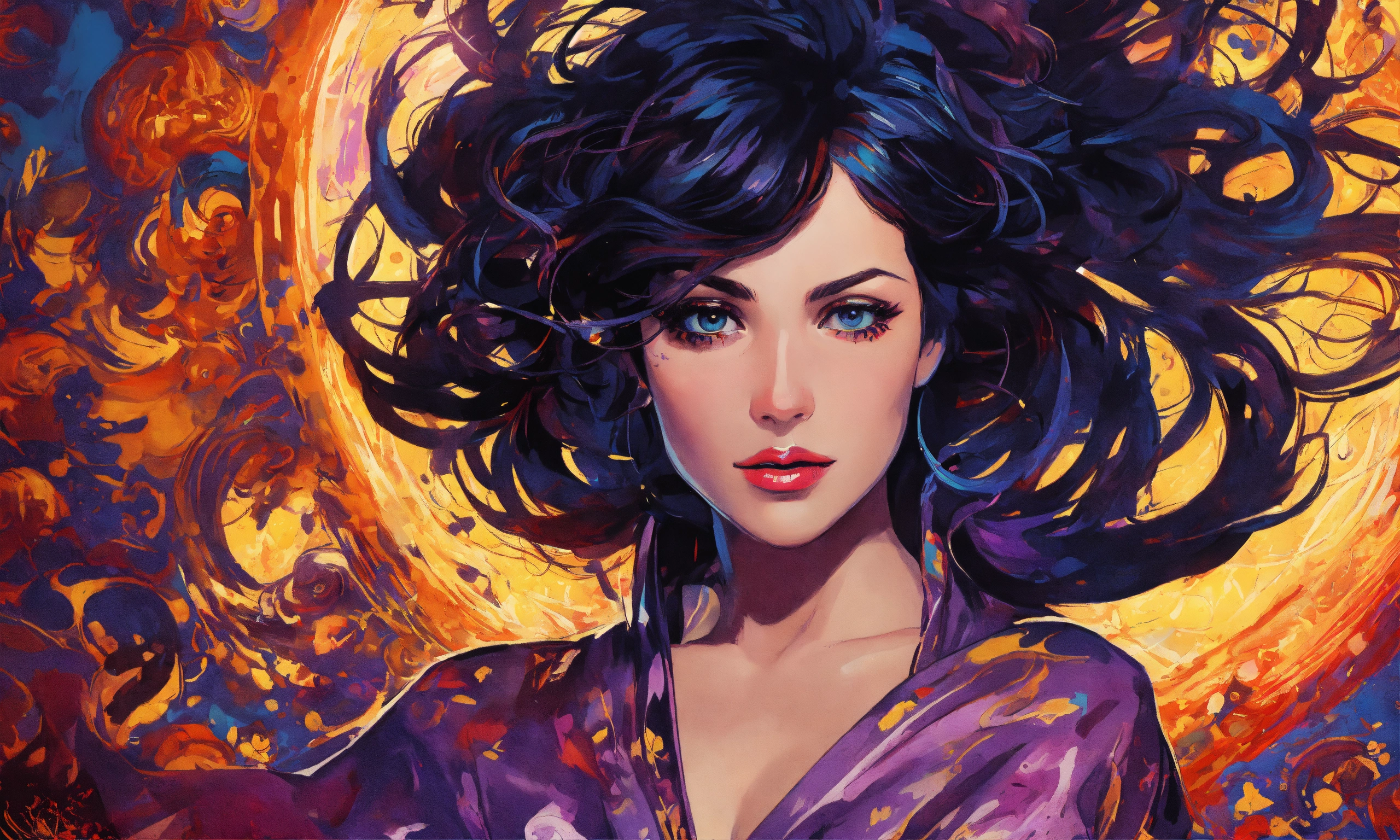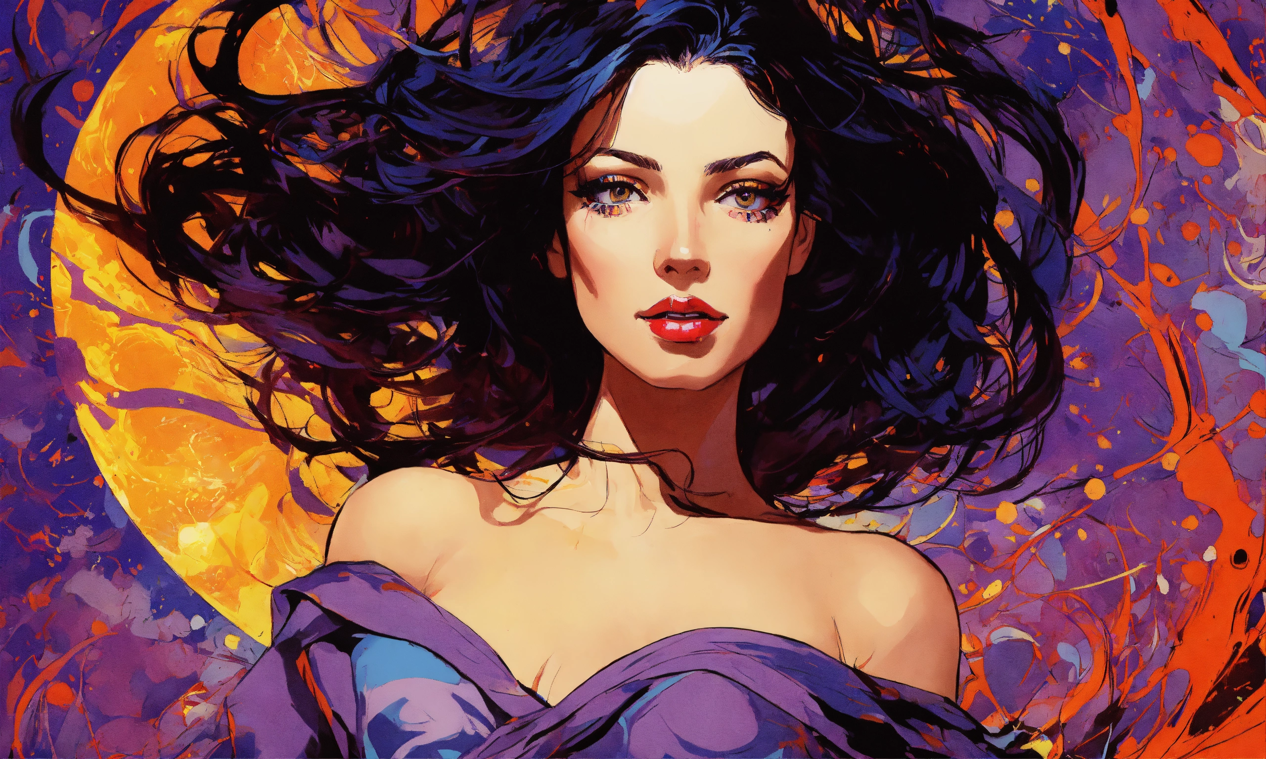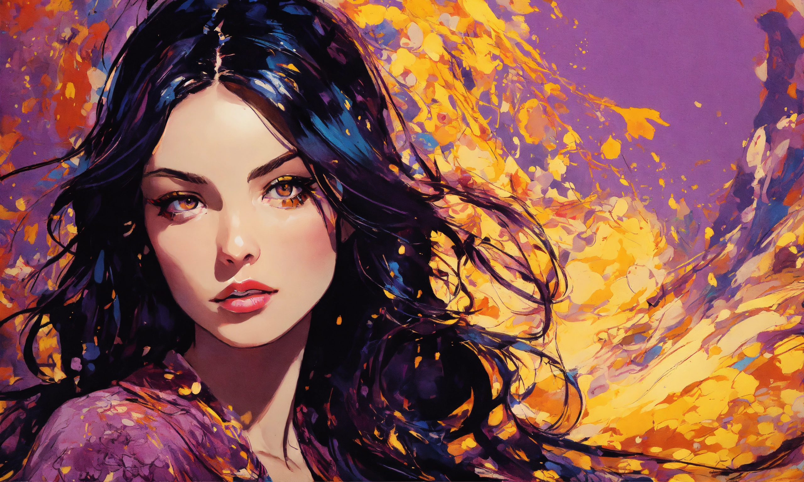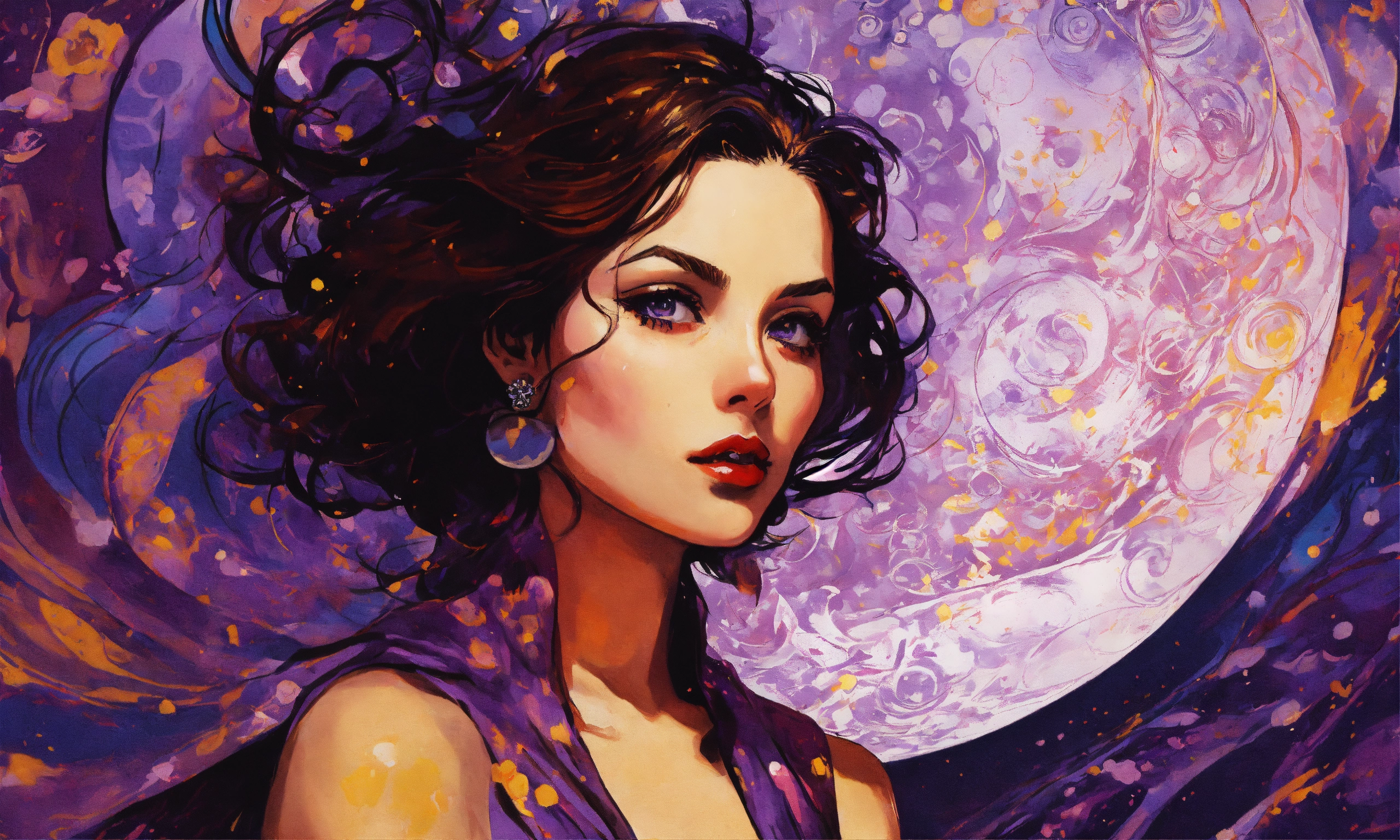 Pop art, elegant enchanting brunette celestial being, violet eyes, concept art, sharp focus, intricate, highly detailed, smooth, dim incandescent light, art by jackson pollock, comic book art style, robe.