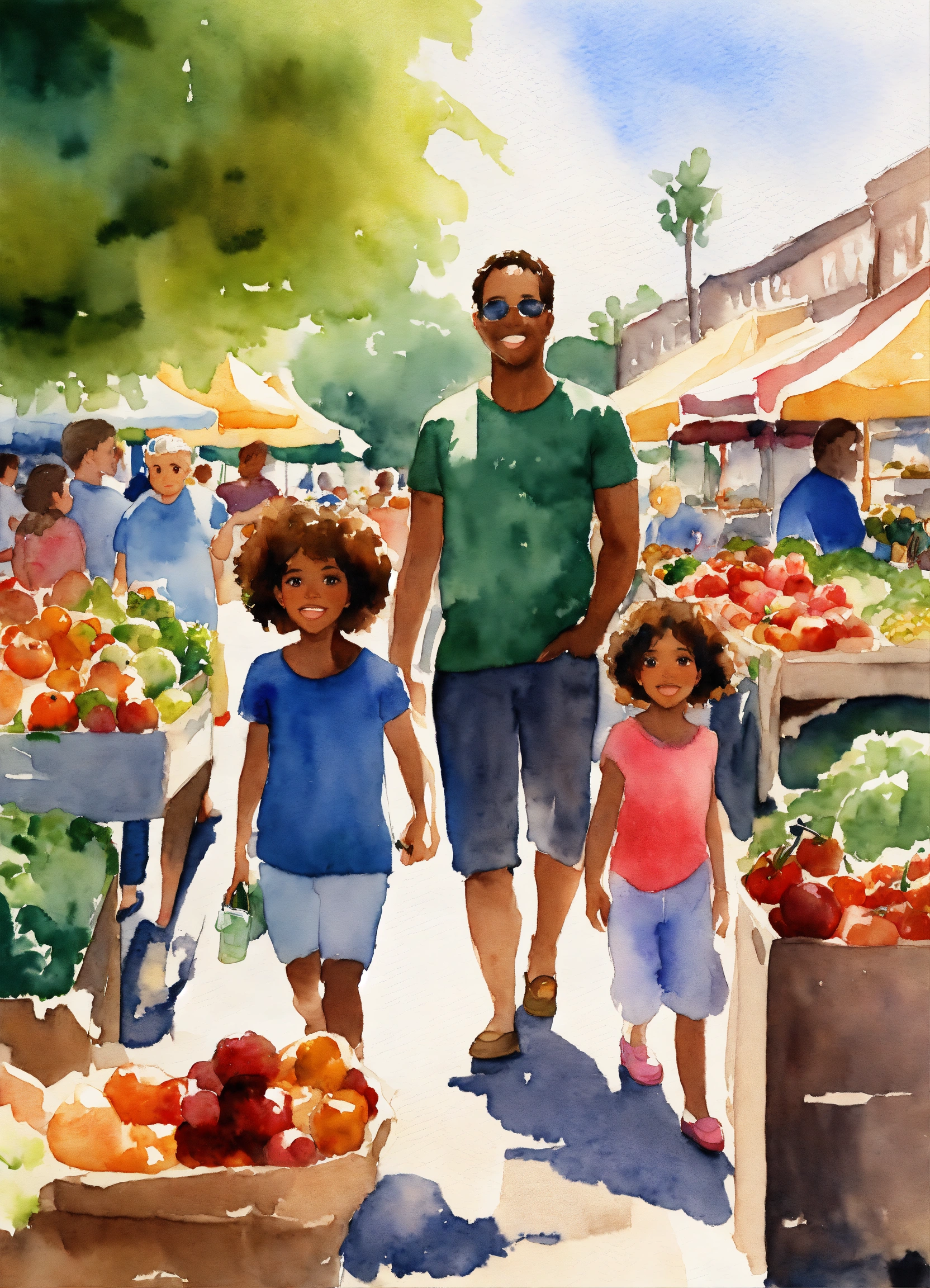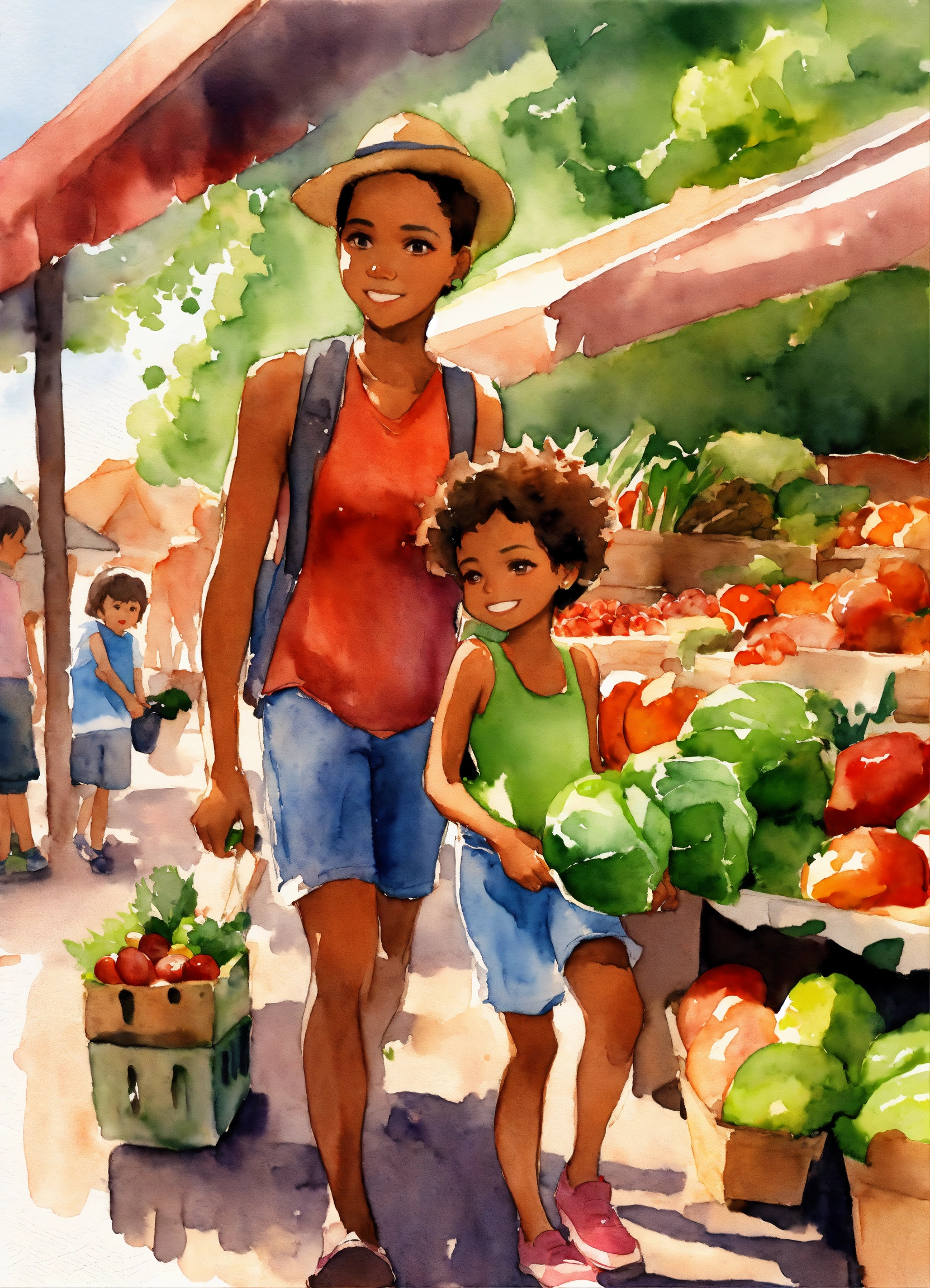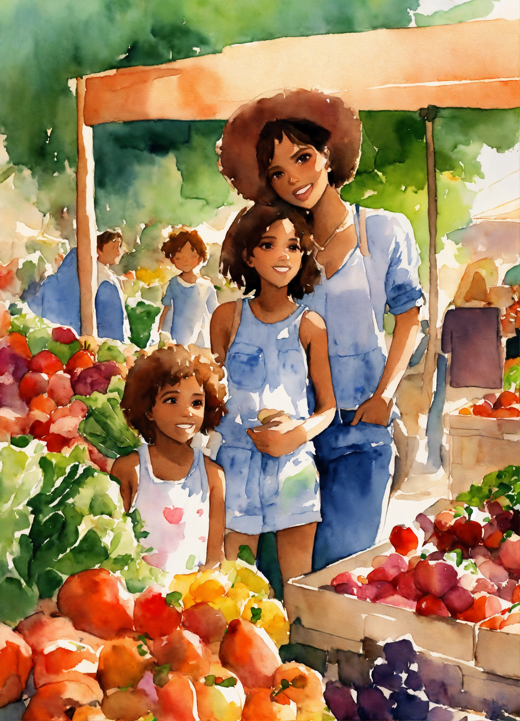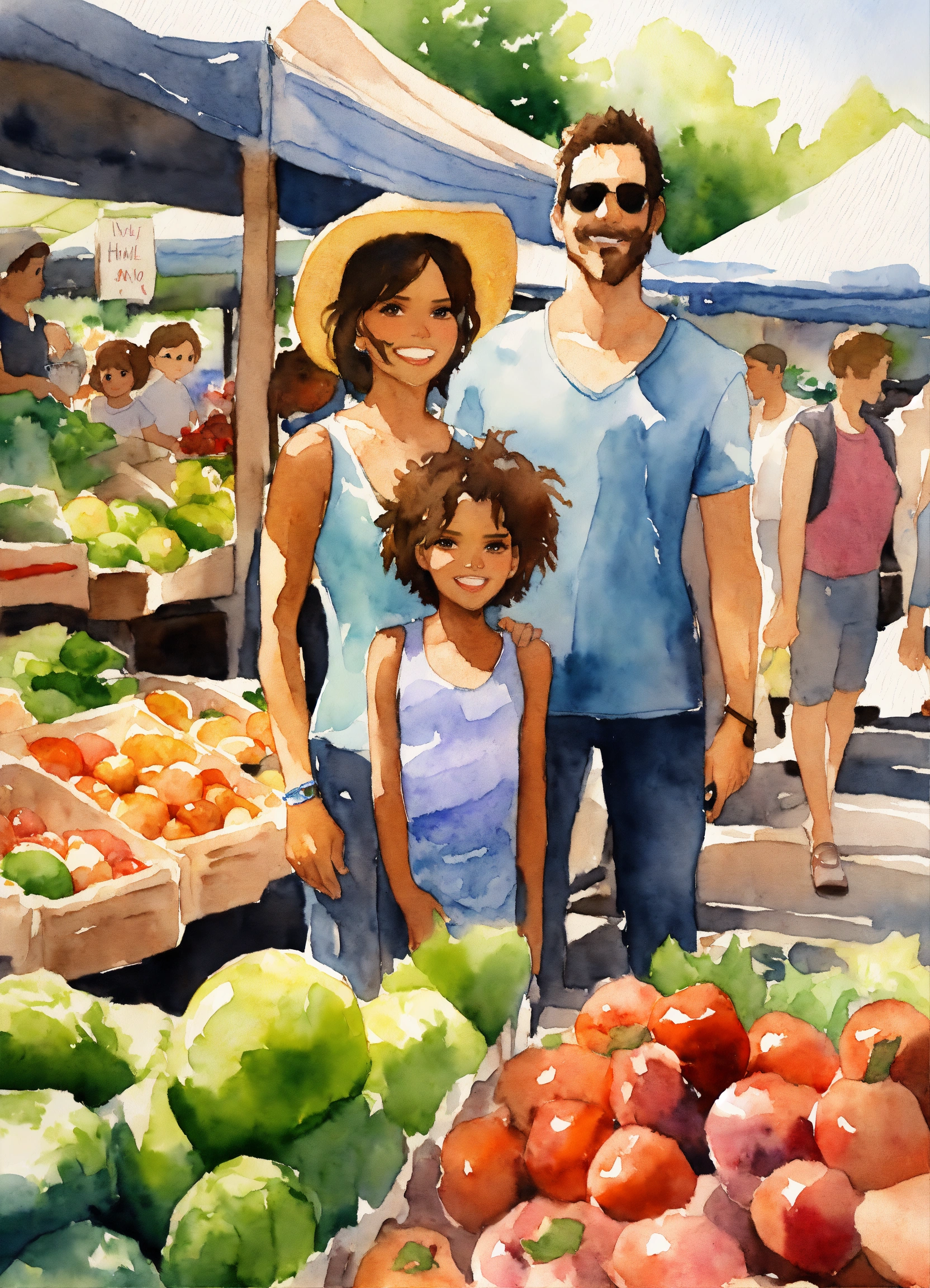 Watercolor pixar painting of 8 year old halle berry and her family at the local farmer's market, surrounded by fresh produce, watercolor pixar style cartoon