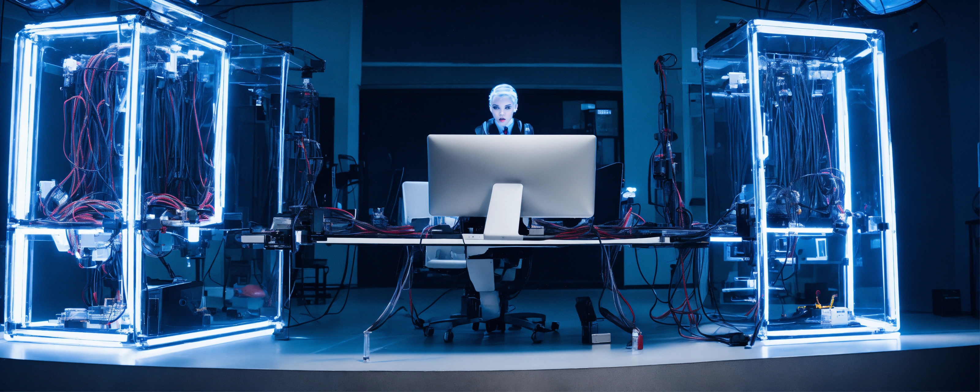 Body portrait photography, in an office full of cables and wires and led, driving a carbon motor head attractive transparent white plexiglass man secretary robots typing, 80 degree view, art by sergio lopez, natalie shau, james jean and salvador dali, cinematic ambiance, photo 16k, ultra realist, variant movie "blue lagoon", black bg, photo fusion. photo sfx