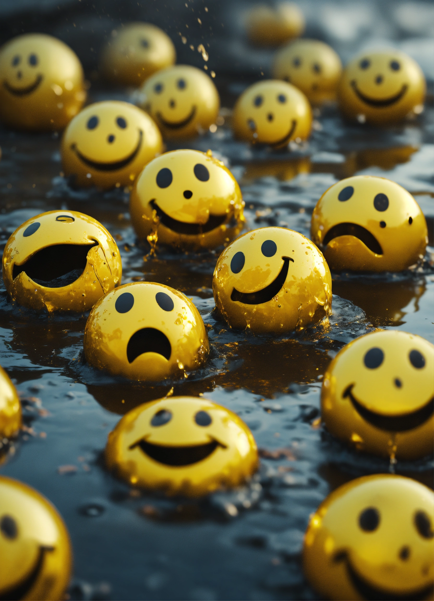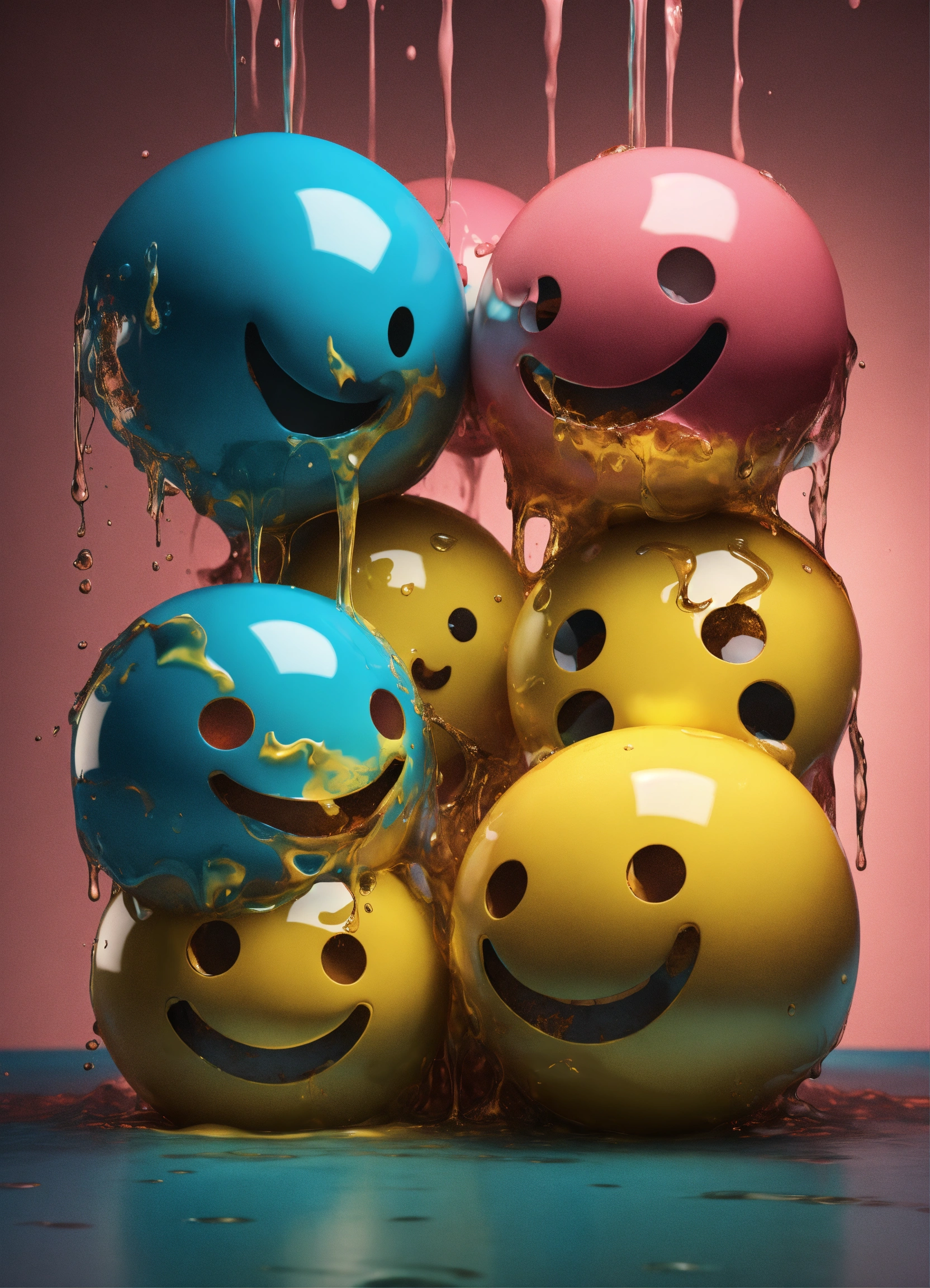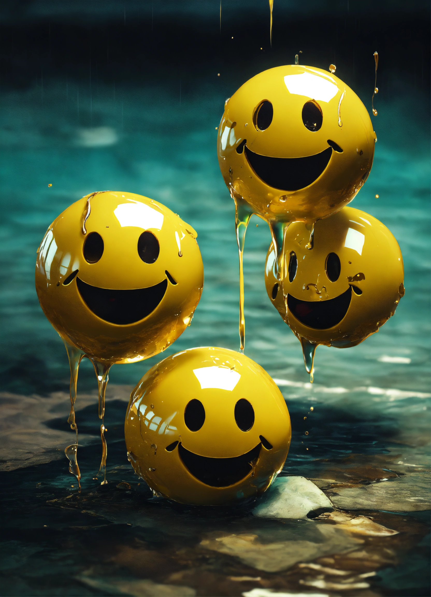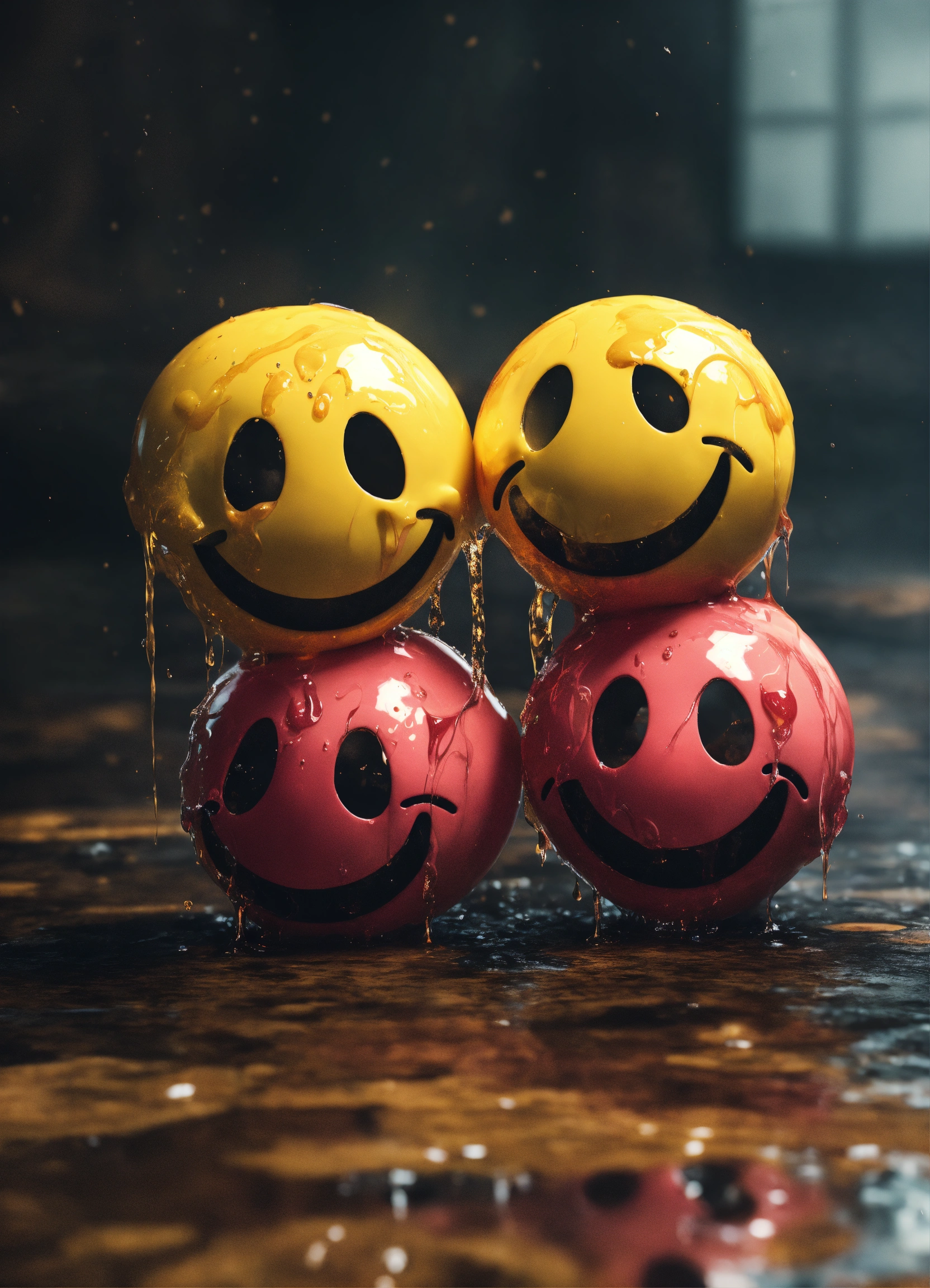 Four melting smiley faces next to one another, 4k render, surreal, hyperrealistic, grunge, distorted, crying, falling apart