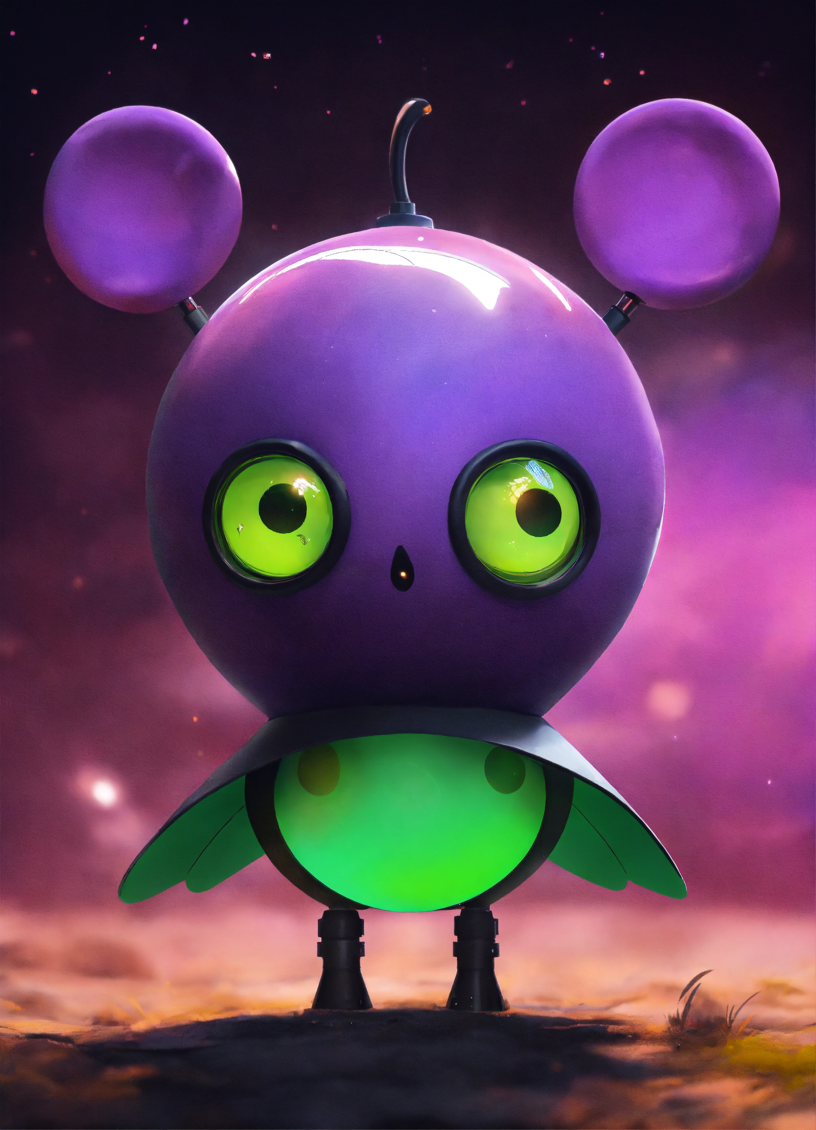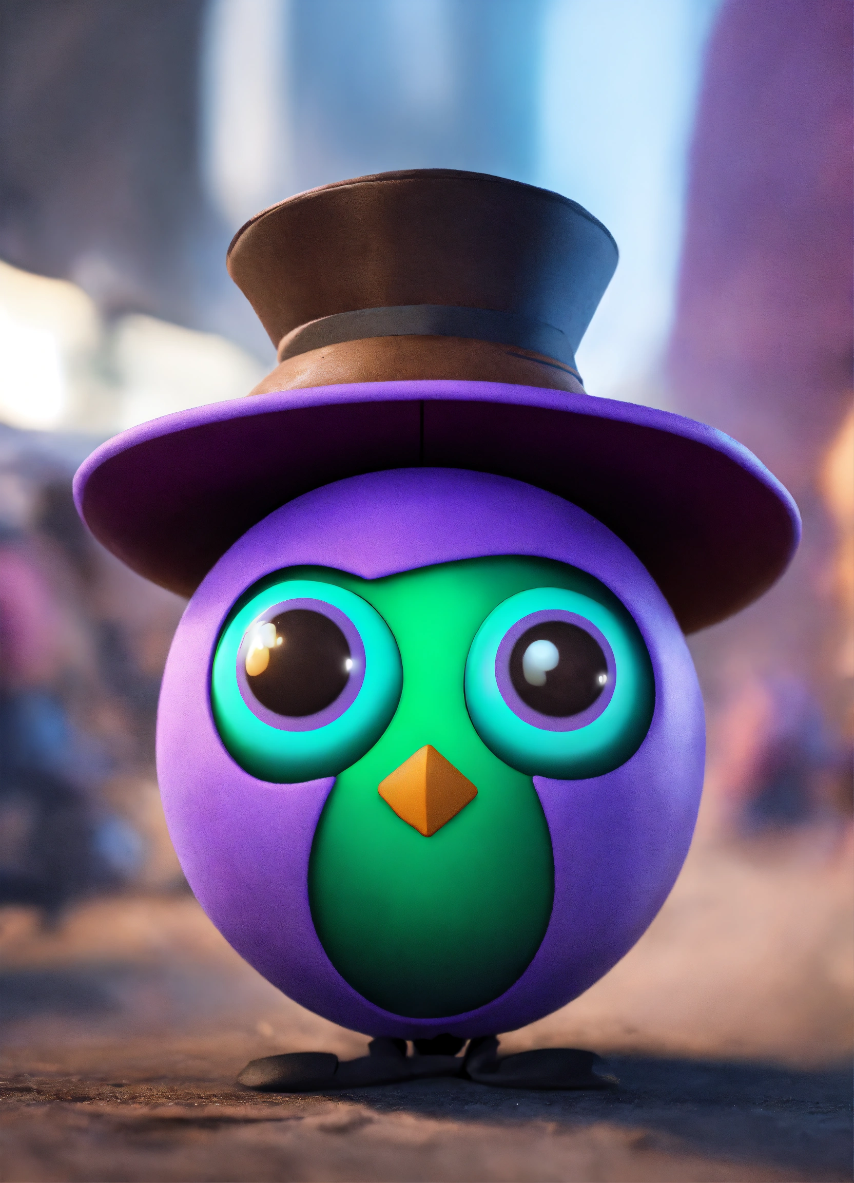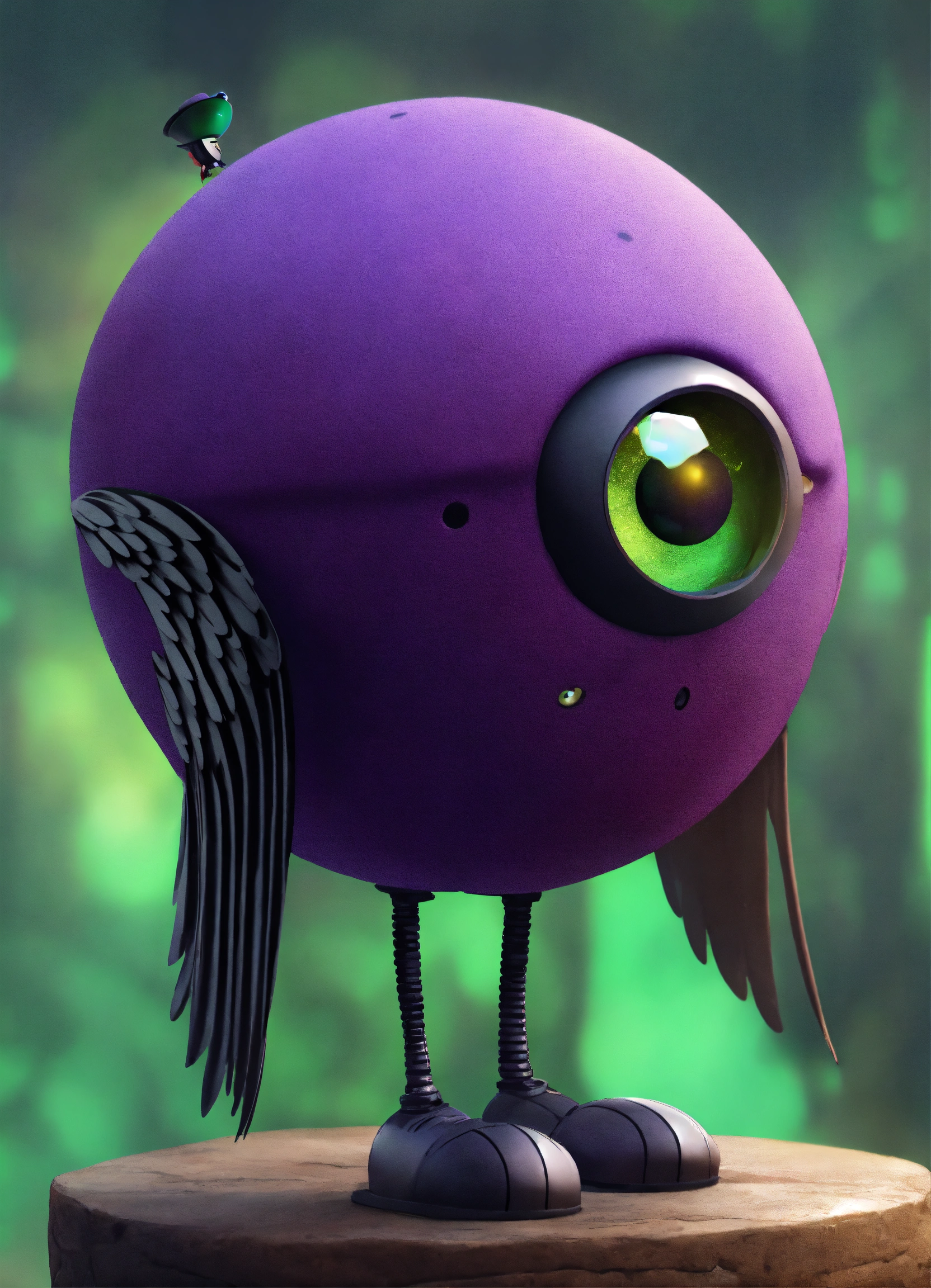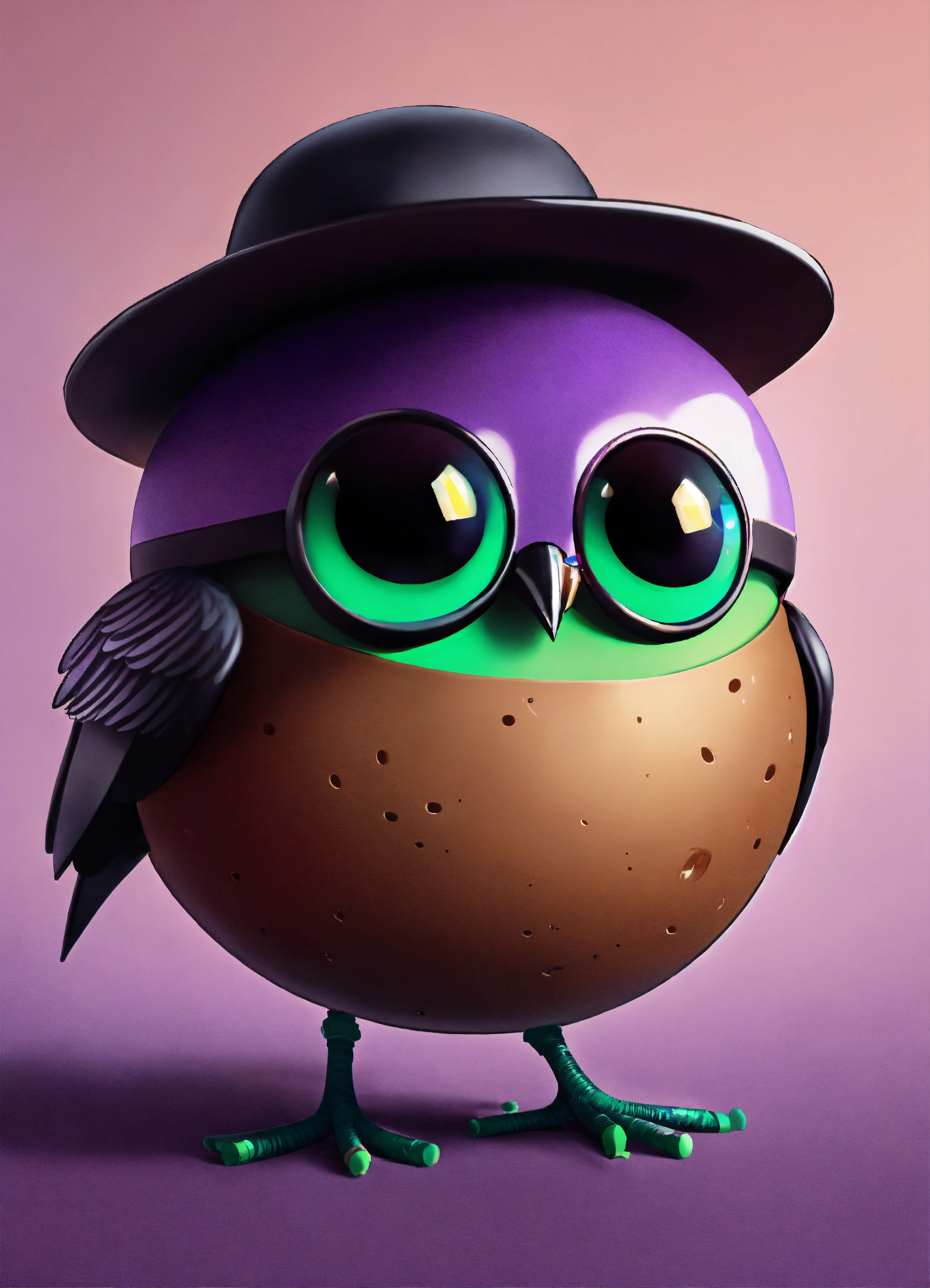 A purple ball head with google eyes, it wears a black hat and has green wings, the body is a brown blob