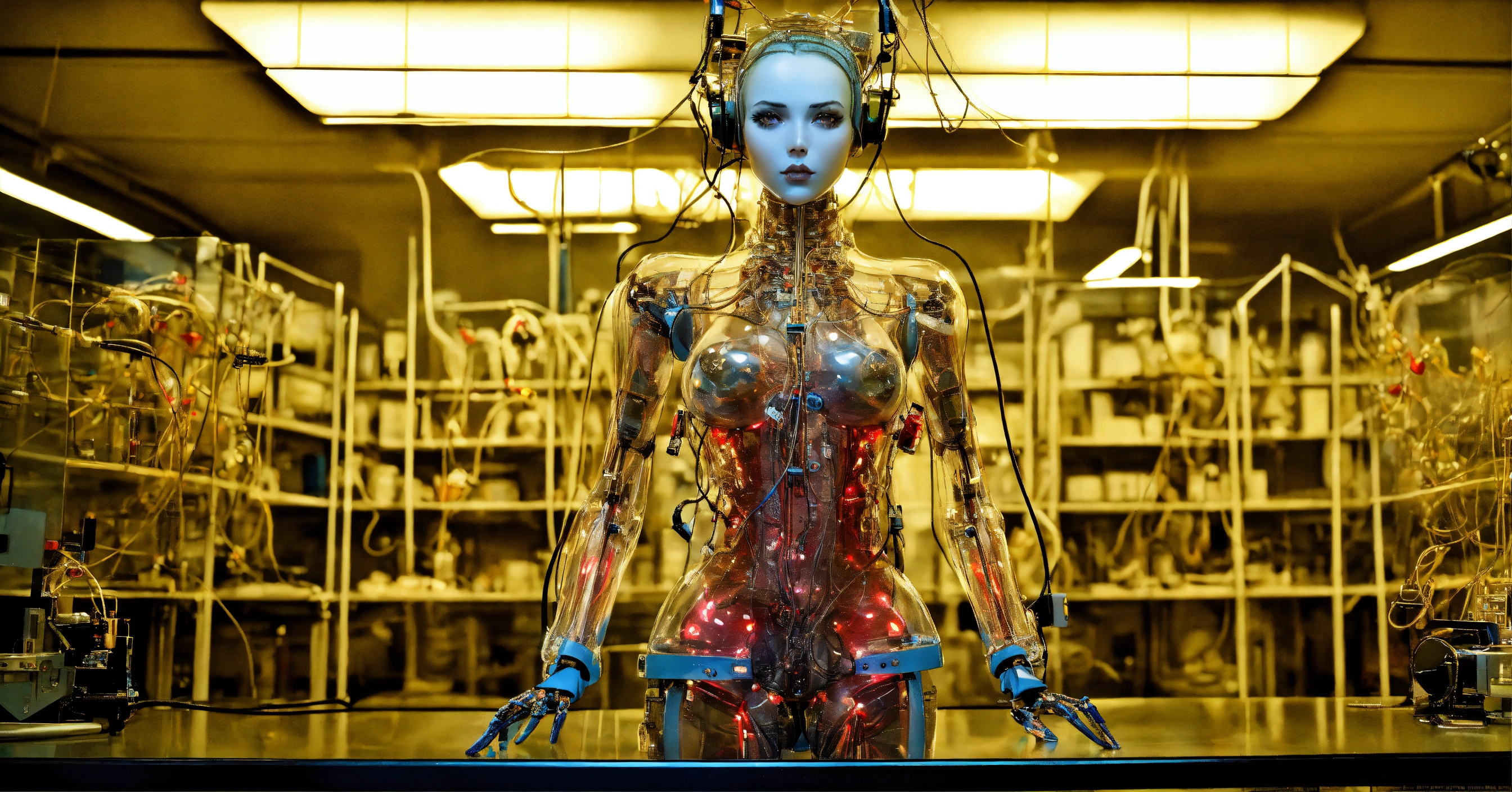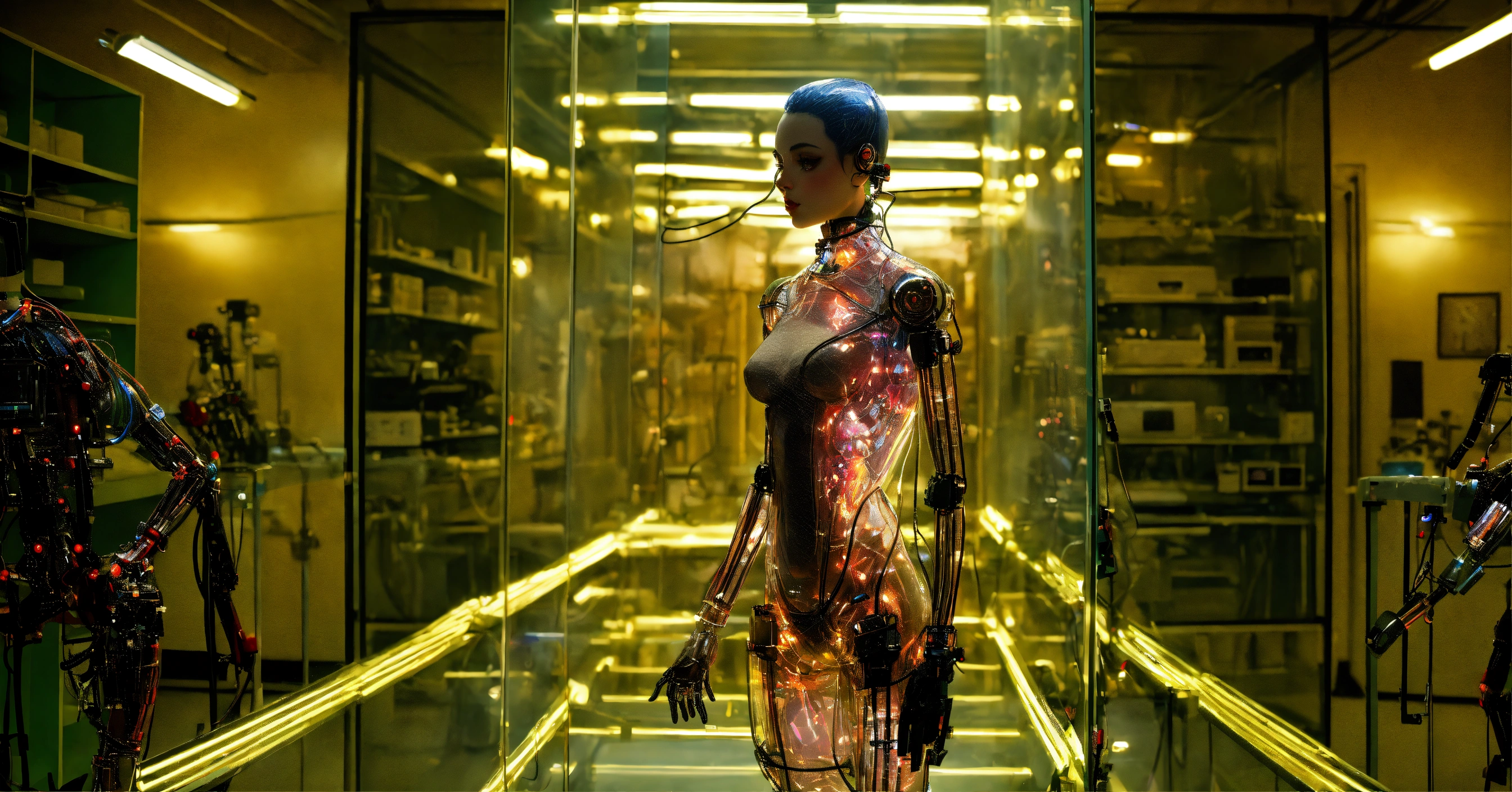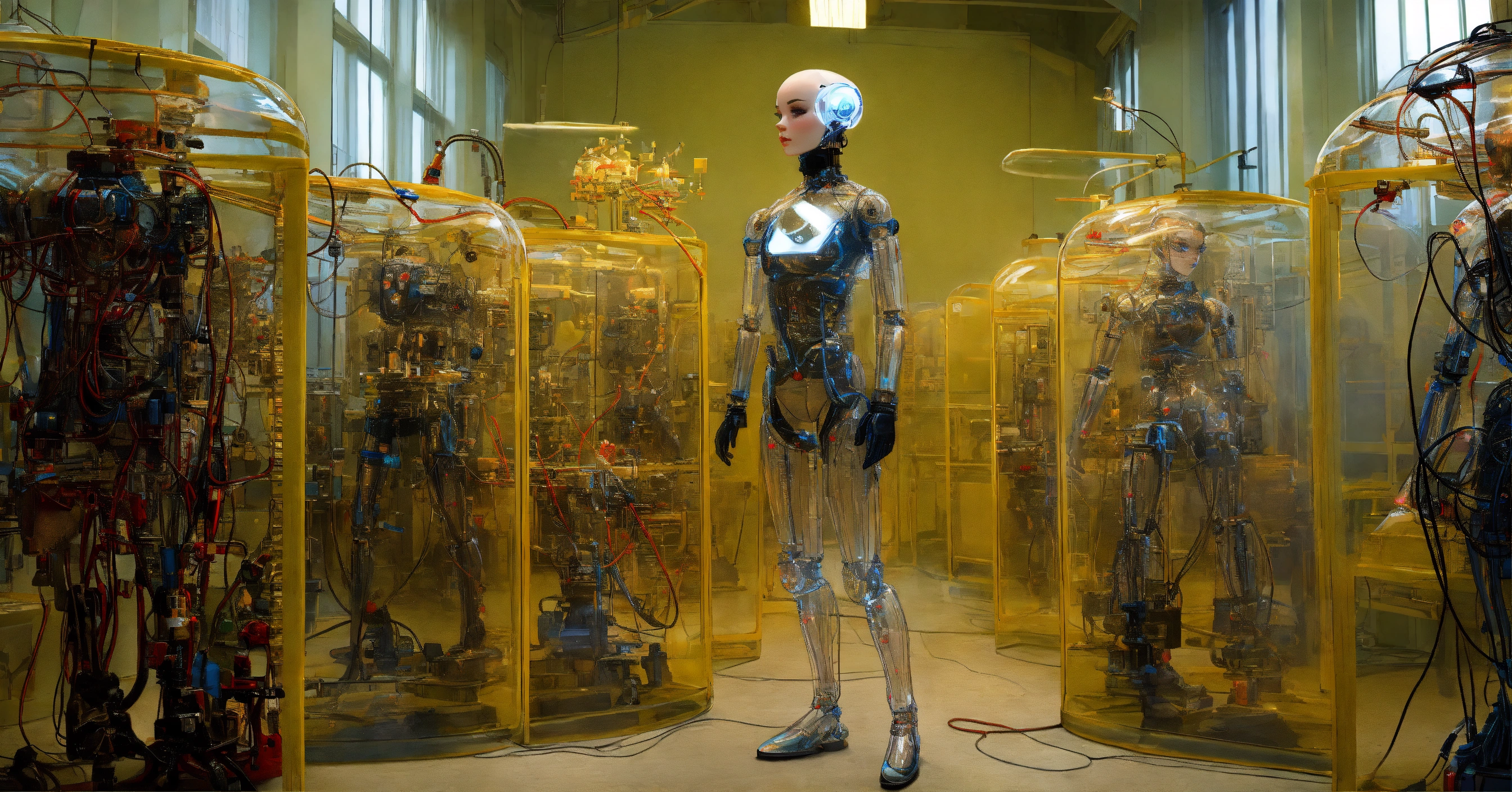Body portrait photography, in a laboratory full of cables and wires, standing an attractive transparent plexiglass body humanoid robots, with ray guns, 80 degree view, art by sergio lopez, natalie shau, james jean and salvador dali