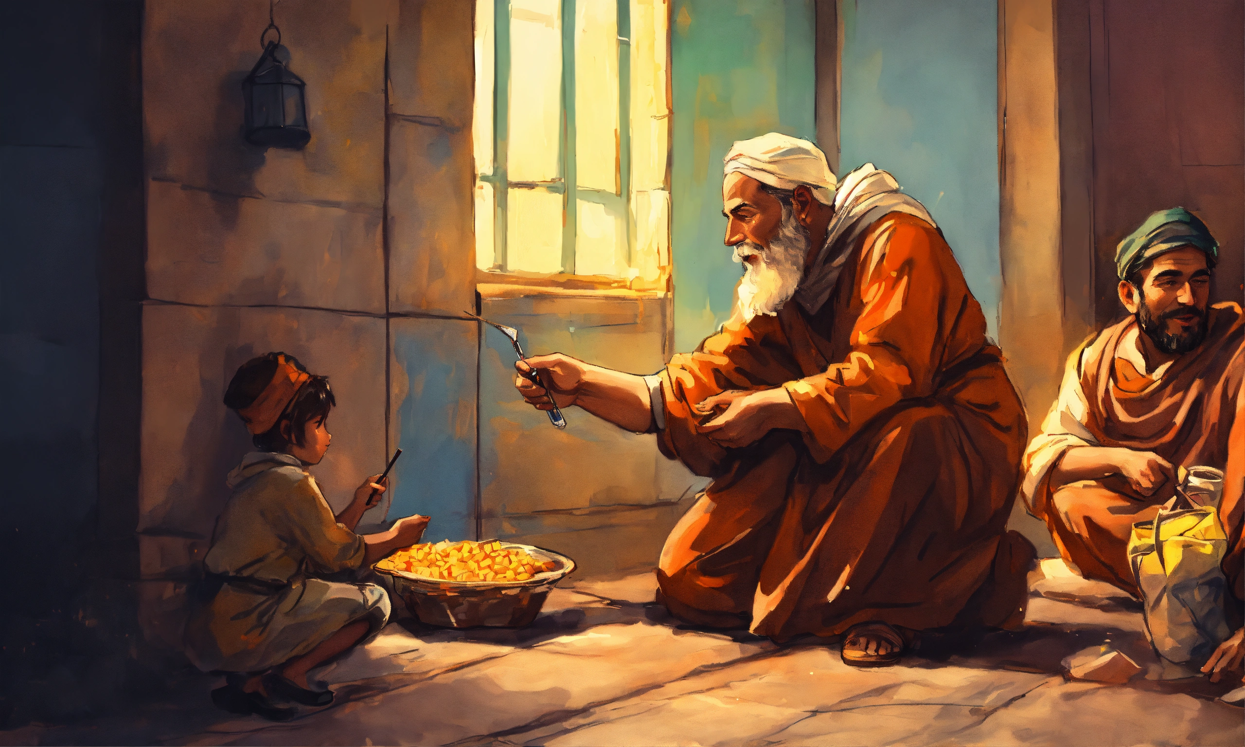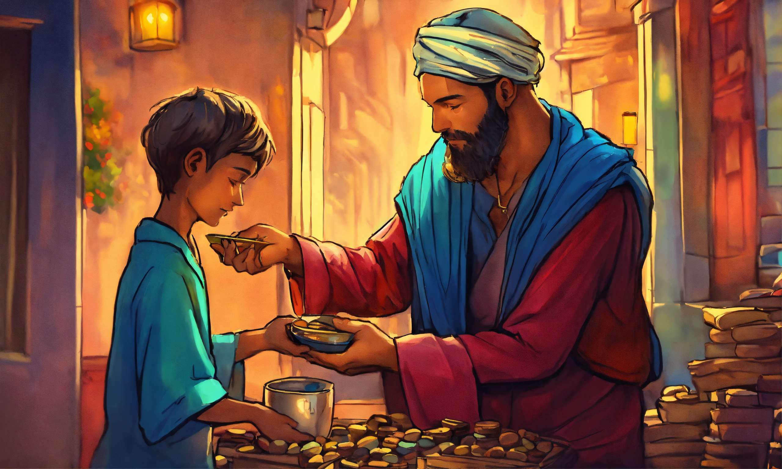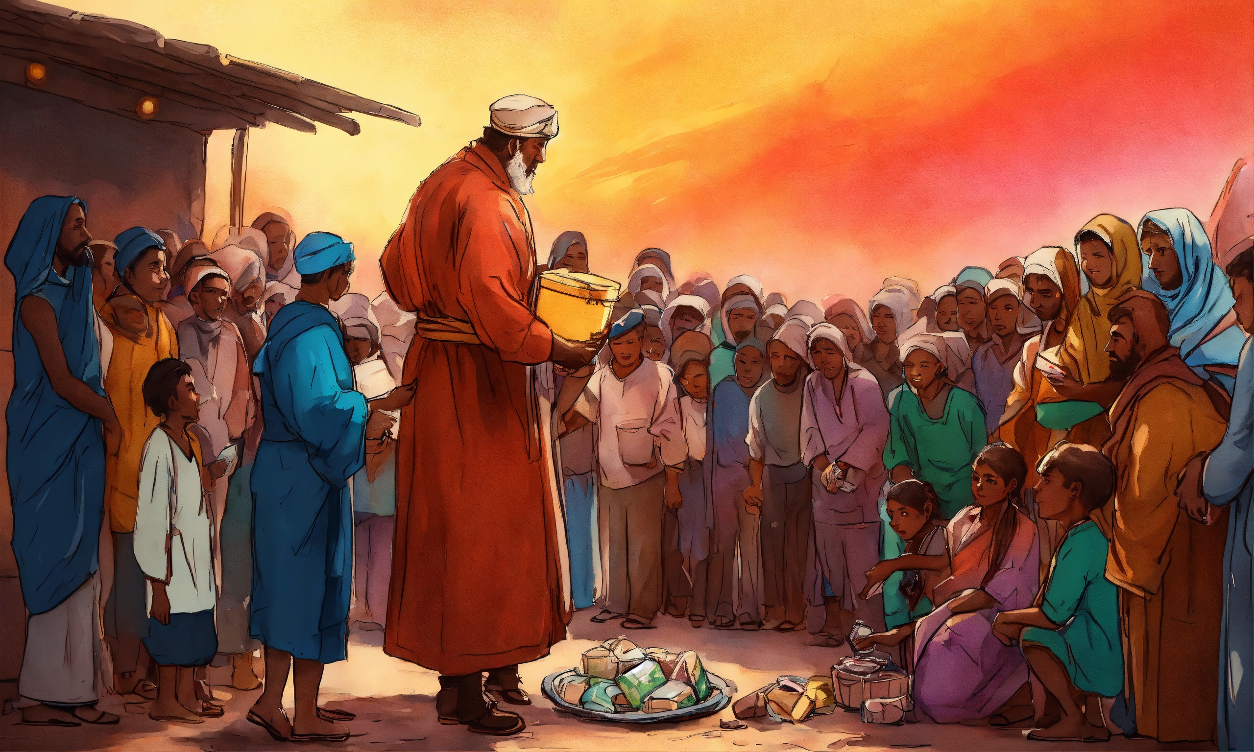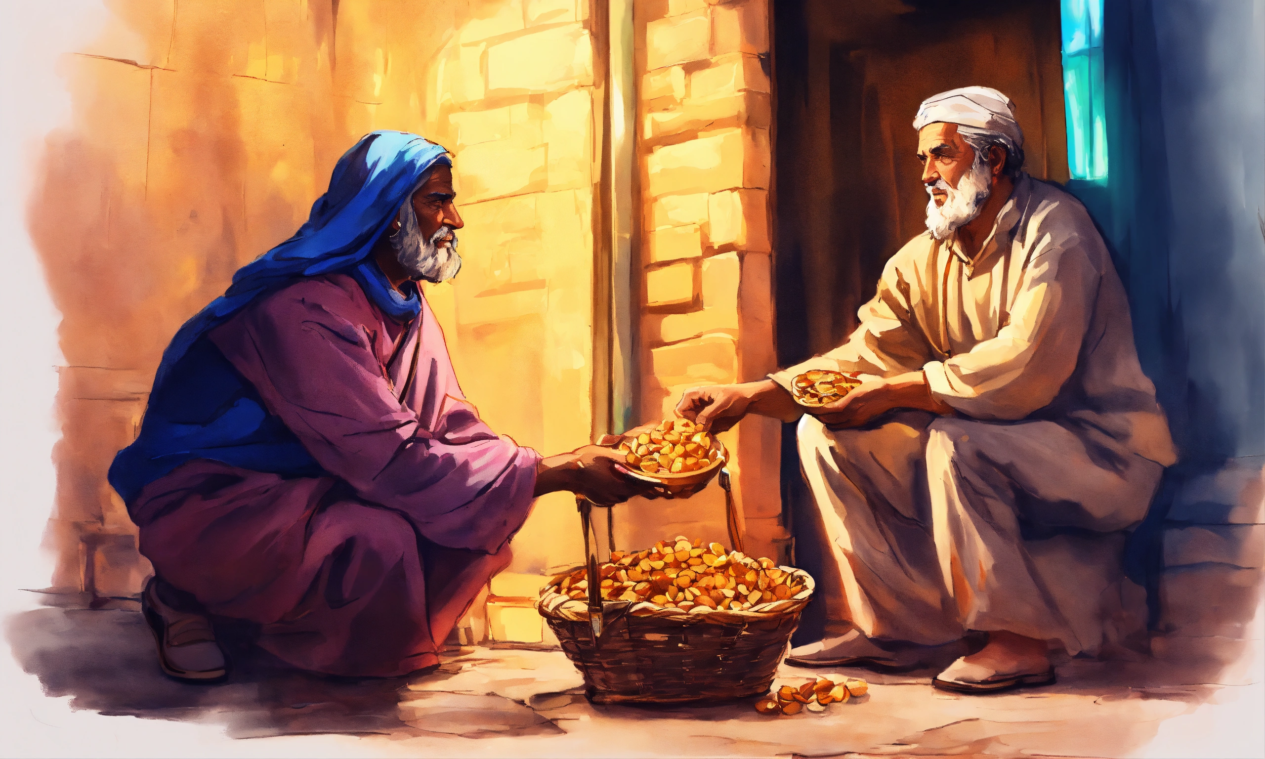 A hand drawn painting of a man giving charity to the poor