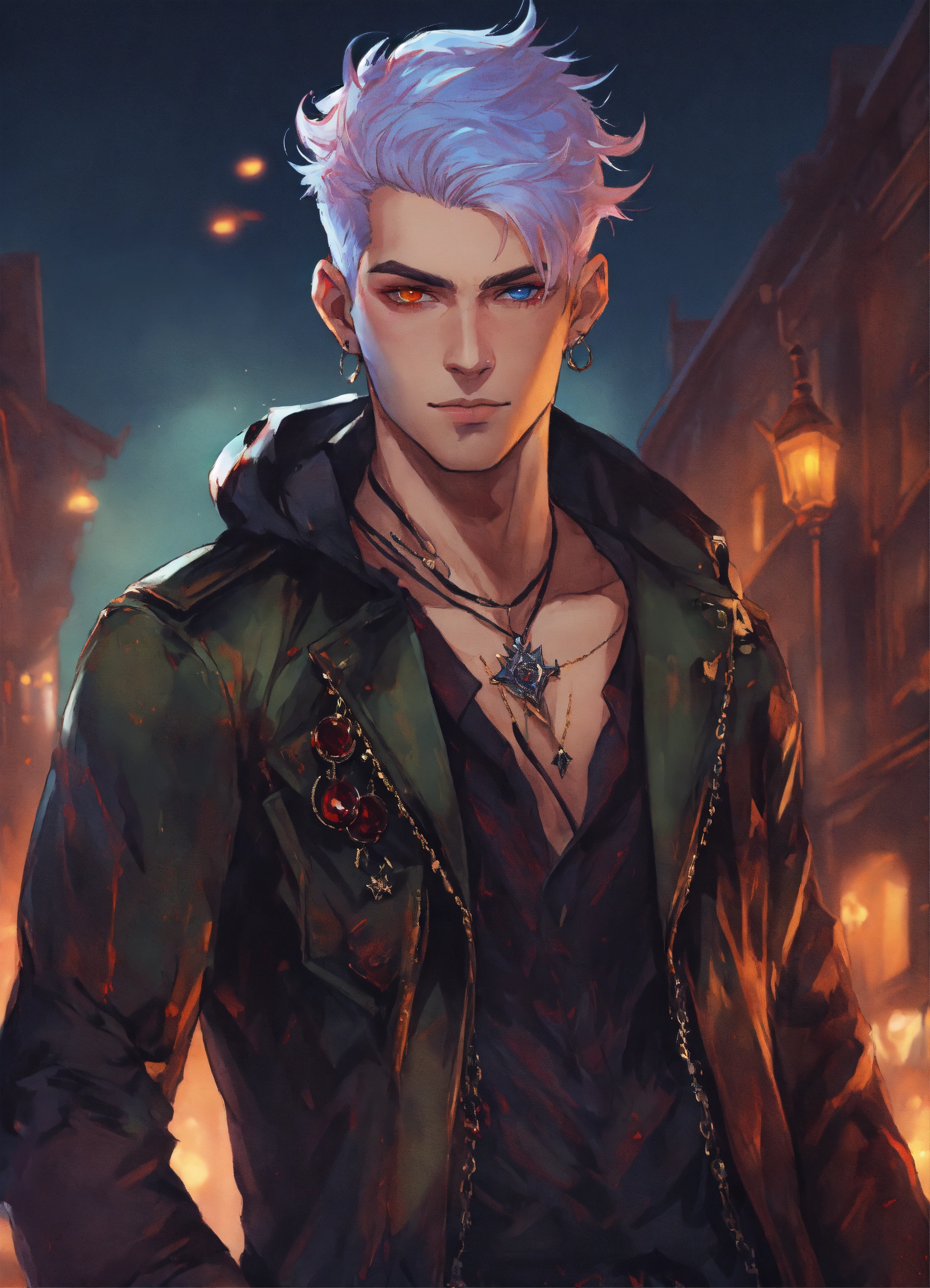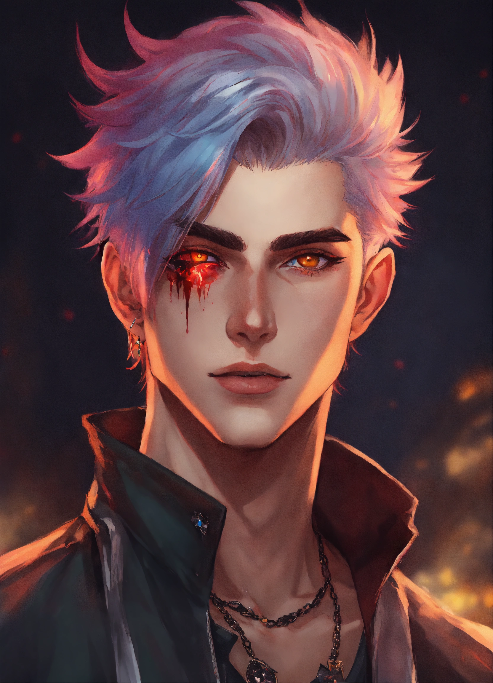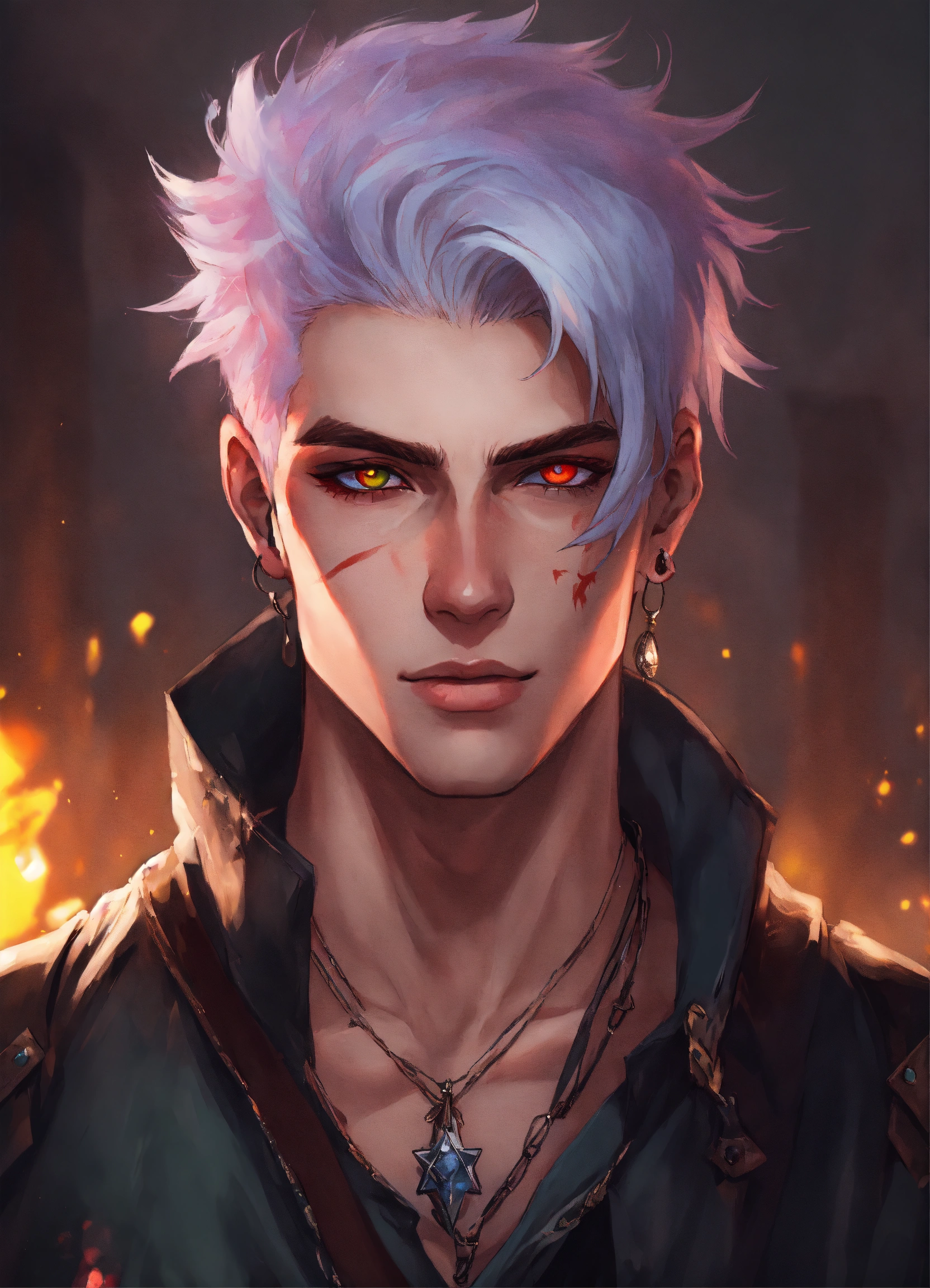 A handsome rockstar type guy with dyed hair and heterochromia possessed by a demon dnd character art