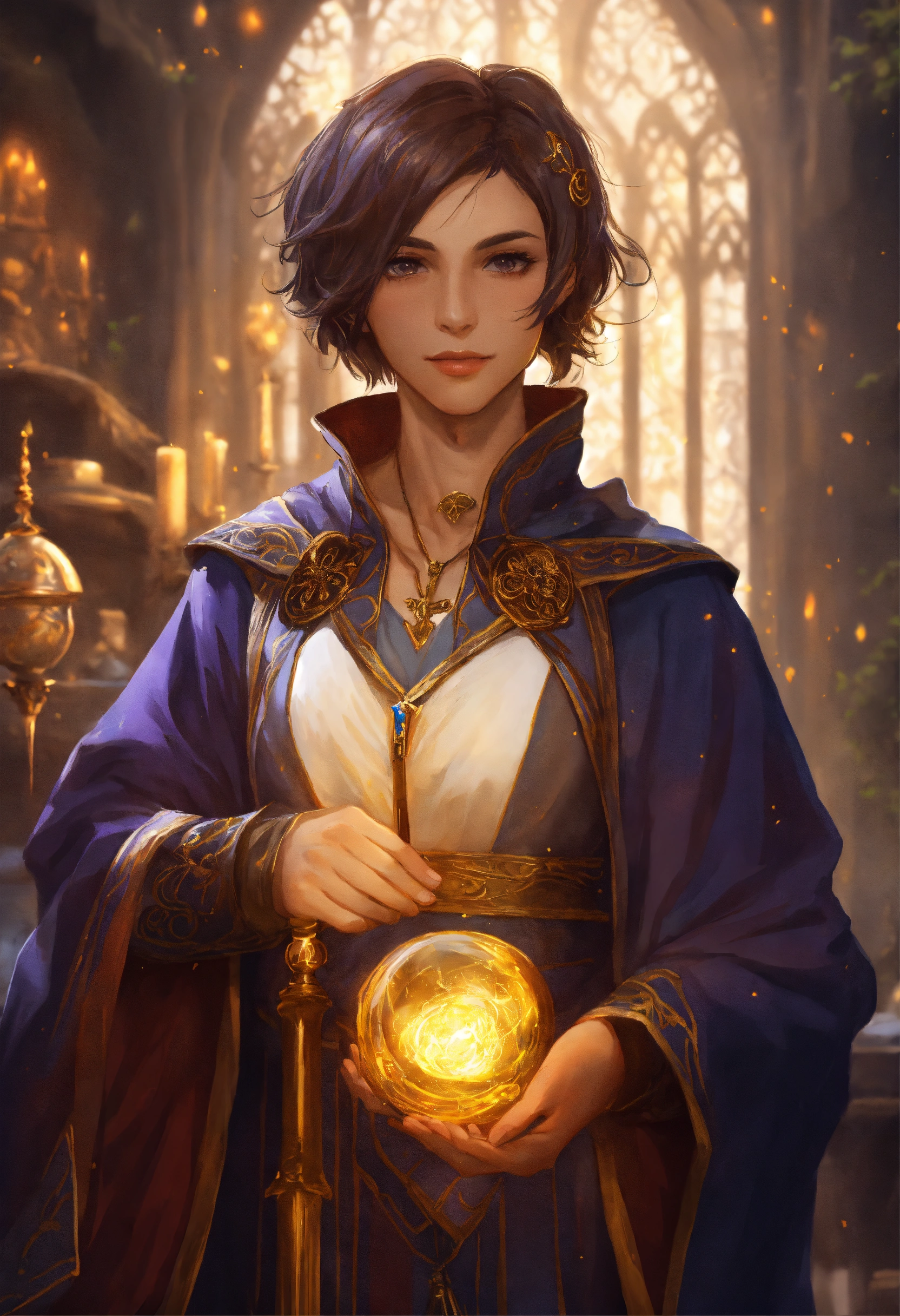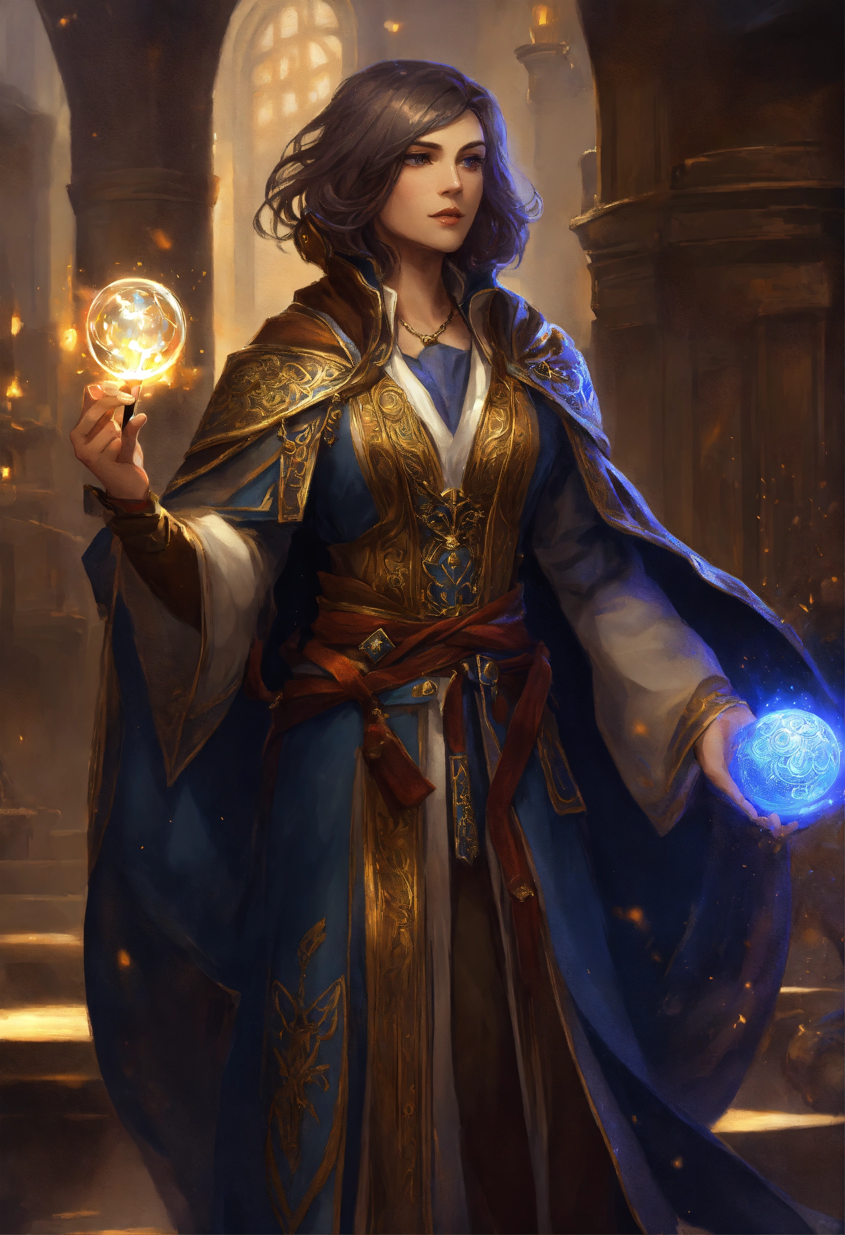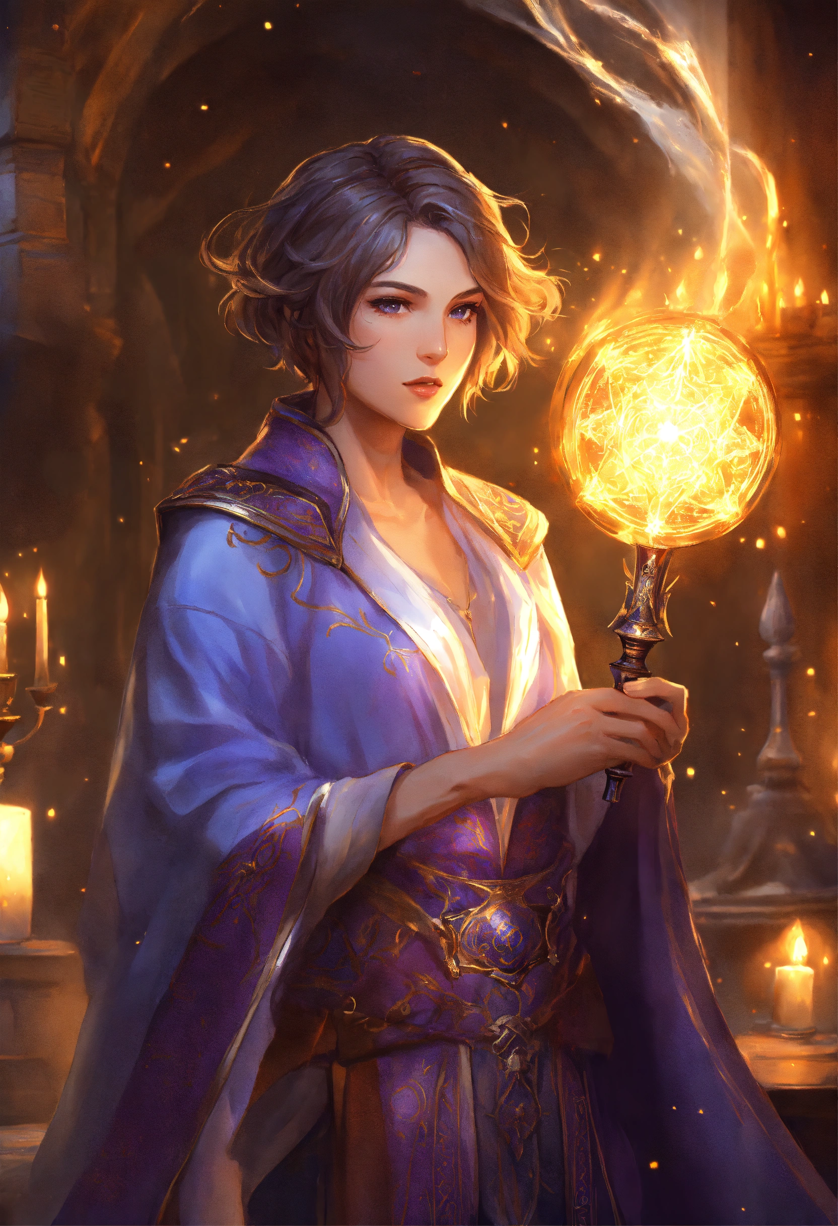 Masterpiece, high fantasy, archmage, wizard, female, short hair, middle-aged, pretty, handsome, staff, robes, magic
