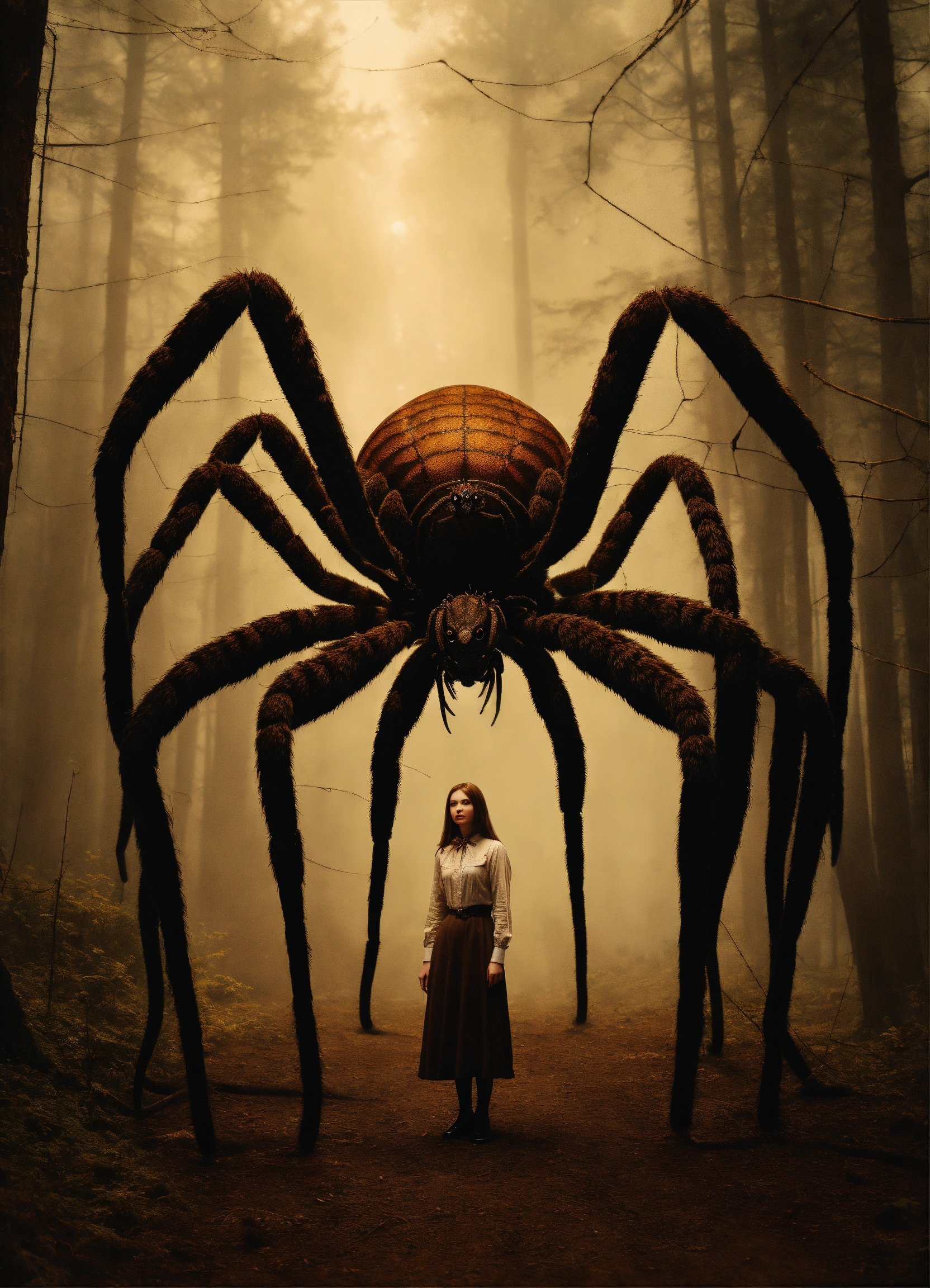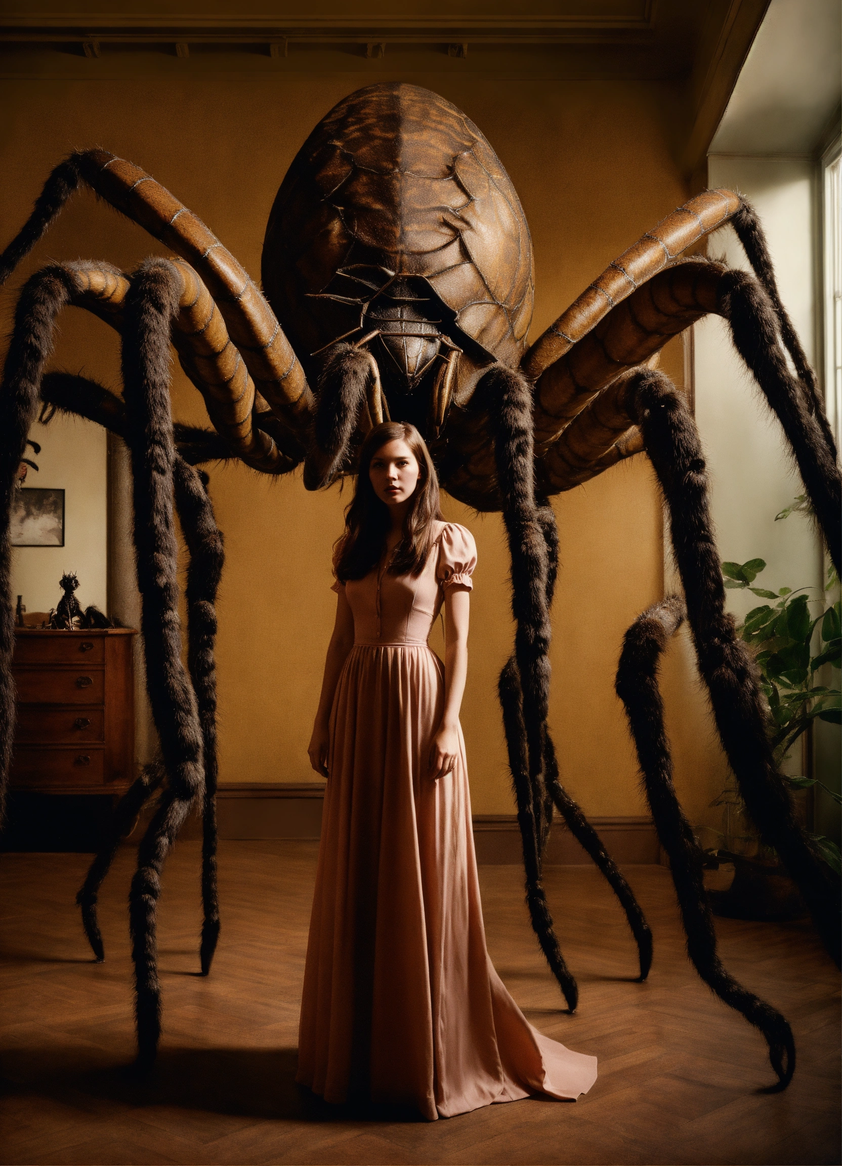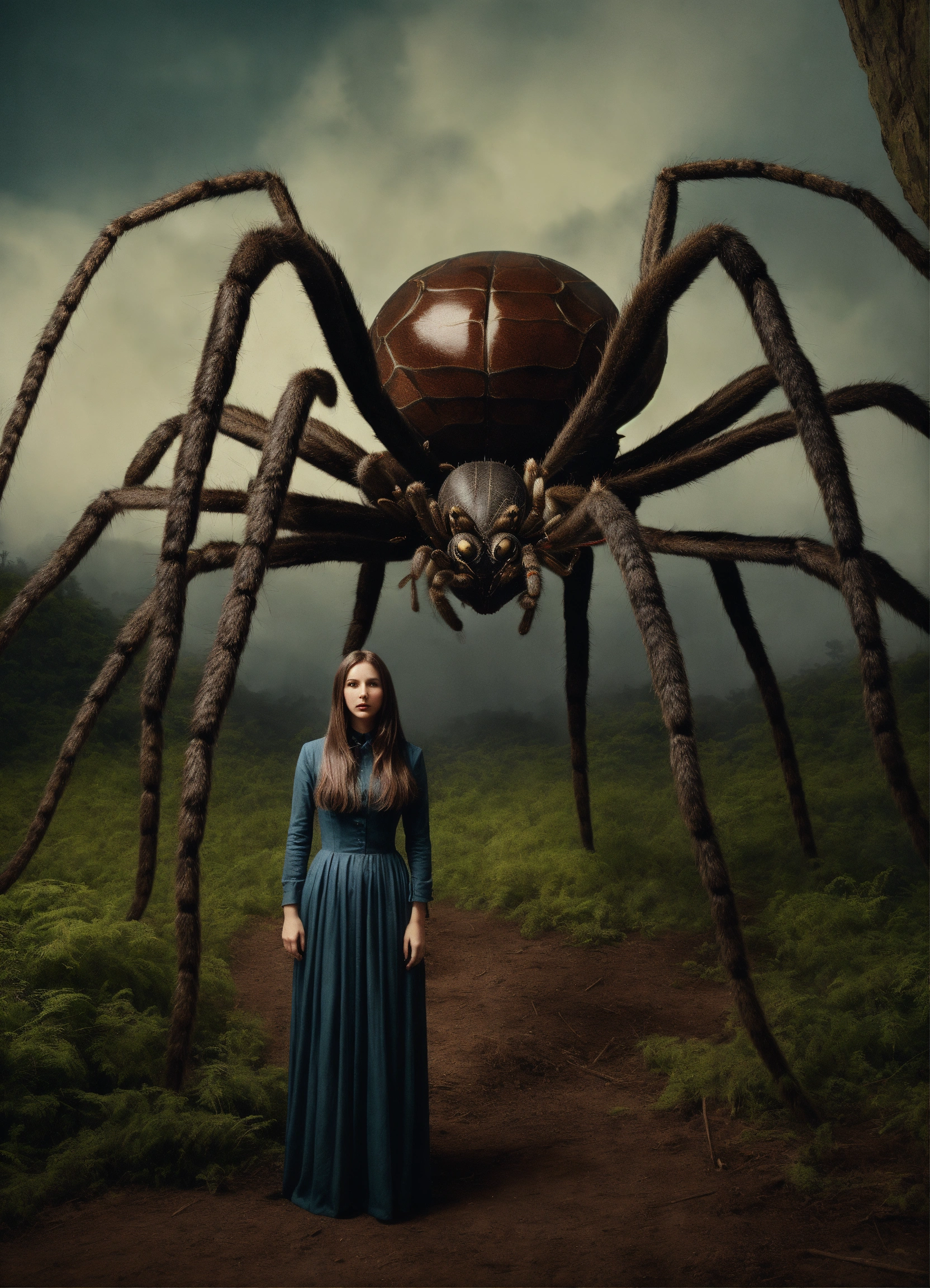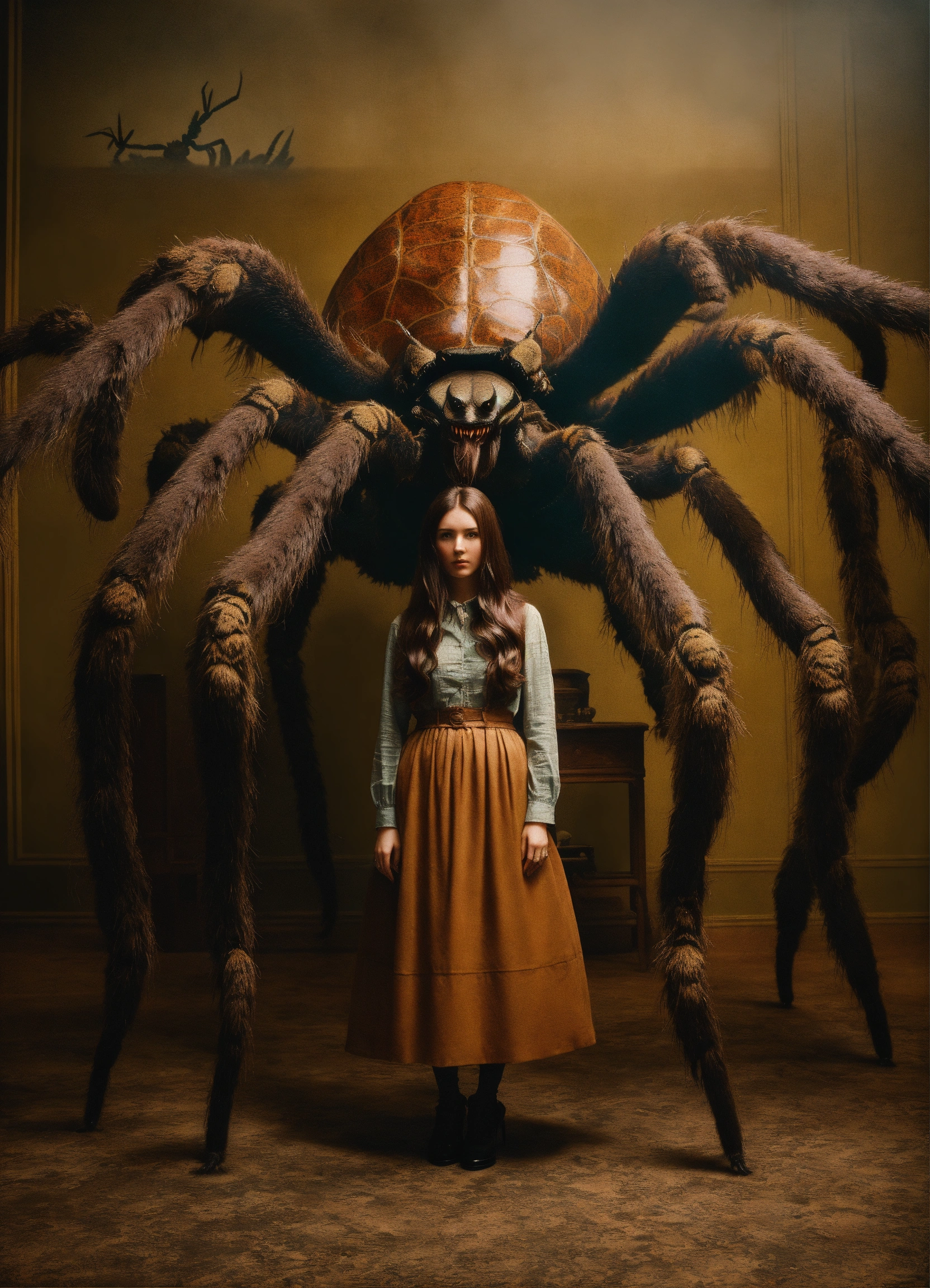 A woman with long brown hair standing next to a giant spider monster, in the style of contemporary vintage photography, necronomicon illustrations, tabletop photography, 1890, hyperrealistic animal portraits, ghostly presence, whirring contrivances, wes anderson colour grading
