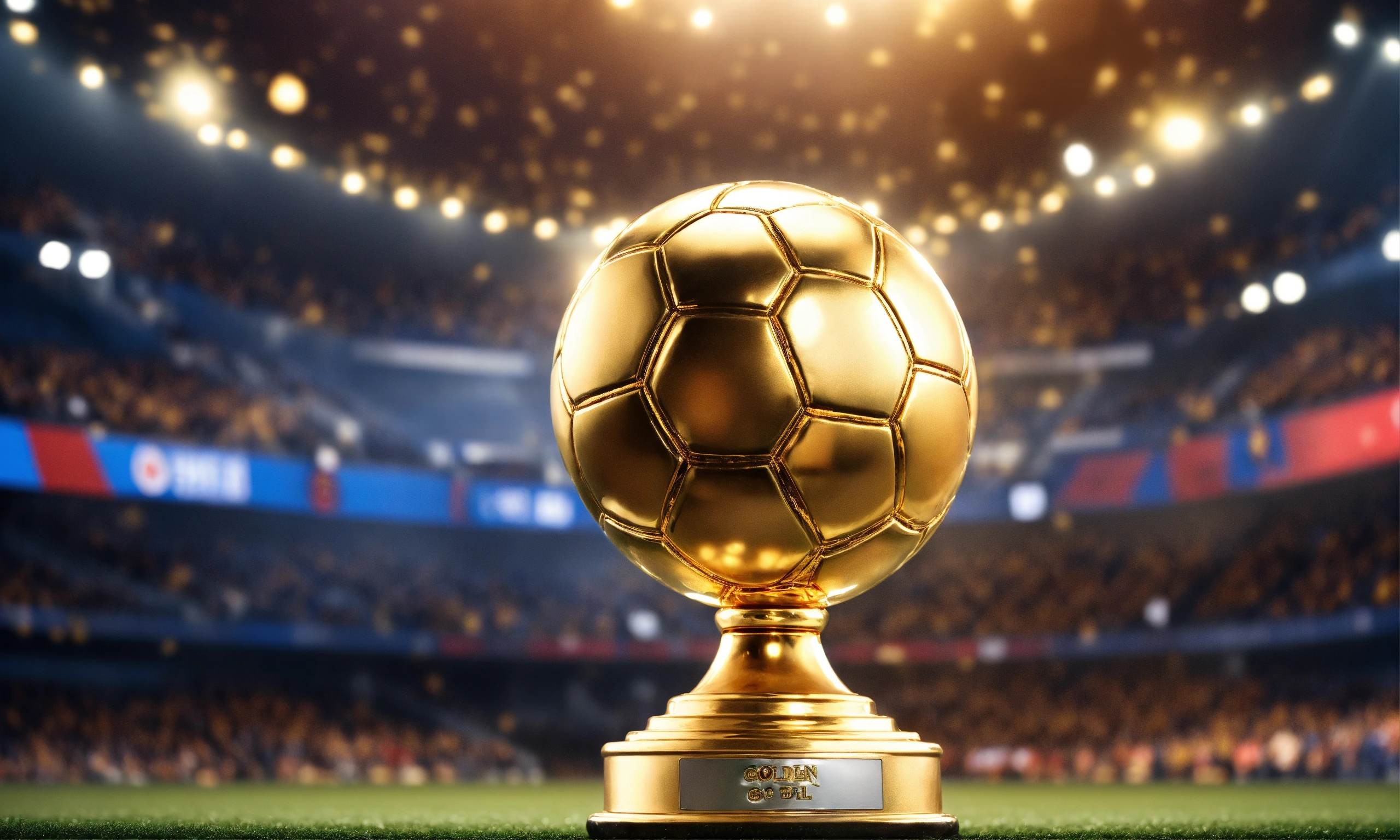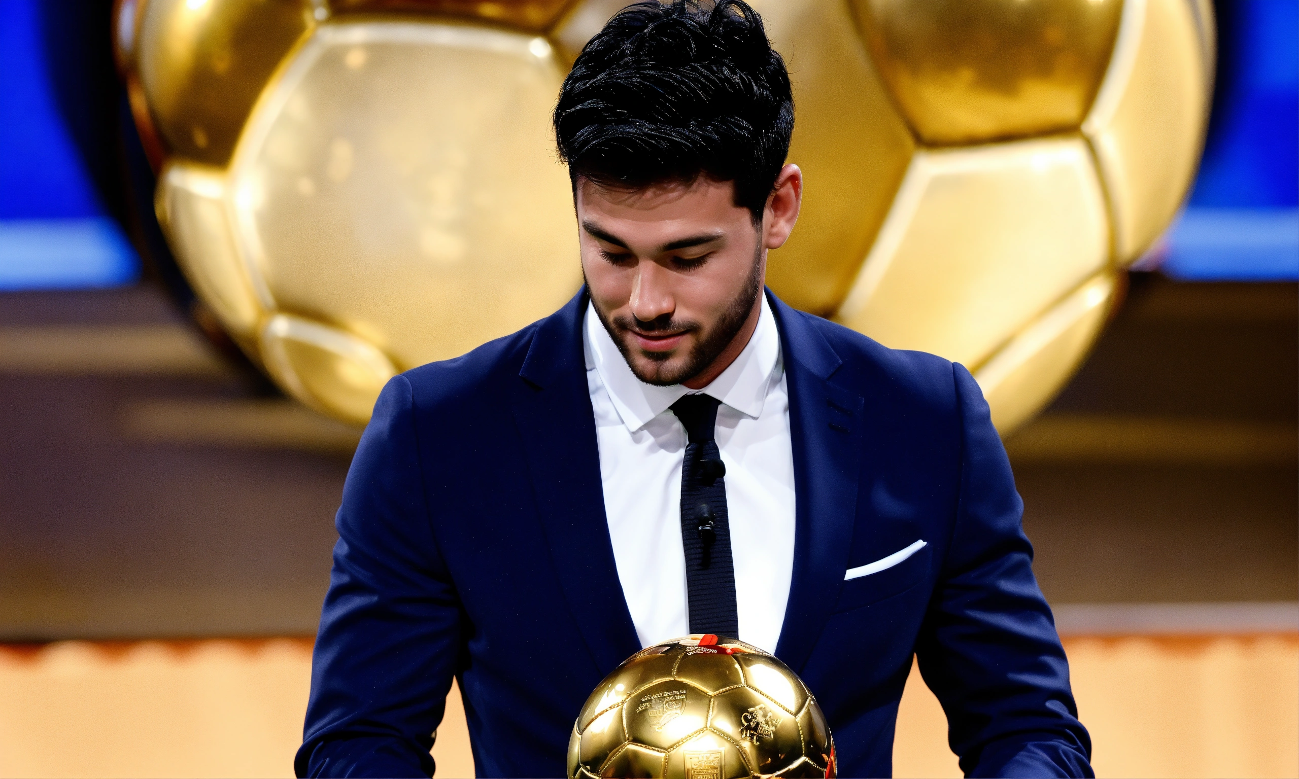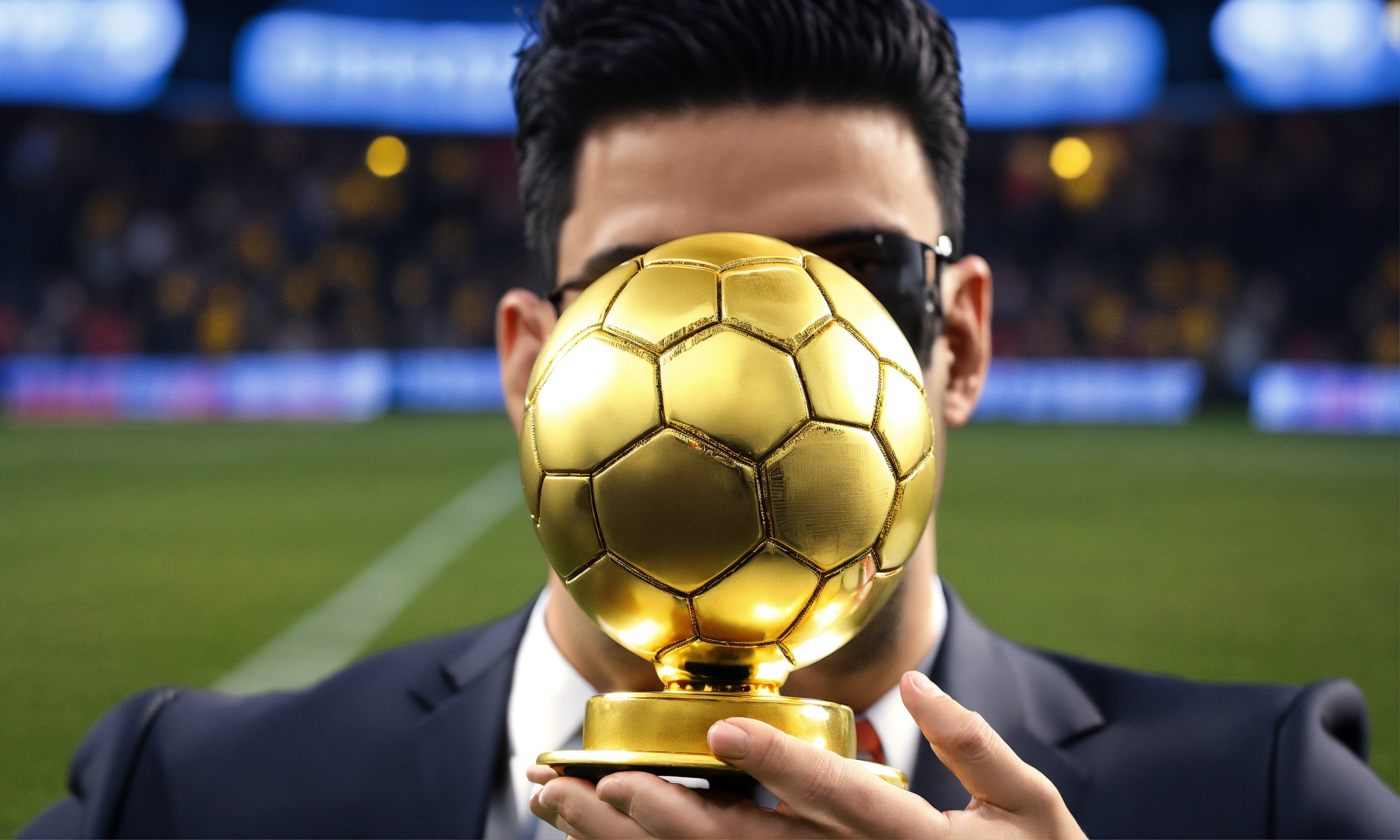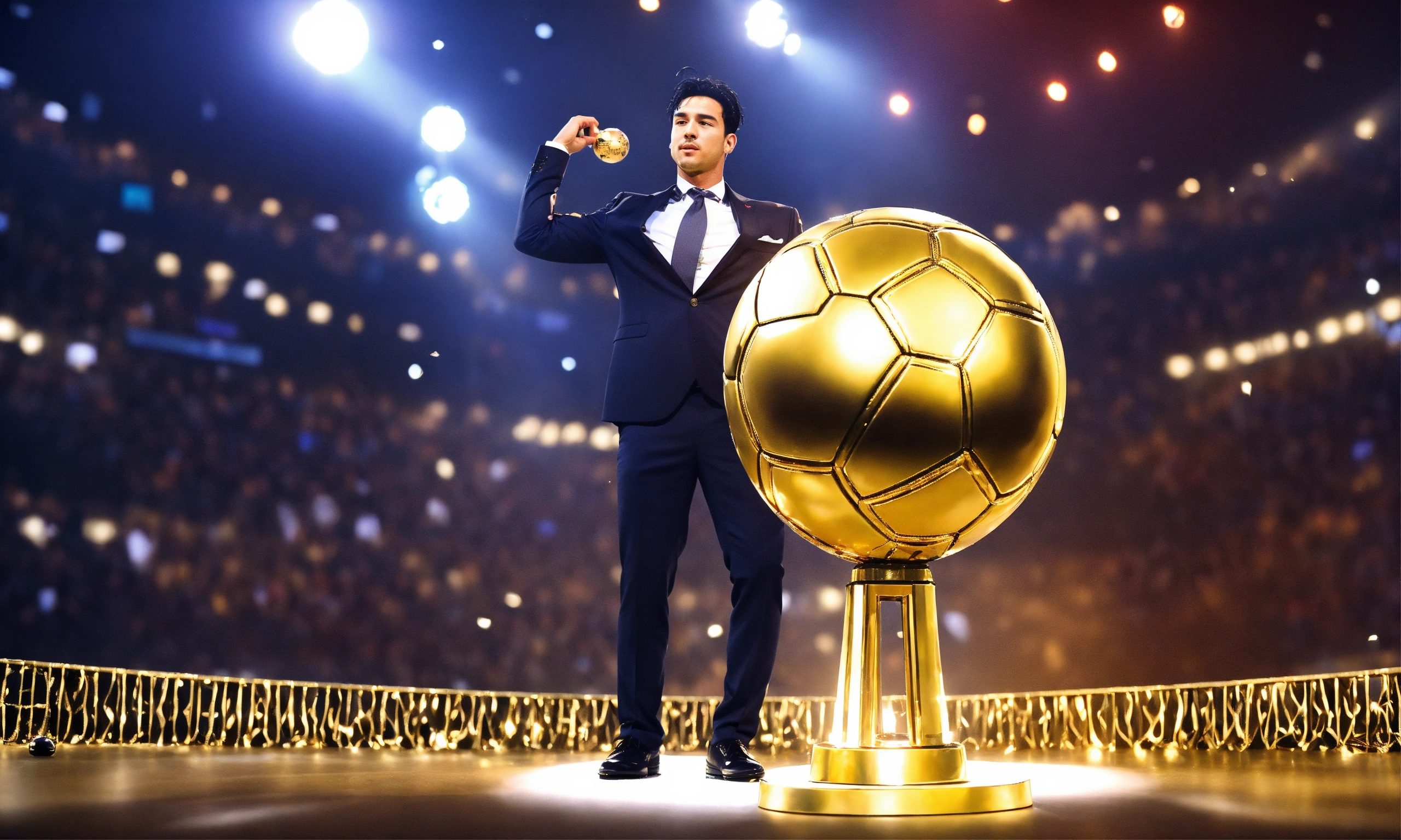 Awarding the golden ball to the best football player, on stage, half of the body is visible, a cute man in a suit, black hair, man