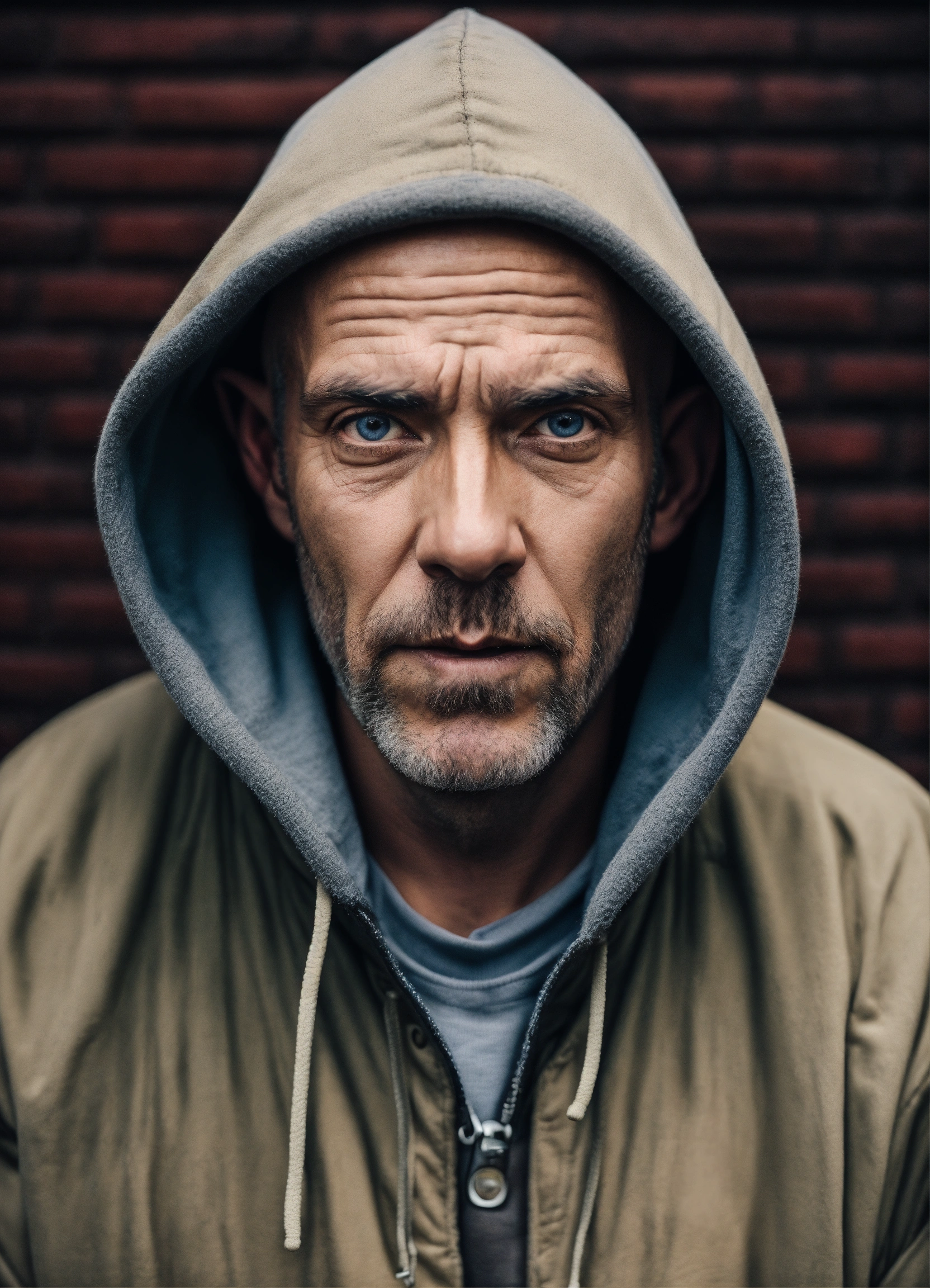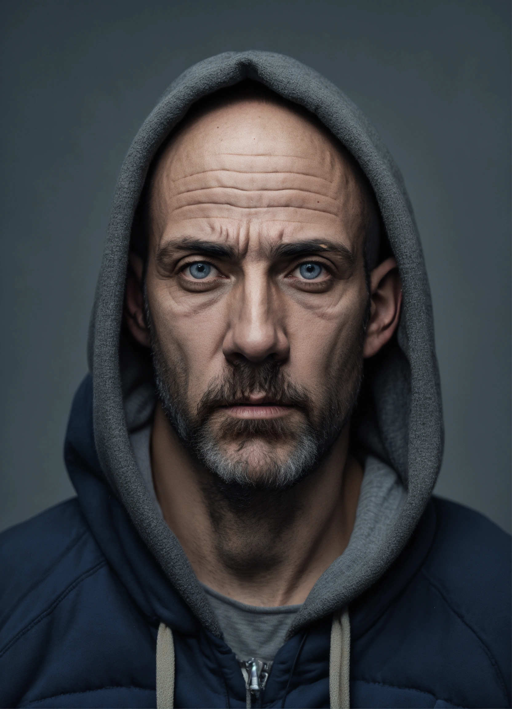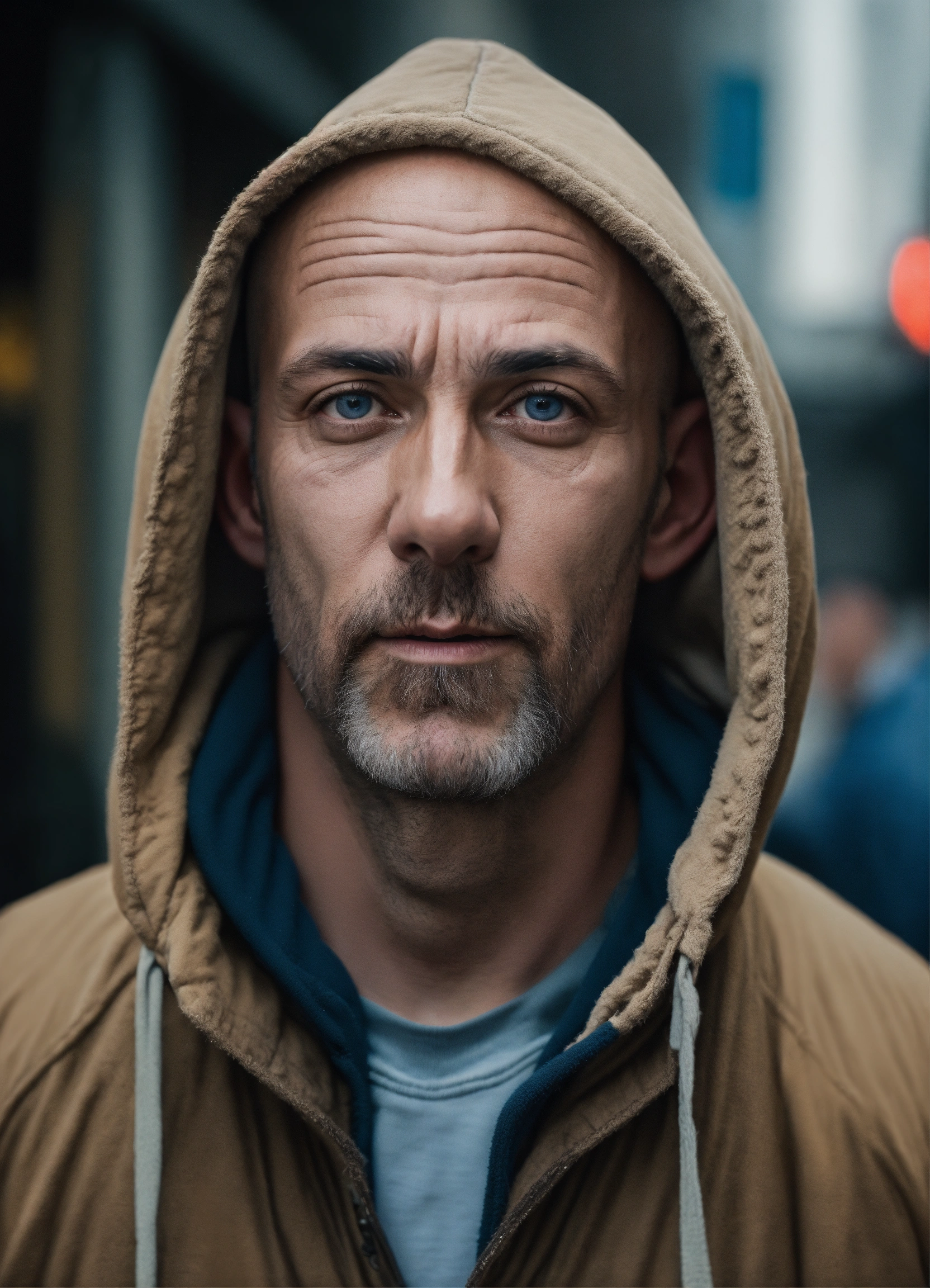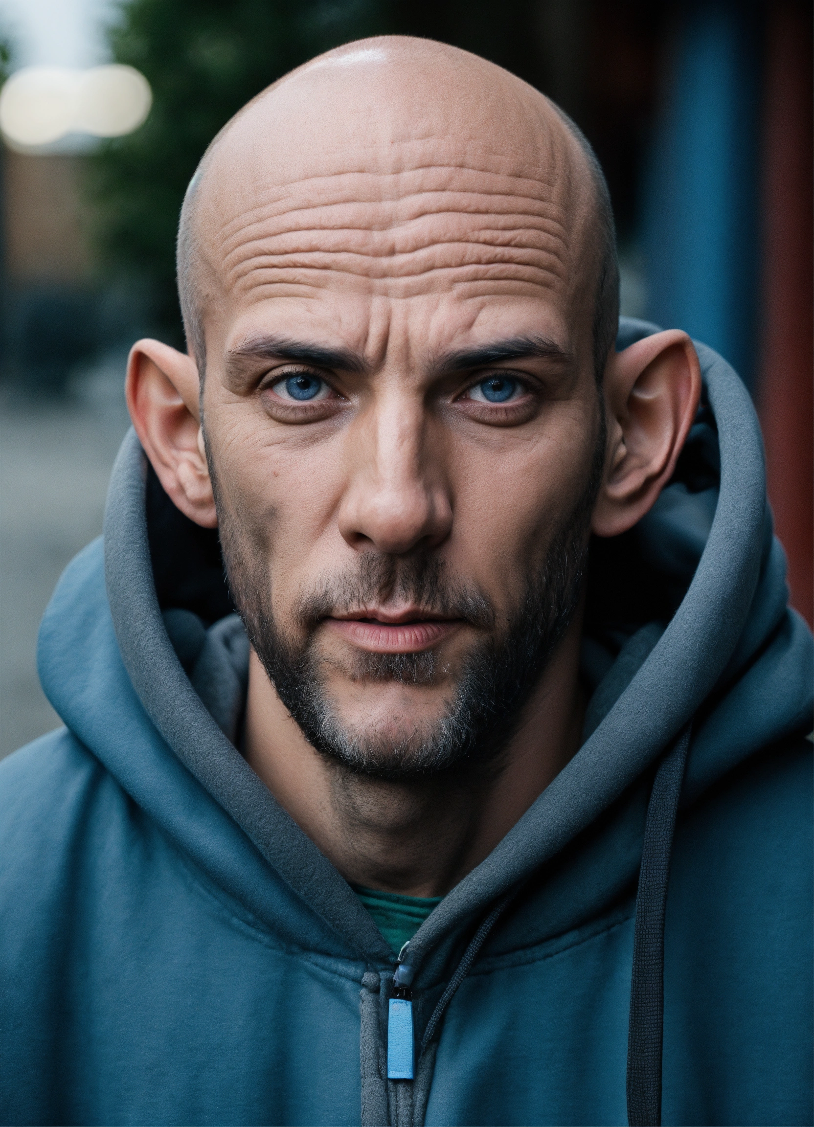 A huge bald homeless man, extended protruding brow forehead, blue-grey eyes, crooked mouth, large ears, wearing a hoodie up over his head