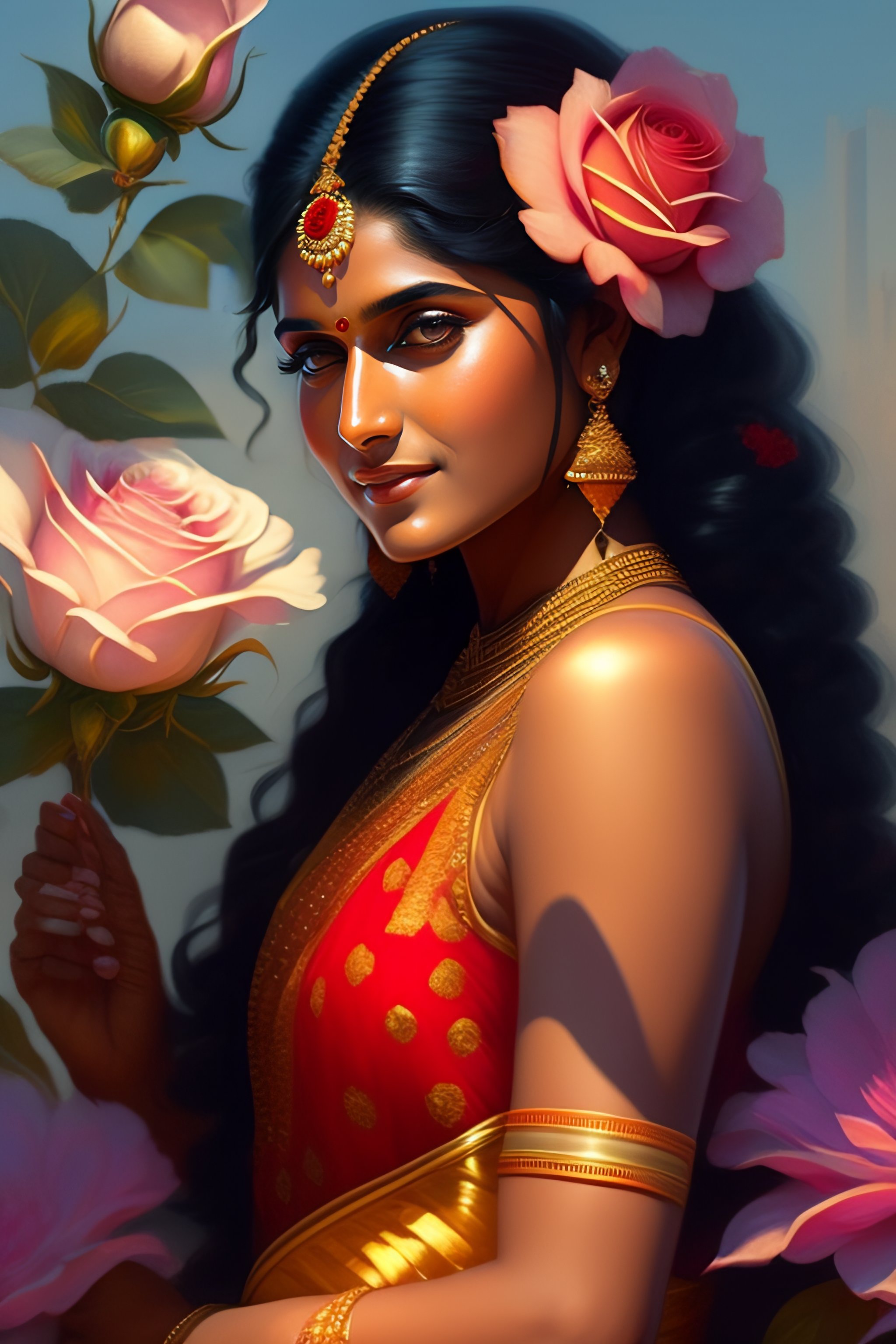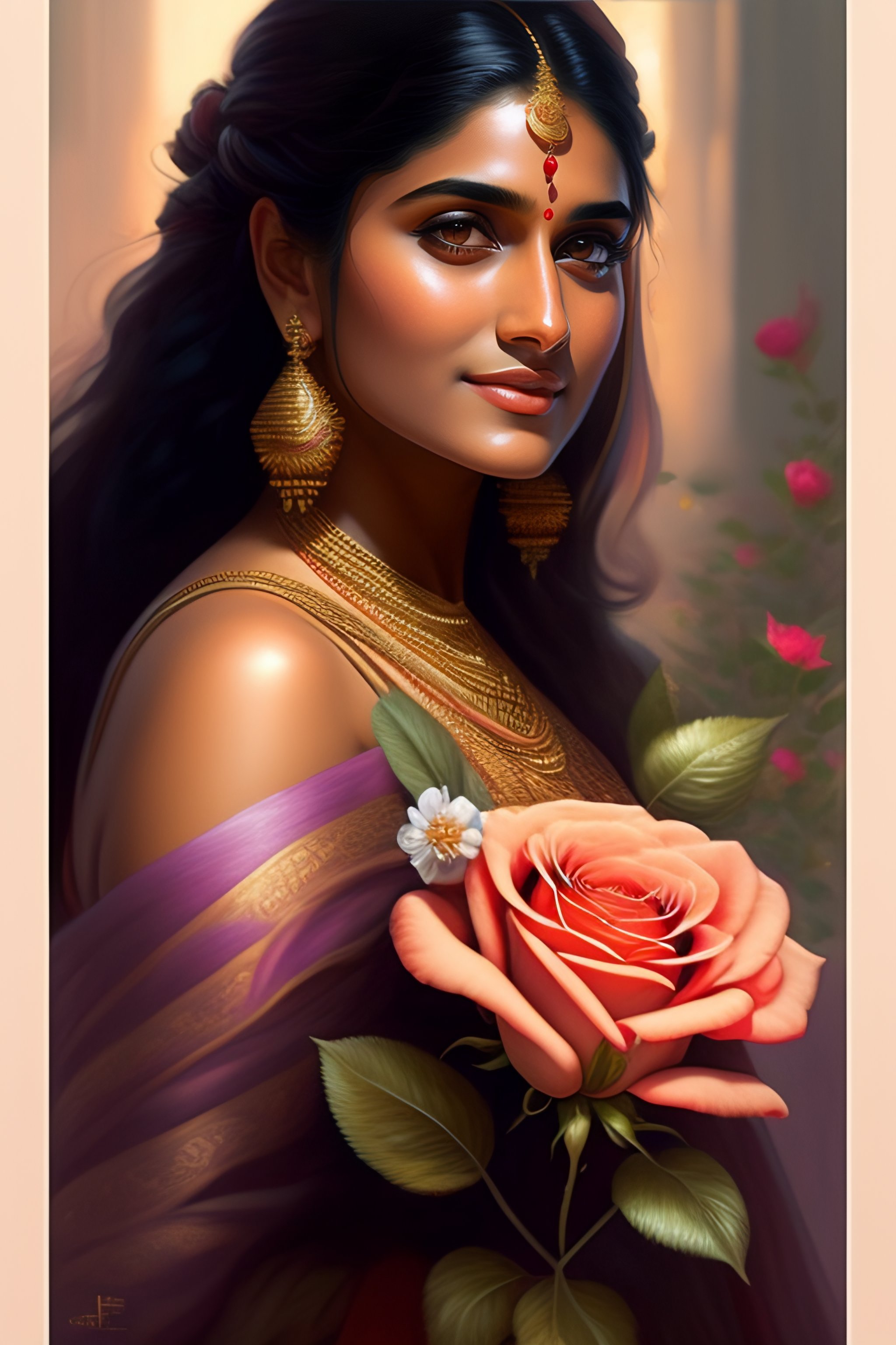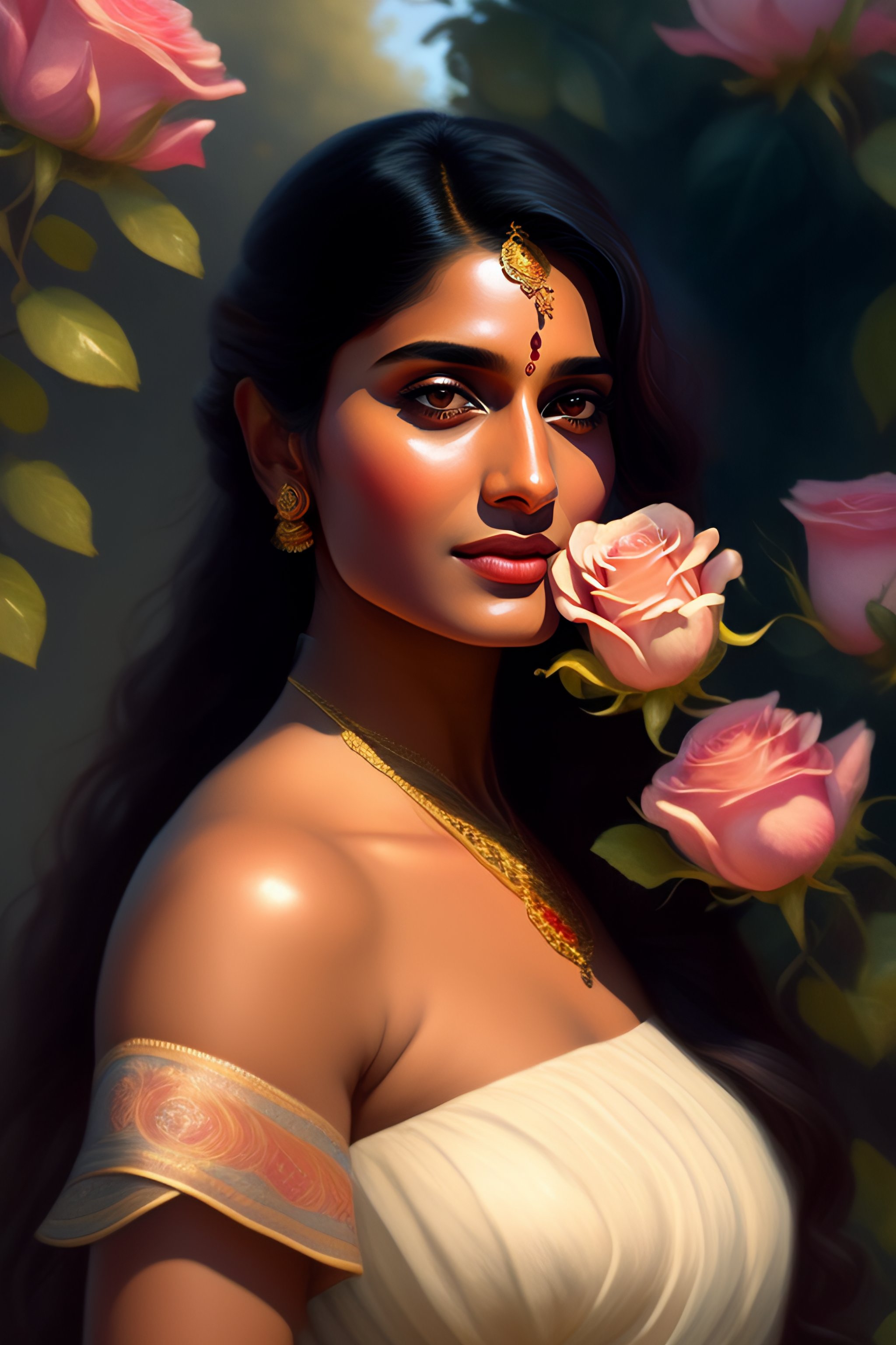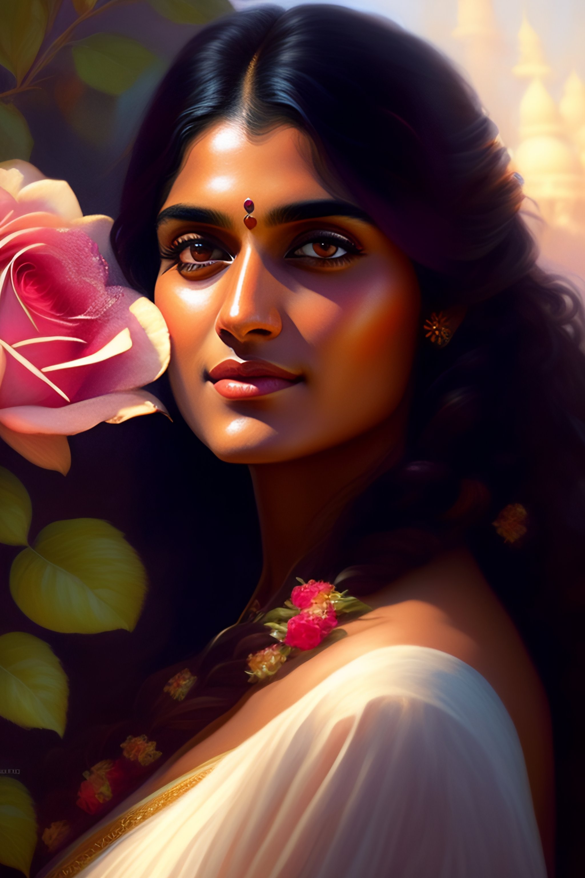 Indian actress niveda thomas, smelling a flower, roses everywhere, highly detailed, digital painting, artstation, concept art, smooth, sharp focus, illustration, art by artgerm and greg rutkowski and alphonse mucha