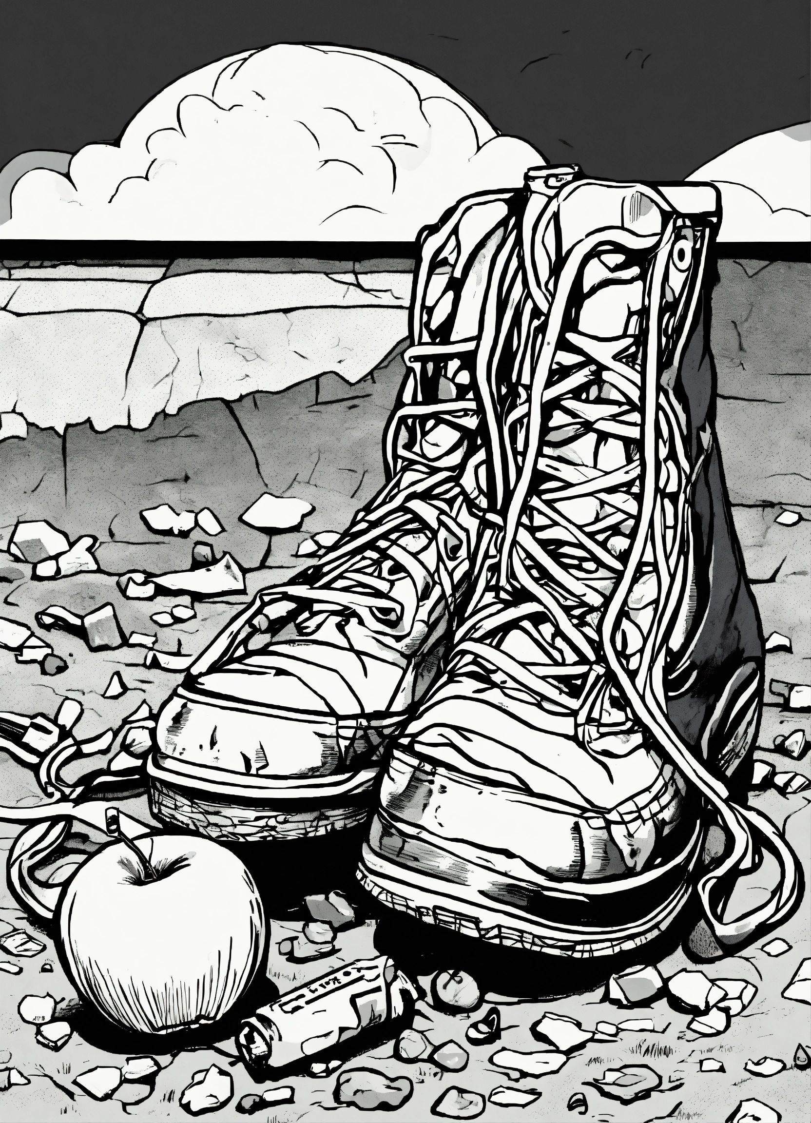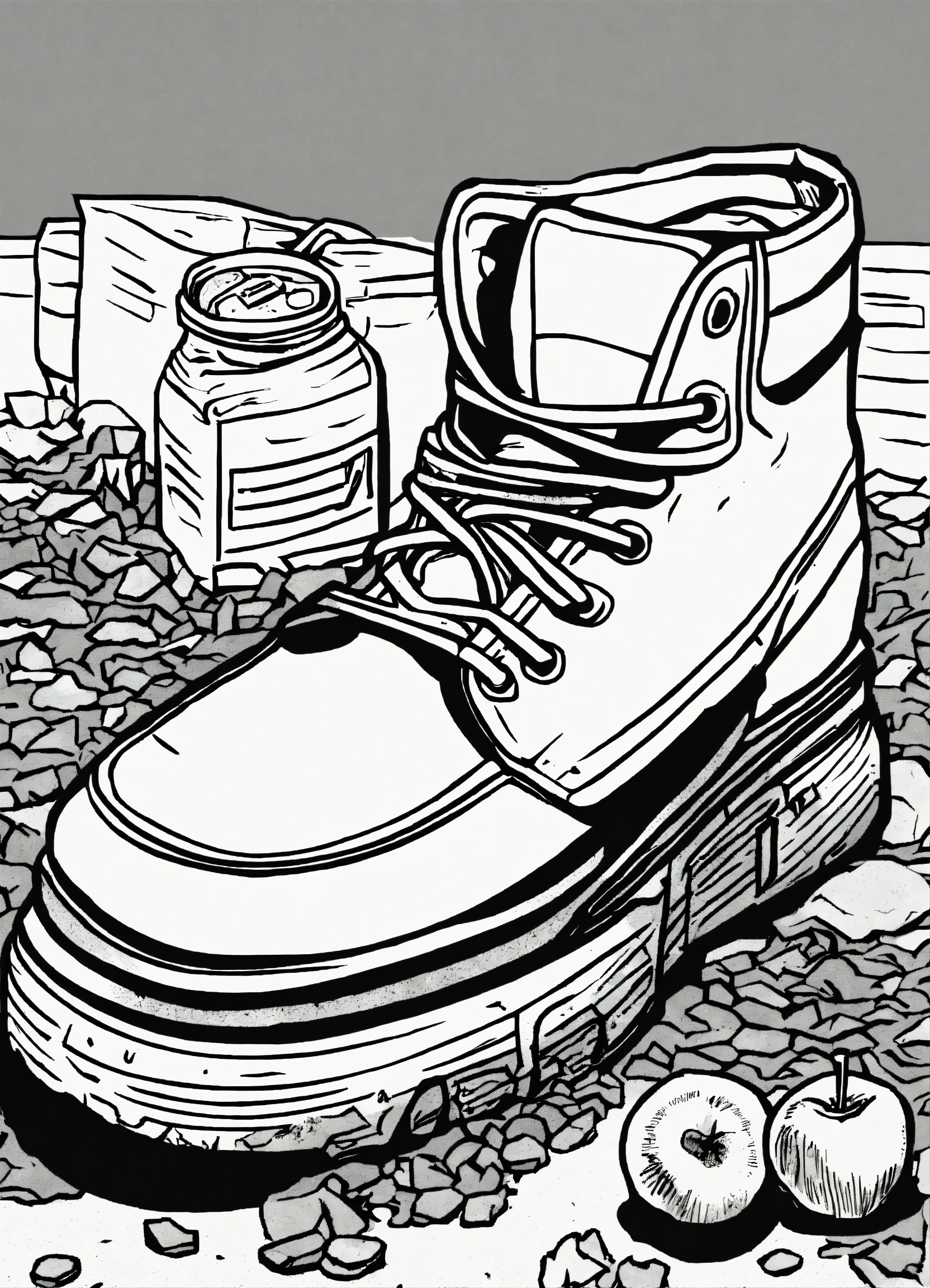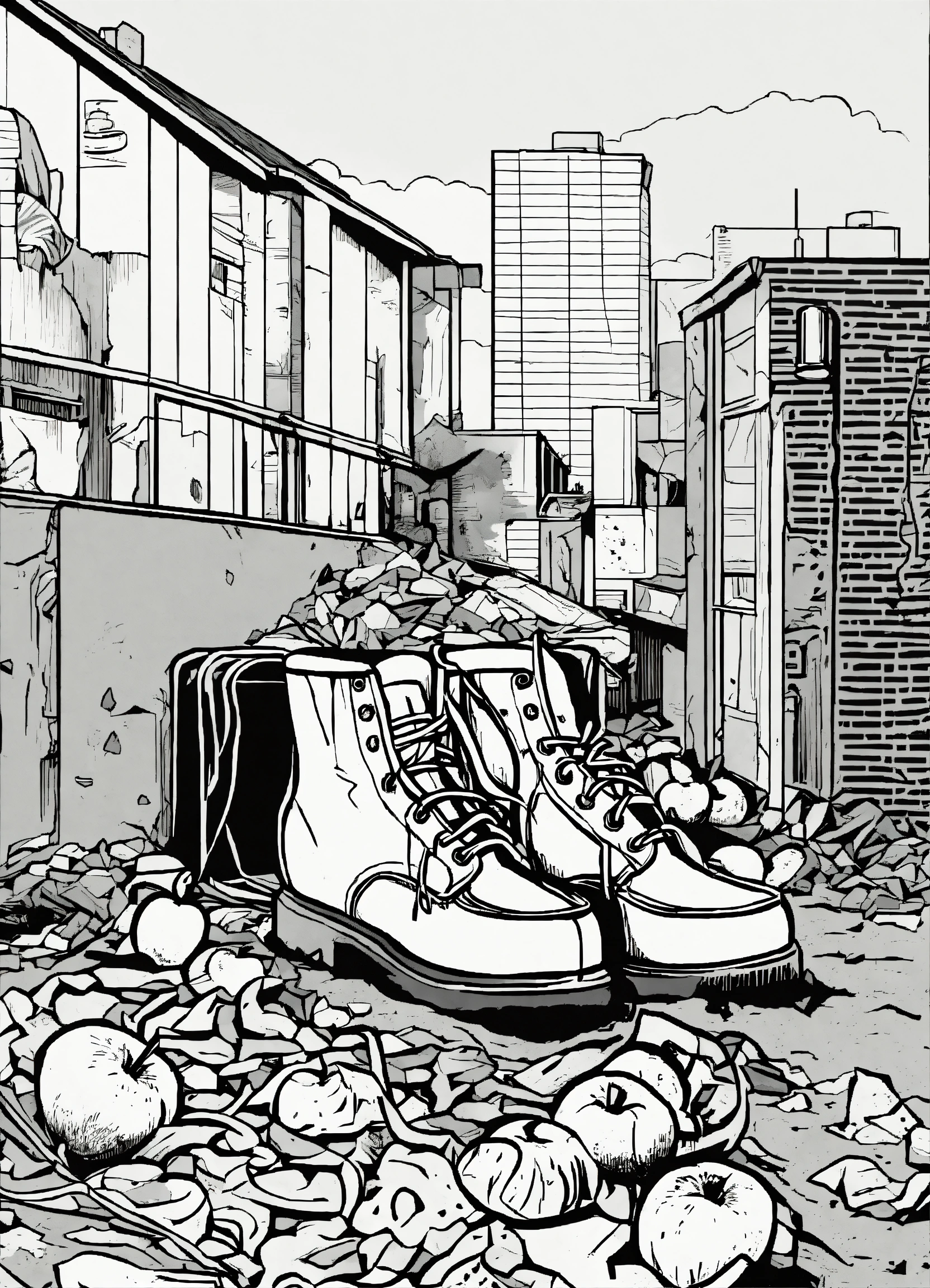 Rough, coarse, crude, vector, line art, oy lichtenstein comix illustration style, pen and ink, tin tin comic, black and white, waten apples, an abandoned shoe, a can of coke, plastic bag, broken socks, in gully
