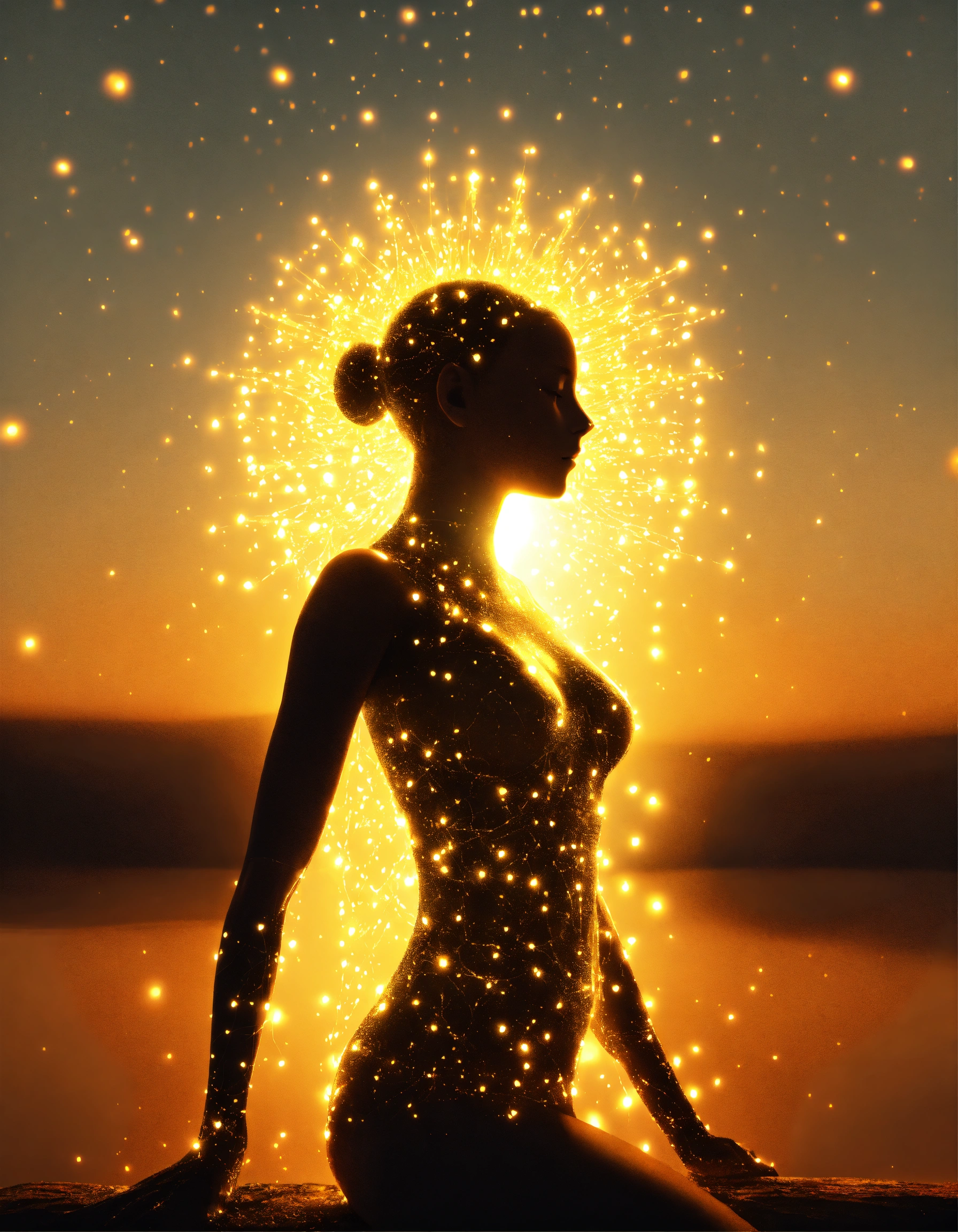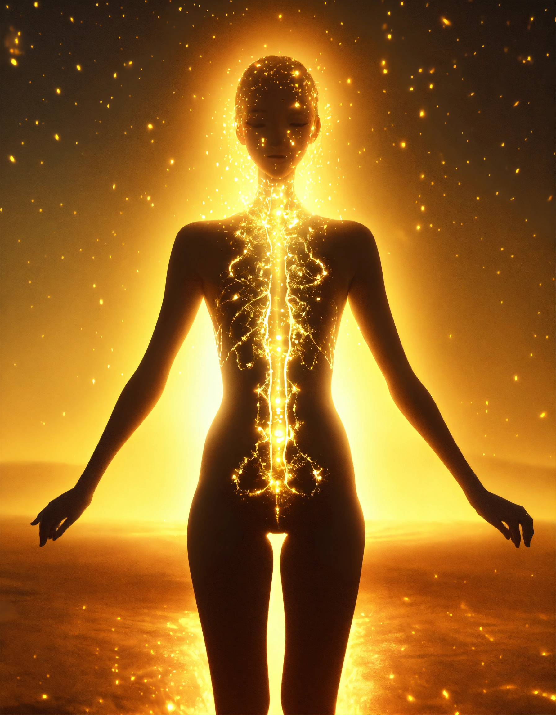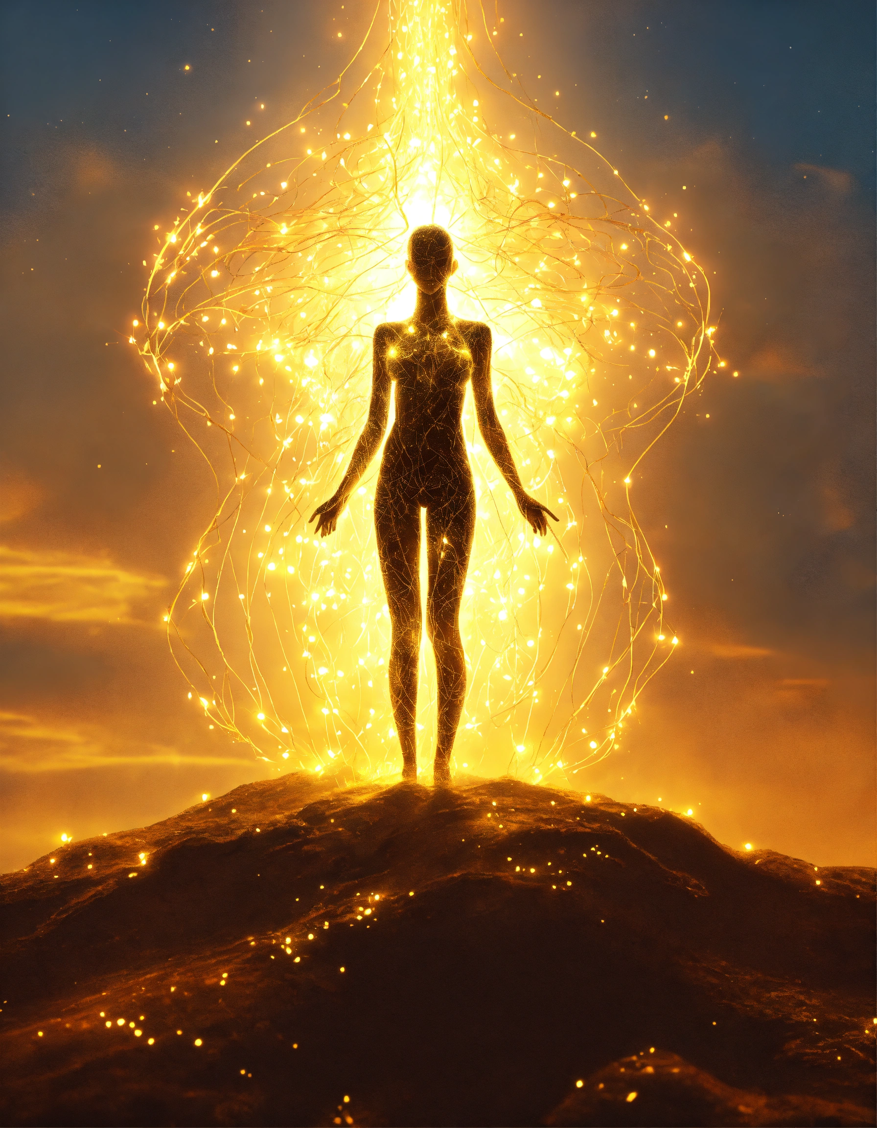 Paint drawing illustration of a female human silhouette with several clasps of light emitting from her body, root-shaped lights coming out of her body, golden aura around the silhouette, background sky, 4k, full hd, 3d
