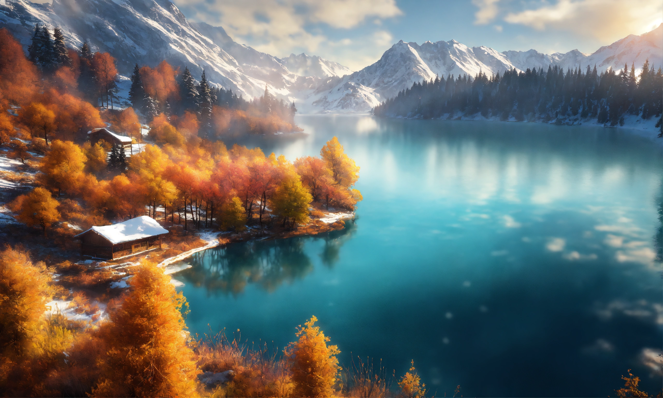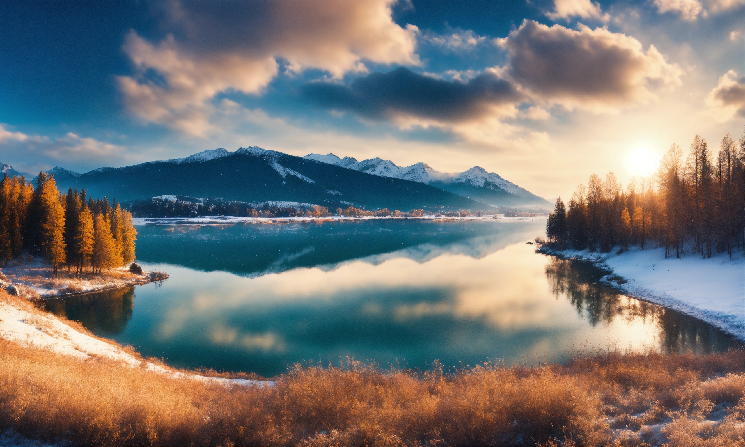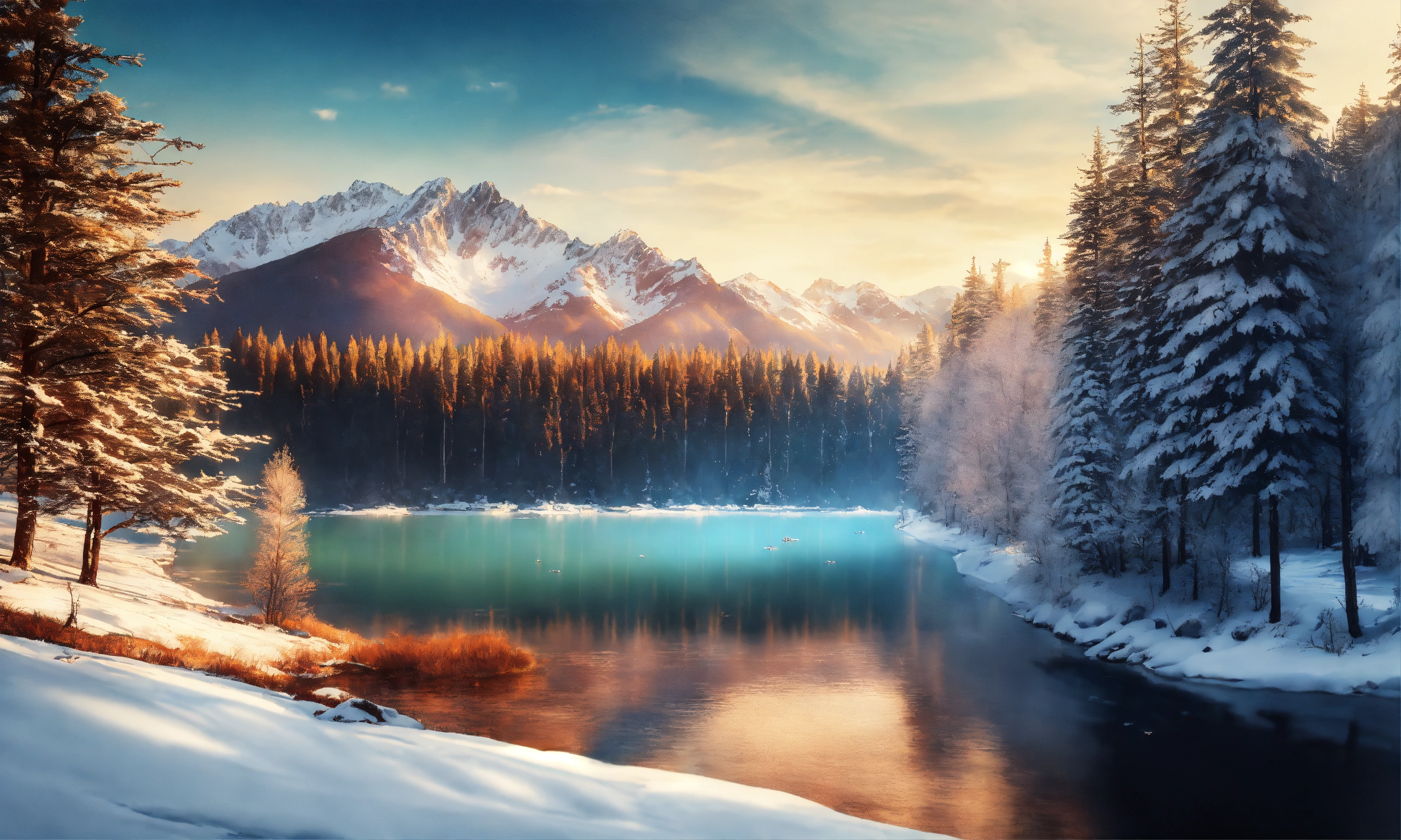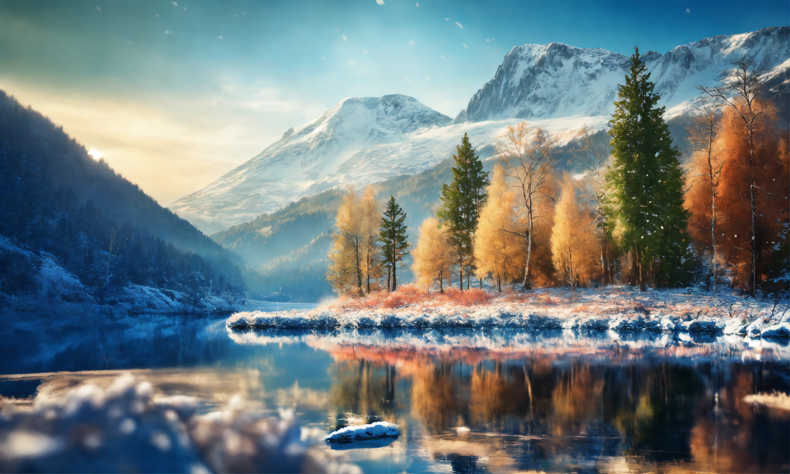 Pretty mountain view with trees and lake in winter season. creative dynamic composition varies the angle. macro natural photography, taken by an expensive, very high-tech camera. eye-catching, enticing and captivating. photo product, ideal for poster promotion. 8k, hd quality, ultra realistic, hyper detailed. original idea taken from a different angle.