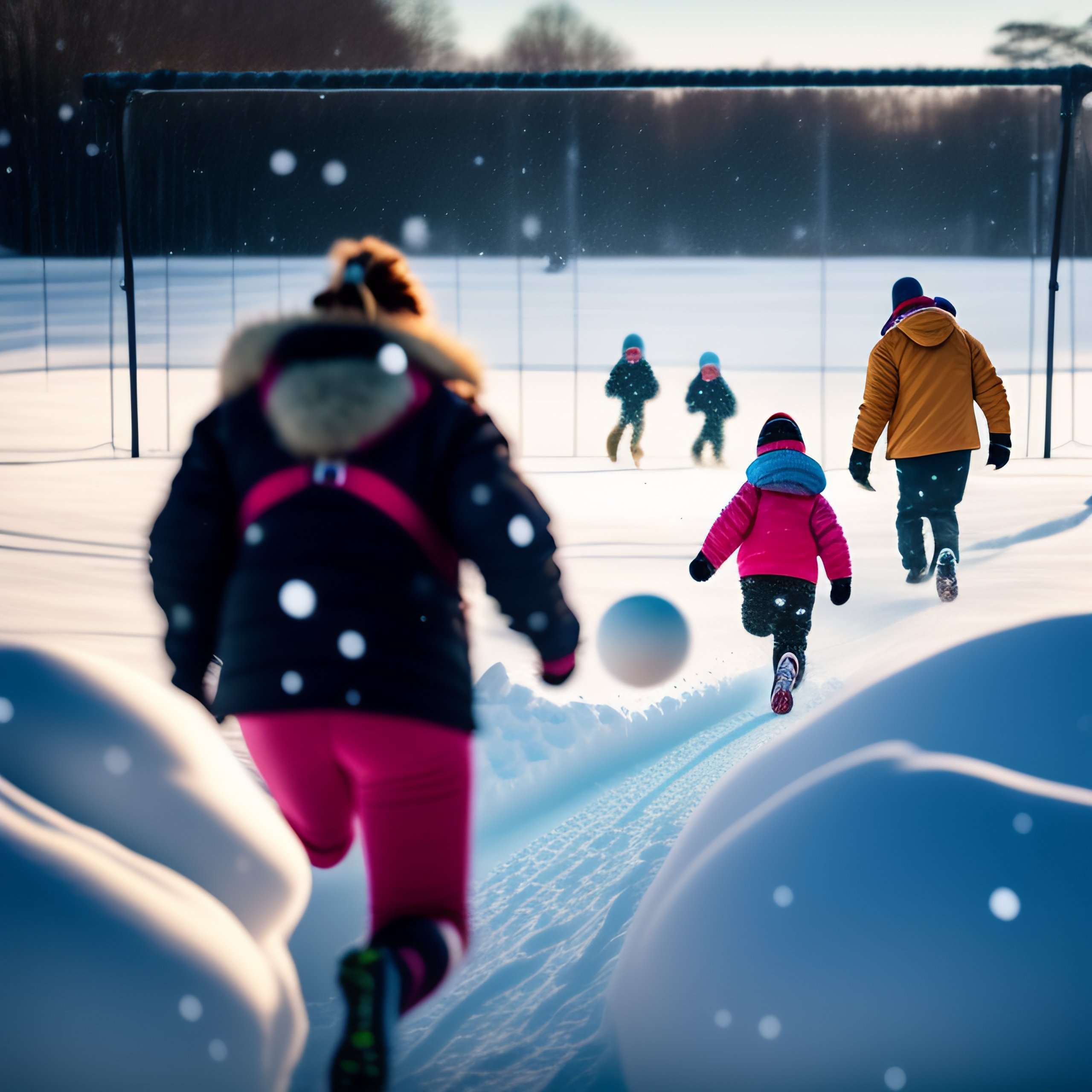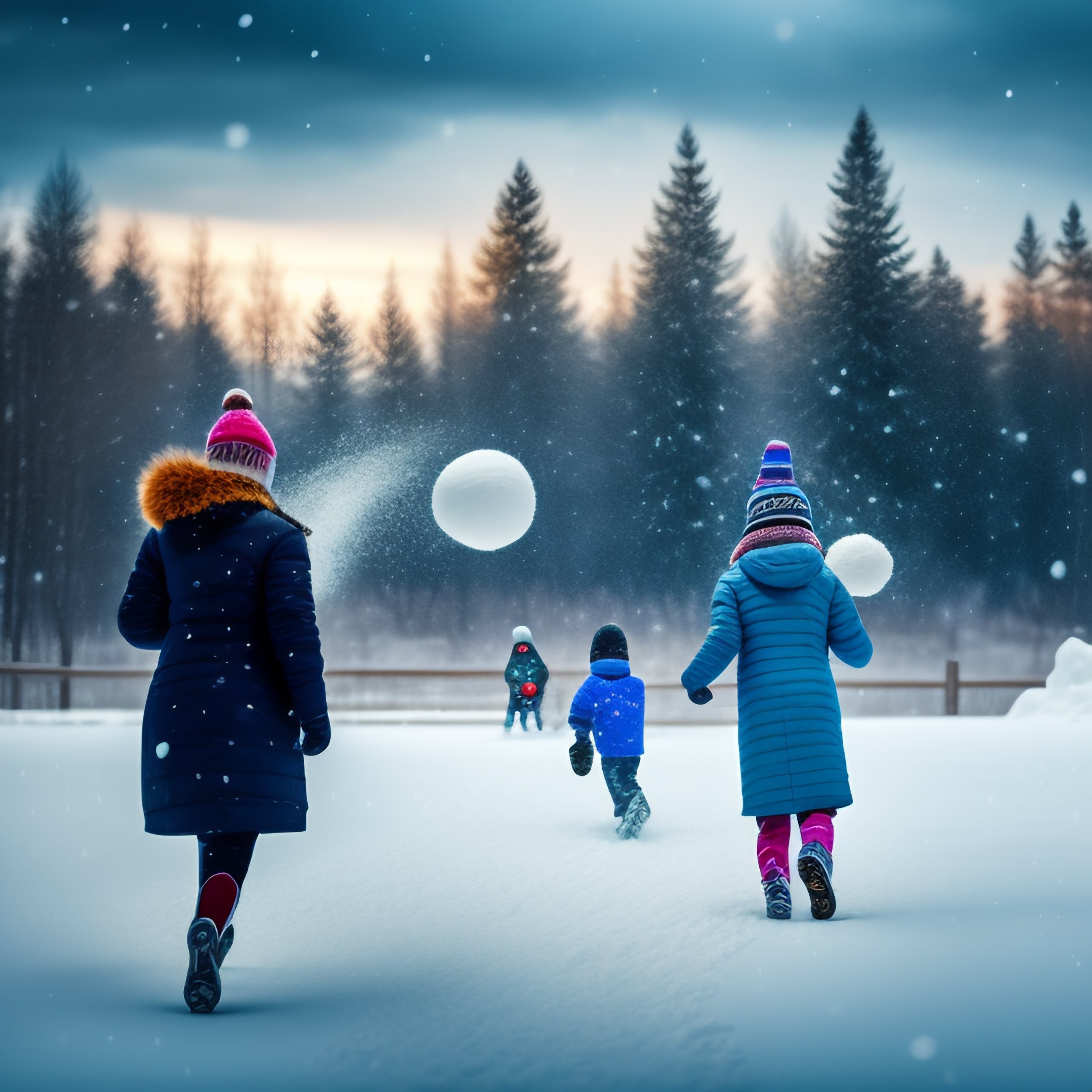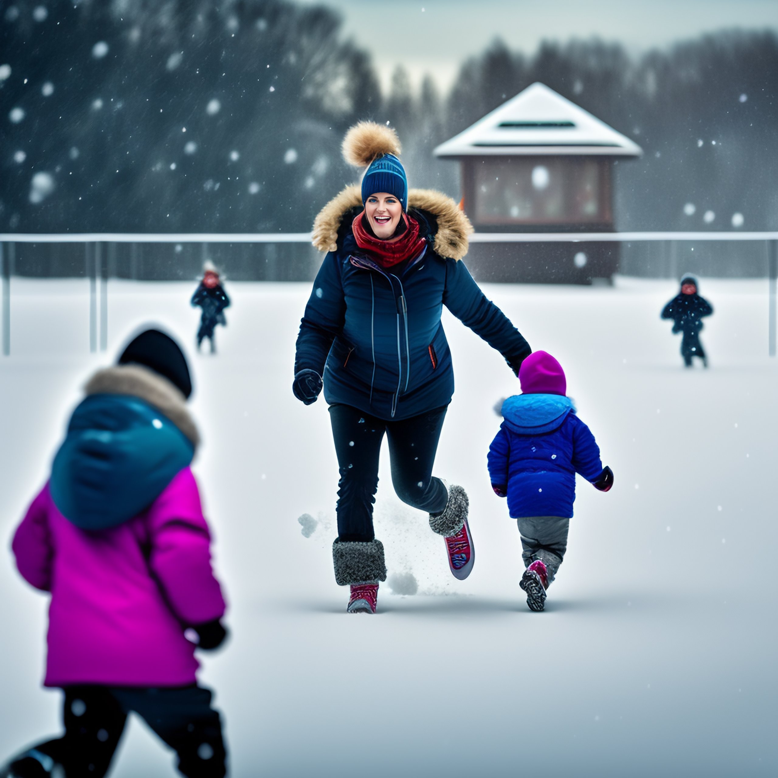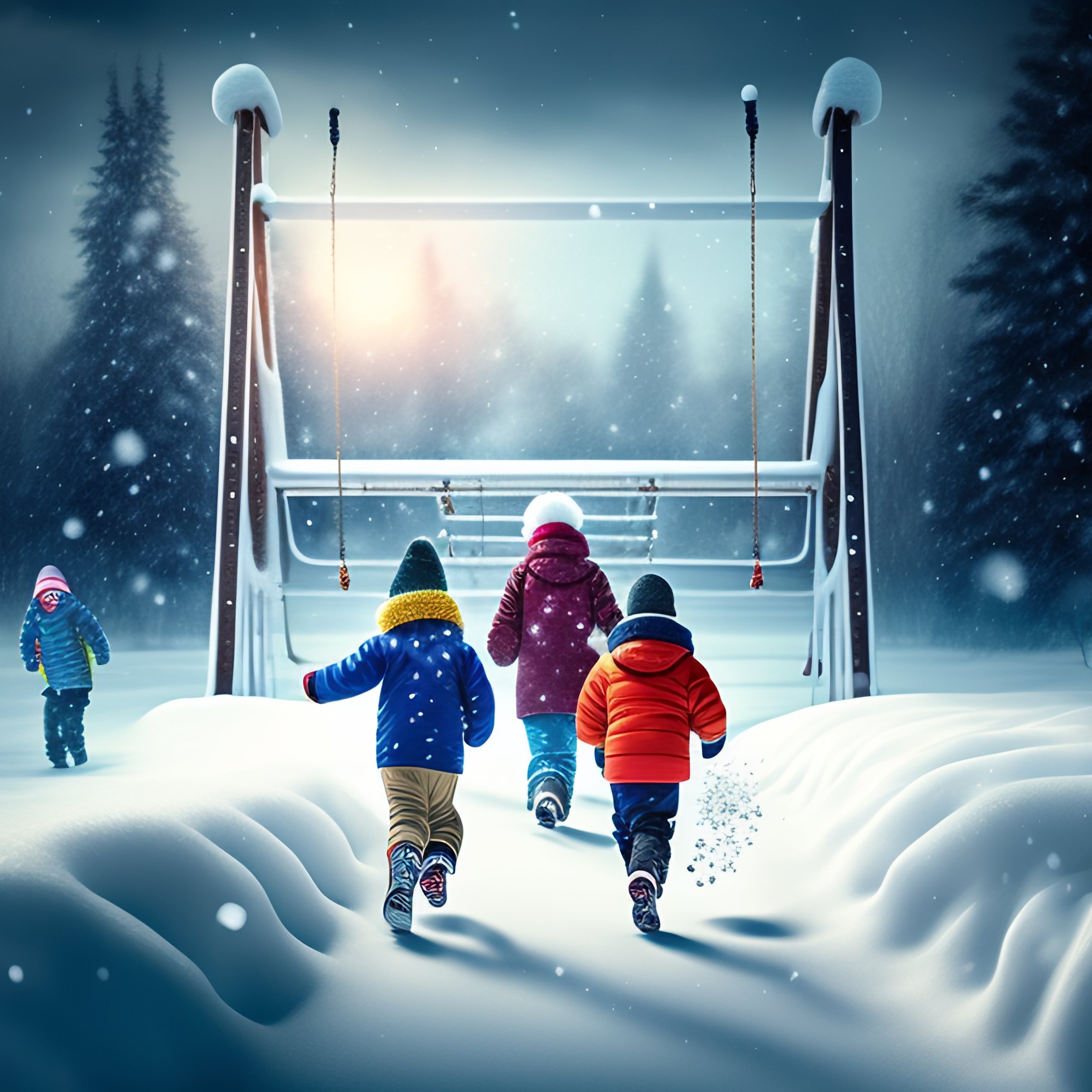 A woman throwing snowballs at 3 kids running by a swing set in the winter, midjourney, throwing snowballs, snowballs are being thrown, snow storm