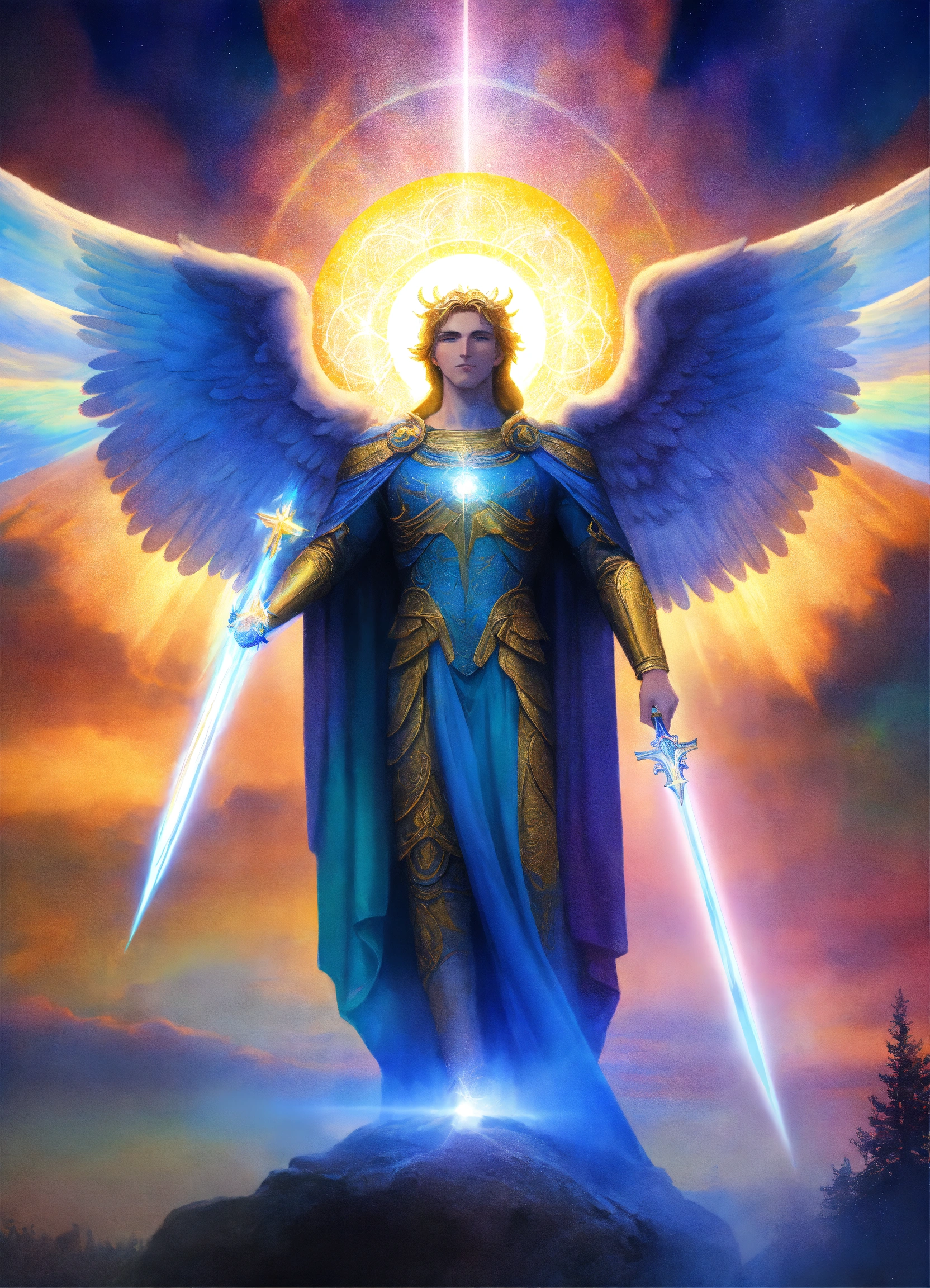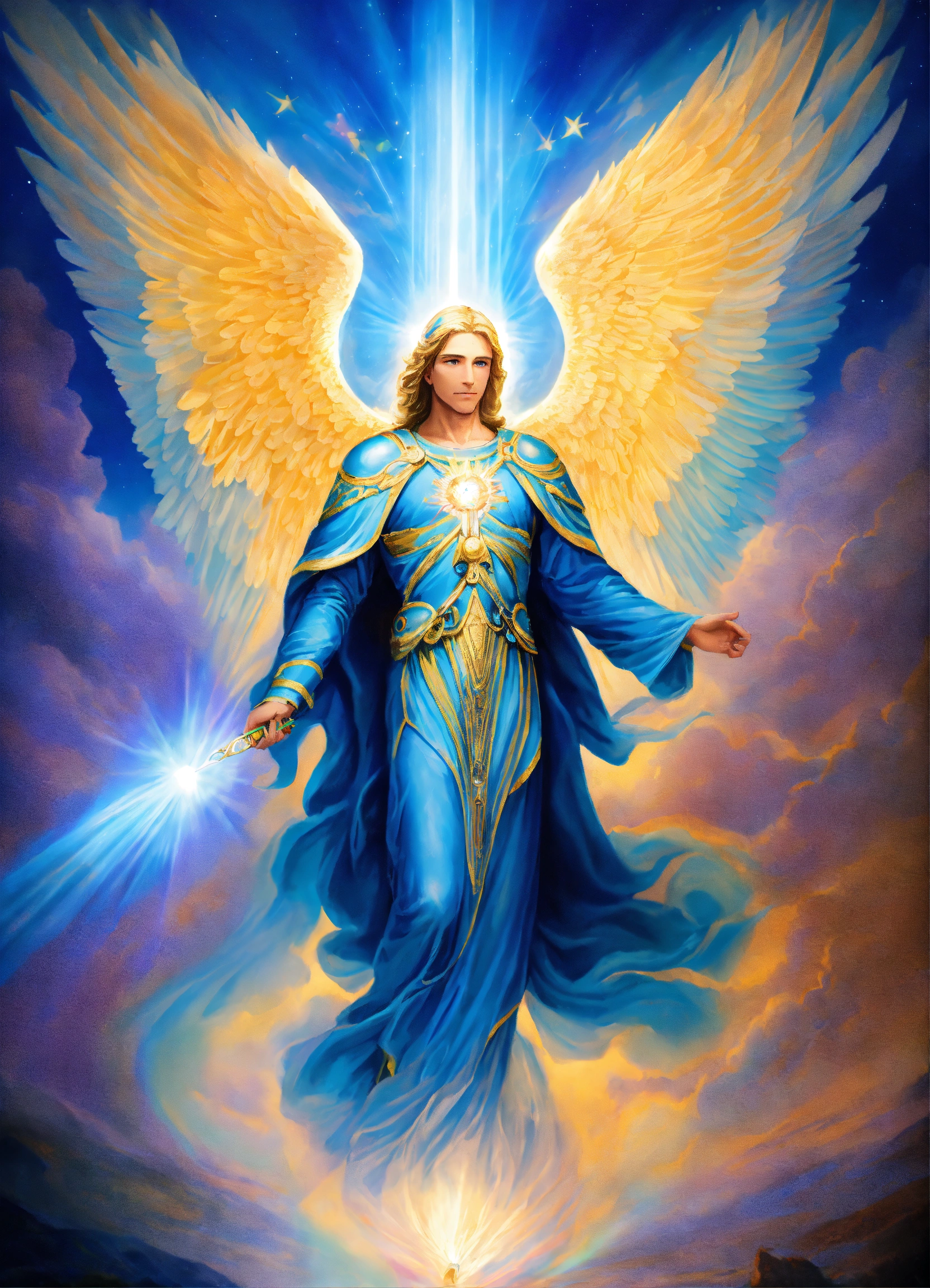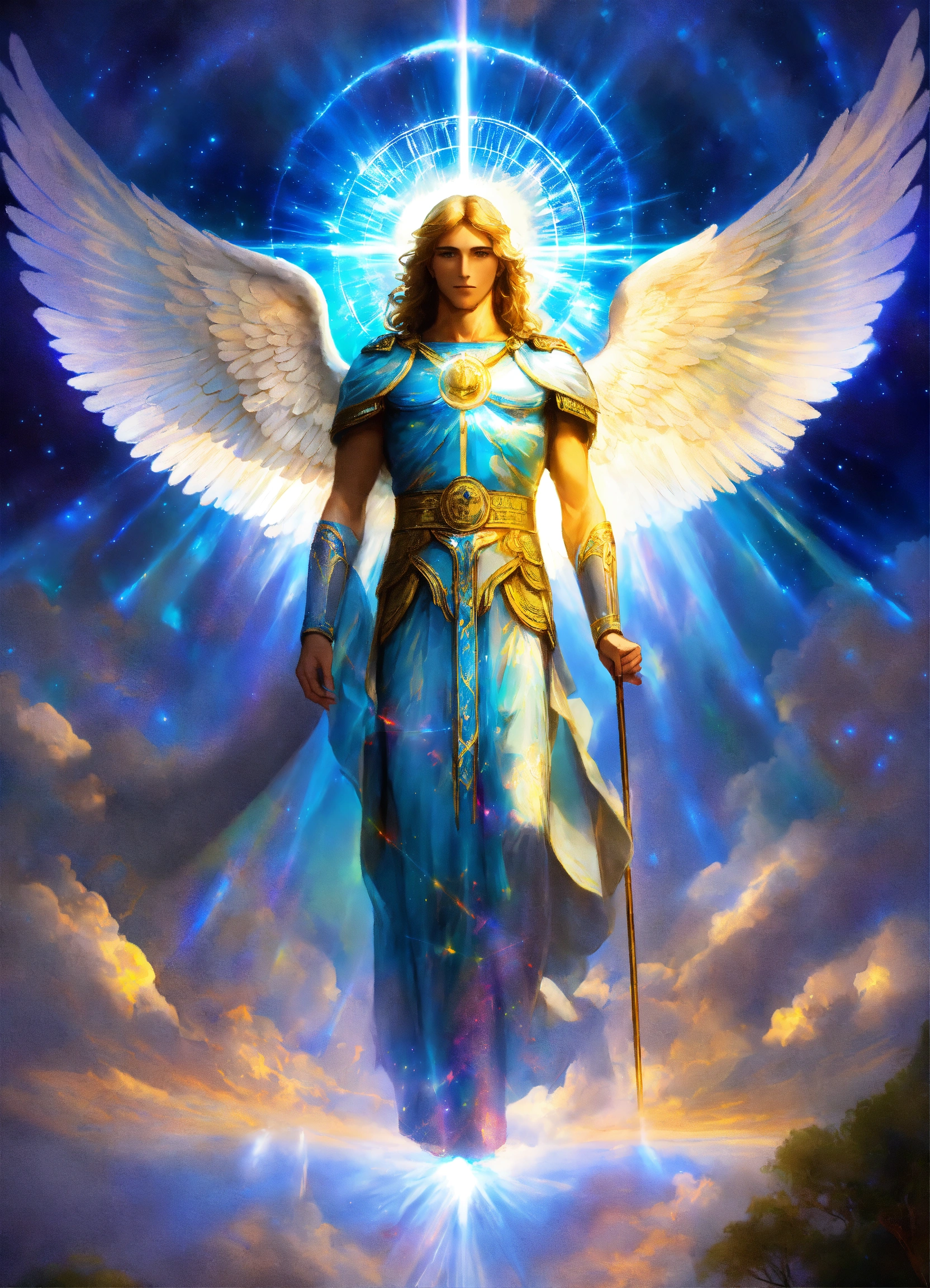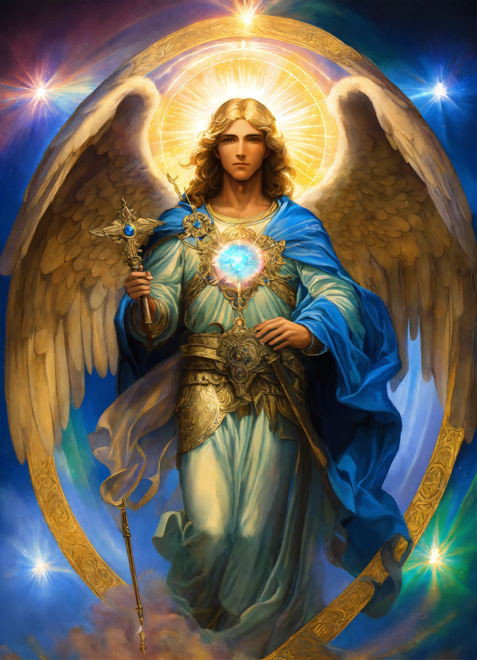 Archangel michael with an elderly visage, mystical presence, prismatic aurora lights, blue beams, encircled by seraphim.