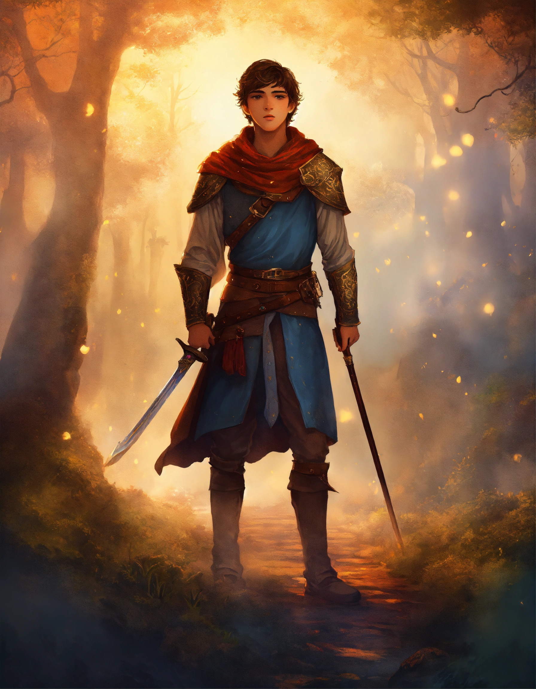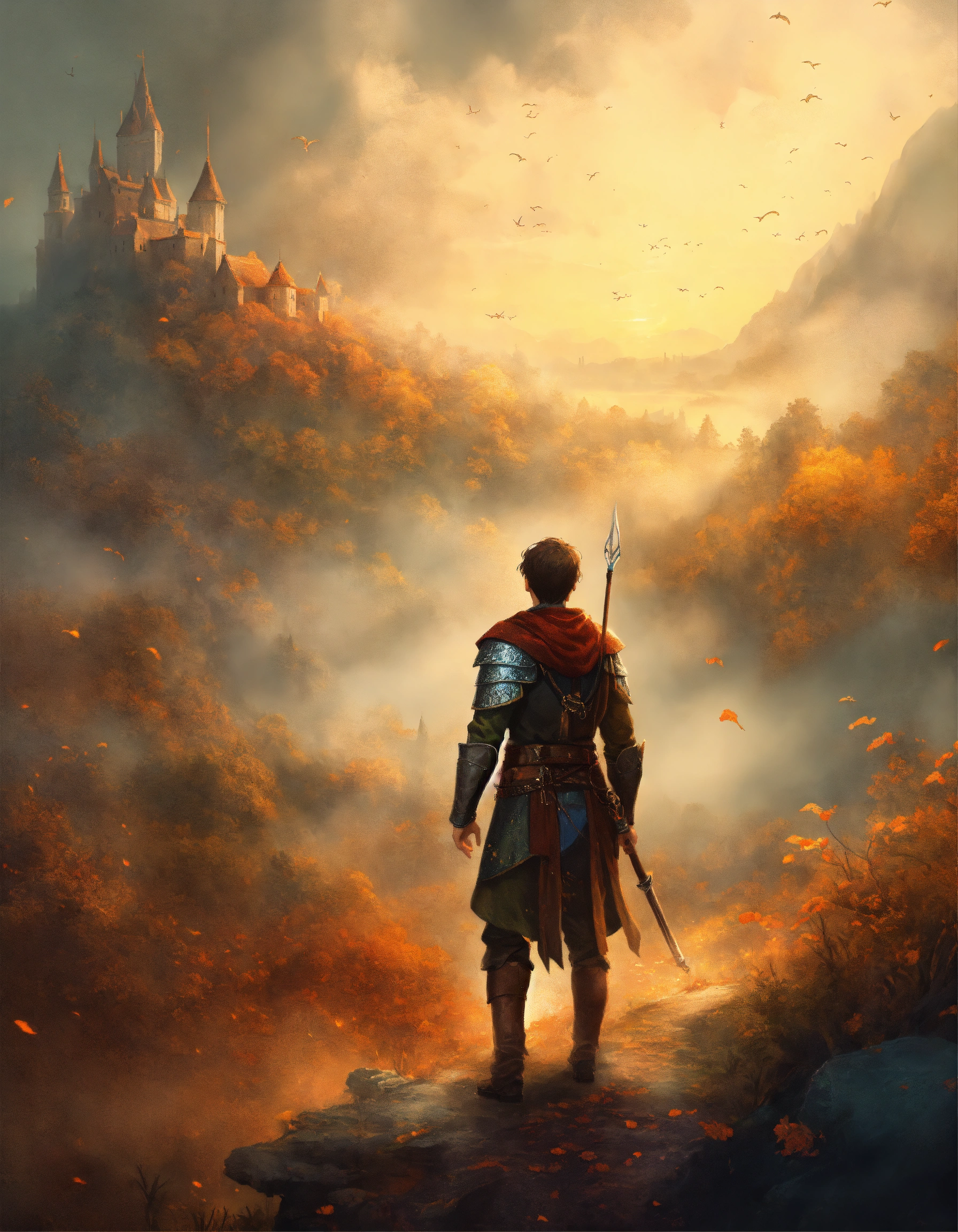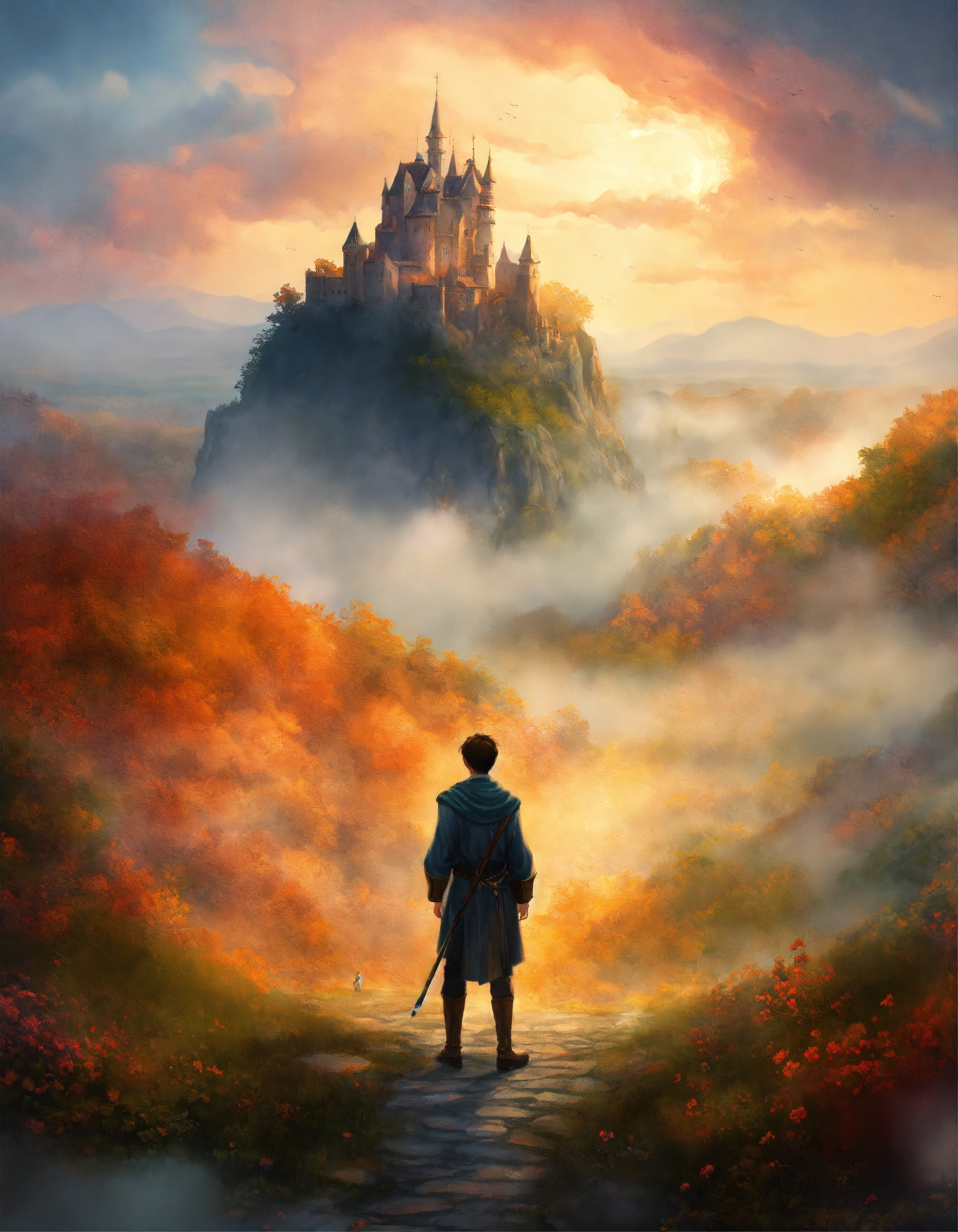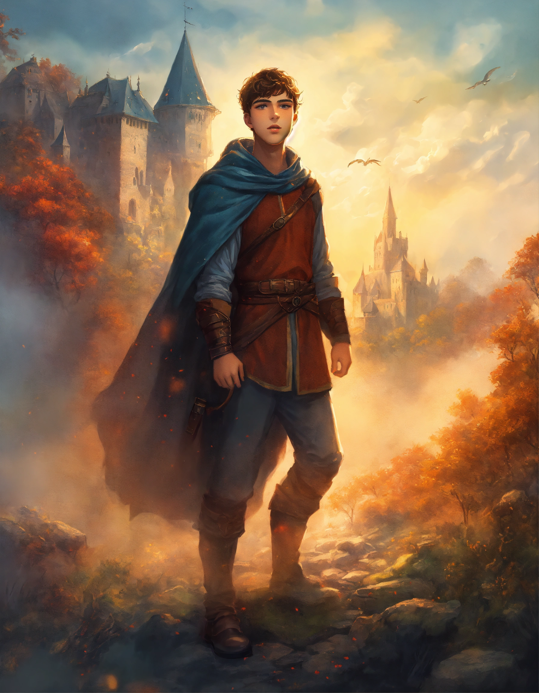 Create a beautiful cover illustrated paint, drawing paint a a 15 years old young man standing surrounded by fogs, epic adventure, fantasy background design with effects, illustrated paint art, paint art, cartoon illustration, daylight, medieval, epic fantasy, surrounded by fogs, medieval, detailed face