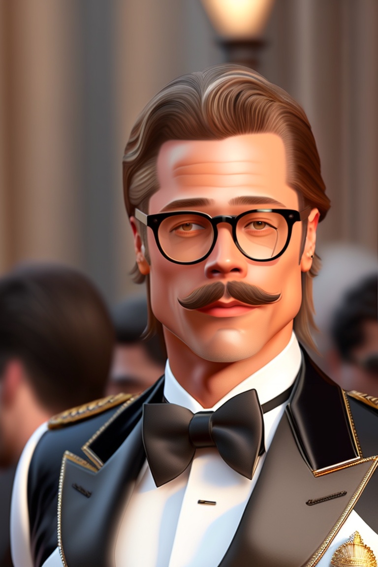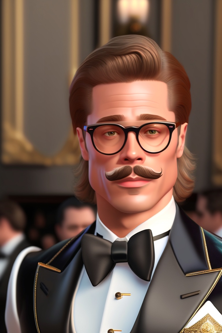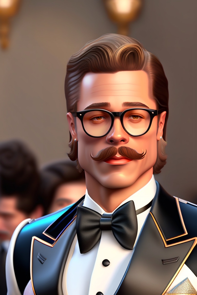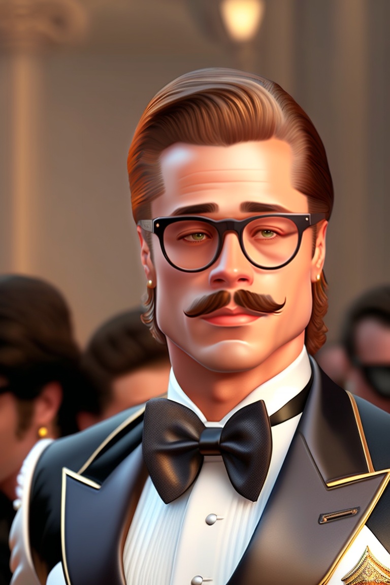Brad pitt from inglorious bastards dress in white tuxedo with black bow tie, mustache, glasses, photorealistic