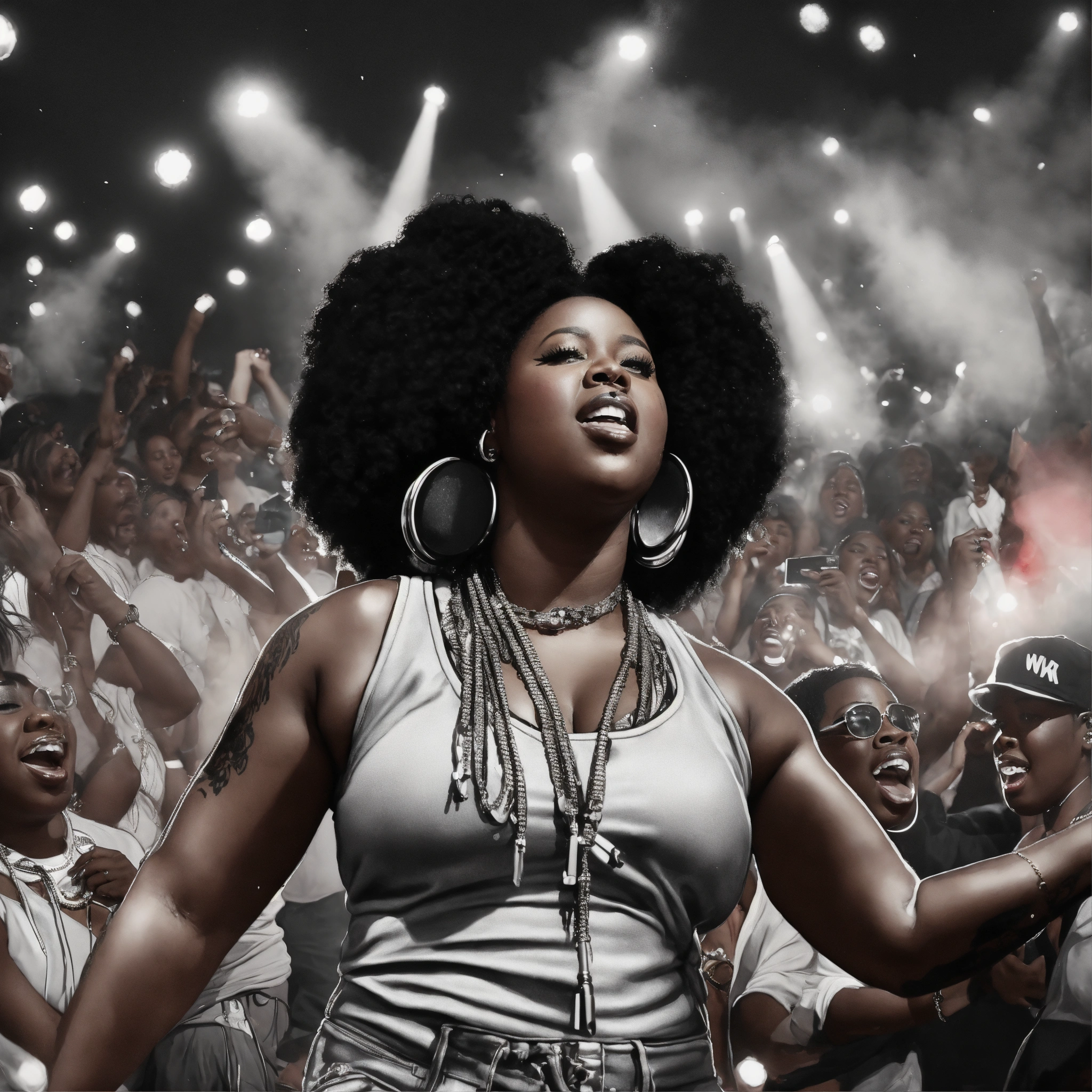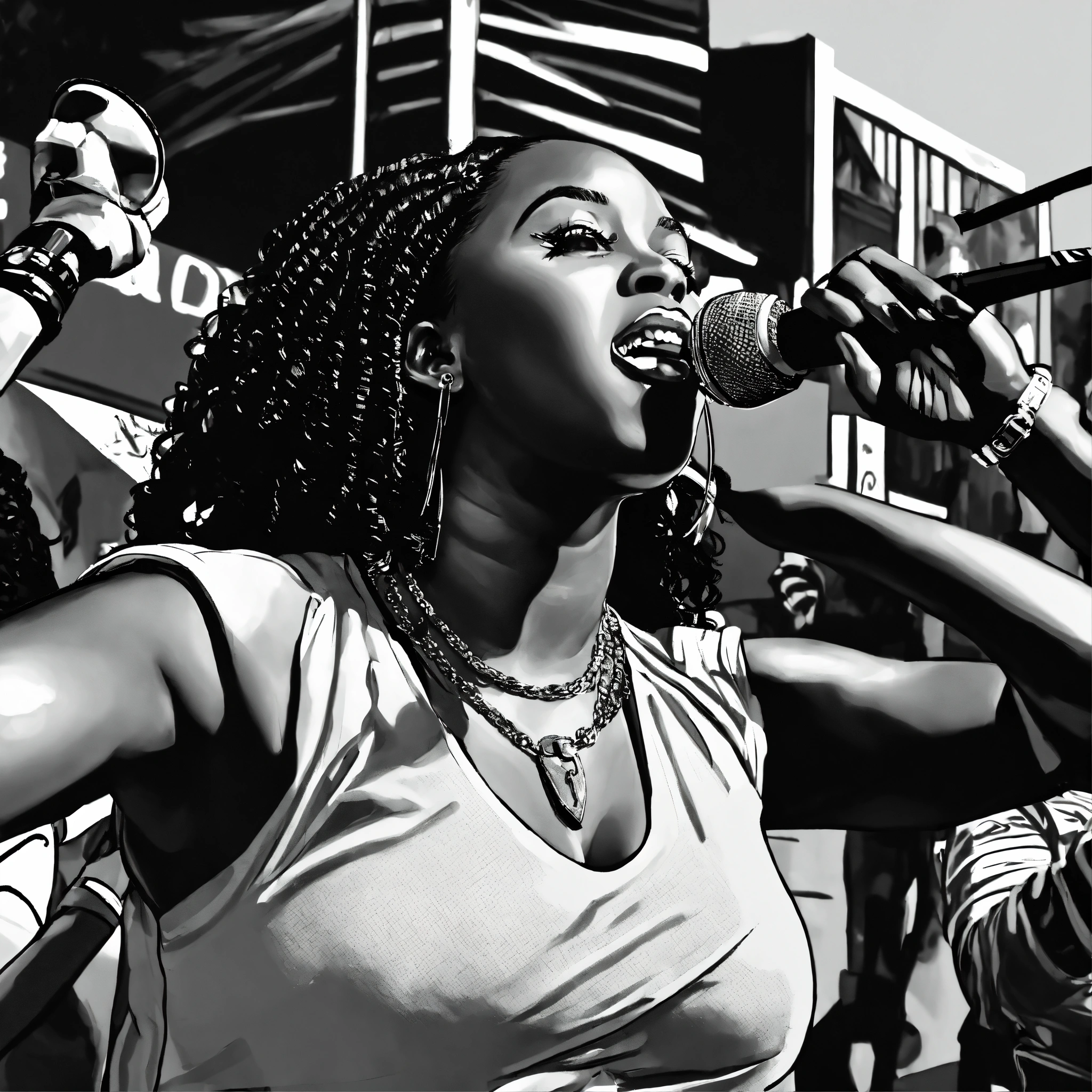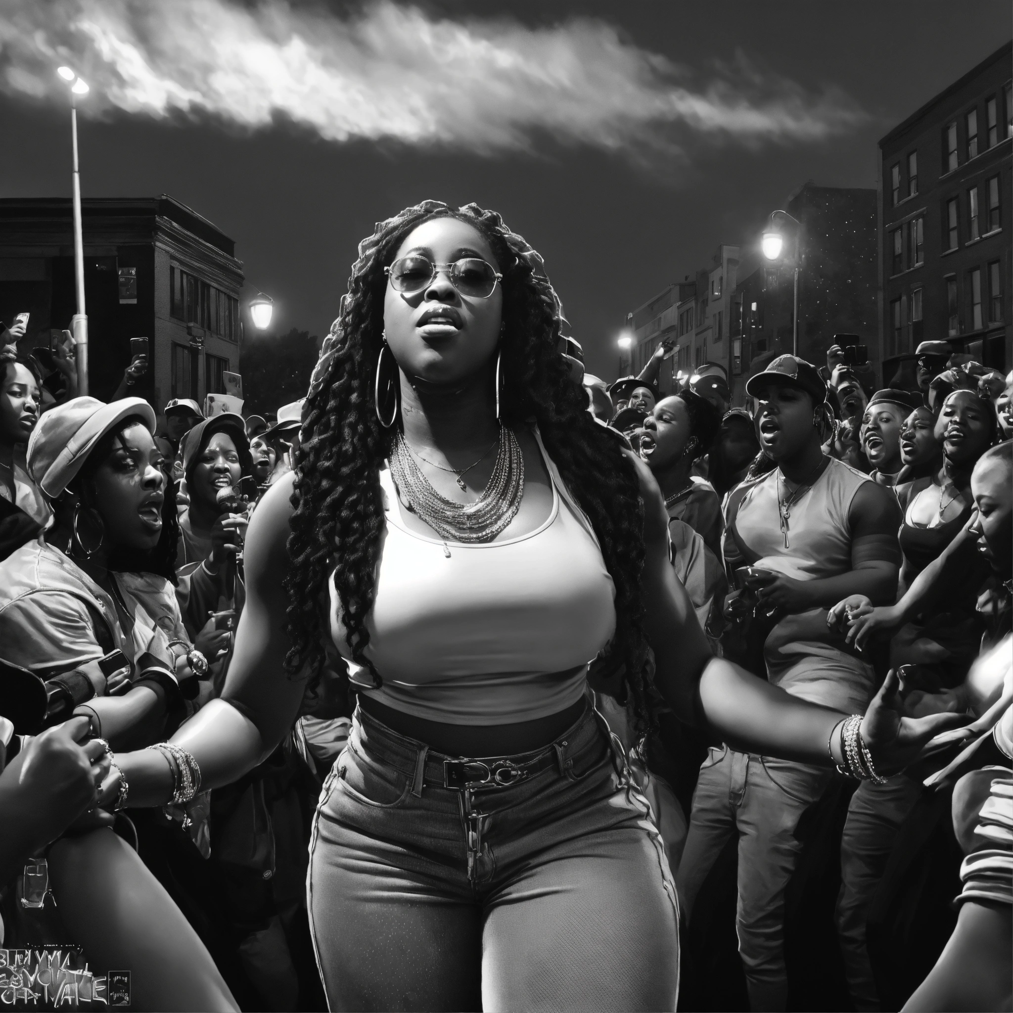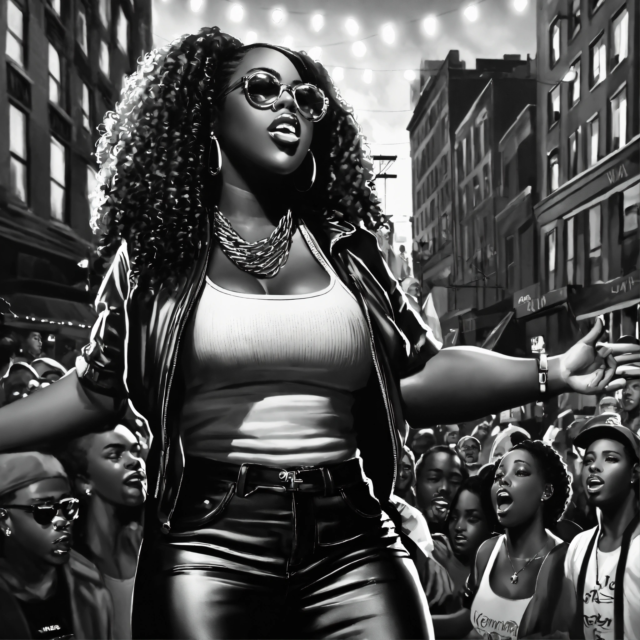 Sky view, pop art, hyperrealist portrait of black woman rapper "remy ma" performing in a park on stage with people cheering outside of a restaurant in a street in bronx nyc, black and white painting, fantasy art, photo realistic, dynamic lighting, artstation, poster, volumetric lighting, very detailed faces, 4 k, award winning