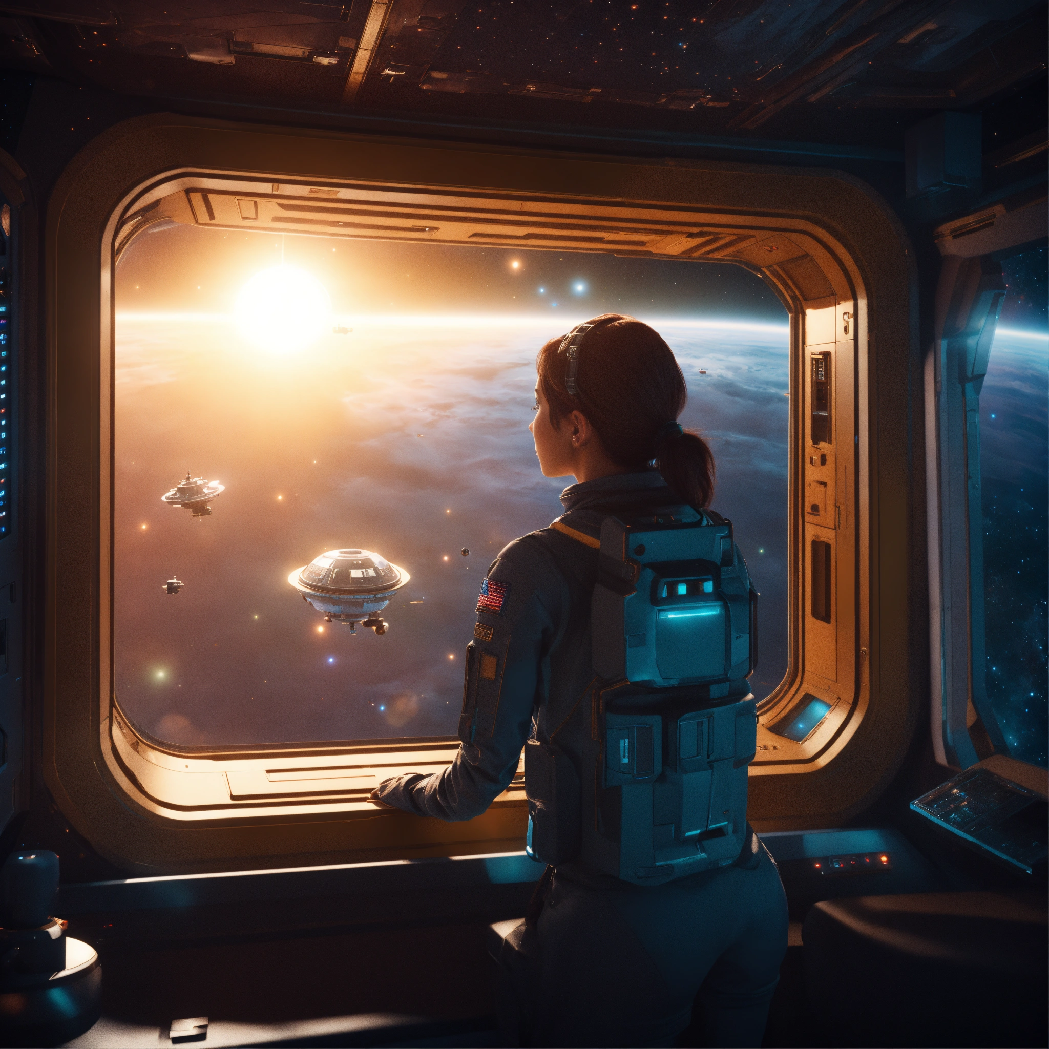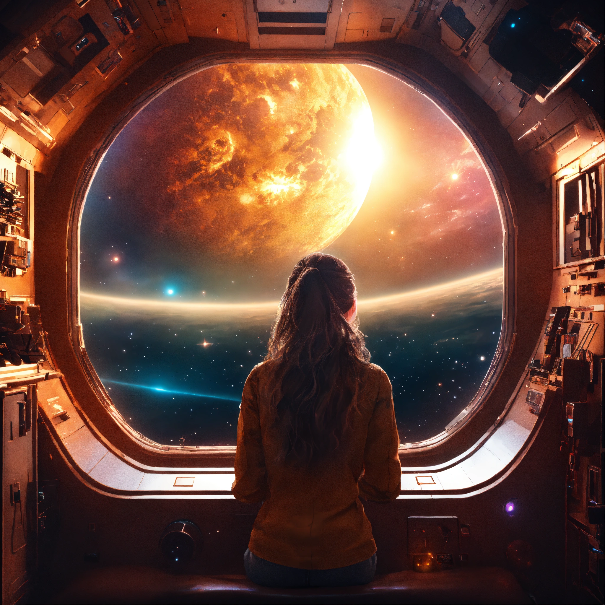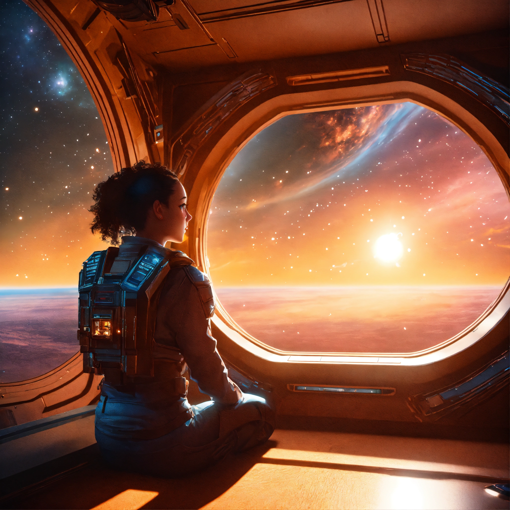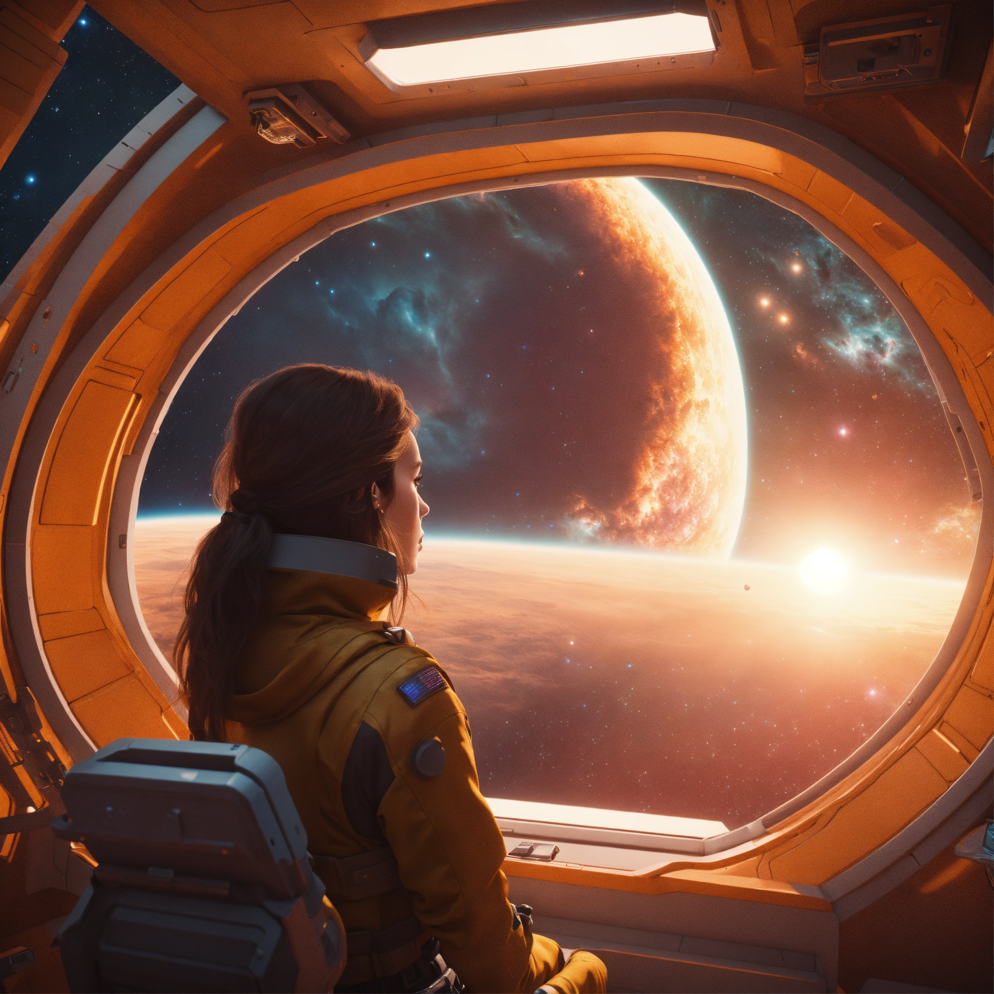 A young woman looks out of her cabin window in a spaceship, space nebula, sun backgound, cinema 4d scifi 3d scene of a showing, hyper realism, realistic shading, realistic render, detailed textures, photorealistic, wide shot, landscape