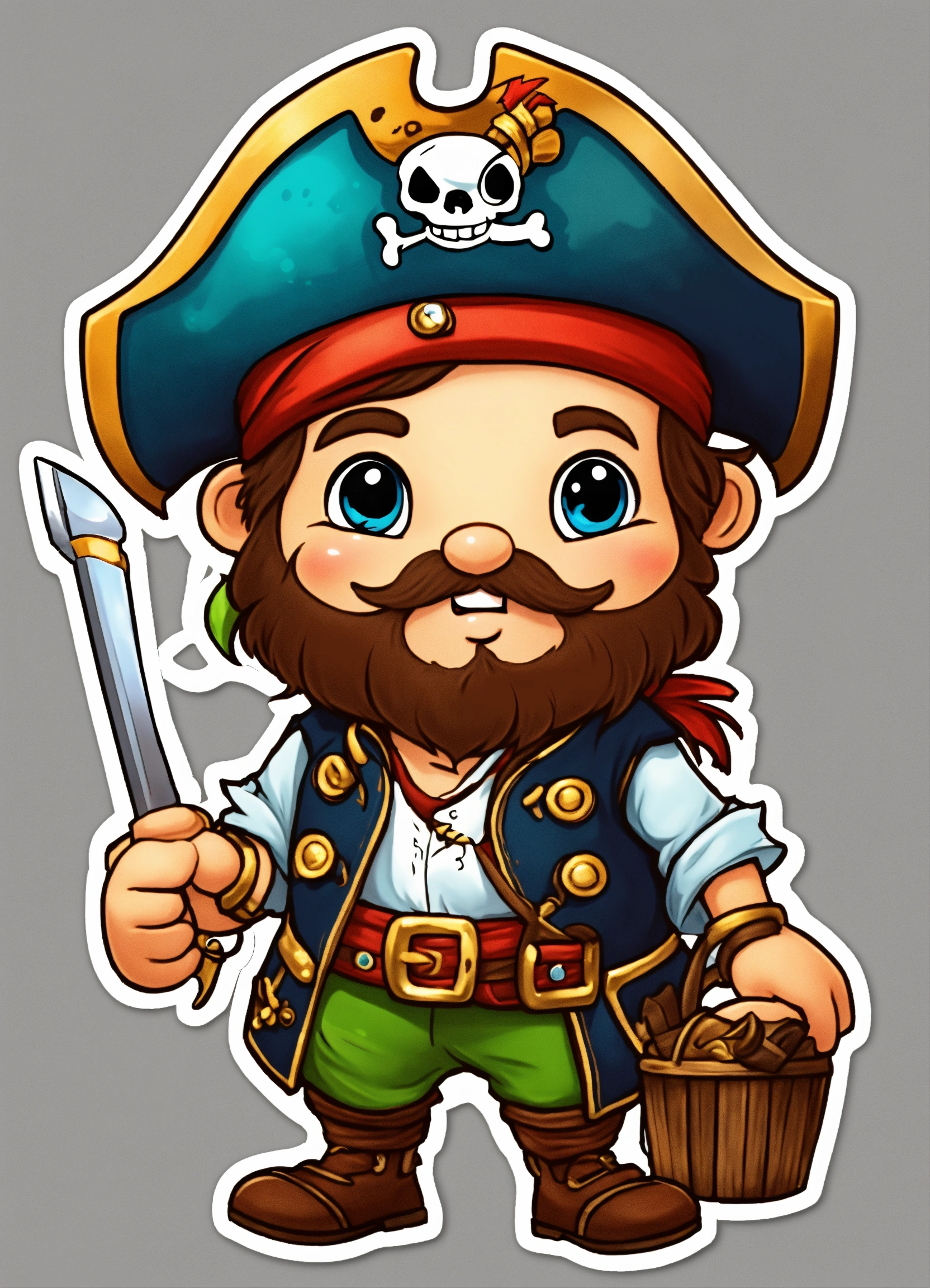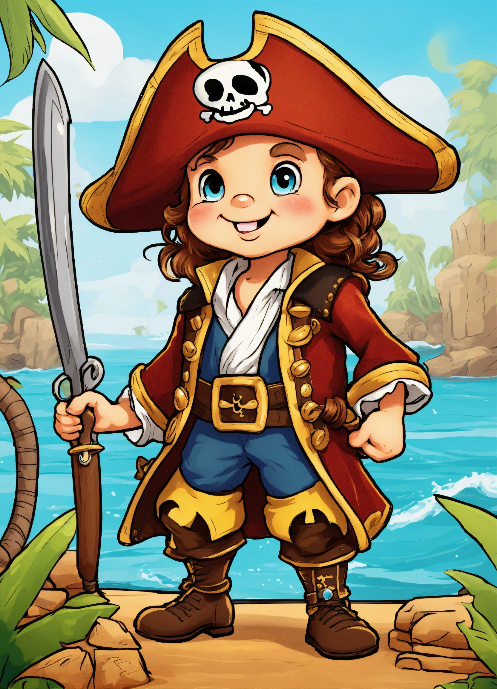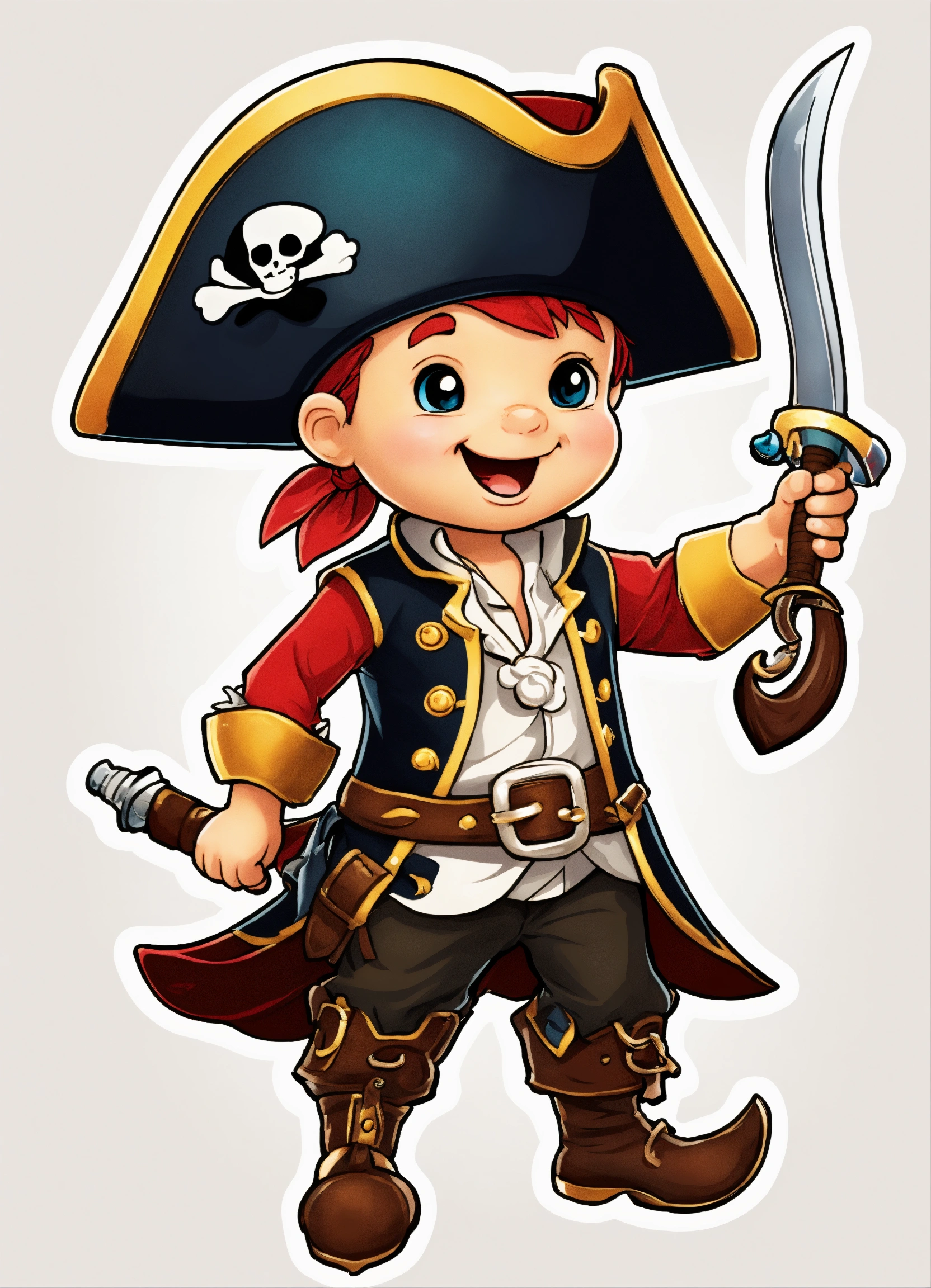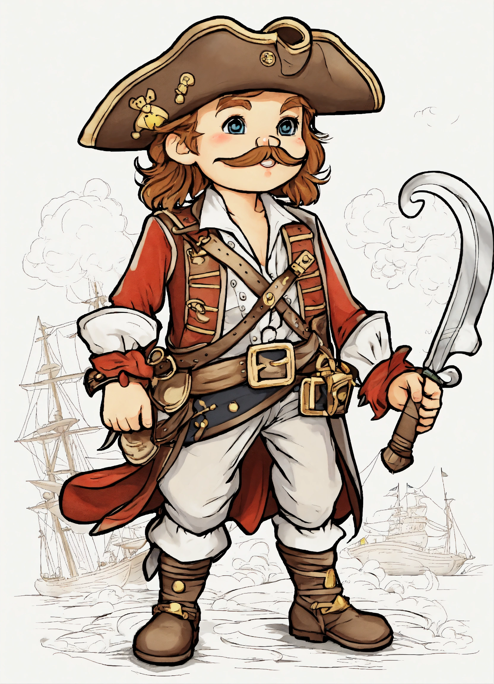 Generate a cute little pirate illustration, 4k resolution, cartoon-sticker style with clear lines on a pure white background suitable for a children's coloring book.