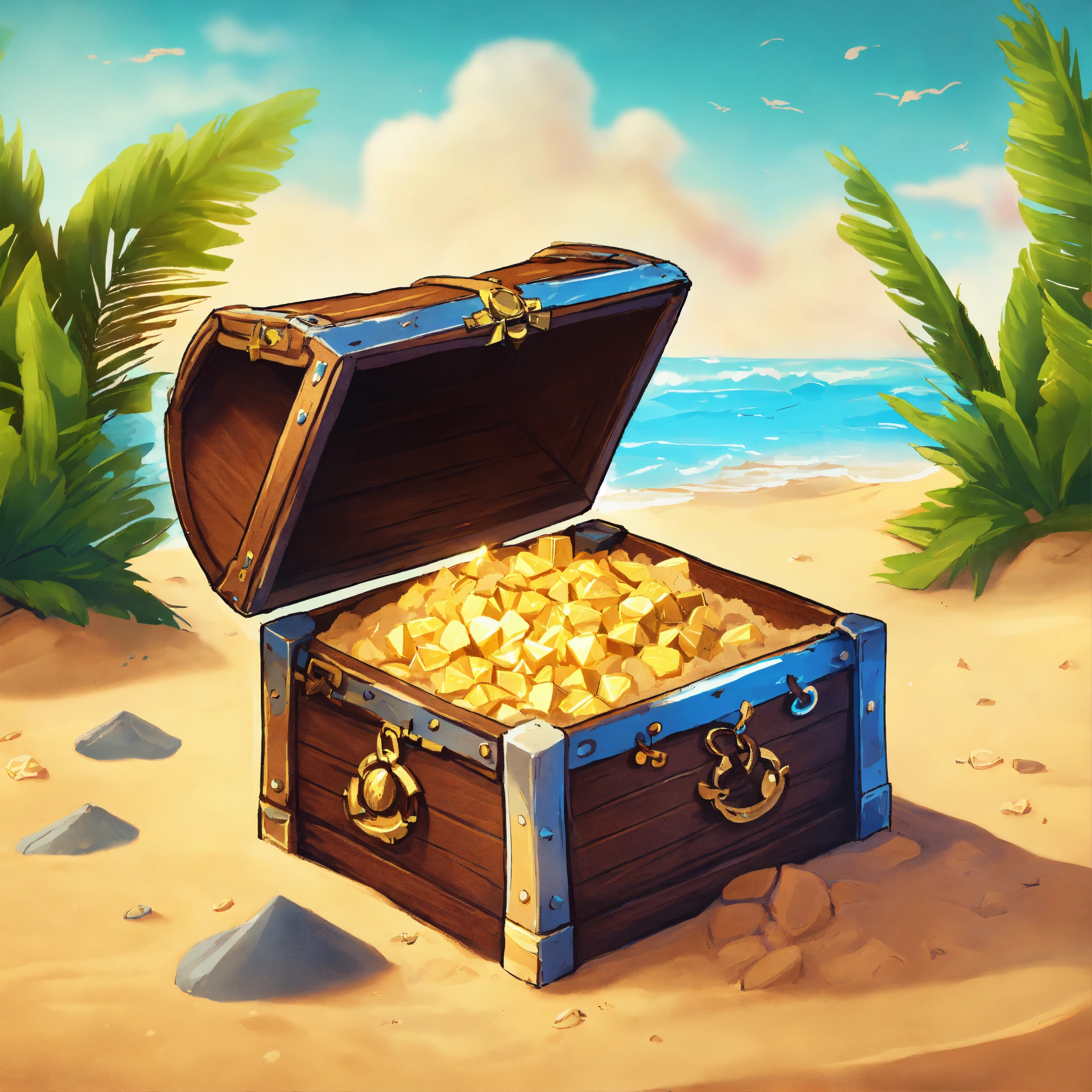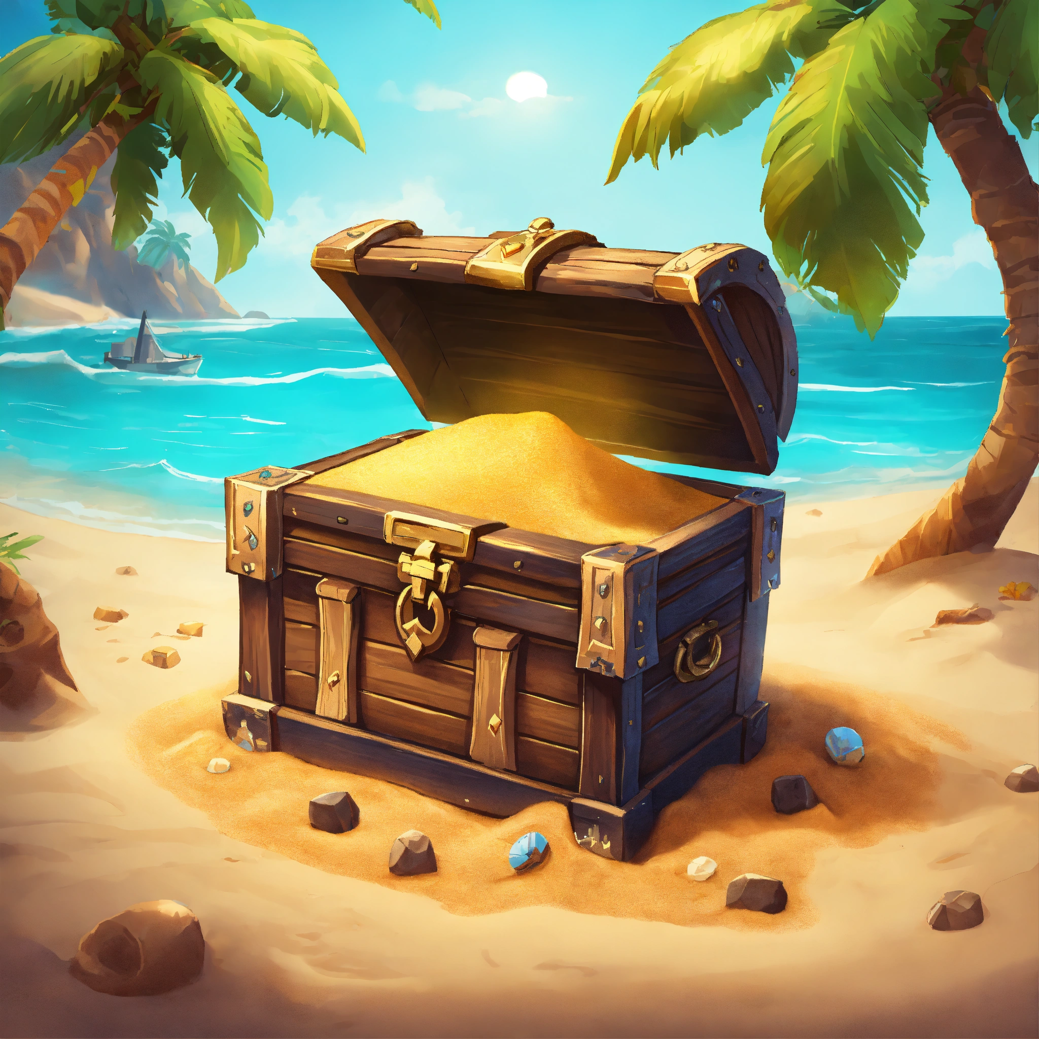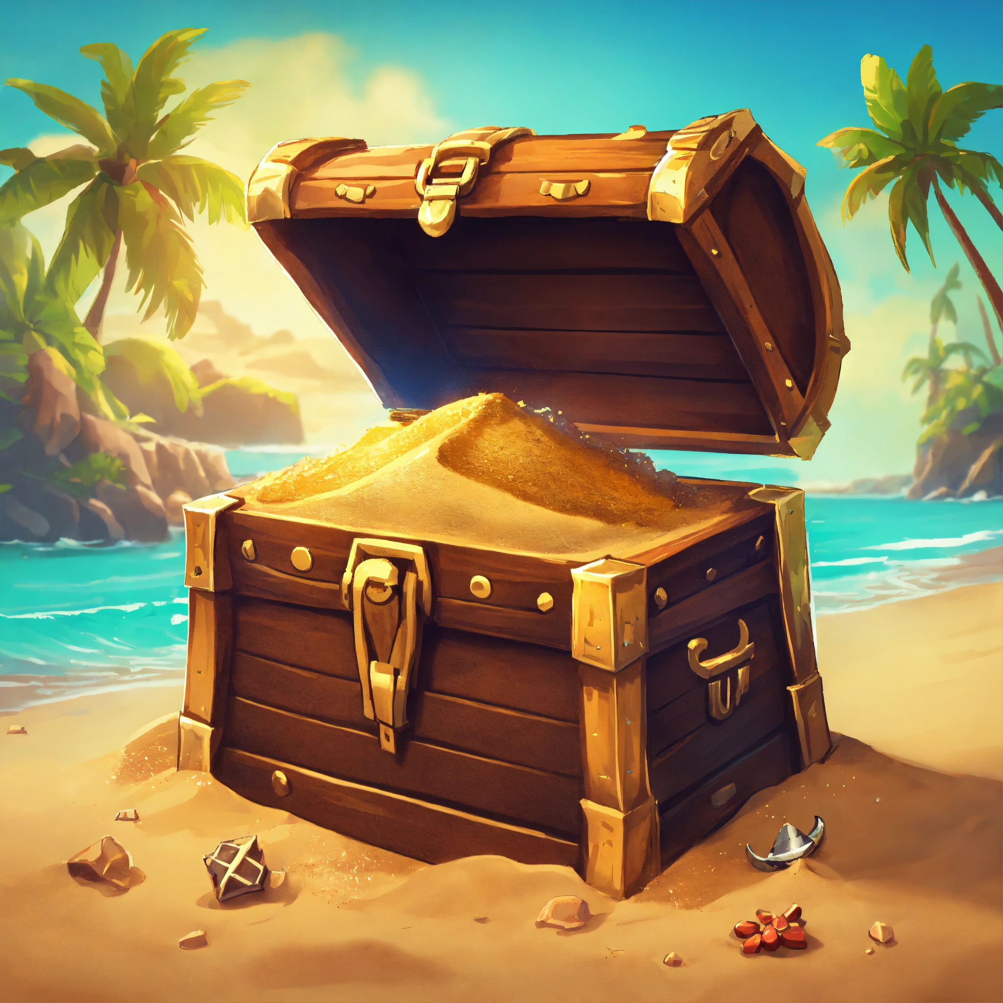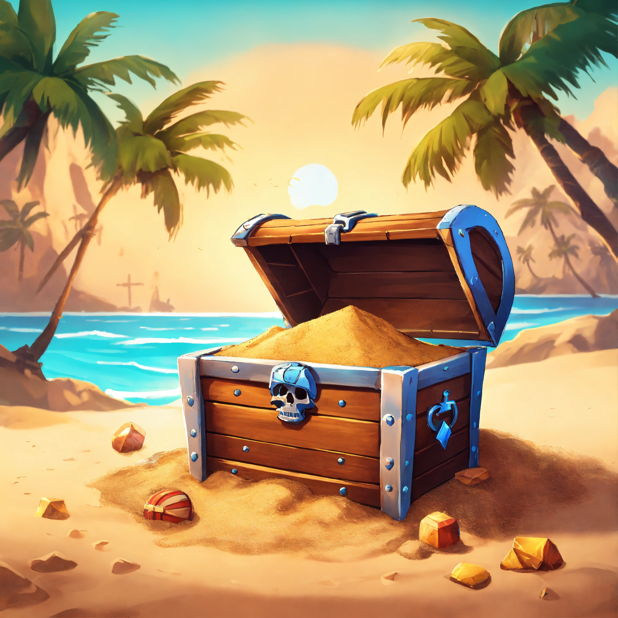 Treasure chest half in the sand, on the background beach and palm, detailed hand illustration rendered in sea of thieves game style, cute cartoon style