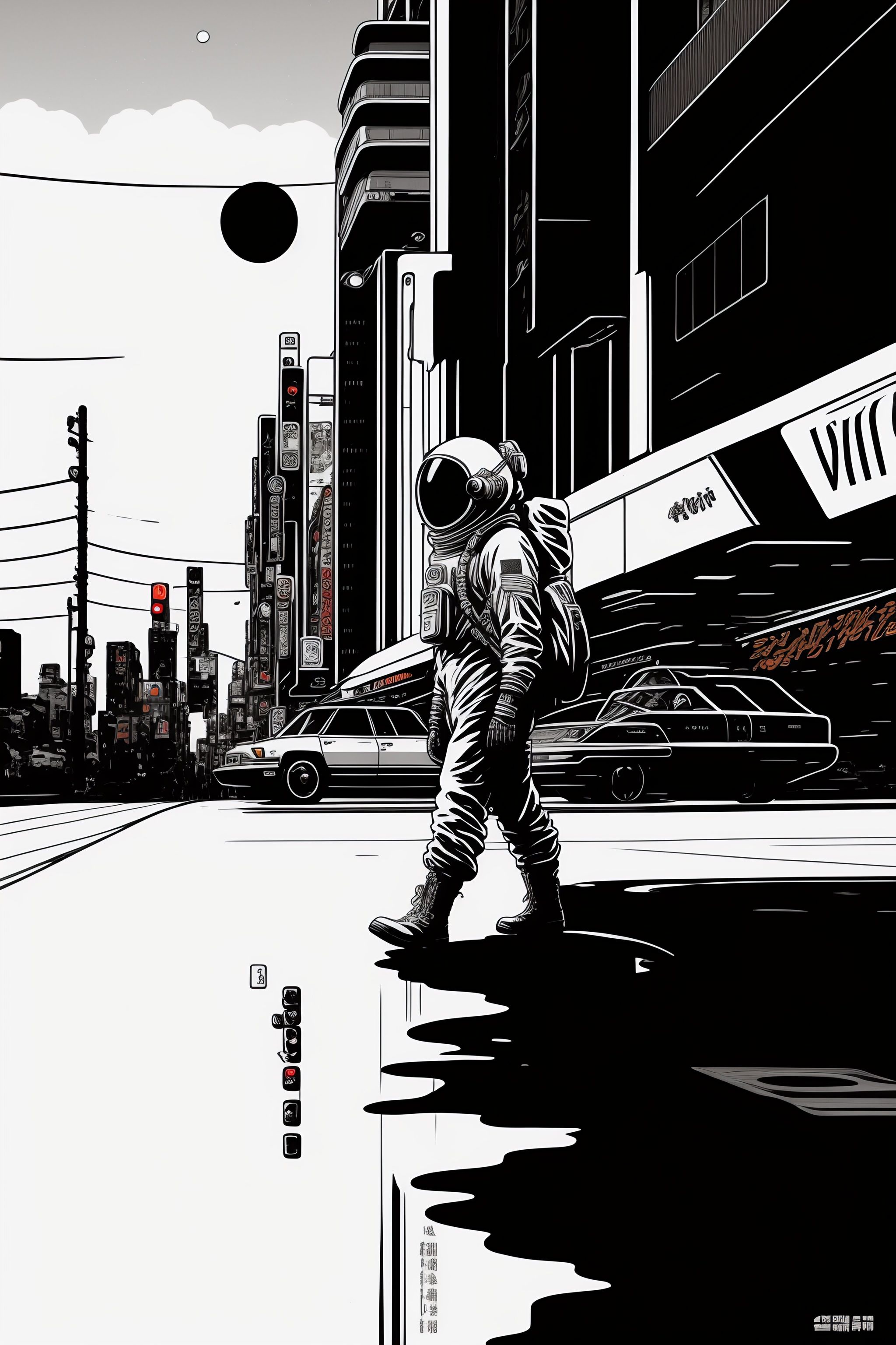 Vintage 90's anime style. a lonely astronaut walking down the street; by hajime sorayama, greg tocchini, virgil finlay, sci-fi. line art. environmental arcade art.